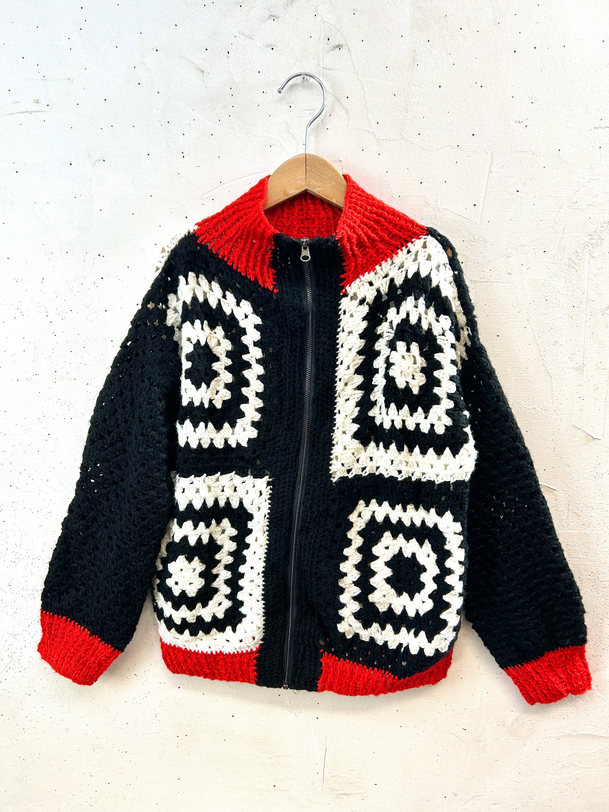 グラニーニットでブラック×ホワイトの2トーンで、襟元や裾などが赤いきりかえの作りが魅力的。