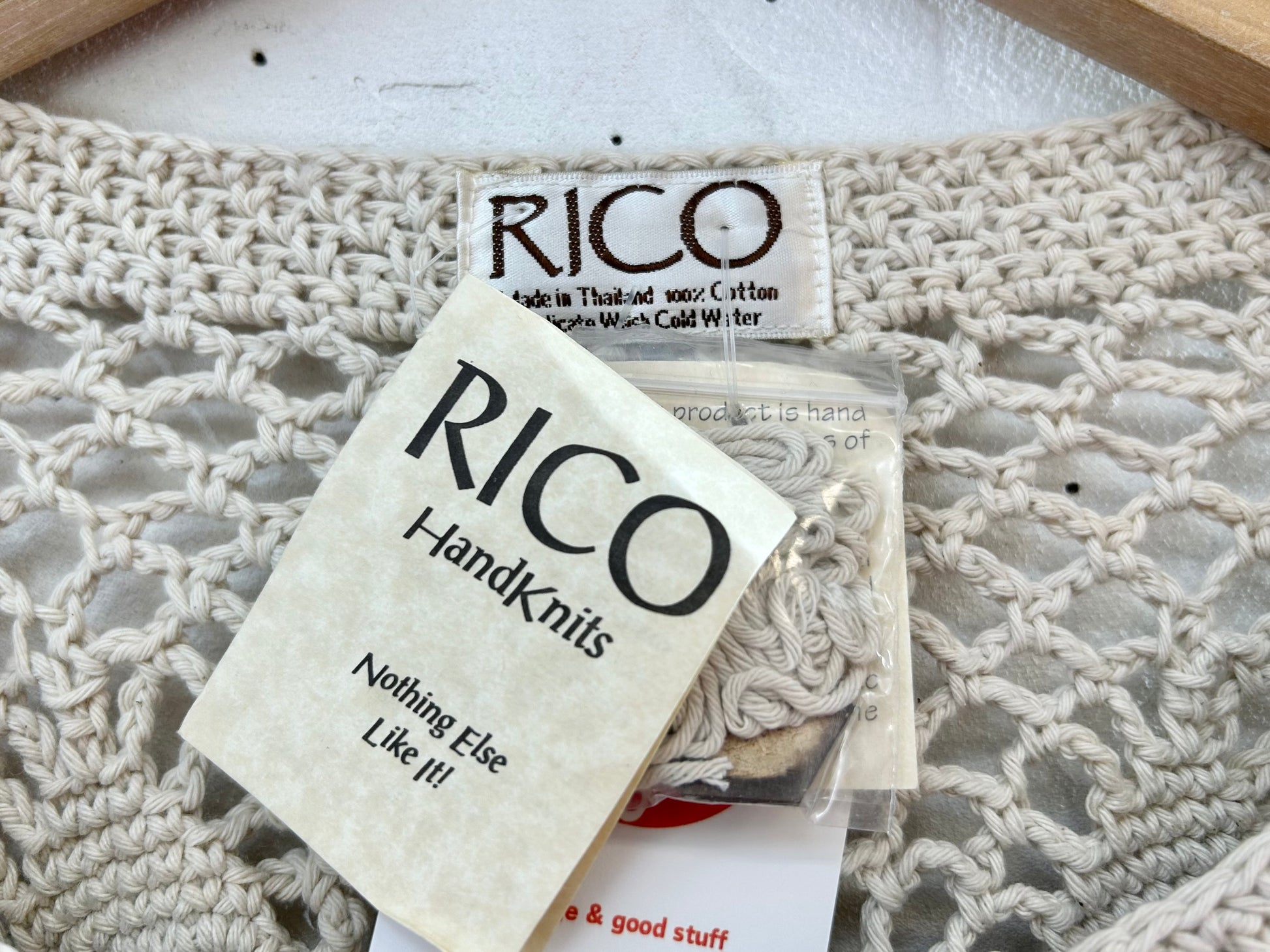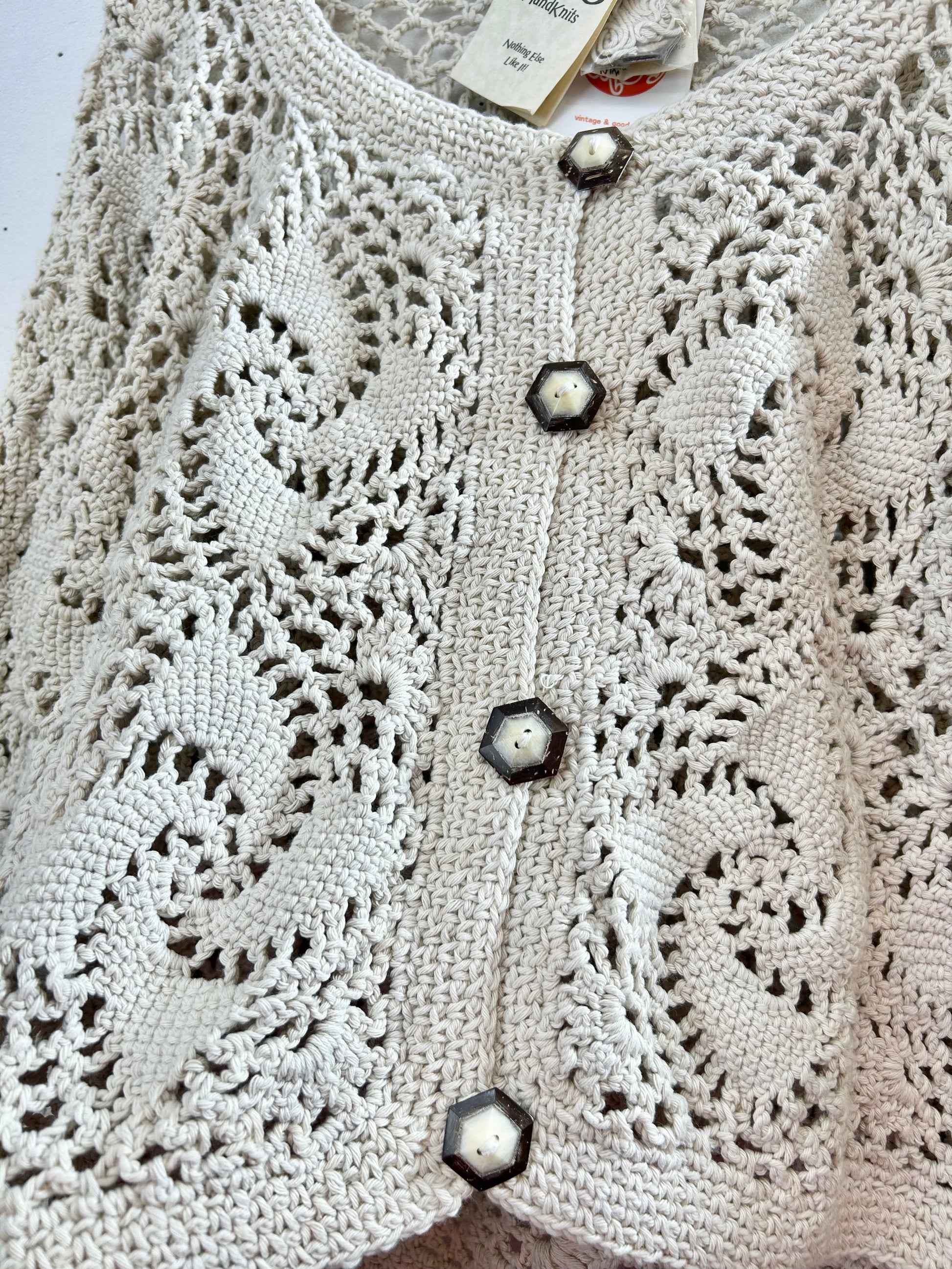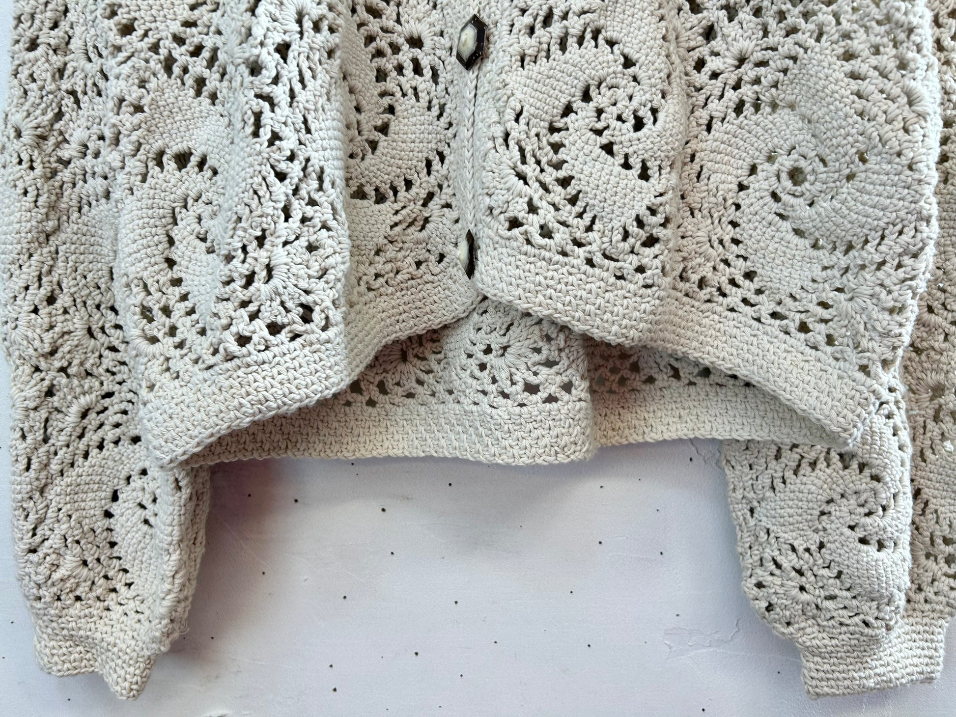 風車のような編み模様と六角形のウッドボタンが素敵な一着。