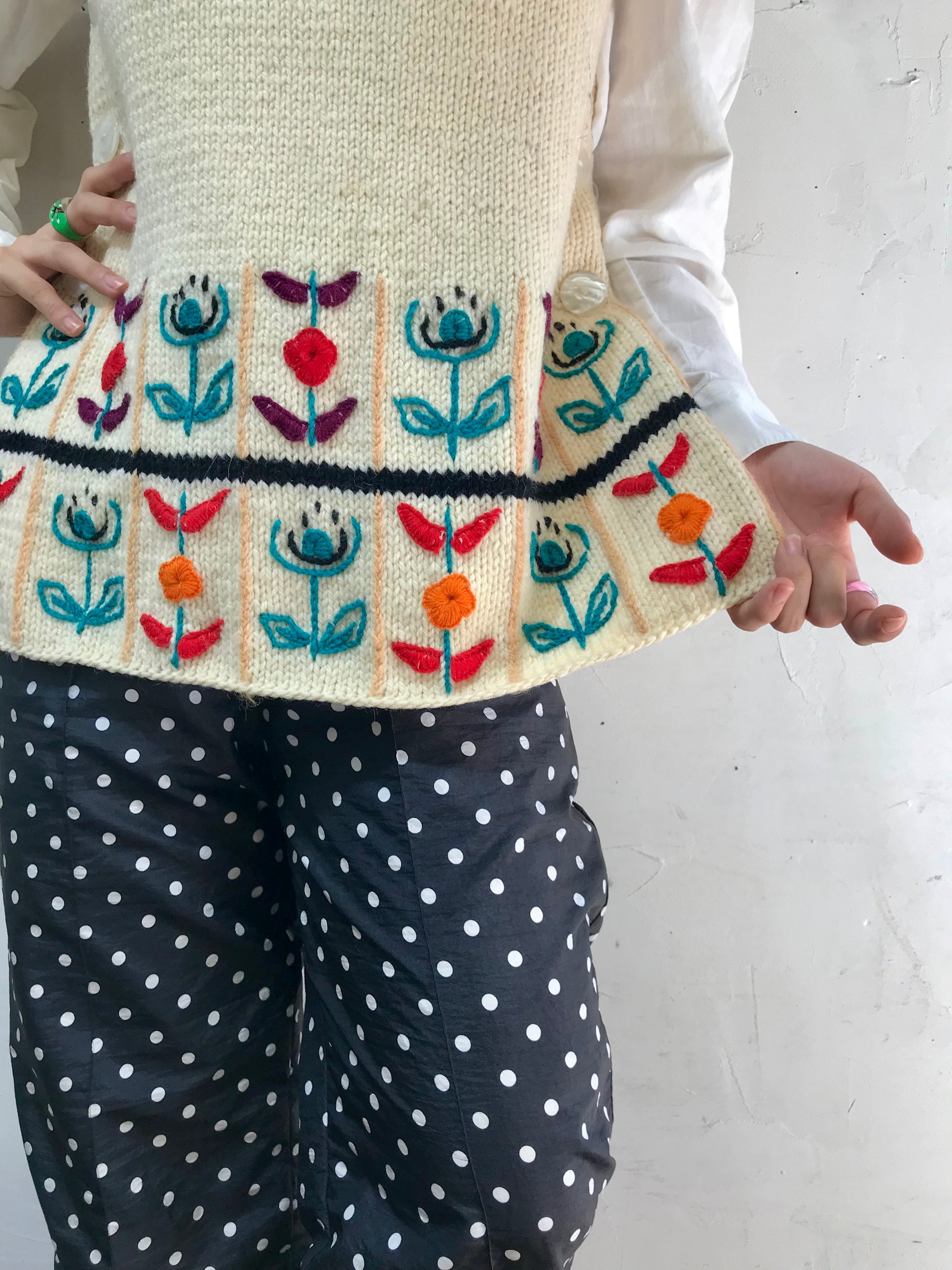 オフホワイトのボディに、キュートなフラワーのモチーフとサイドの大きなボタンがインパクトのある一着。