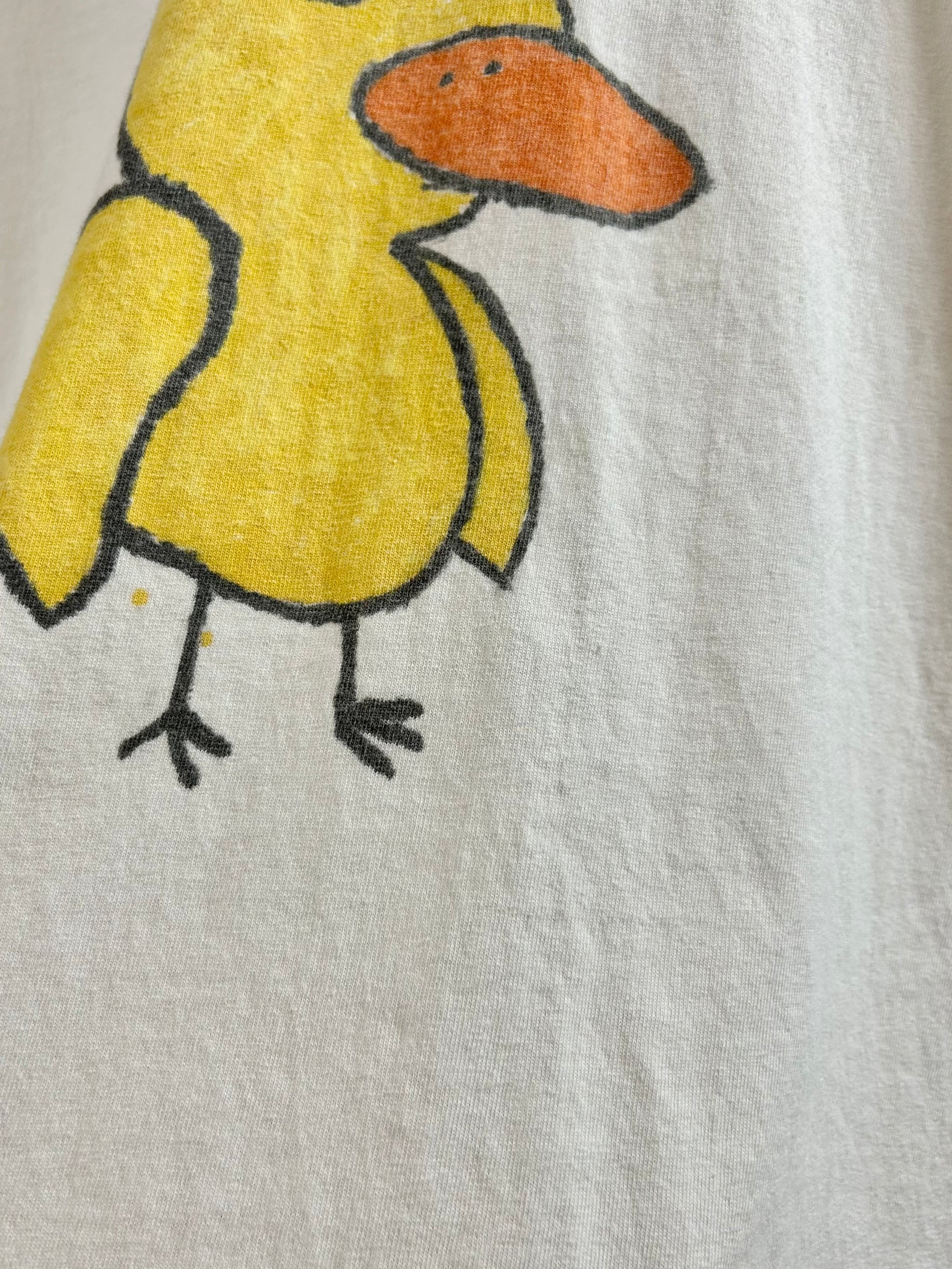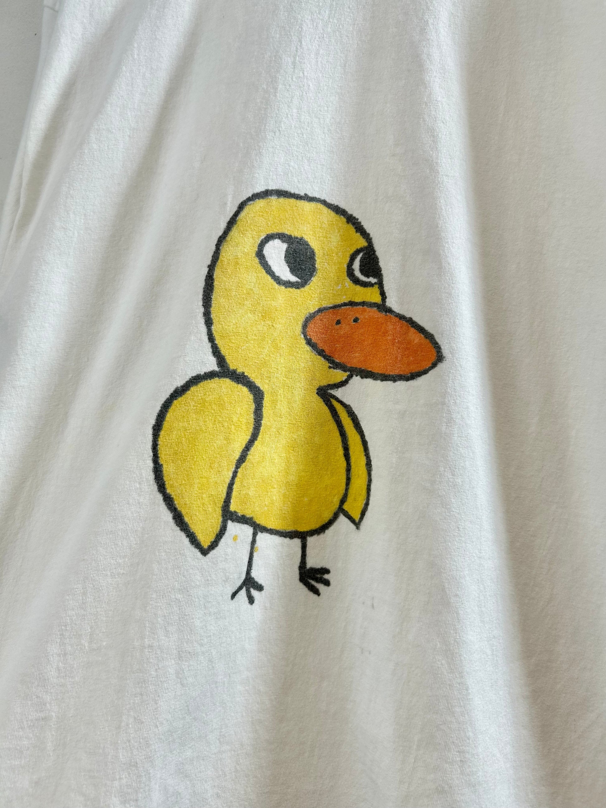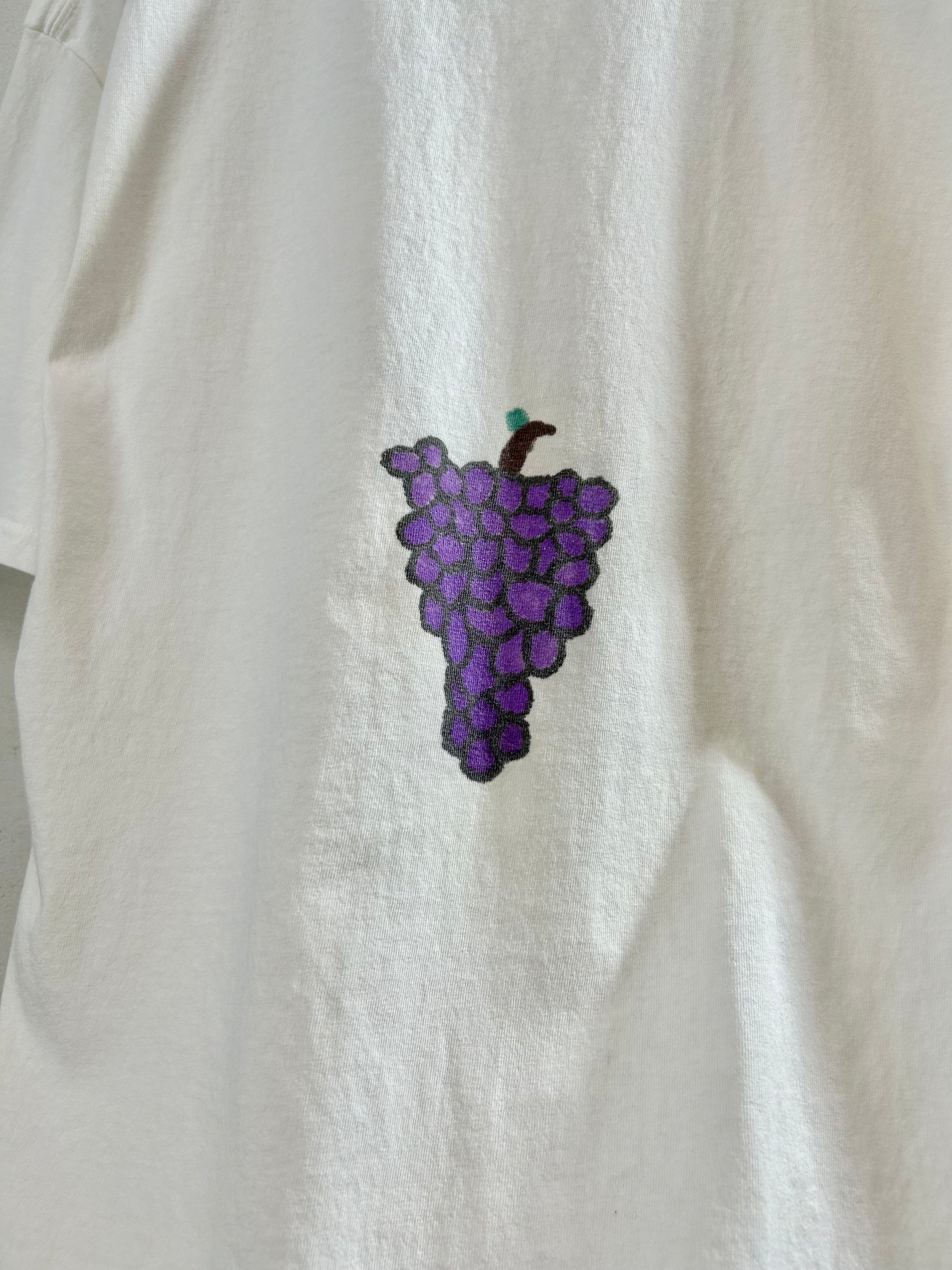 フロントにヒヨコ、バックにブドウのシュールでゆるかわなハンドペイントがビンテージならではな1着。