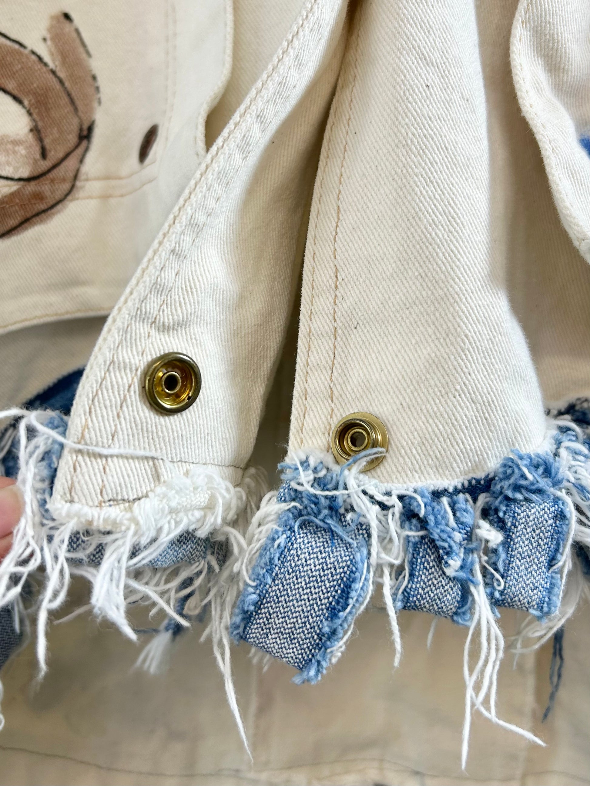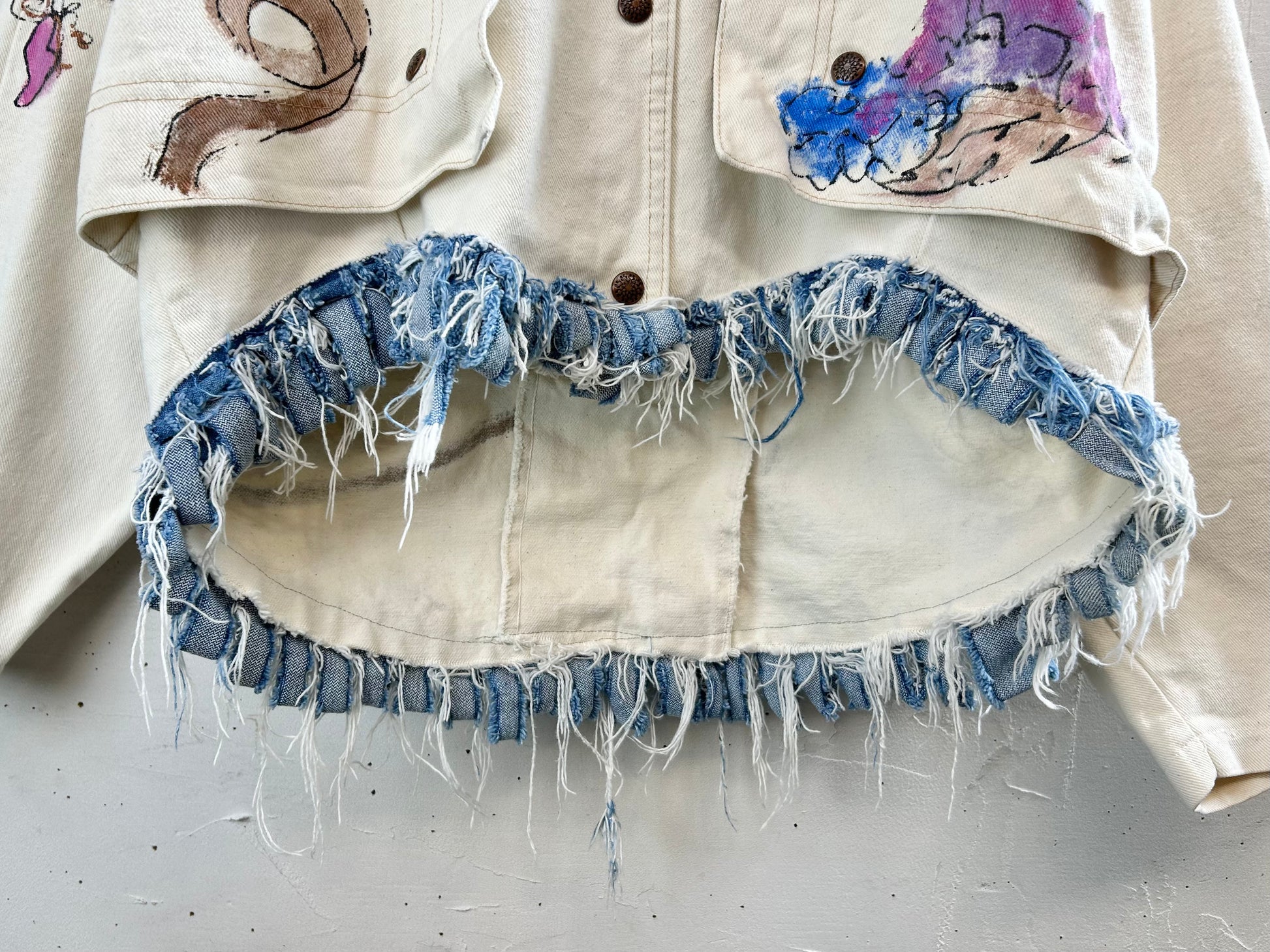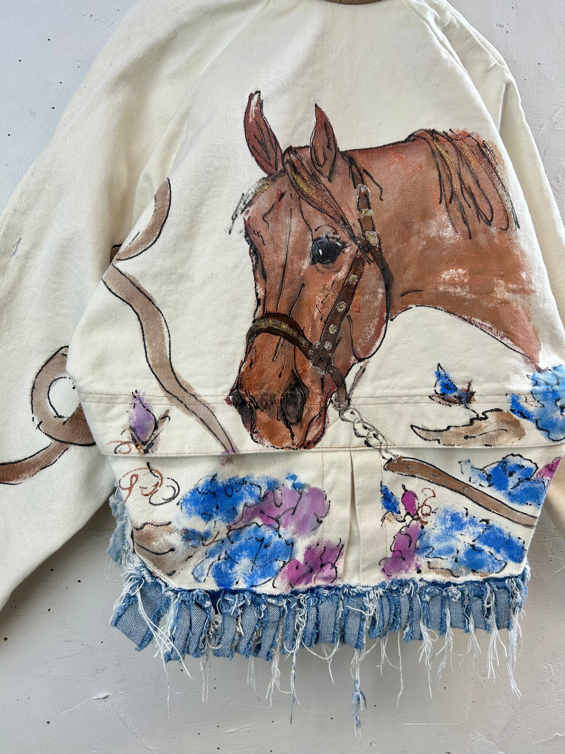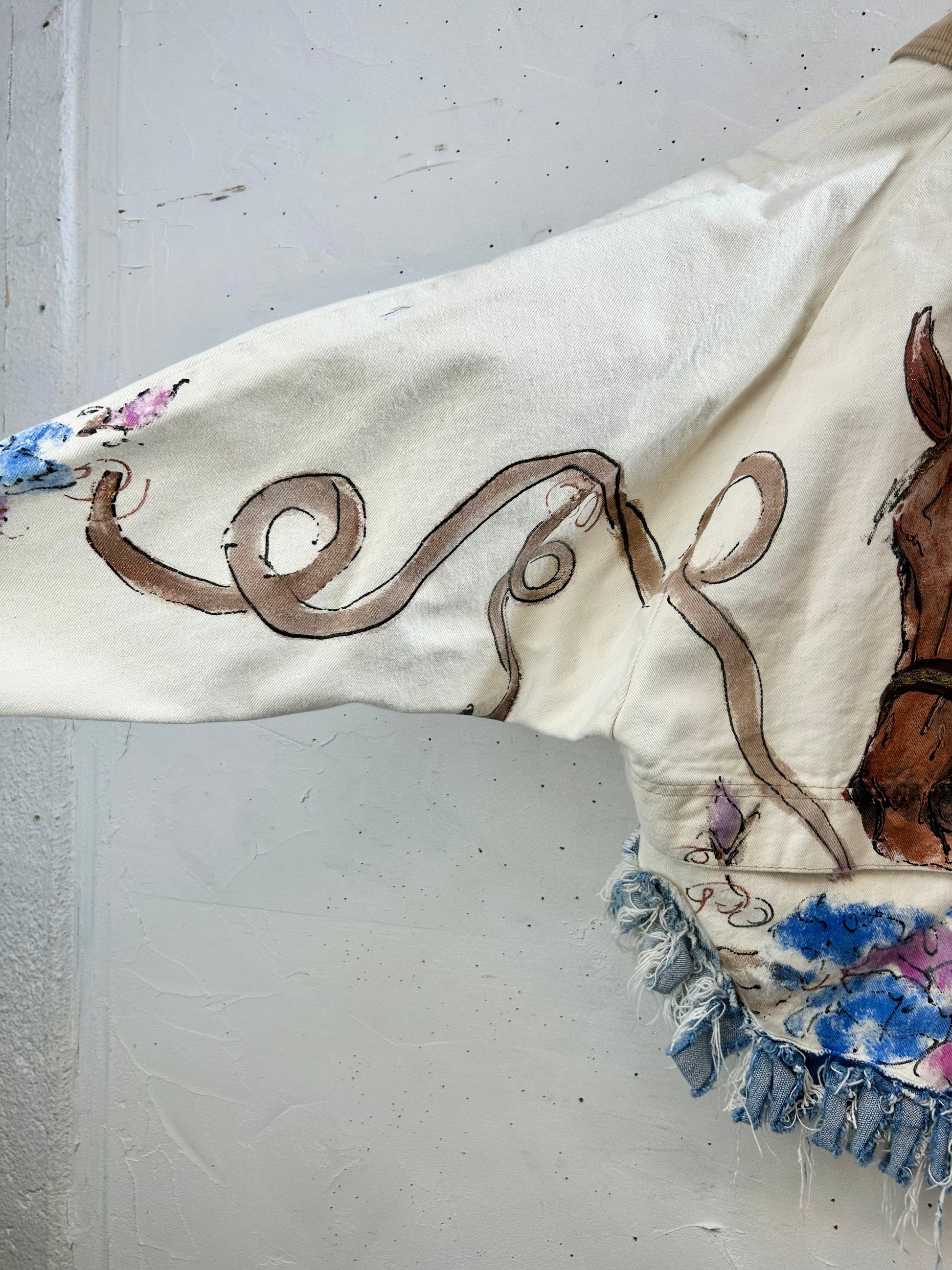 ホワイトデニムのボディに、大胆な馬のハンドペイントやデニムのフリンジがカスタムされたオリジナリティ溢れる唯一無二な一着。