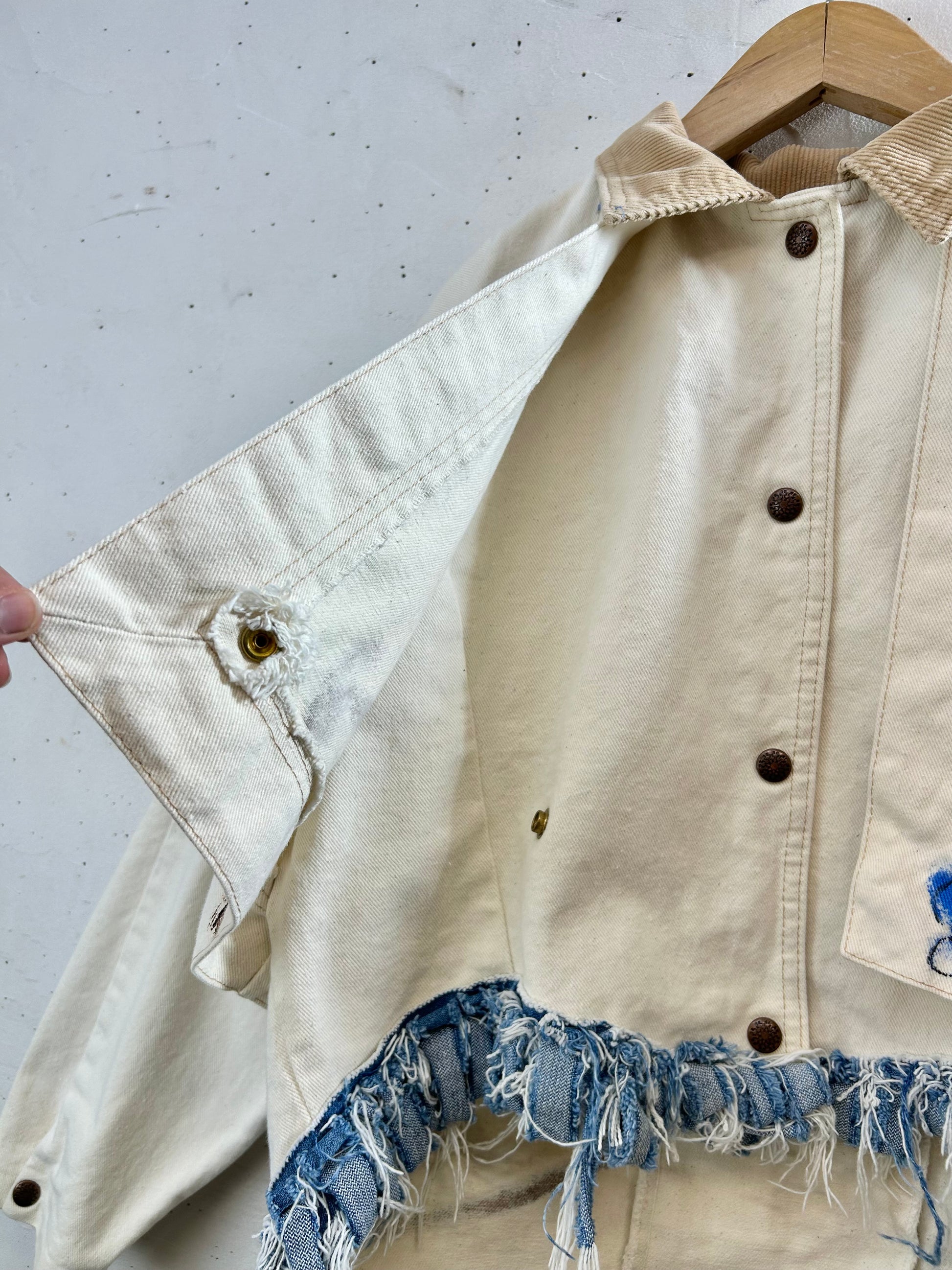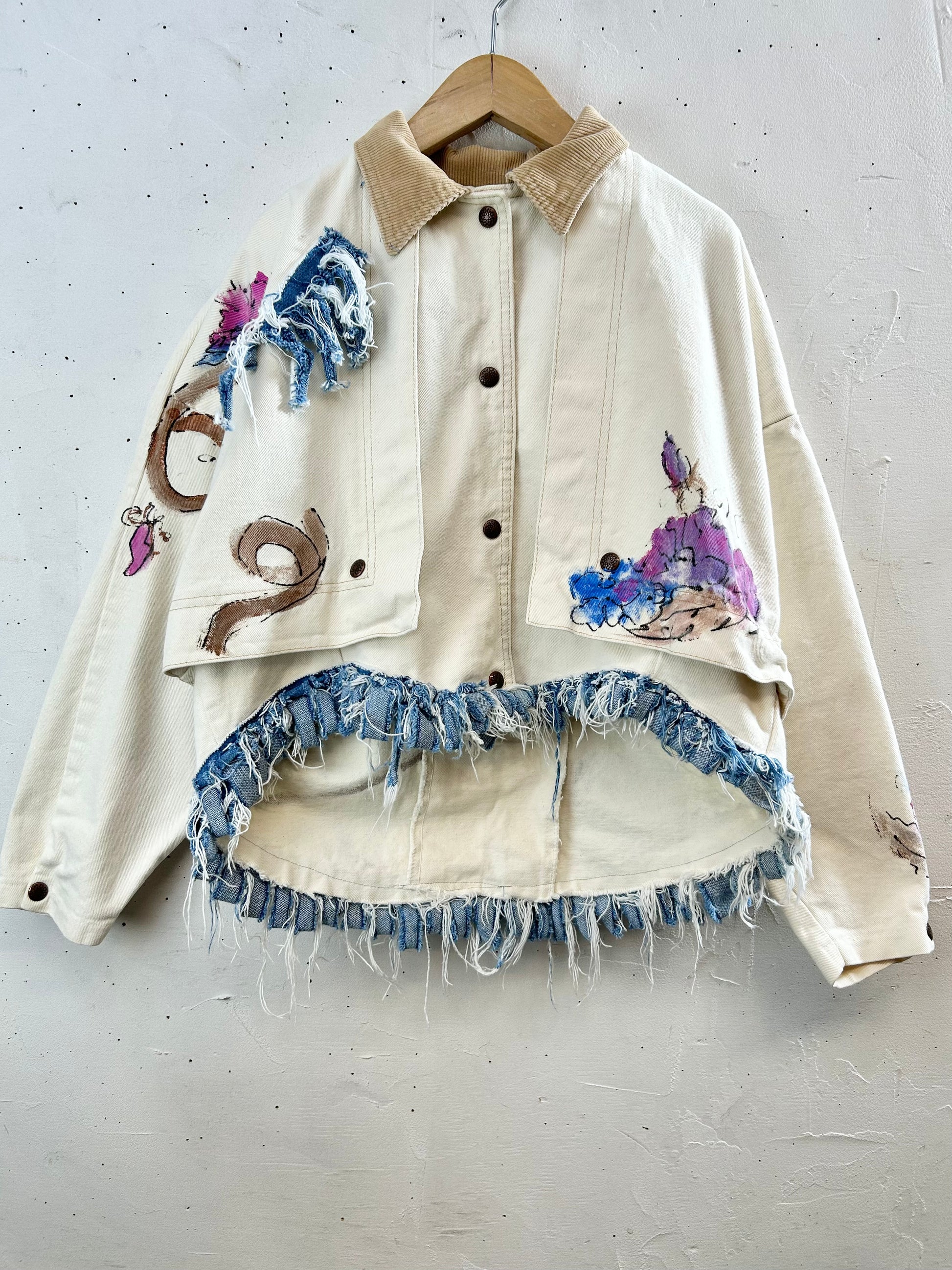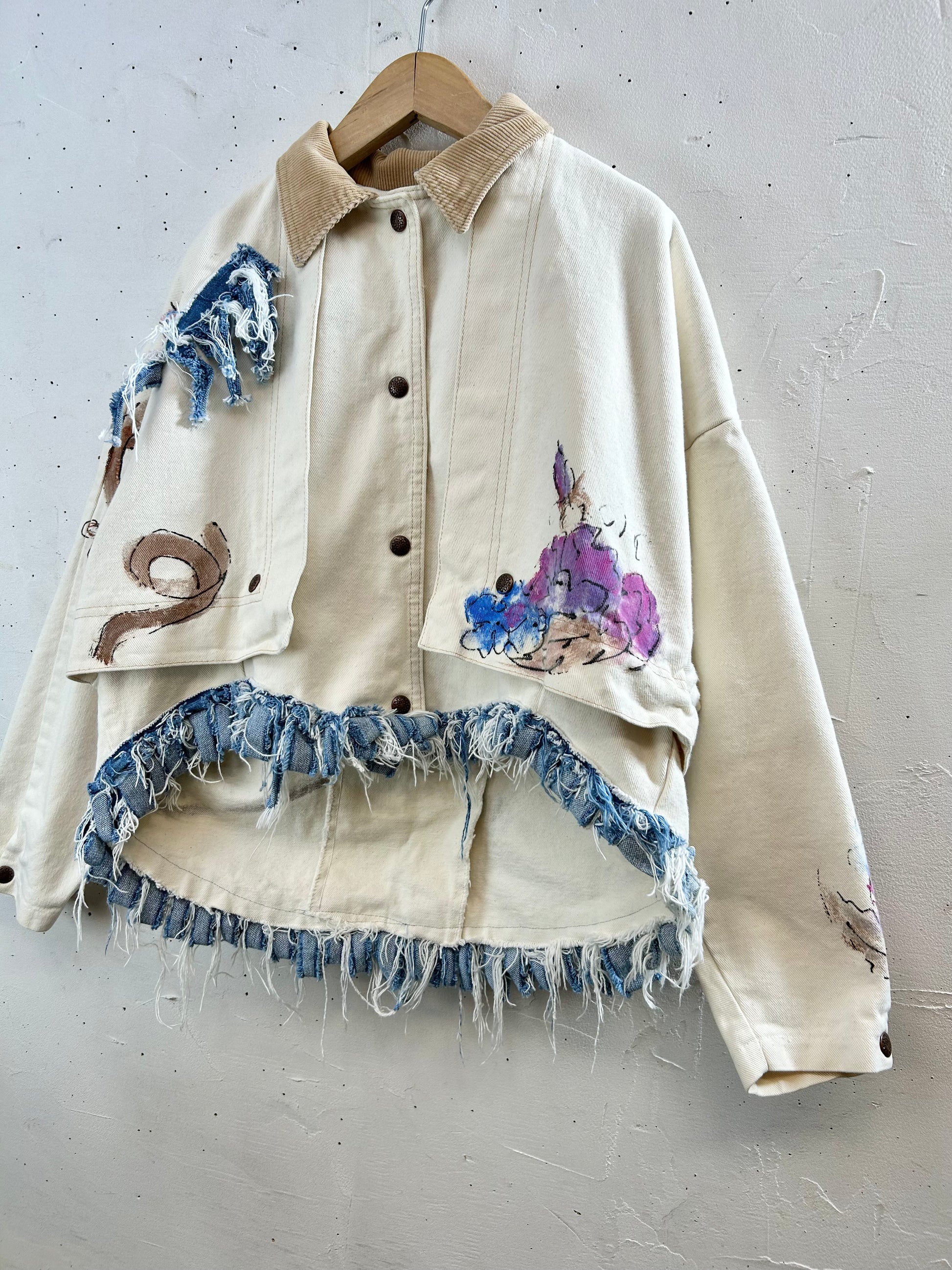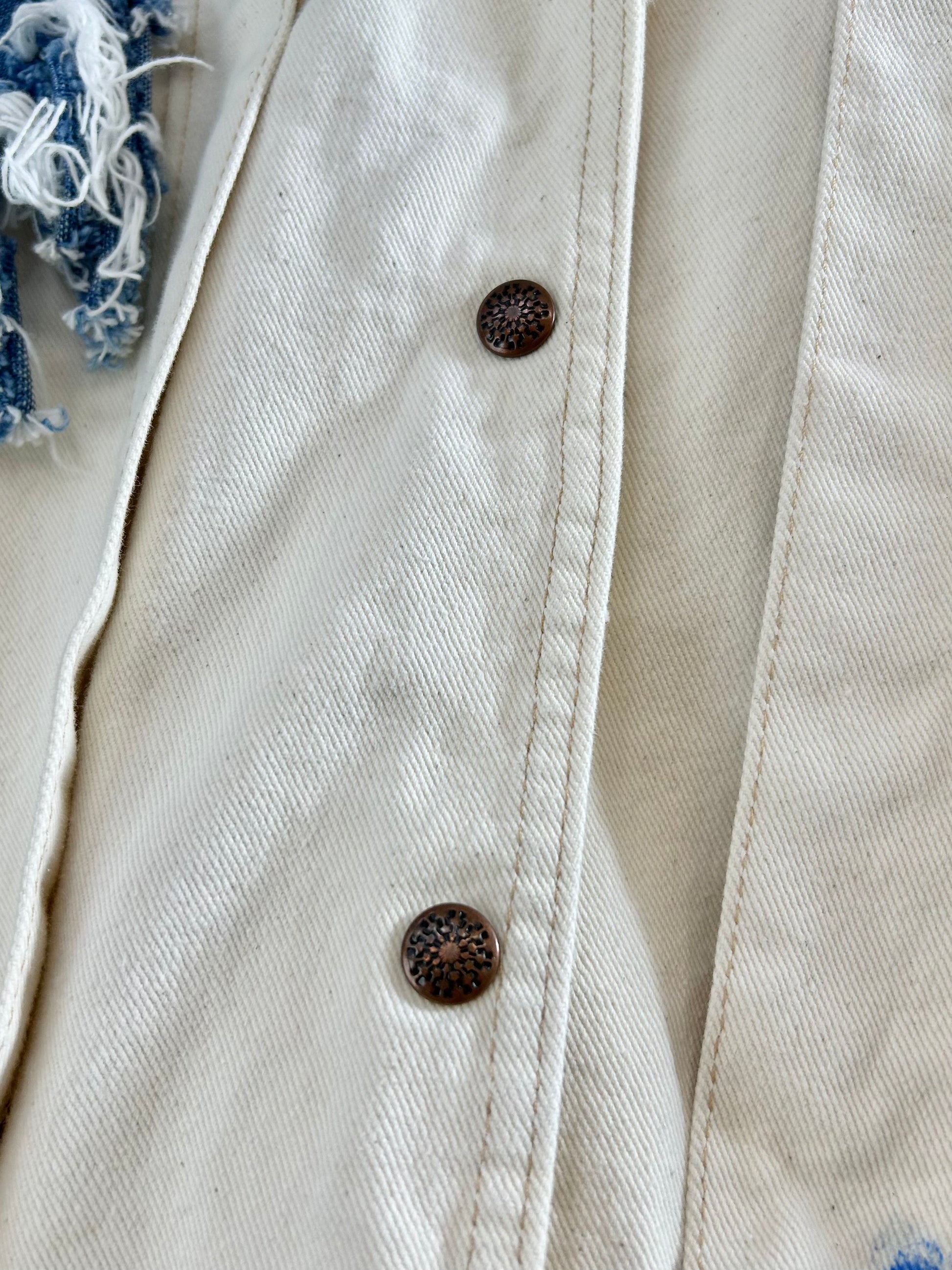 ホワイトデニムのボディに、大胆な馬のハンドペイントやデニムのフリンジがカスタムされたオリジナリティ溢れる唯一無二な一着。