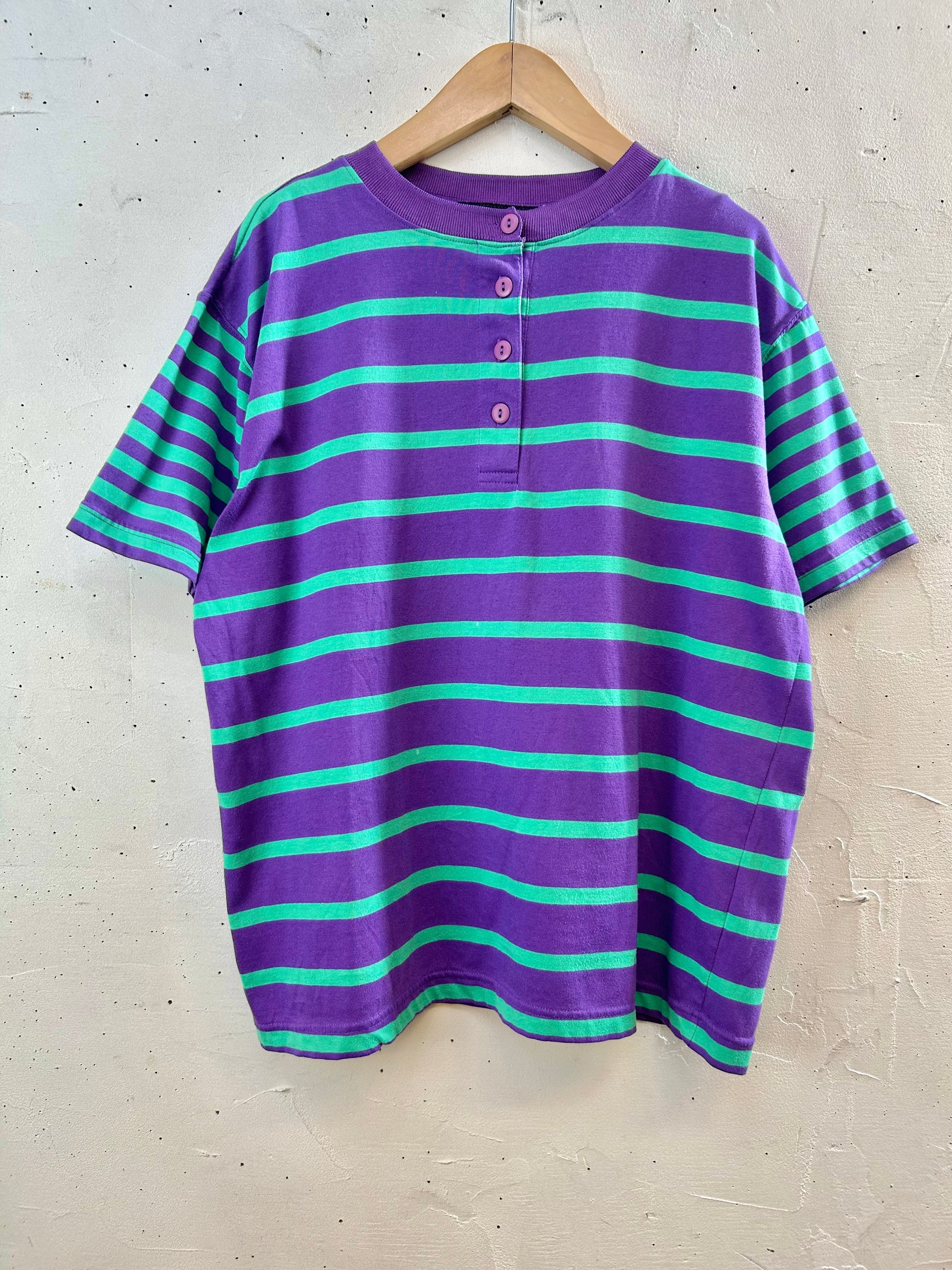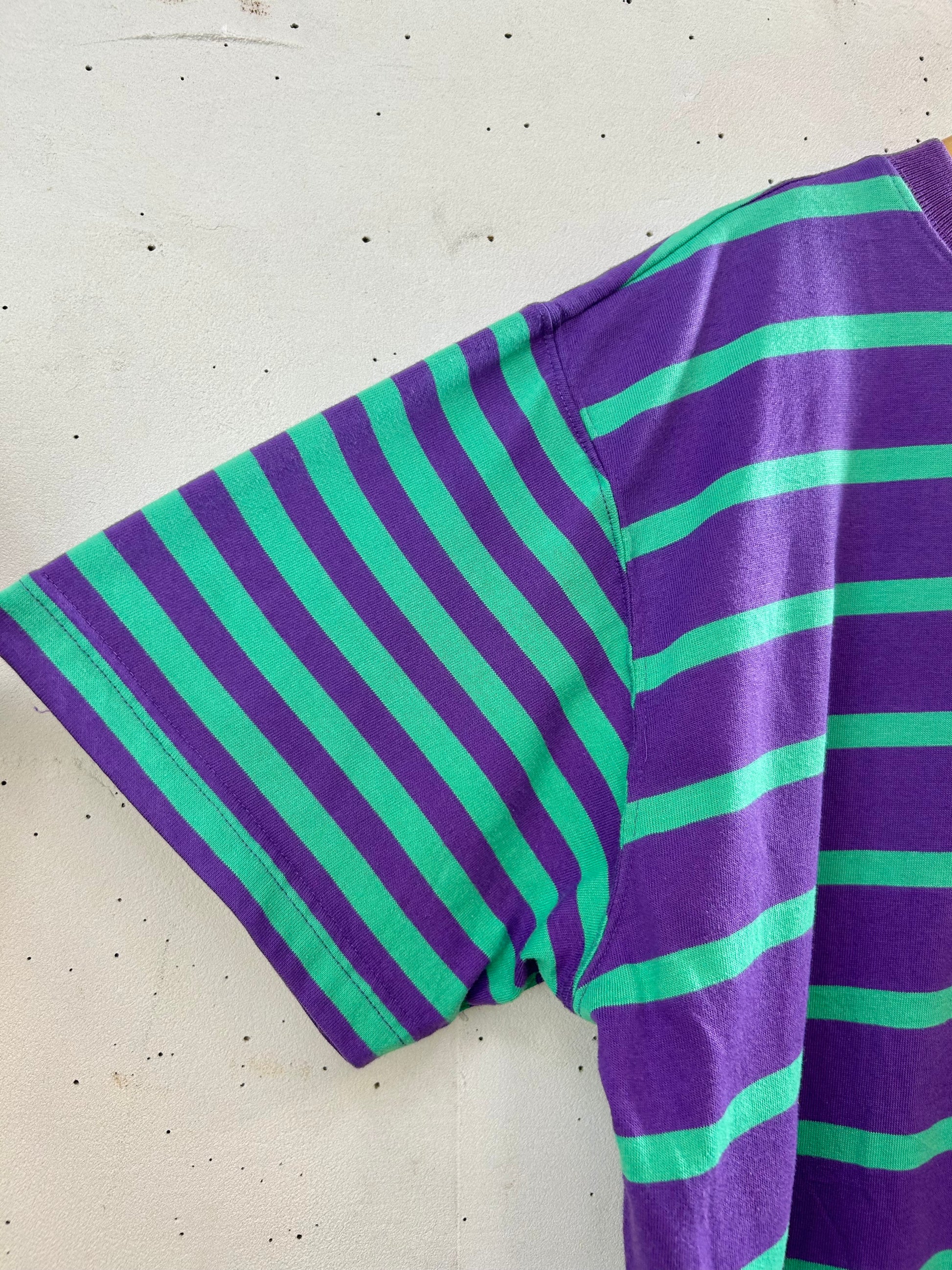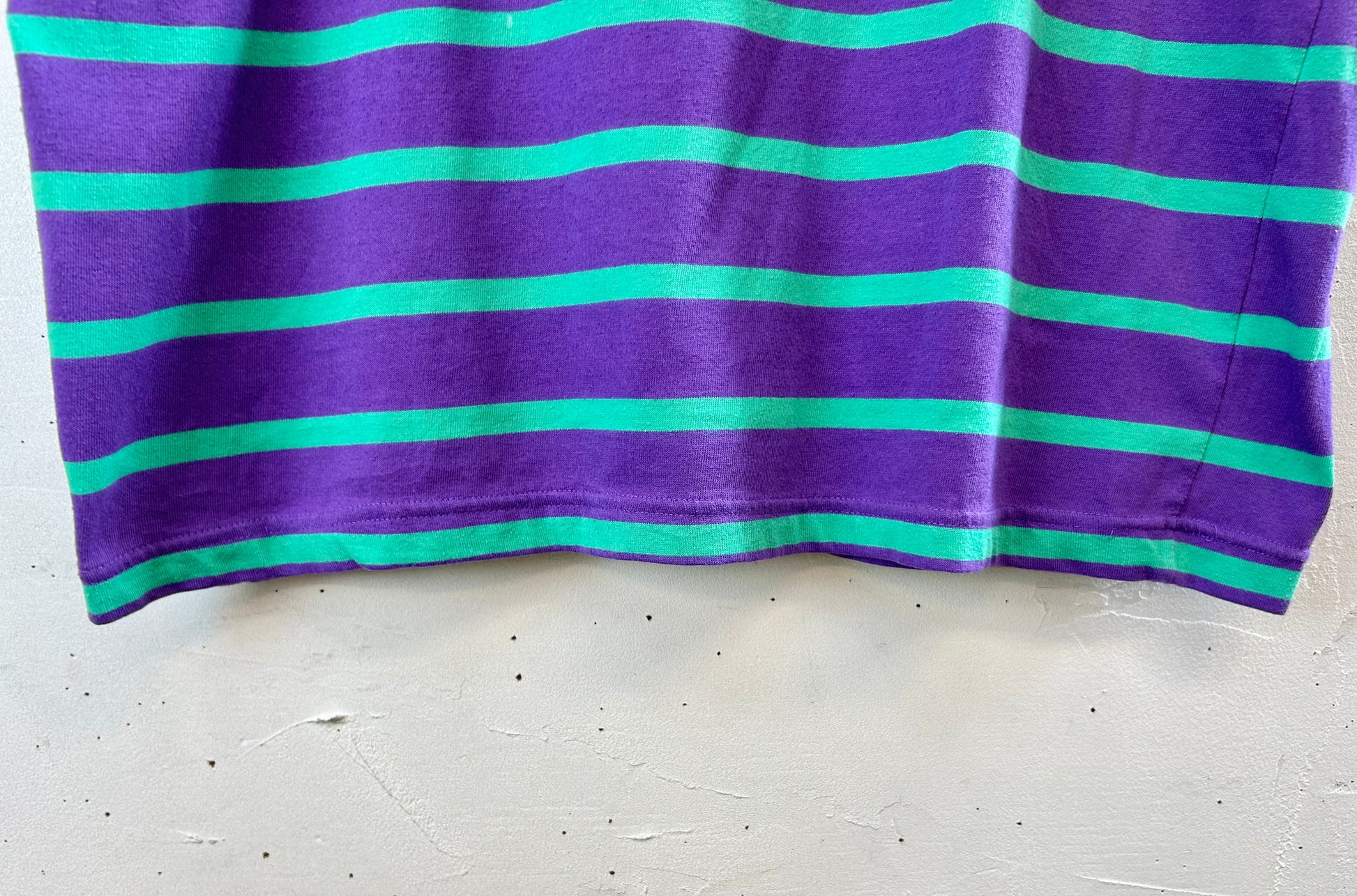 パープルとグリーンのボーダーが目を惹き、ボディと袖でピッチの違うボーダーデザインが雰囲気の良い一着。