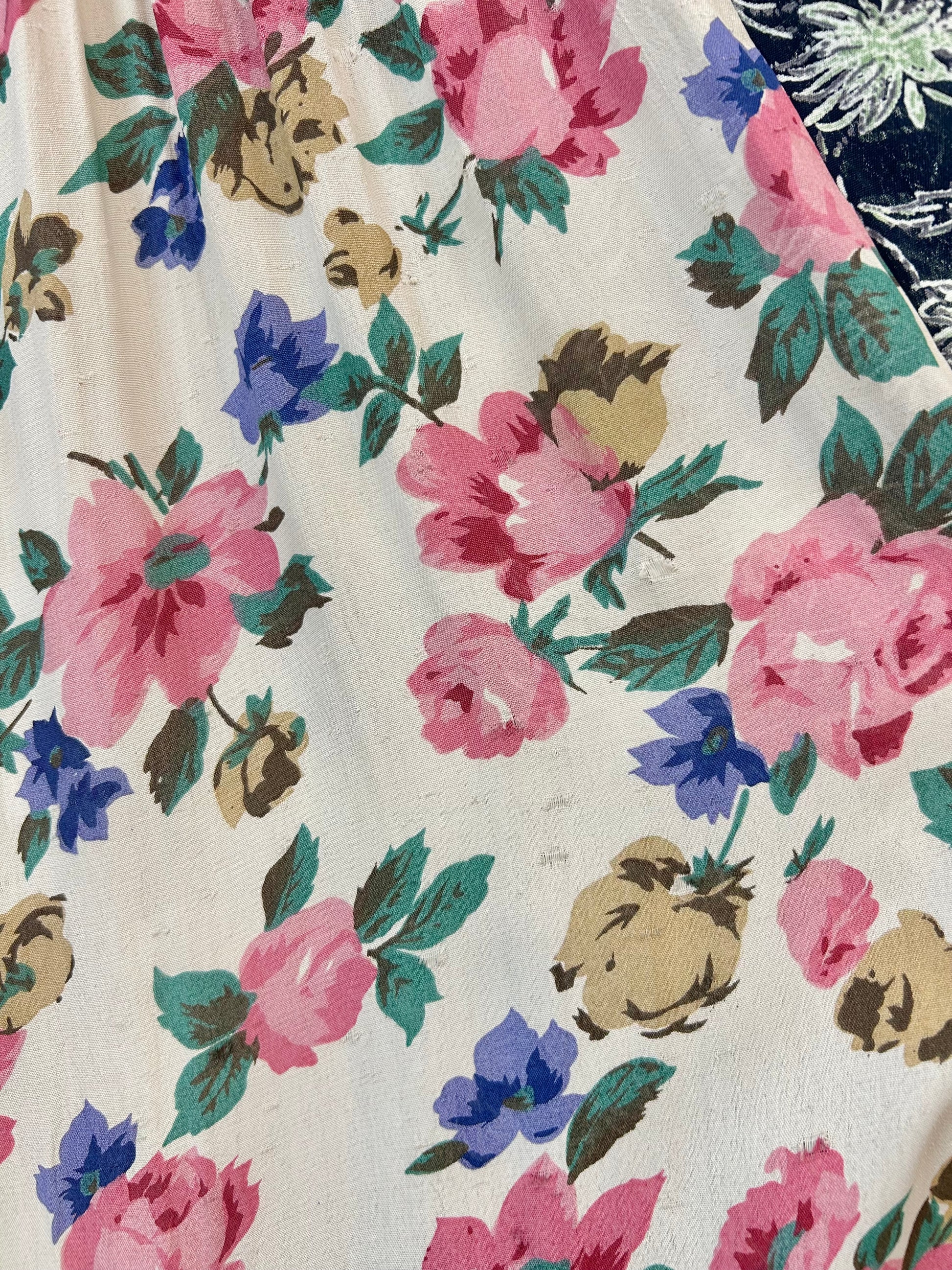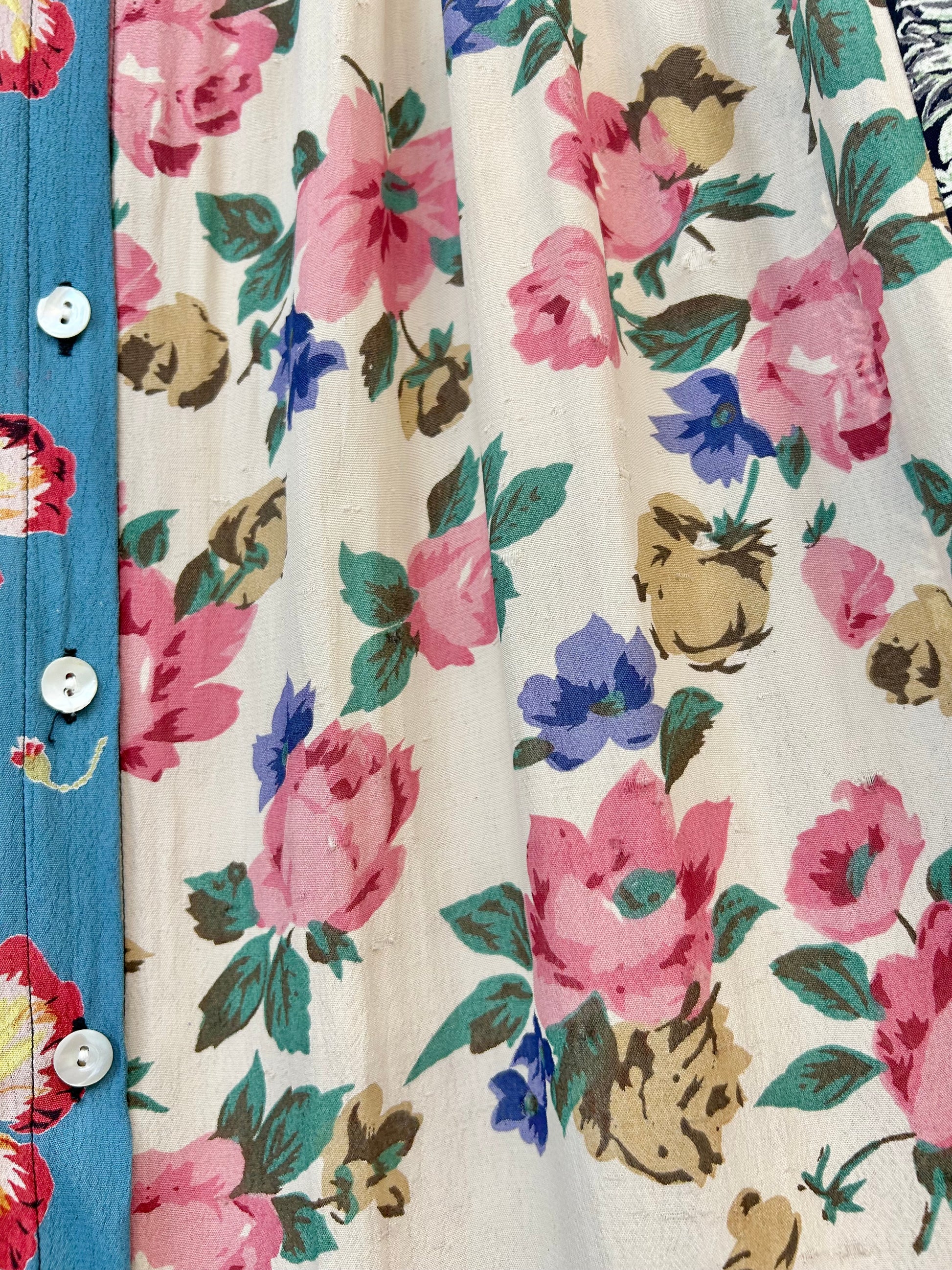 様々なフラワーパターンを組み合わせたパッチワークデザインが素敵な一着。