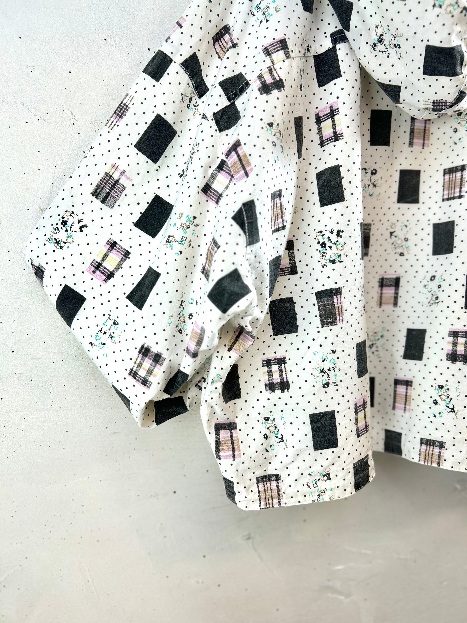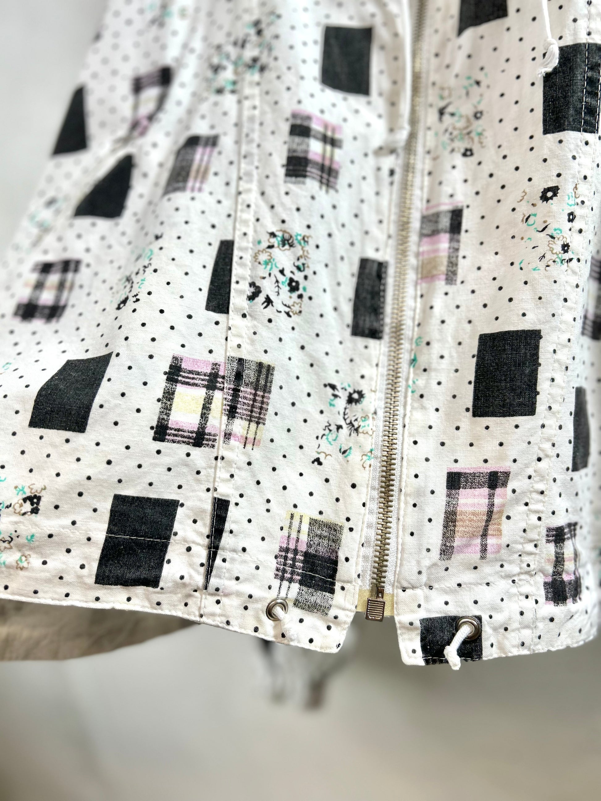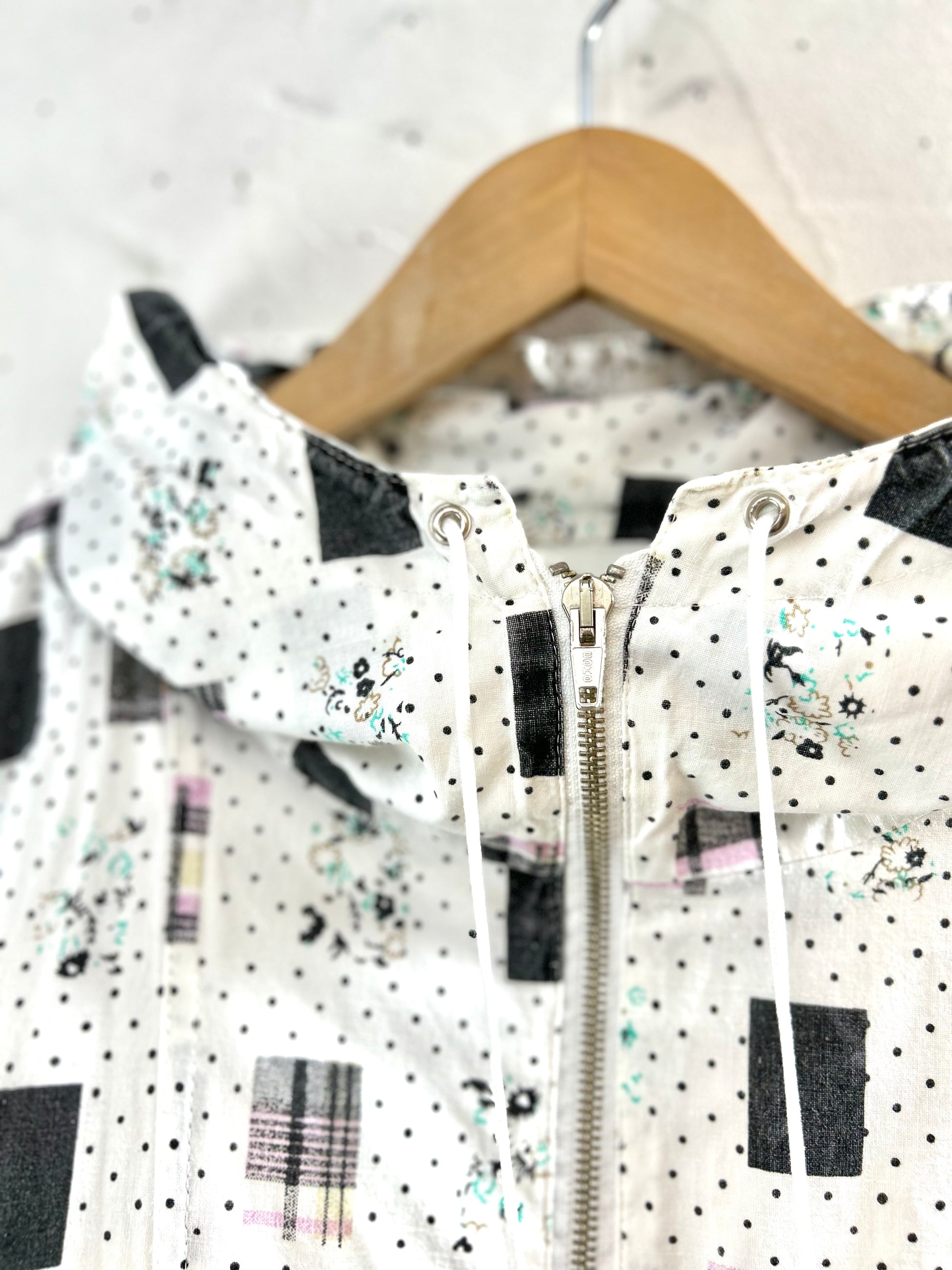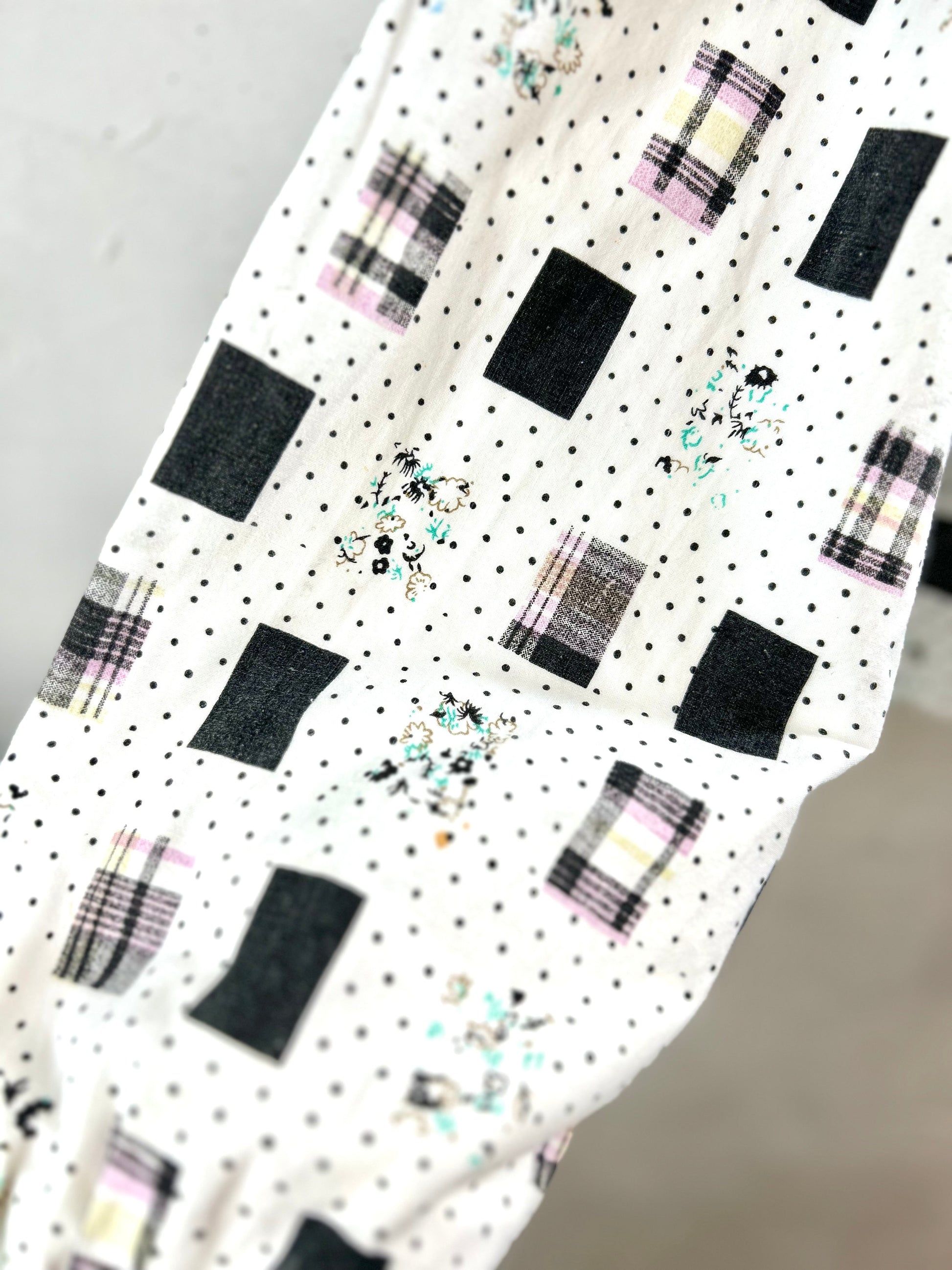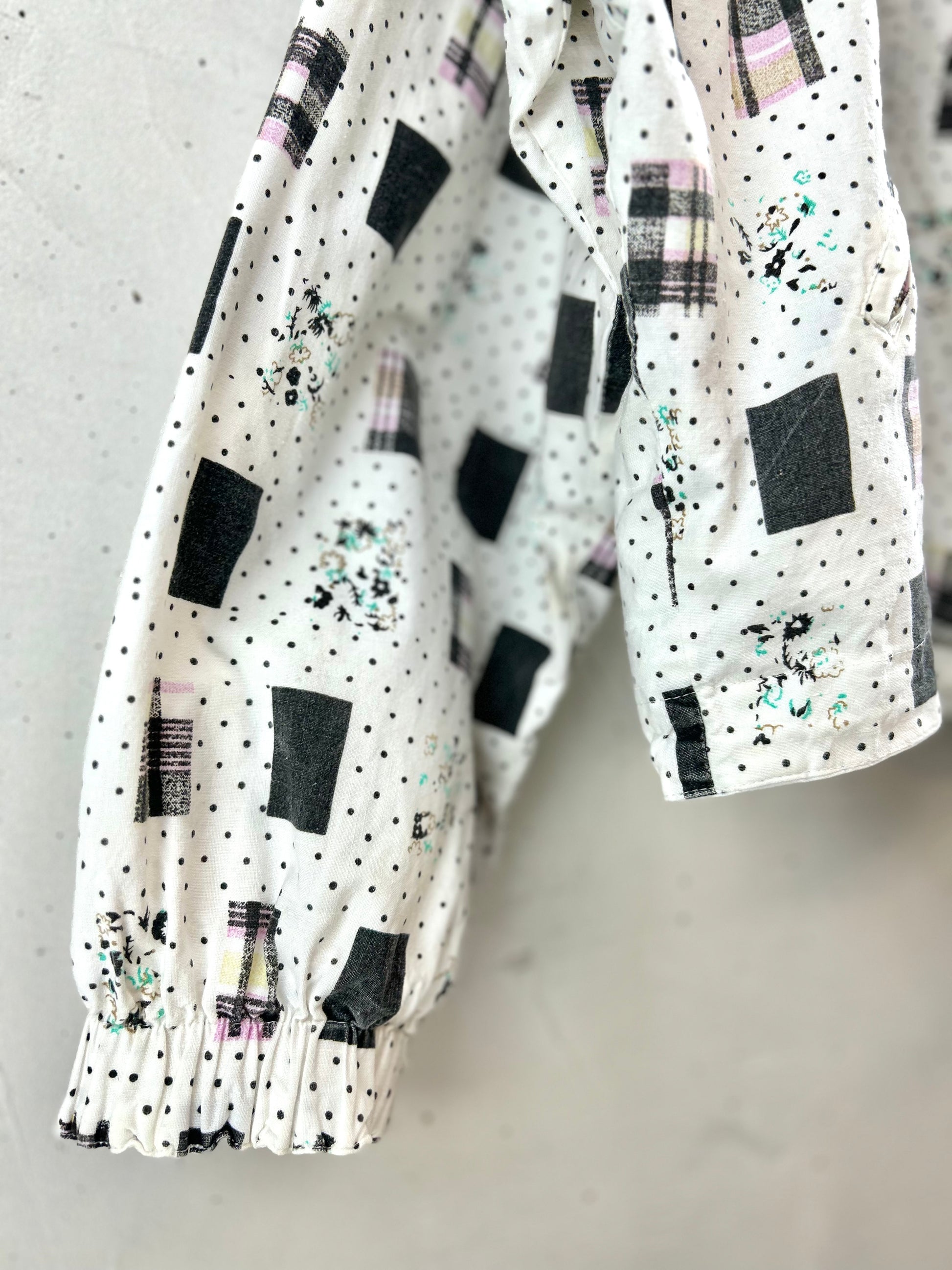 ホワイトベースカラーにブラックドットとパッチ風の柄が可愛い1着。