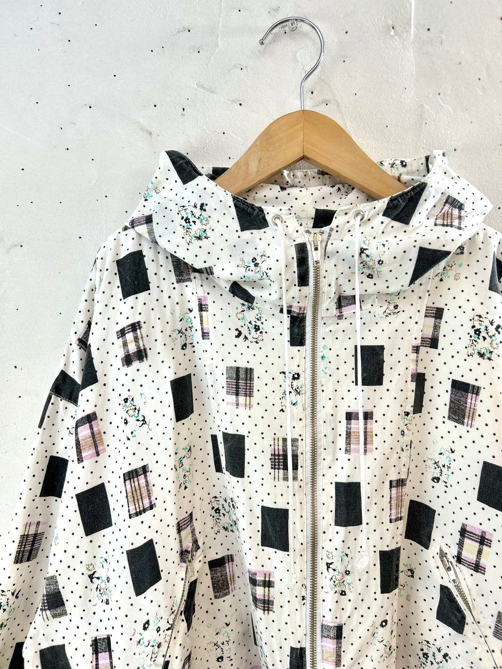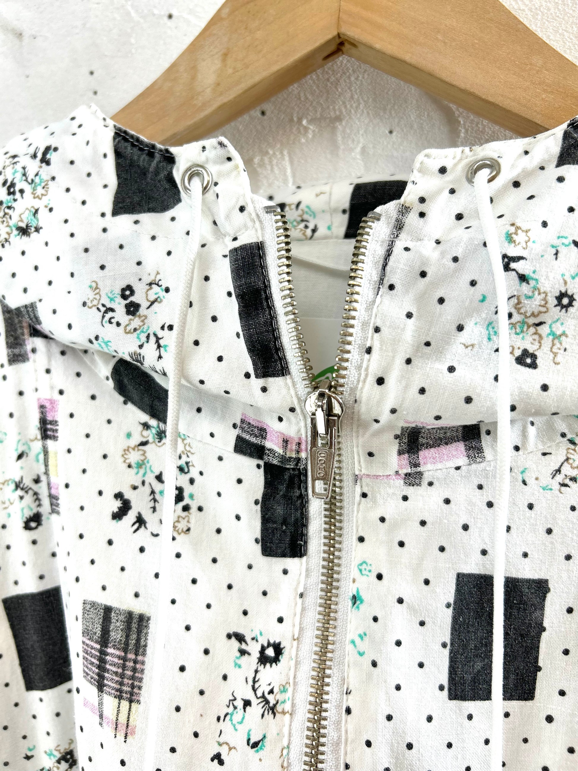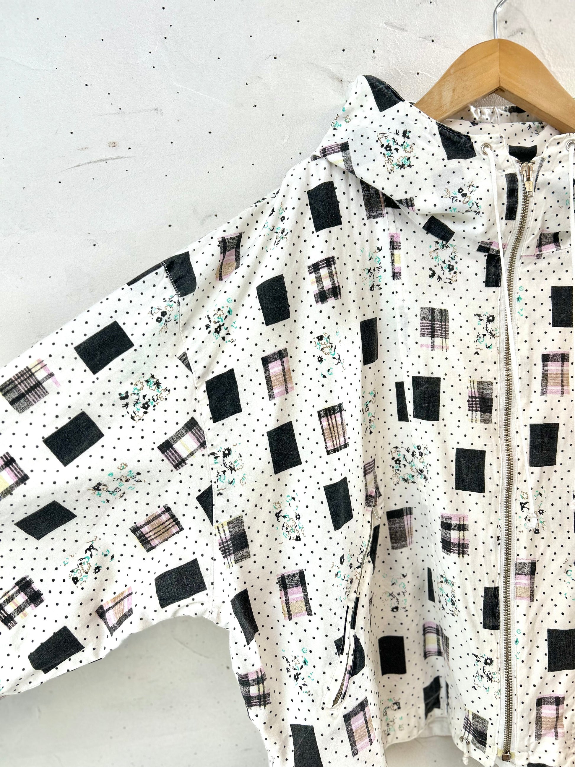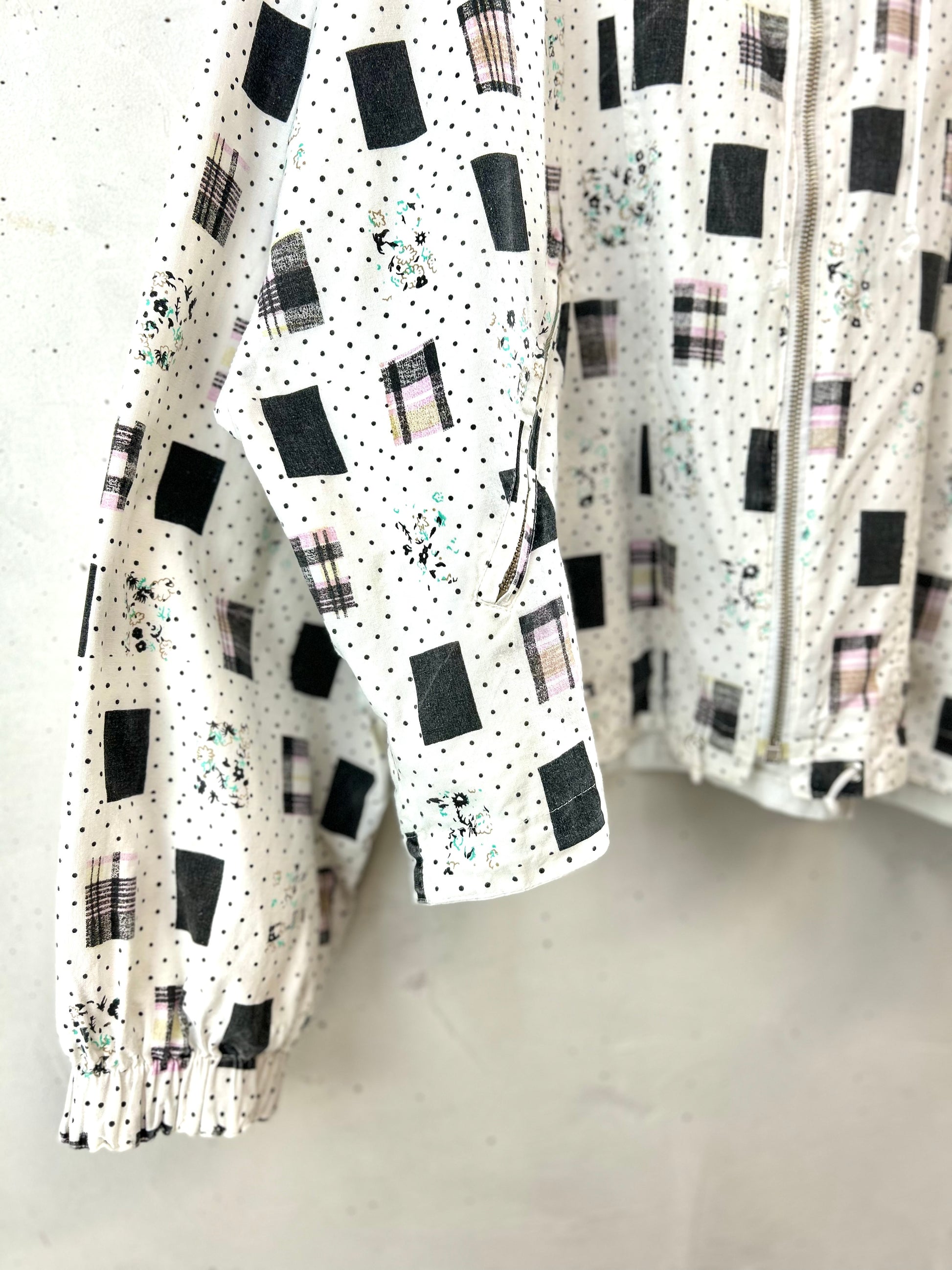 ホワイトベースカラーにブラックドットとパッチ風の柄が可愛い1着。