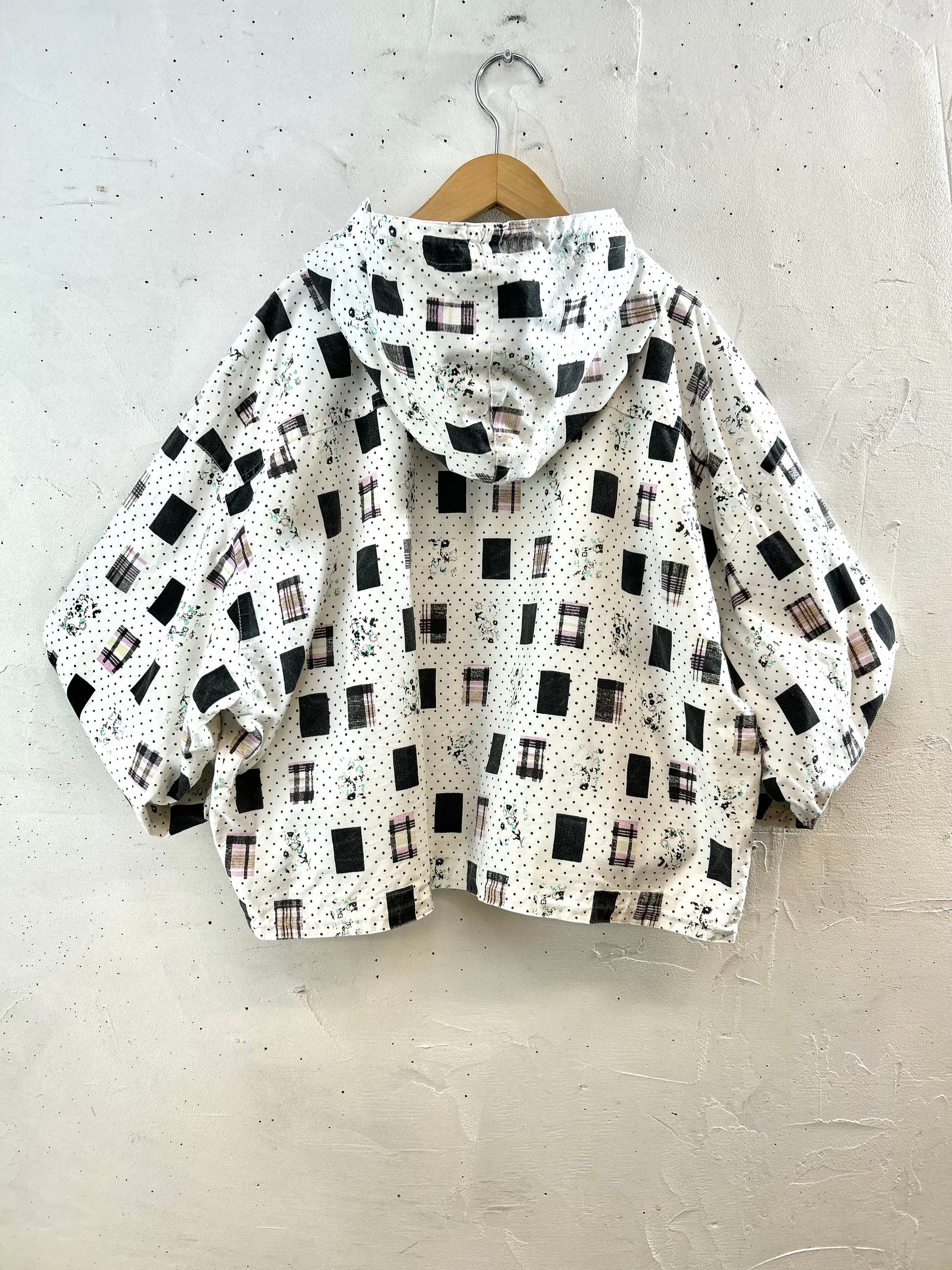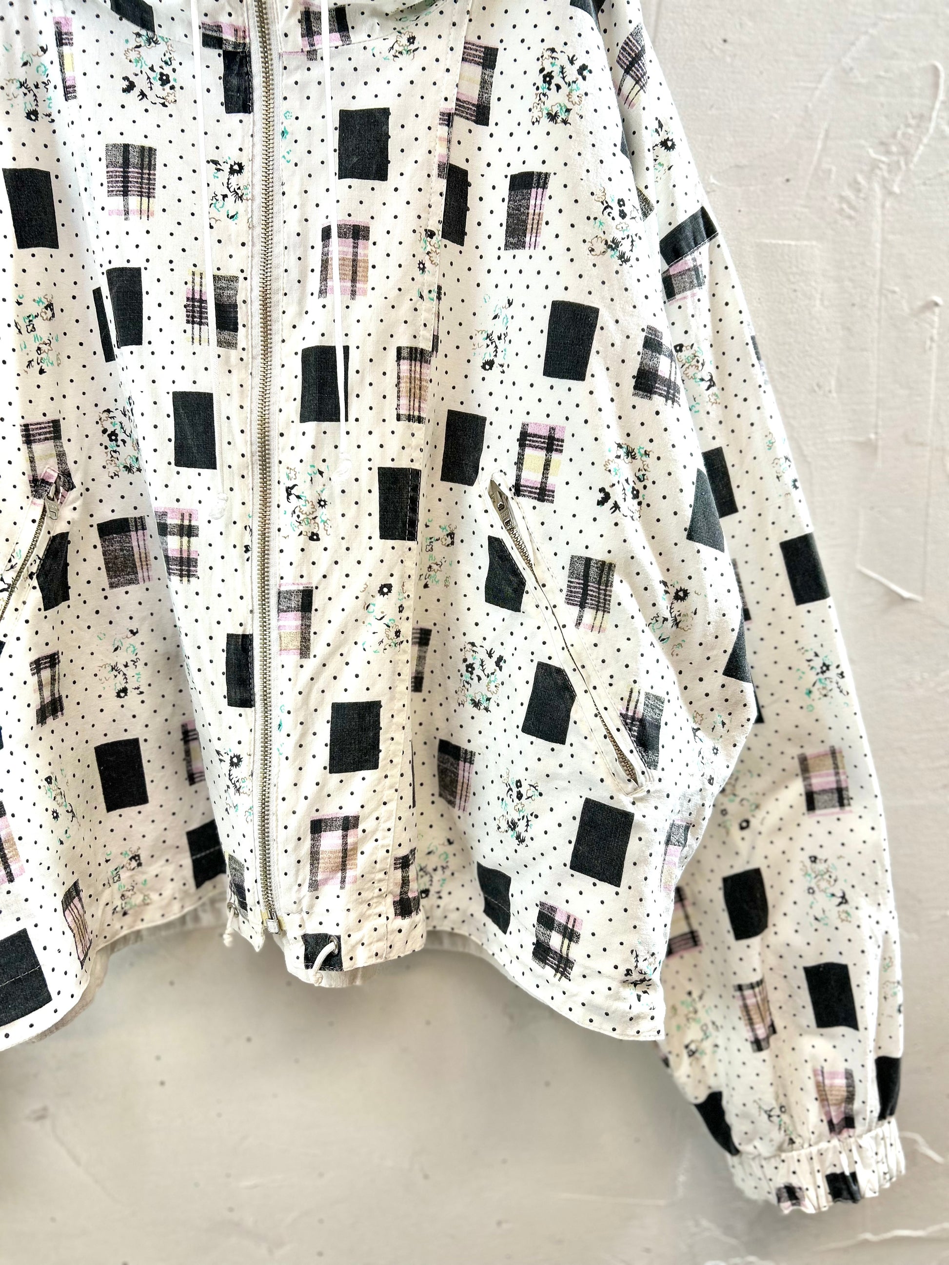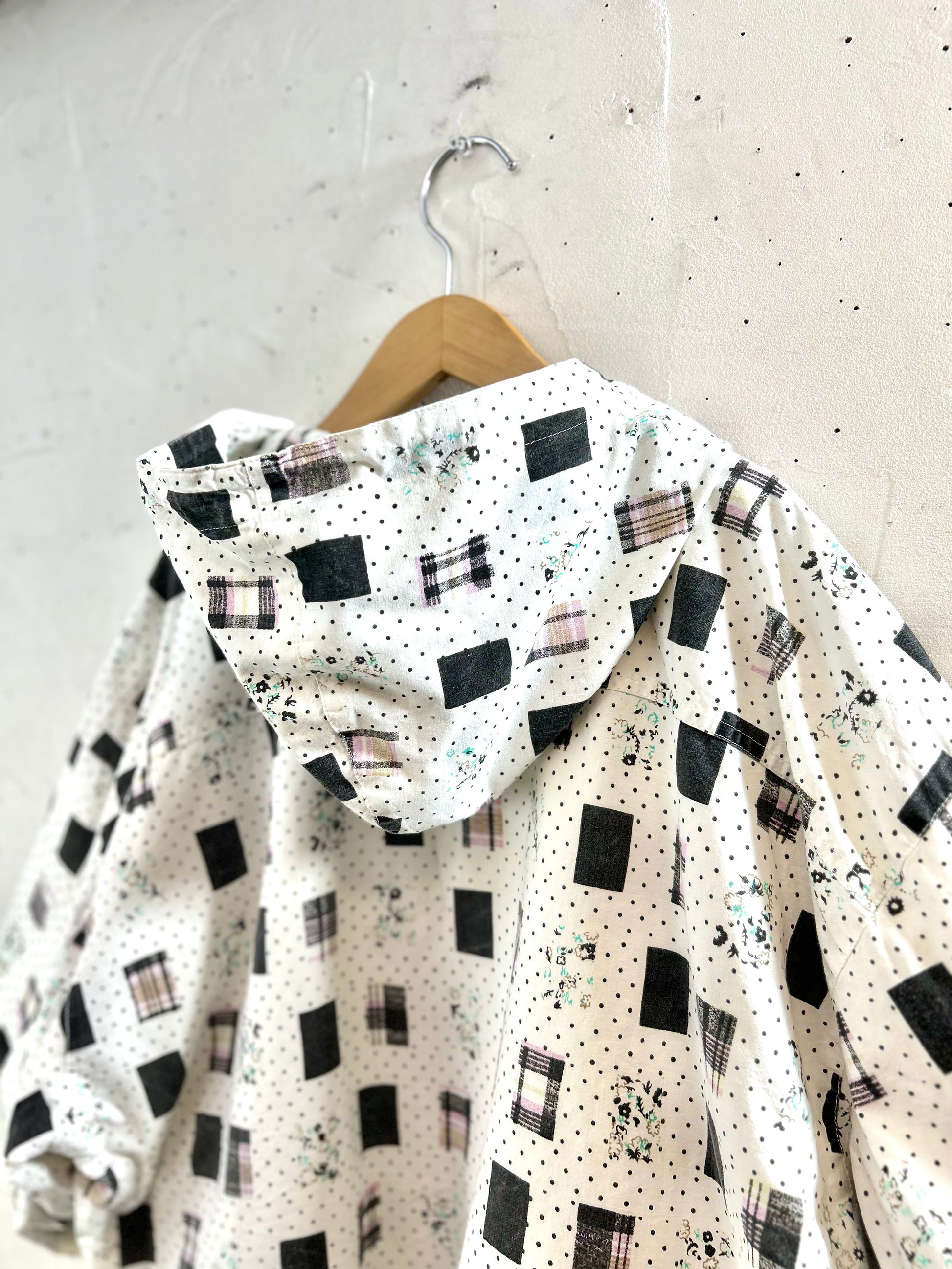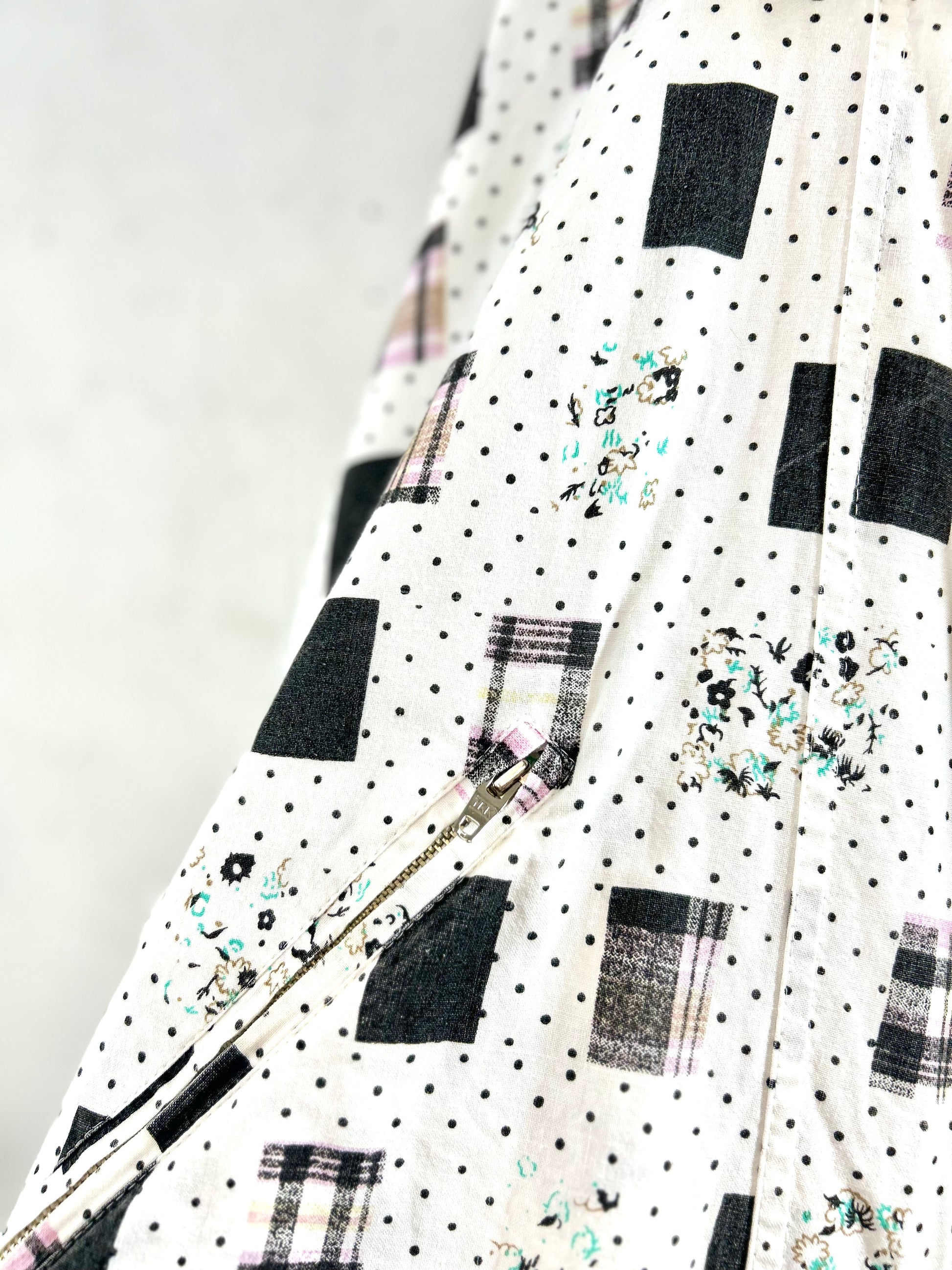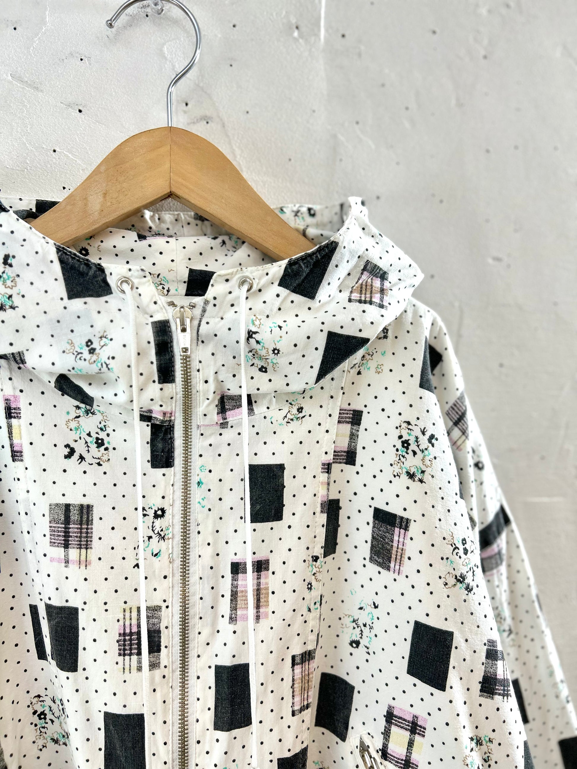 ホワイトベースカラーにブラックドットとパッチ風の柄が可愛い1着。