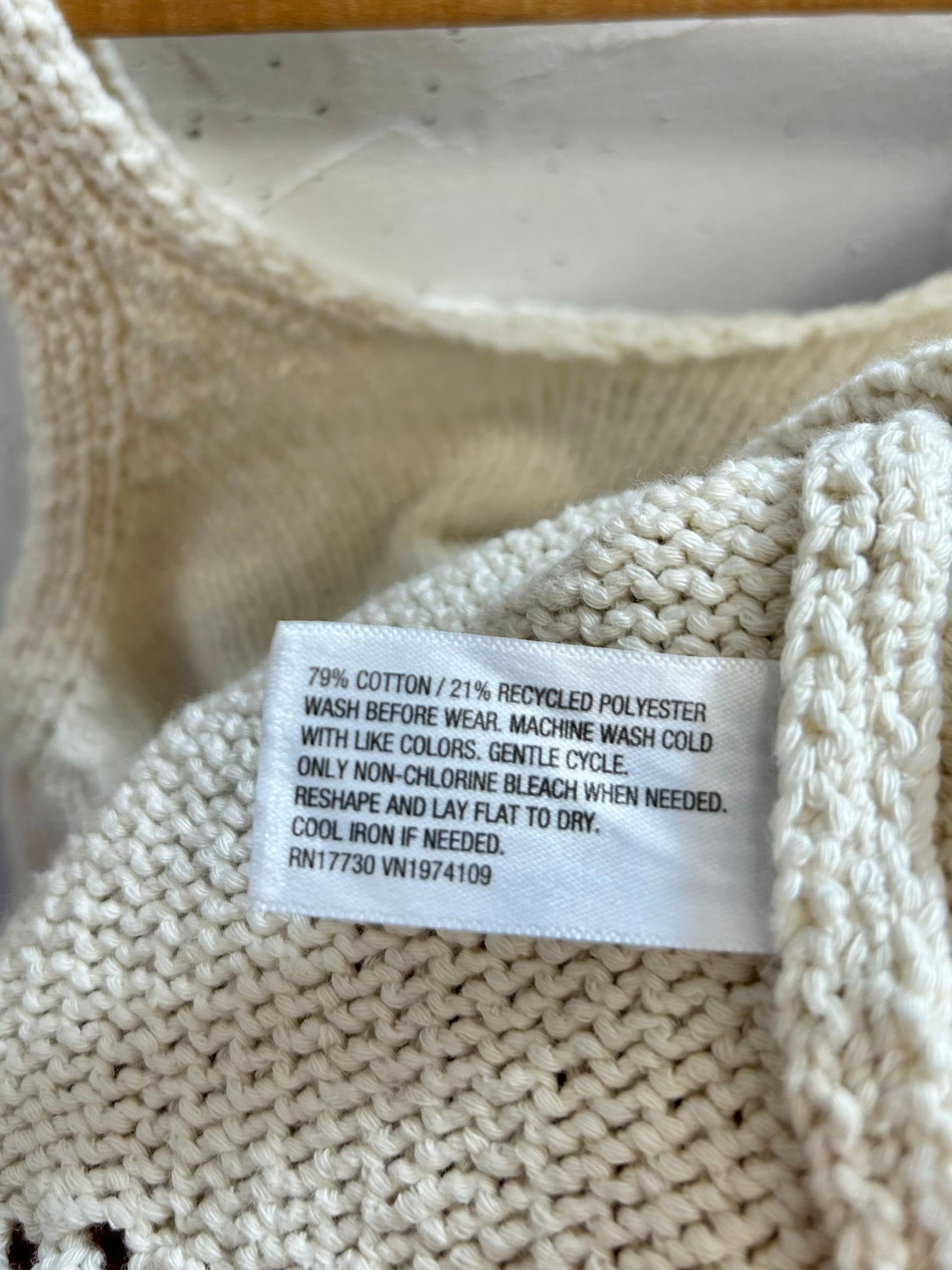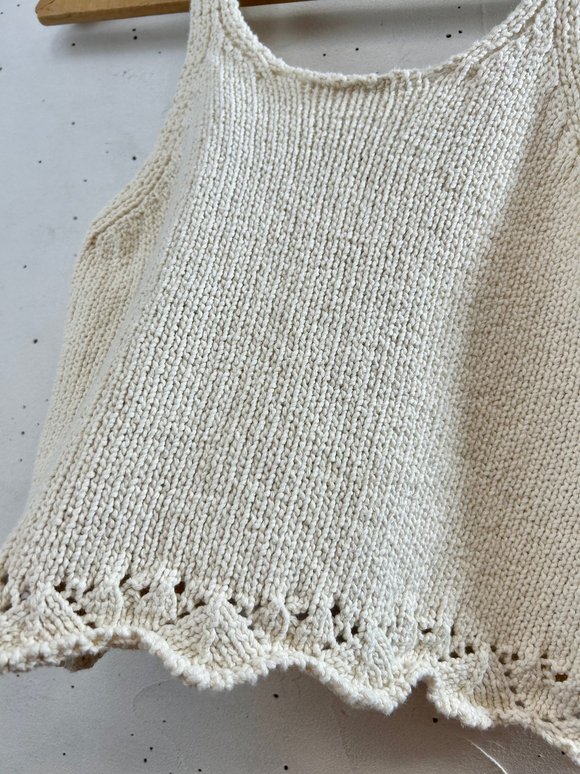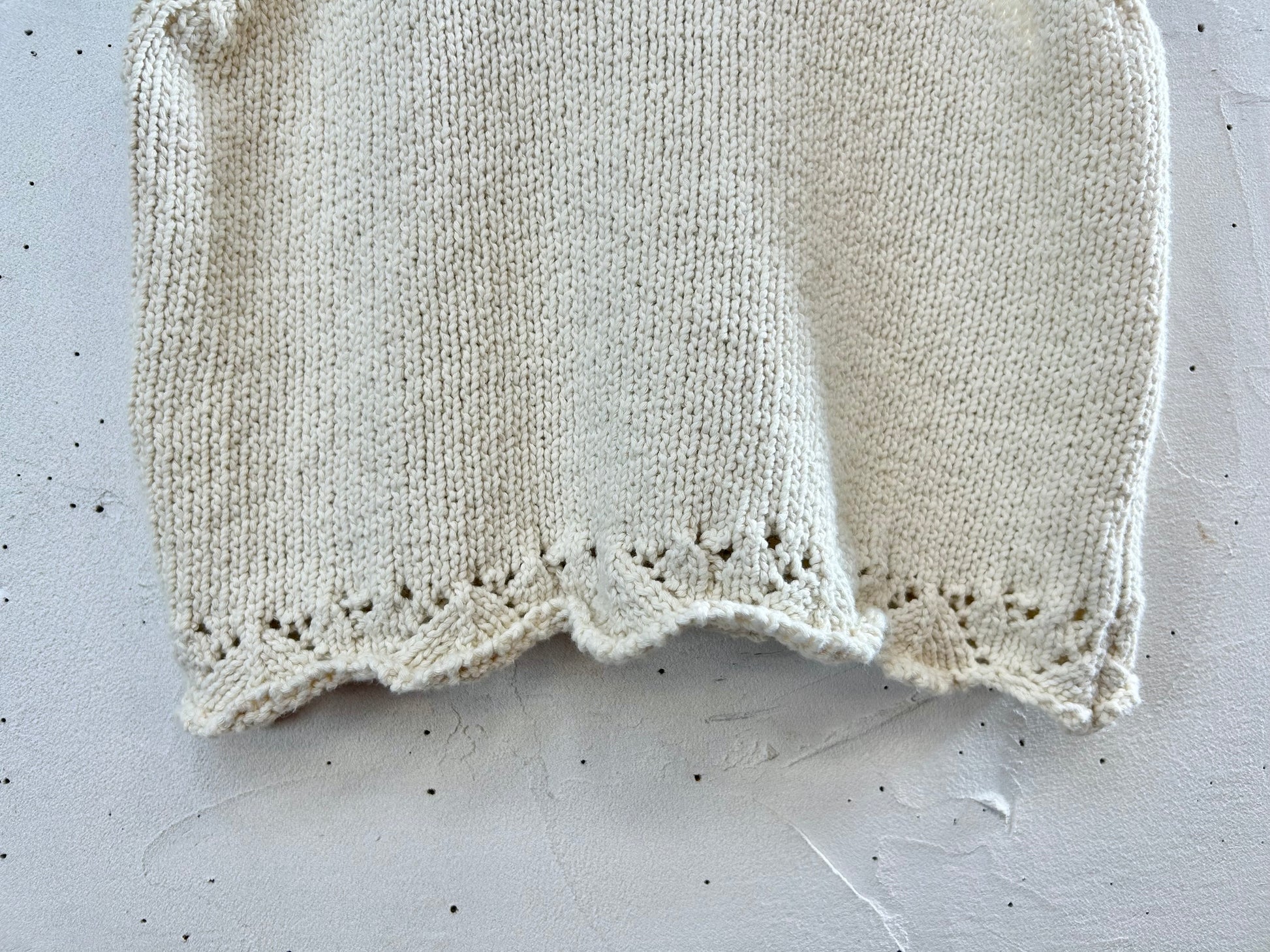 オフホワイト単色で着回し力抜群ながらも、裾の透かし編みとクルンとした編みが可愛い一着。
