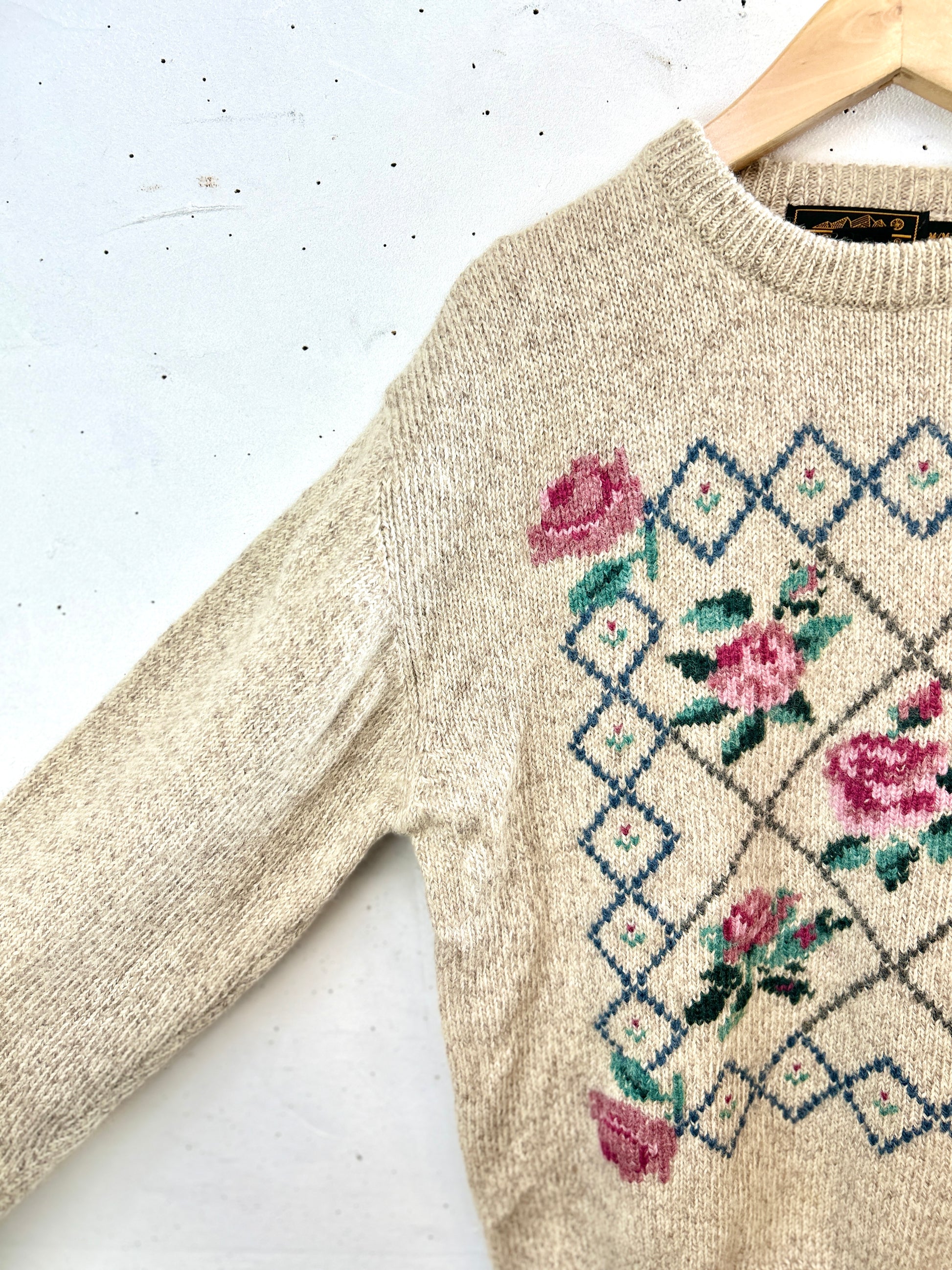 優しいカラーリングに、アーガイル柄の様な雰囲気とお花が可愛らしい1着。