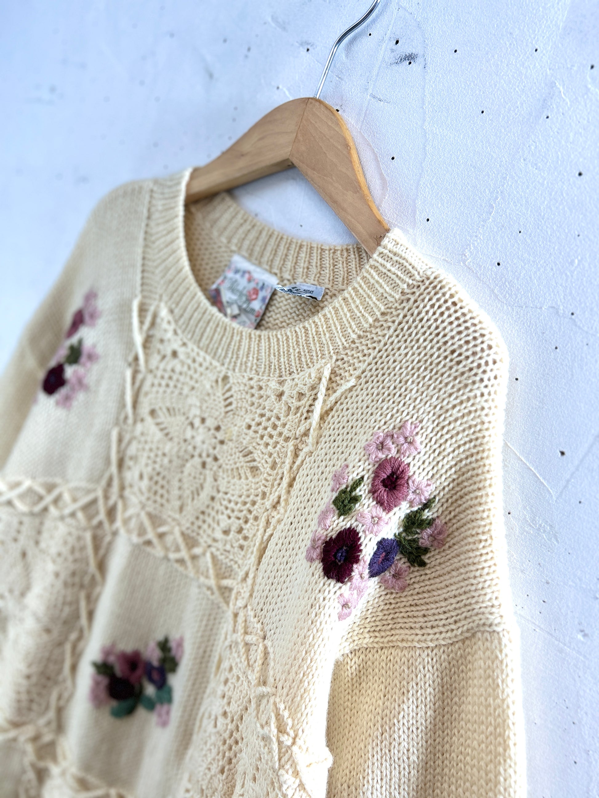 しっかりと編まれたホワイトボディに、立体的な花の刺繍や編み柄が可愛いアイテム。