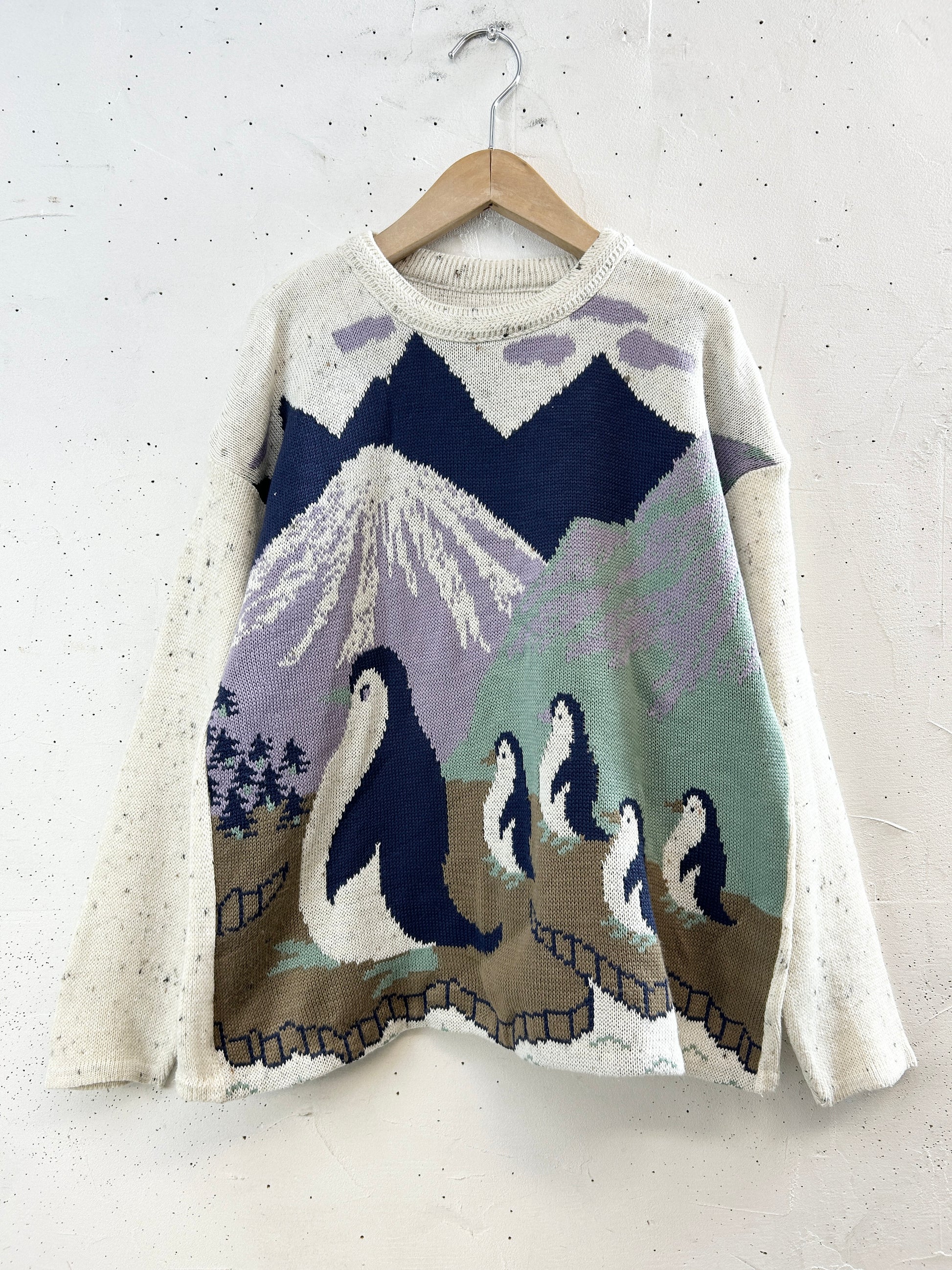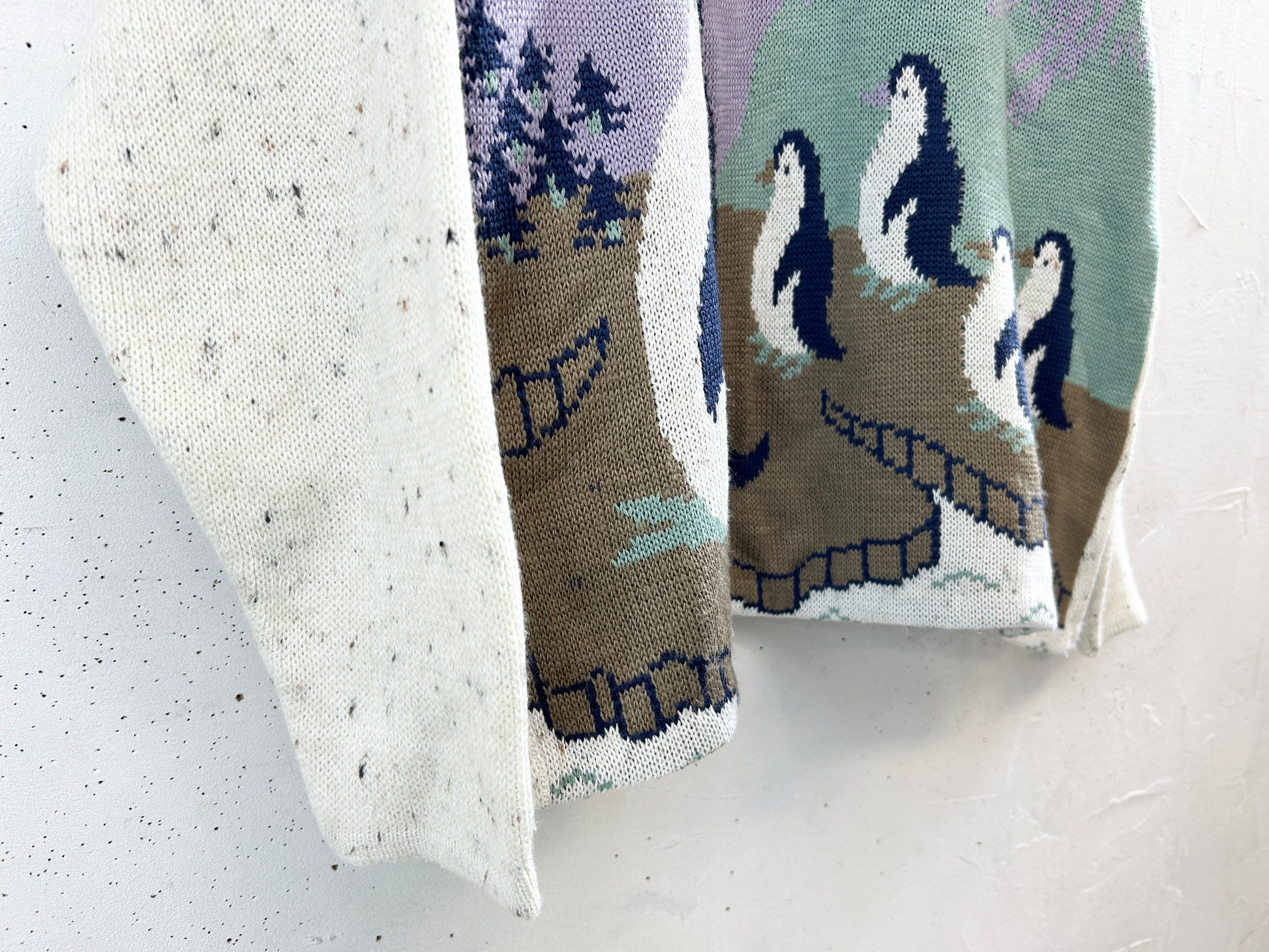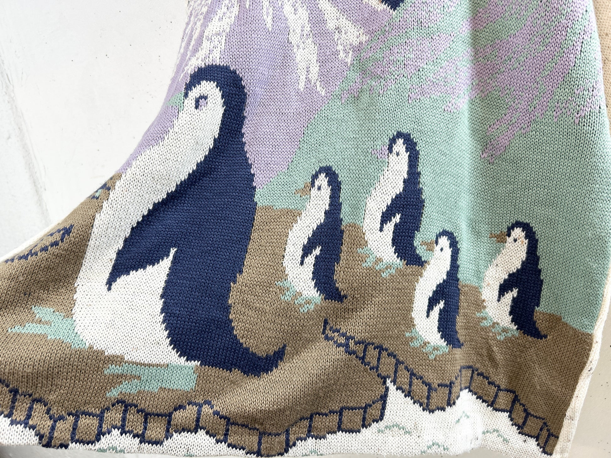 ペンギンの親子が流氷の上を歩く風景のほっこりデザインが可愛い薄手のニットアイテム。