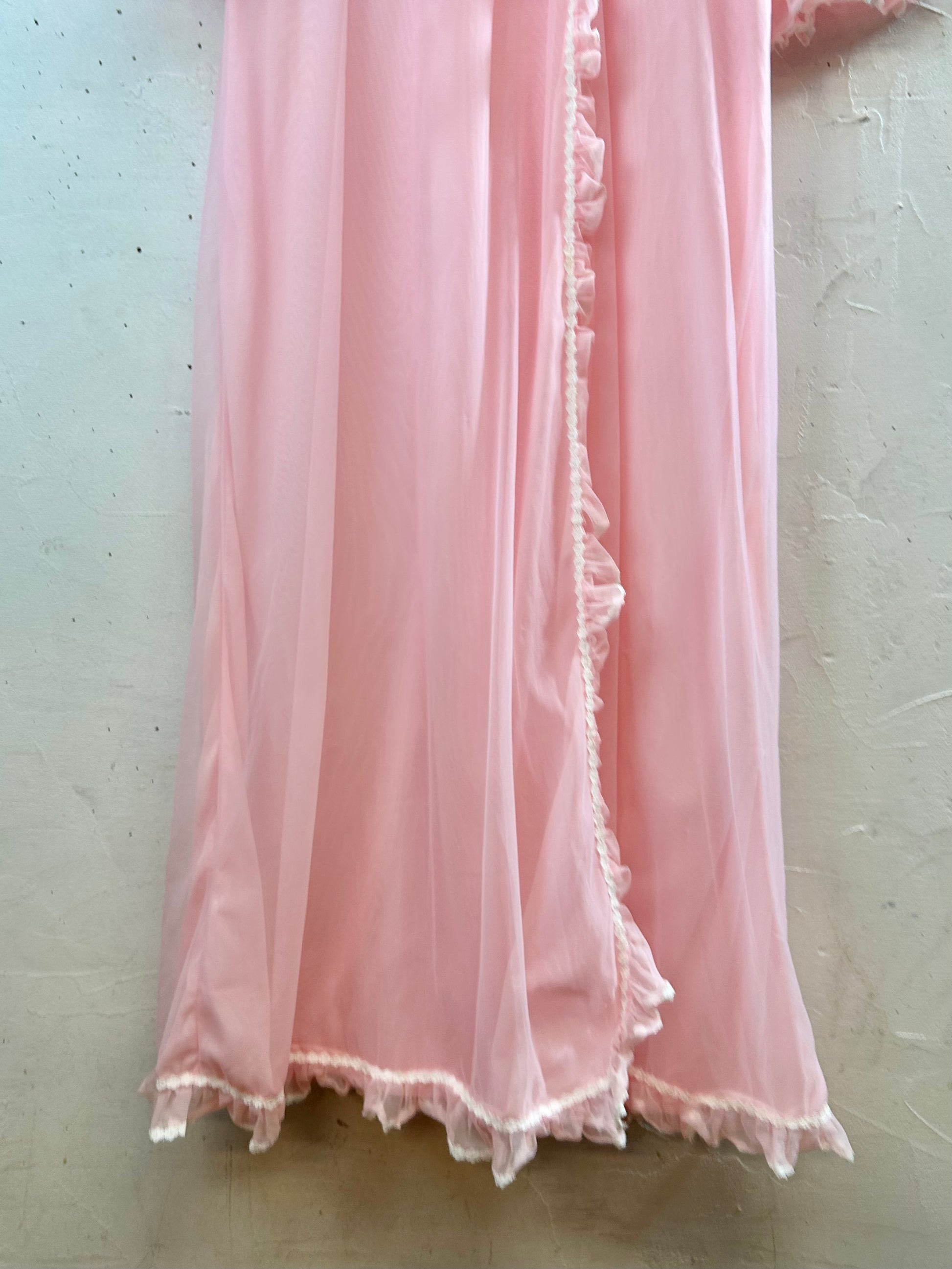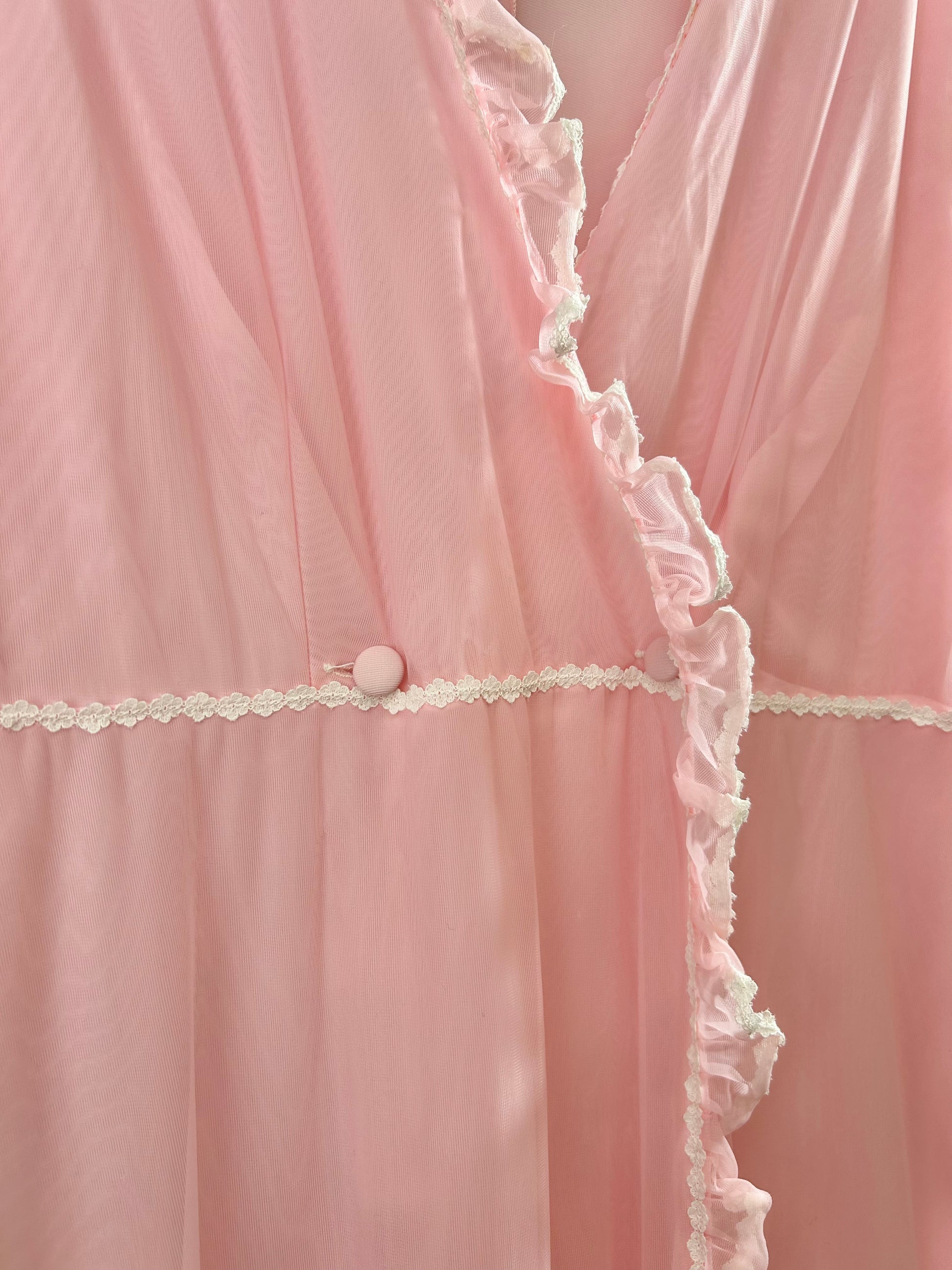 ピンクのシアー生地にフラワーレースがやフリルが施された可愛らしい1着。