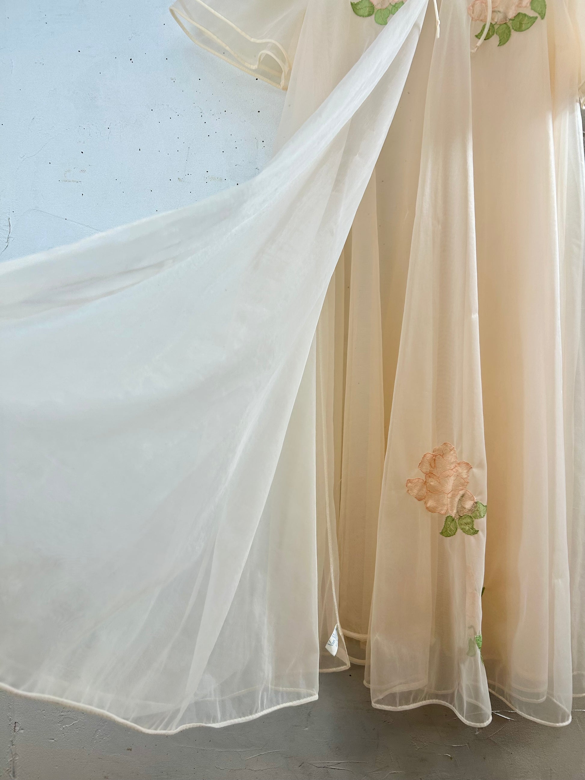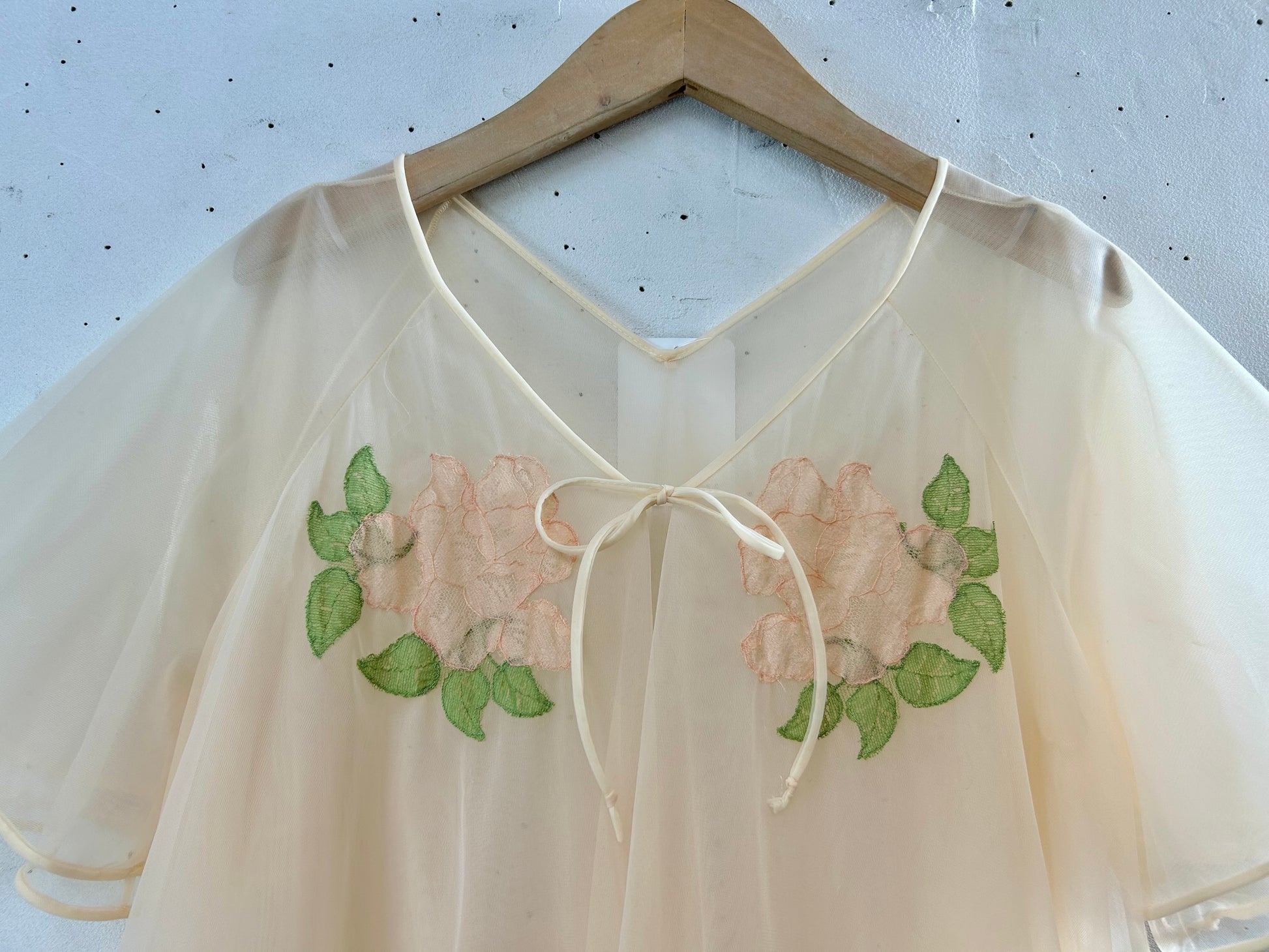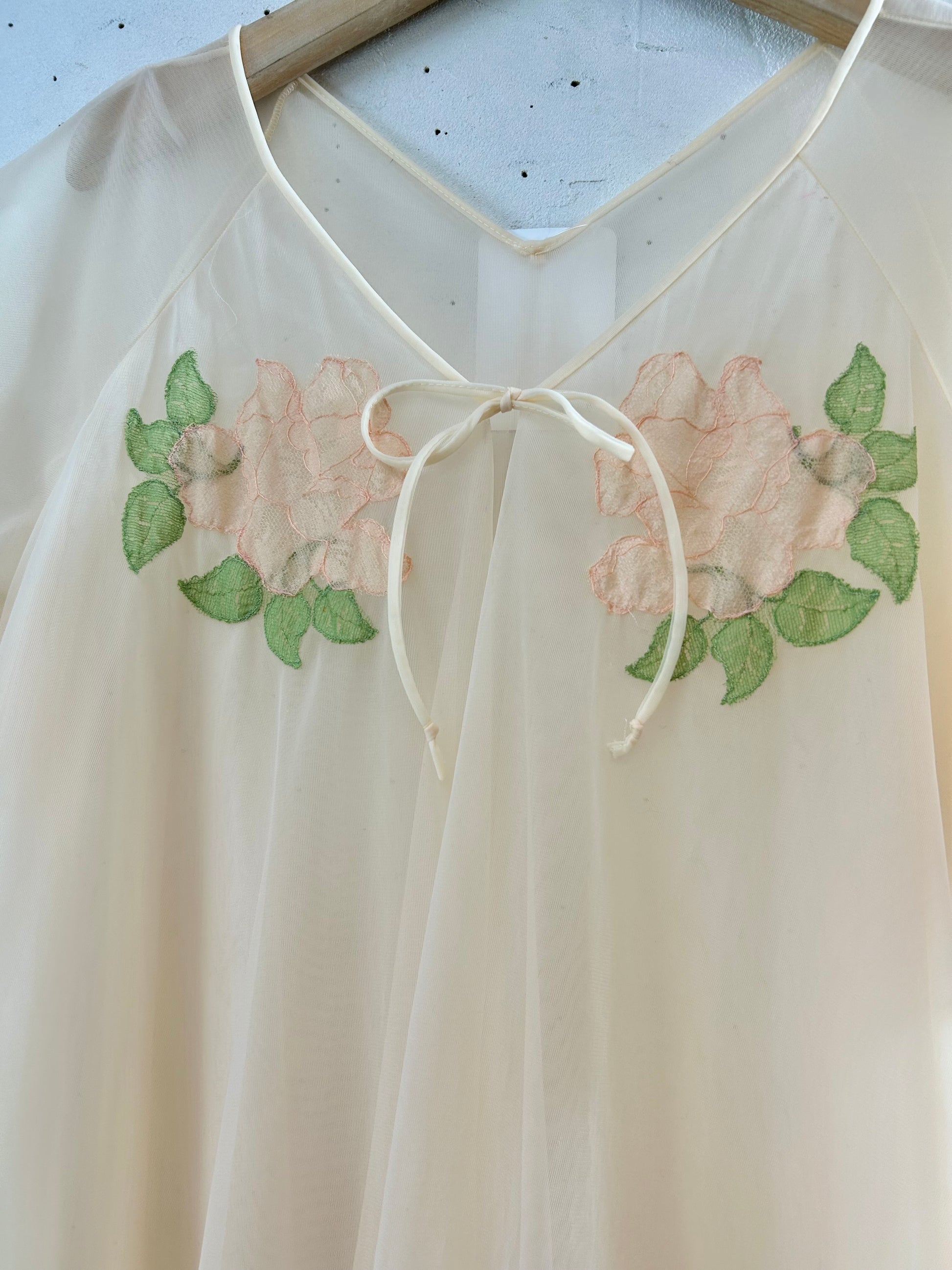 淡いペールオレンジのシアー生地にレース生地のバラのパッチが施されたガーリーな1着。