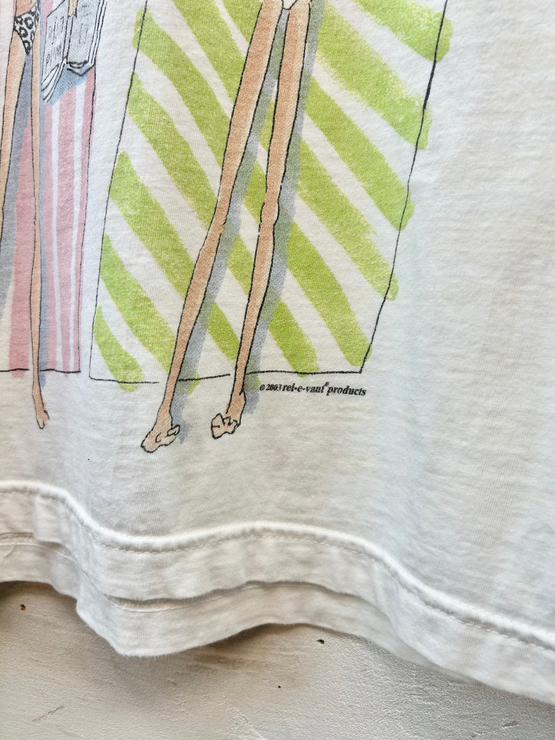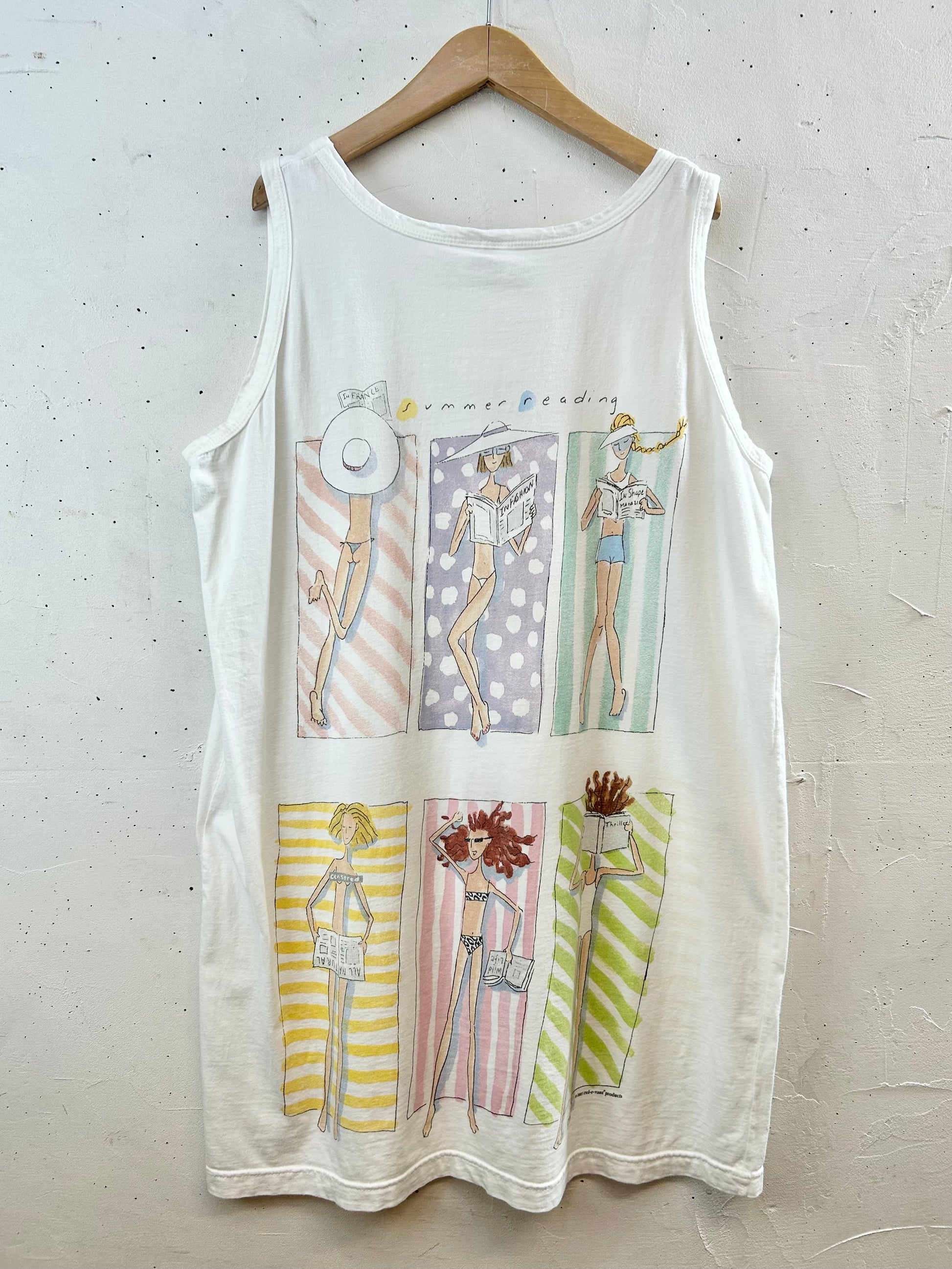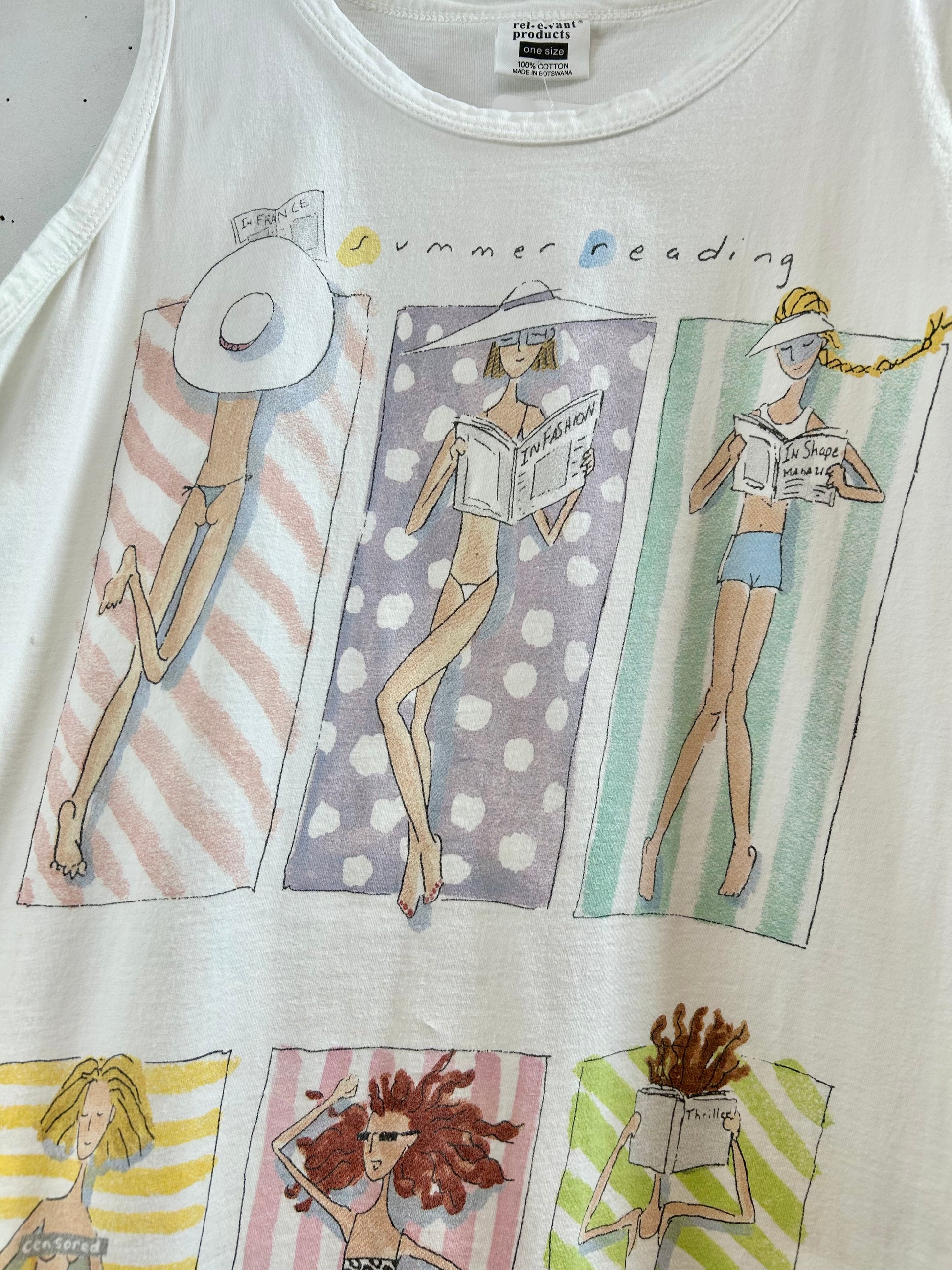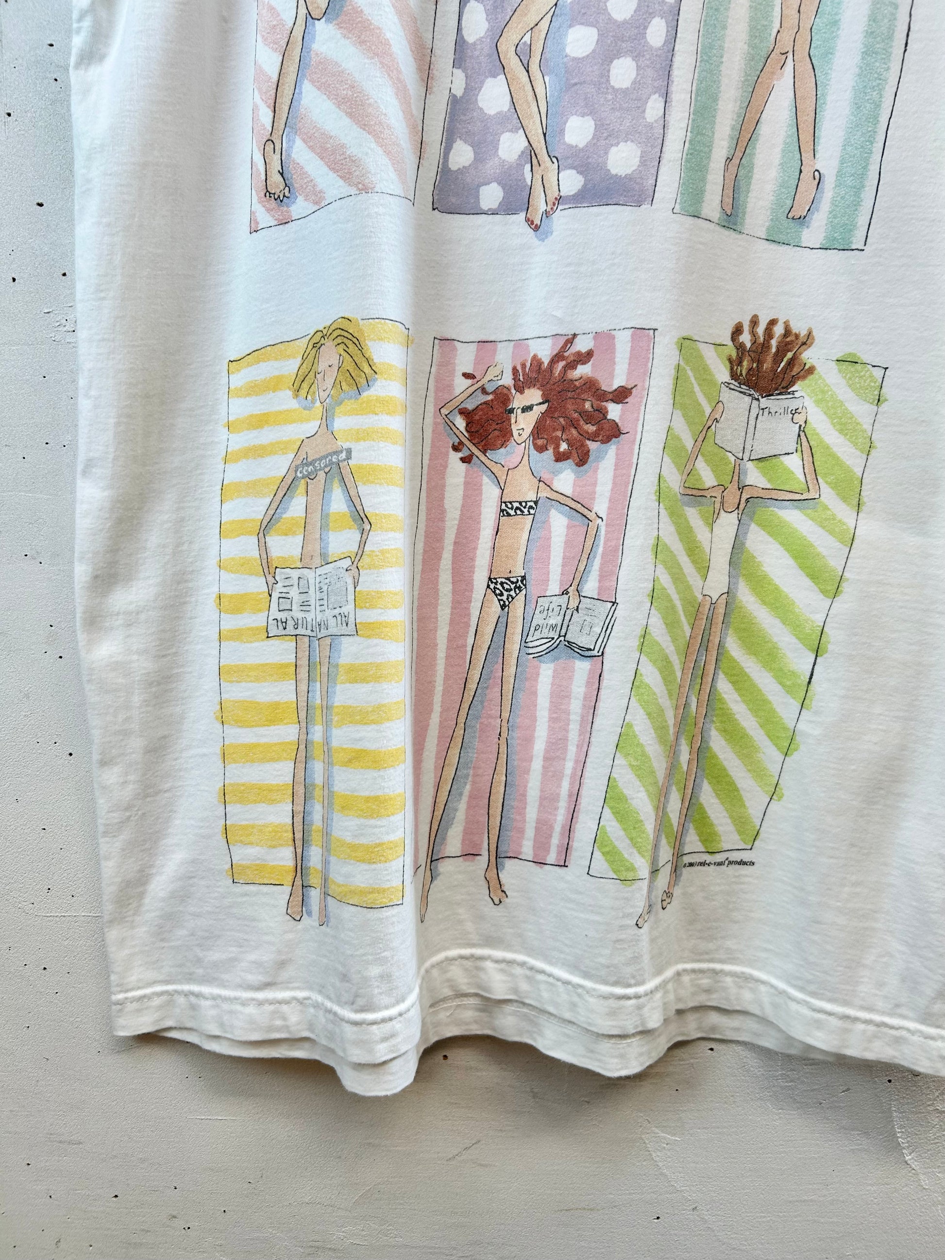 ビーチで本や雑誌を読みながらお昼寝するガールたちの両面プリントが可愛らしい一着。