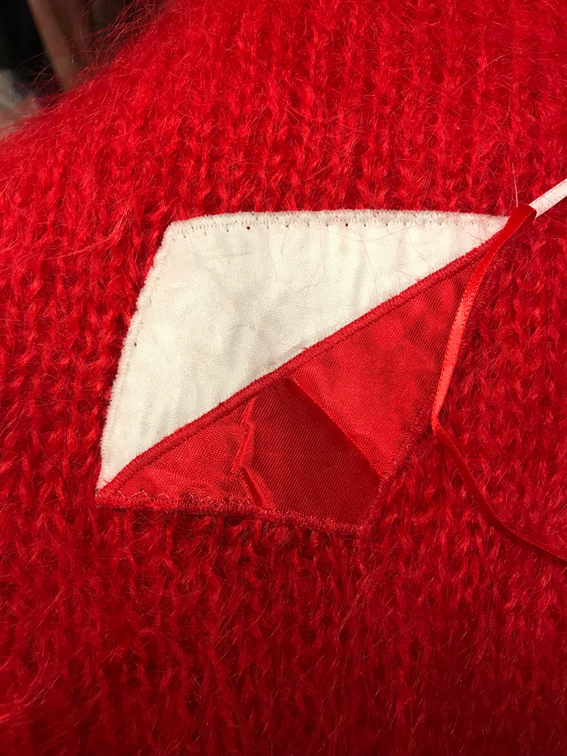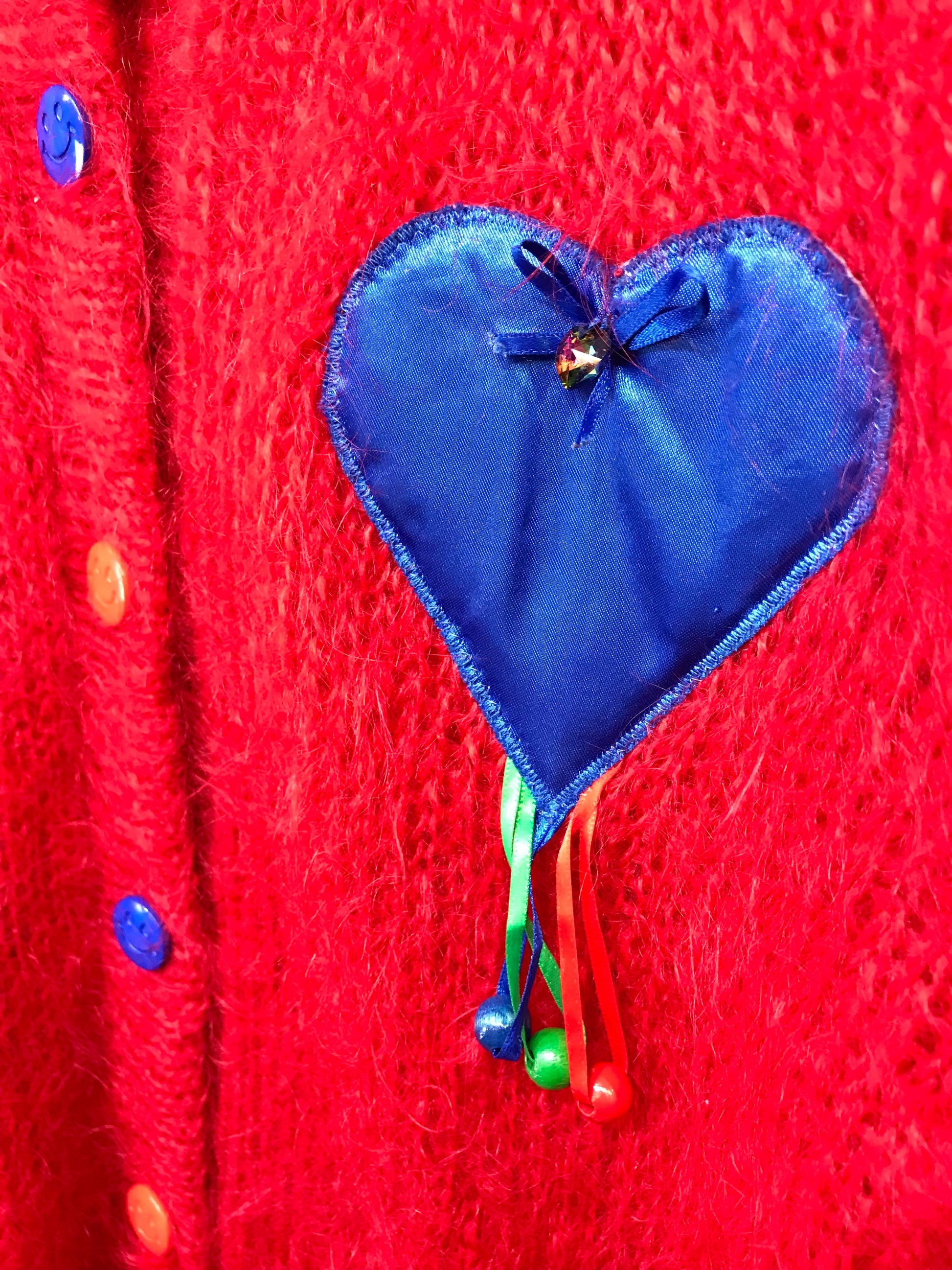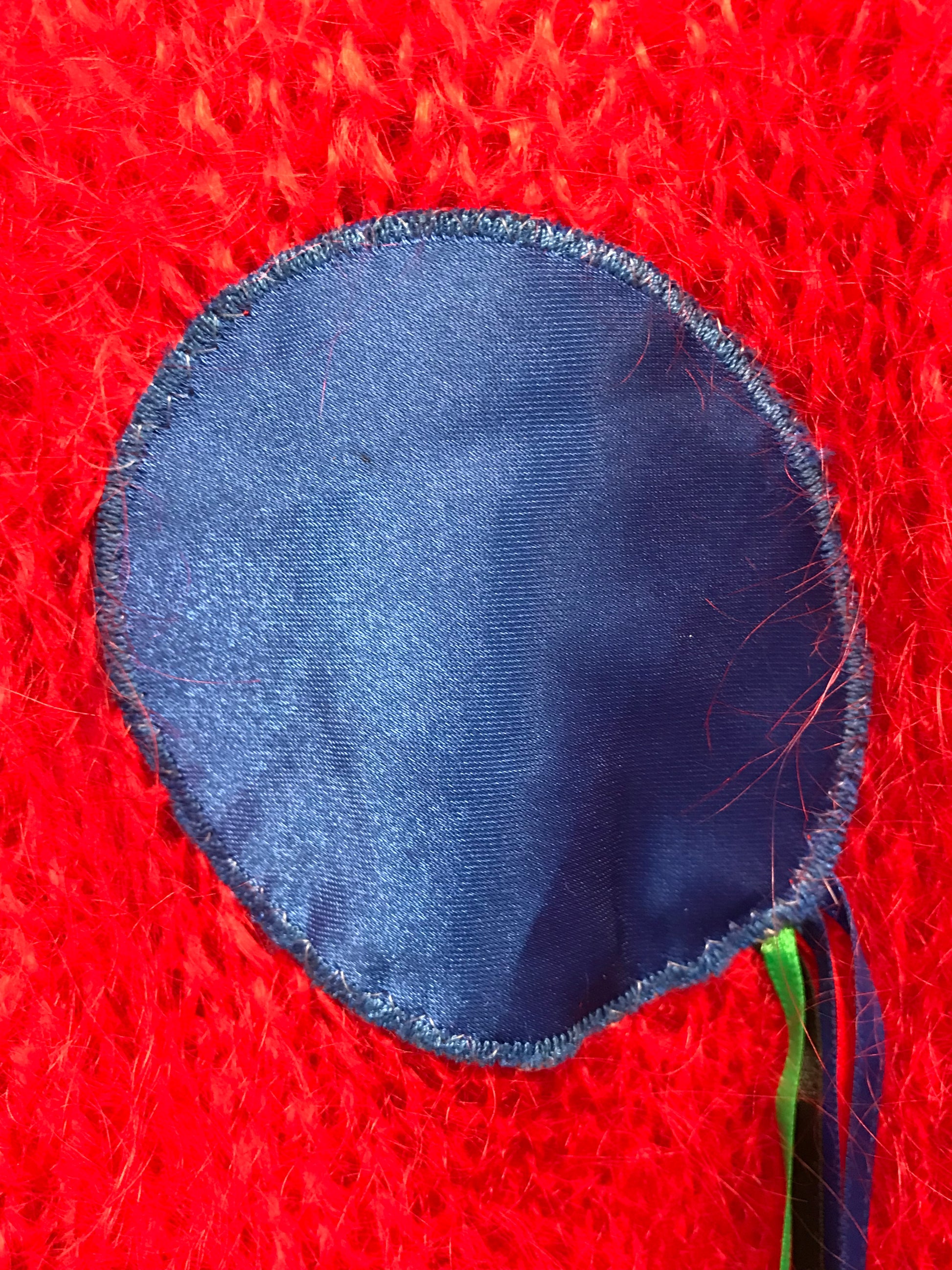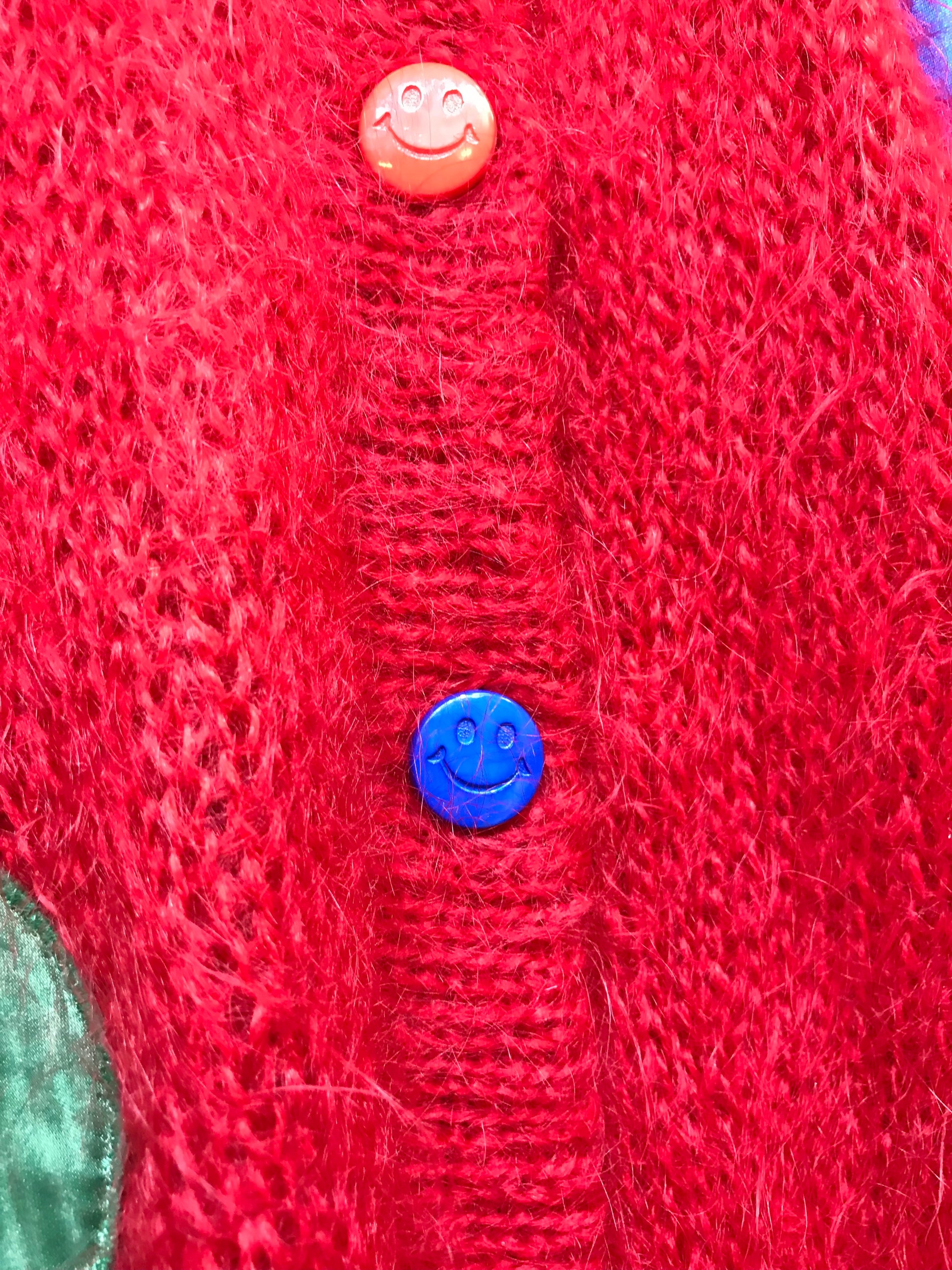 モヘアのふわふわとした毛足のボディにピエロのパッチが可愛らしい1着。