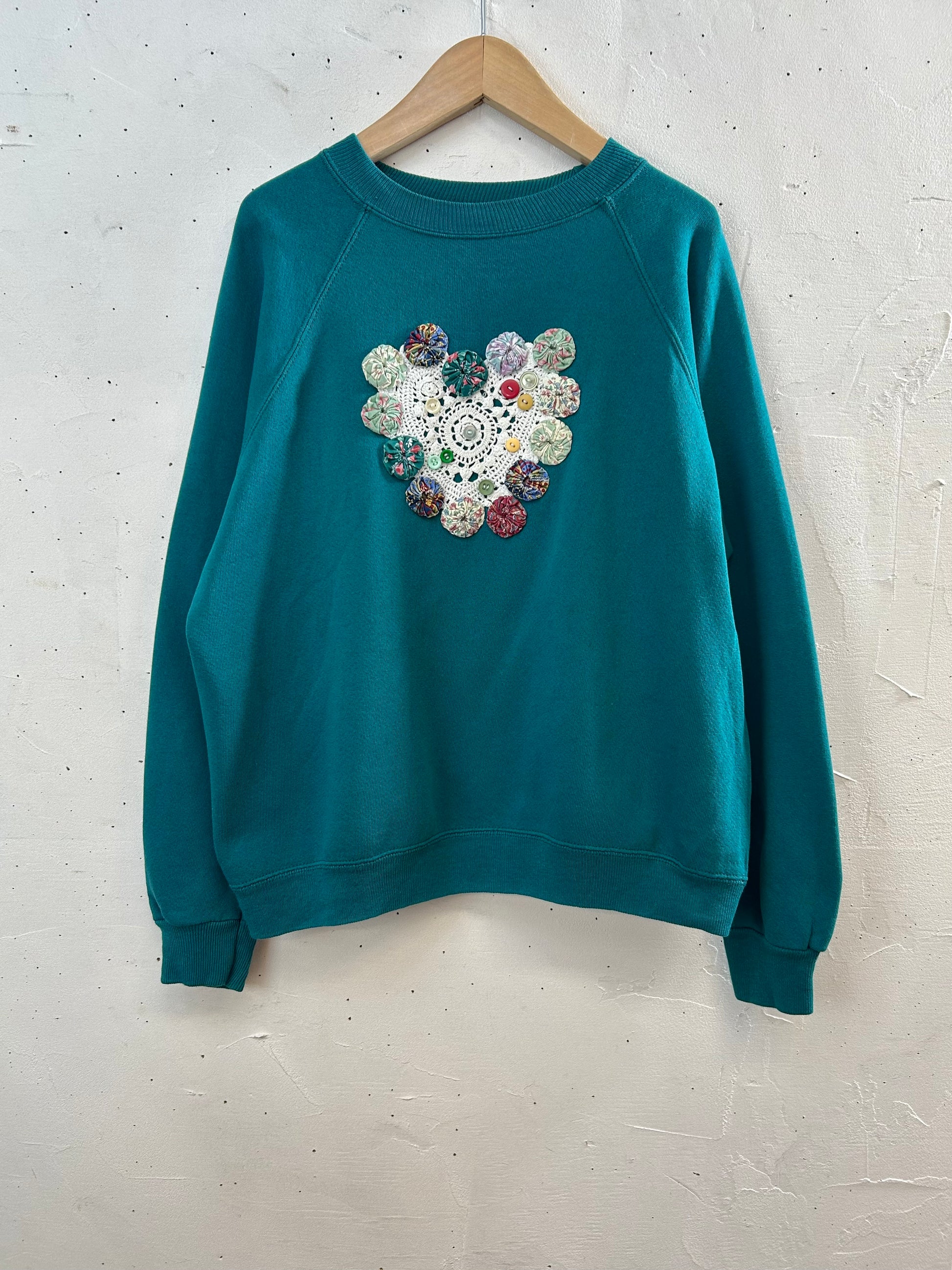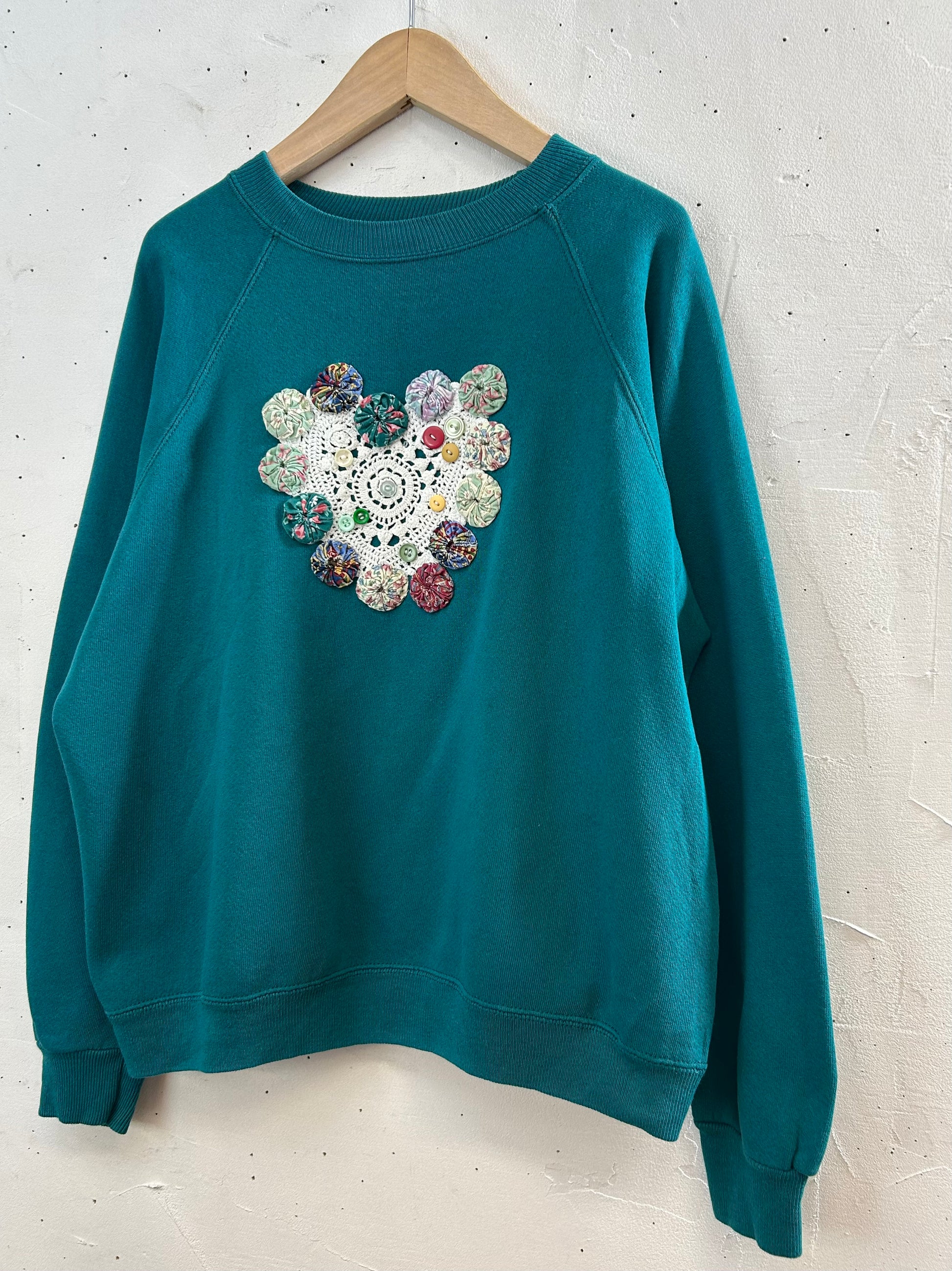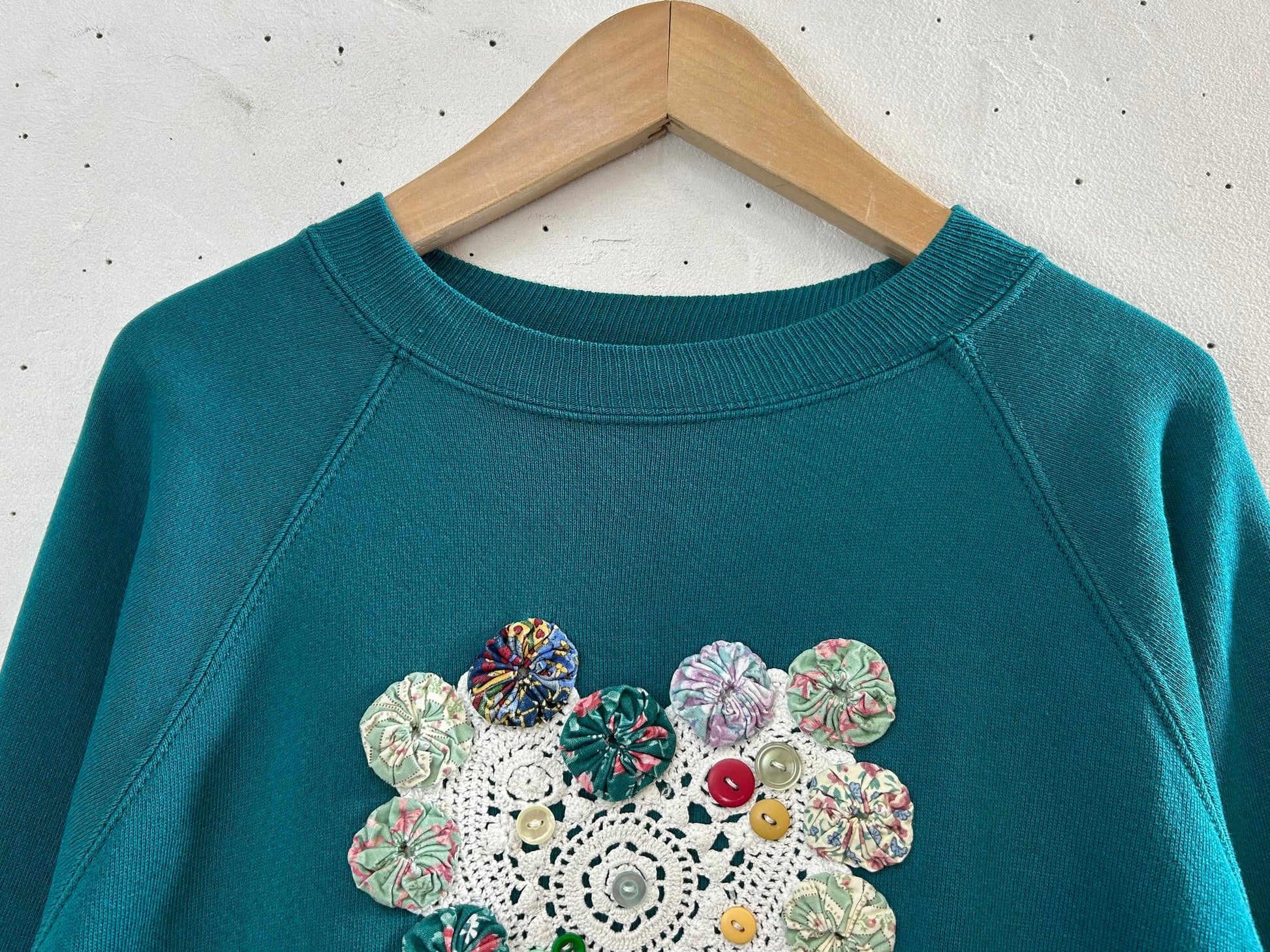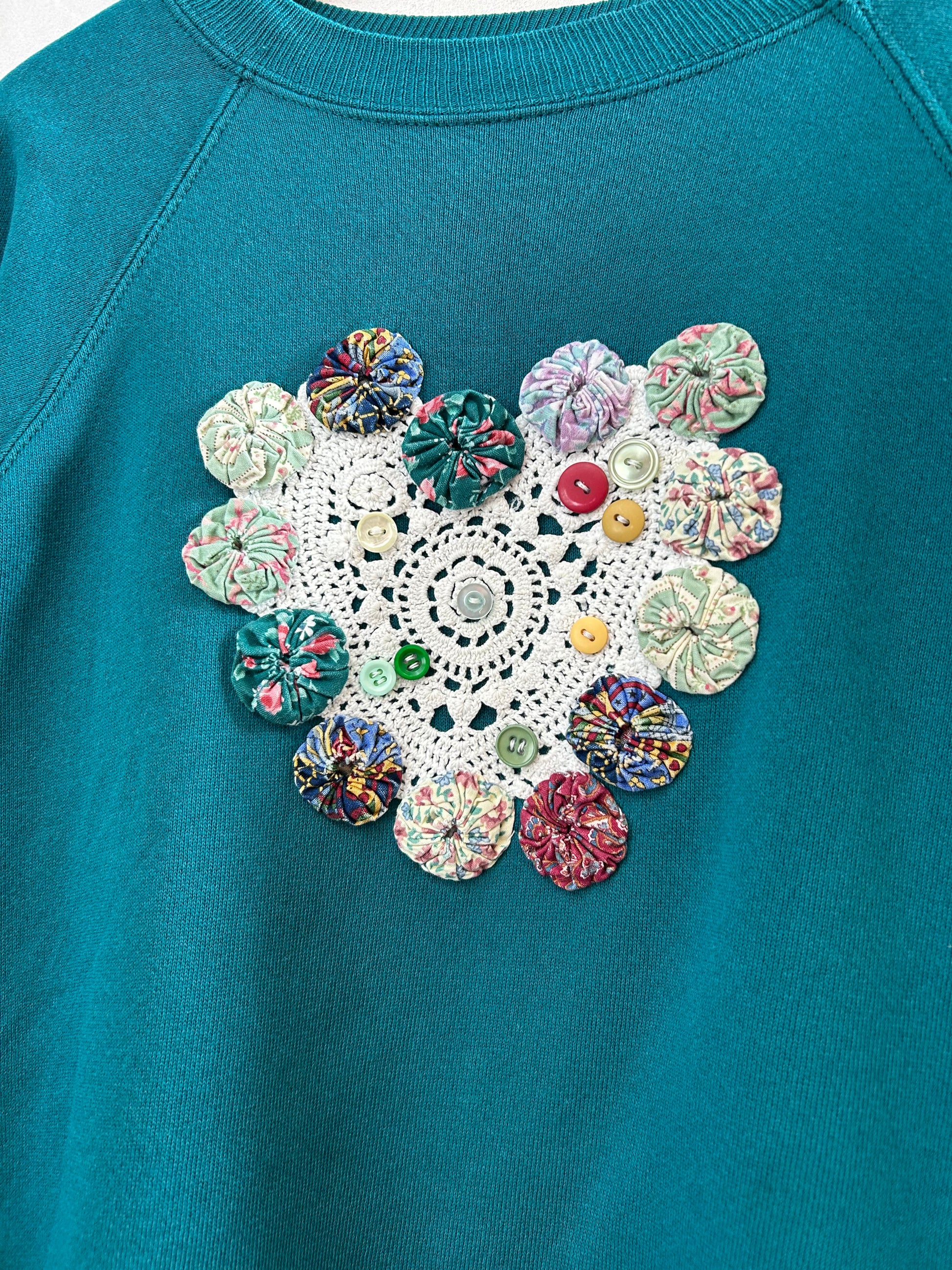Hanesのグリーンボディに、ハート型のドイリーとヨーヨーキルトやカラフルなボタンの装飾が可愛らしい一着。
