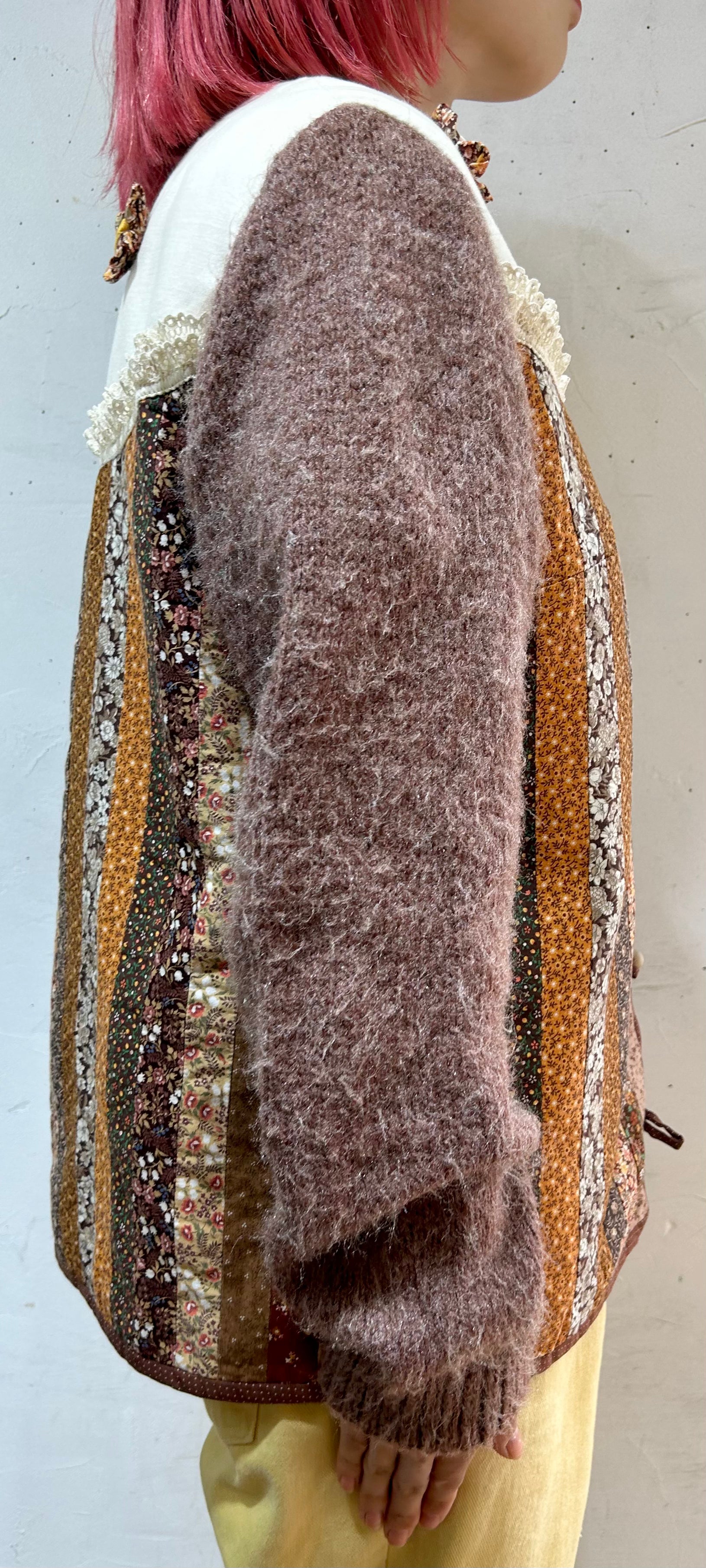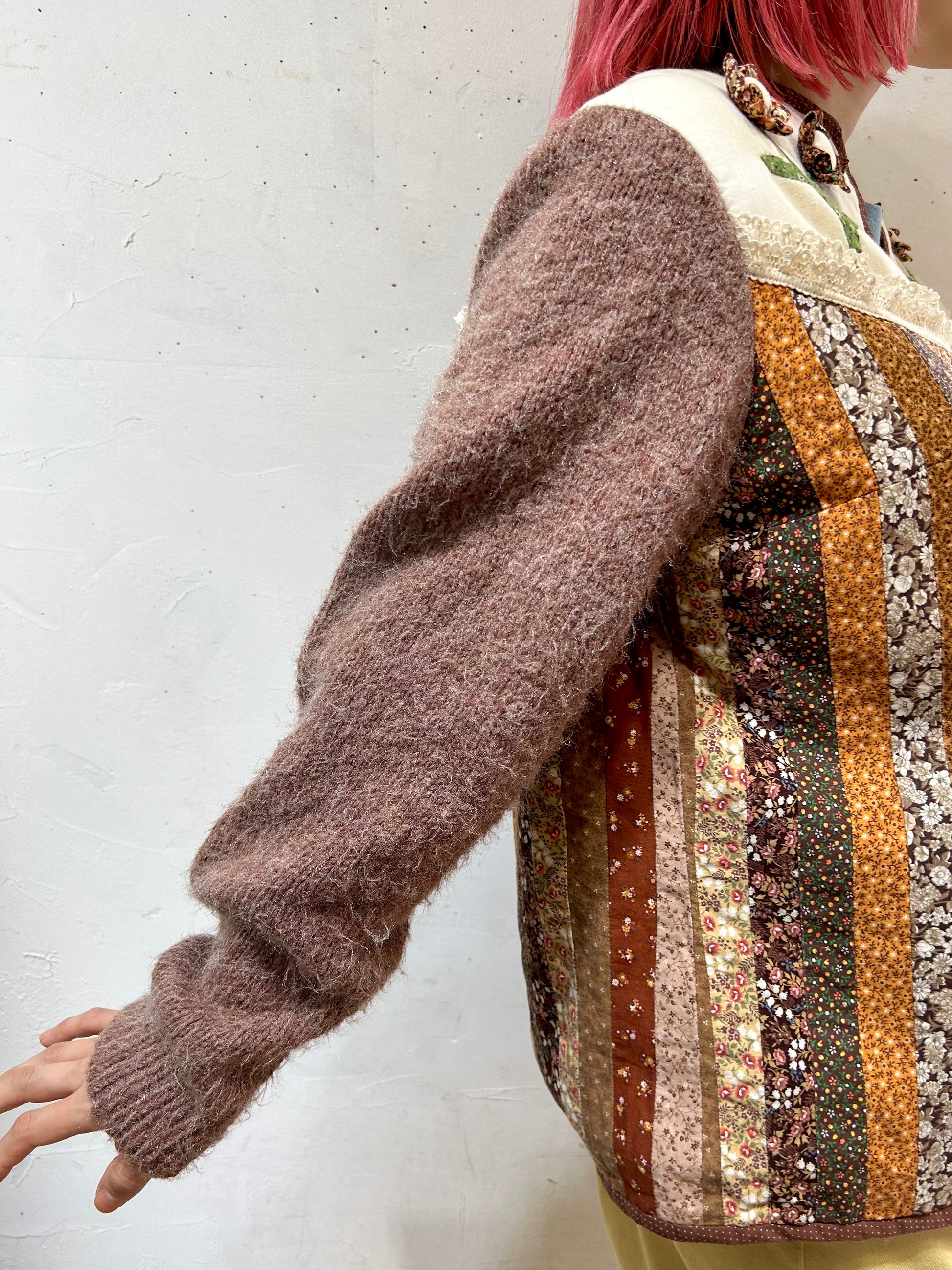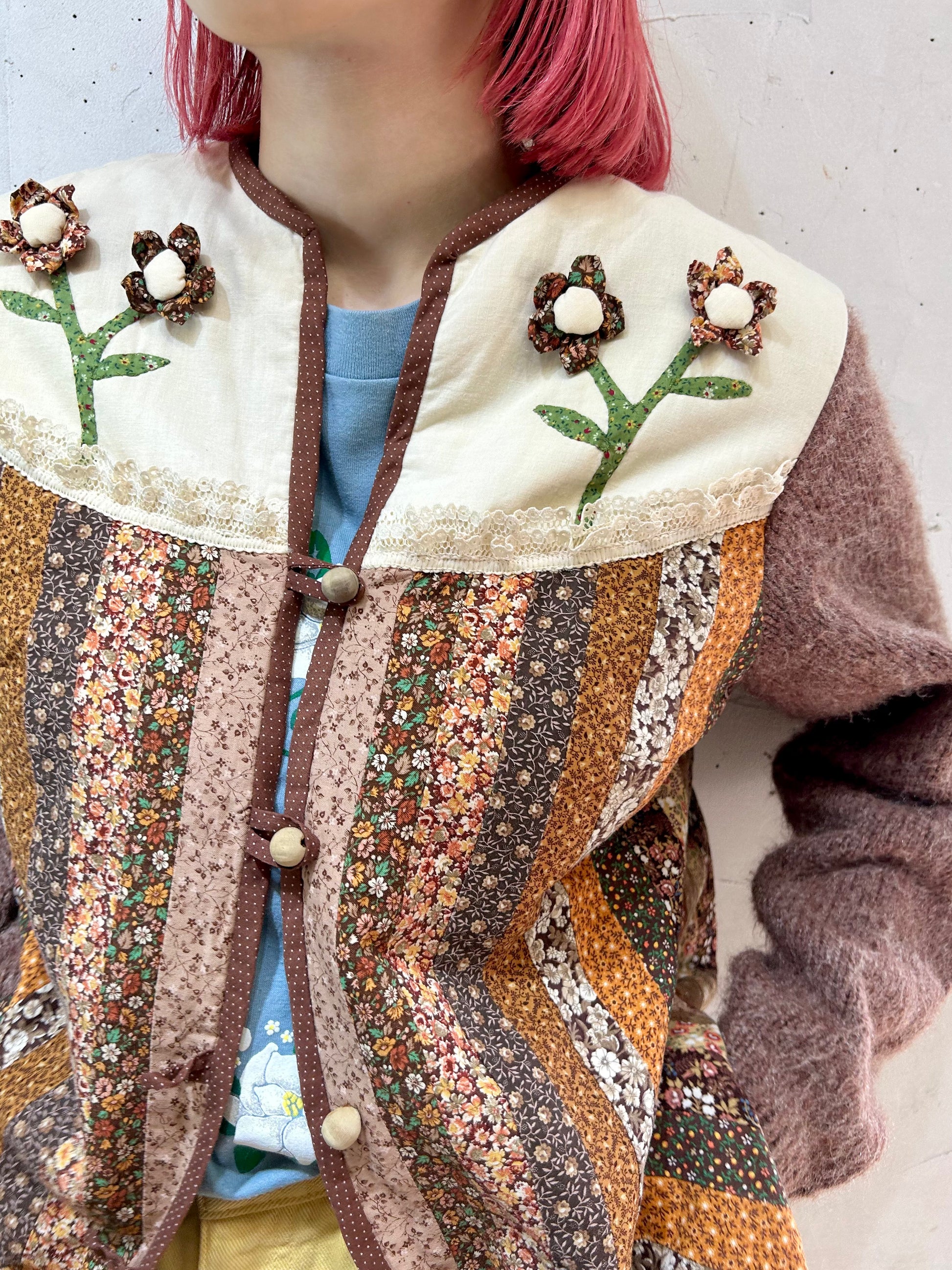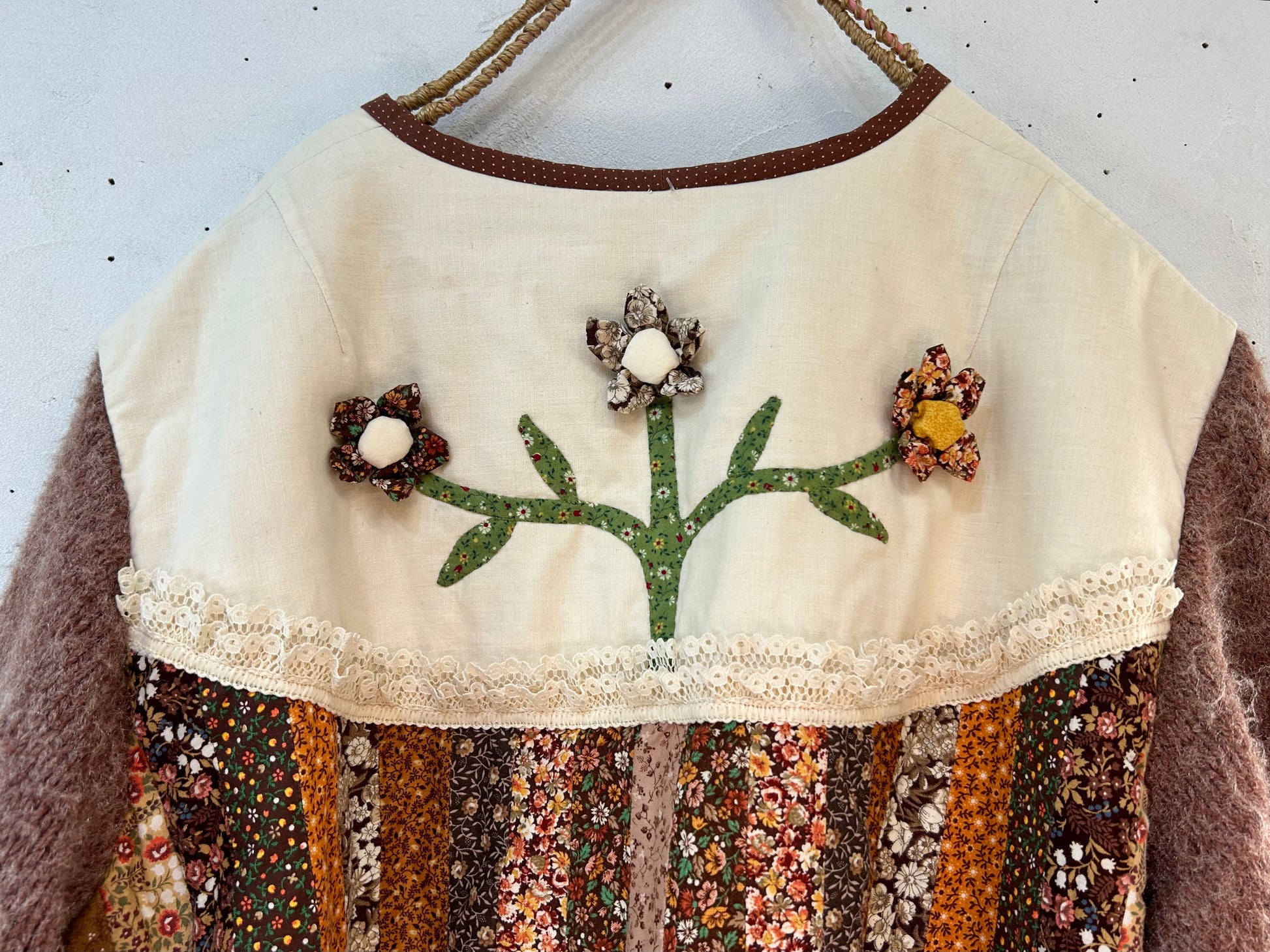 細かなパッチワーク、一つ一つ丁寧に作られた立体感のあるフラワーモチーフ、袖はニットと、細部まで丁寧に作り込まれたスペシャルな一着。