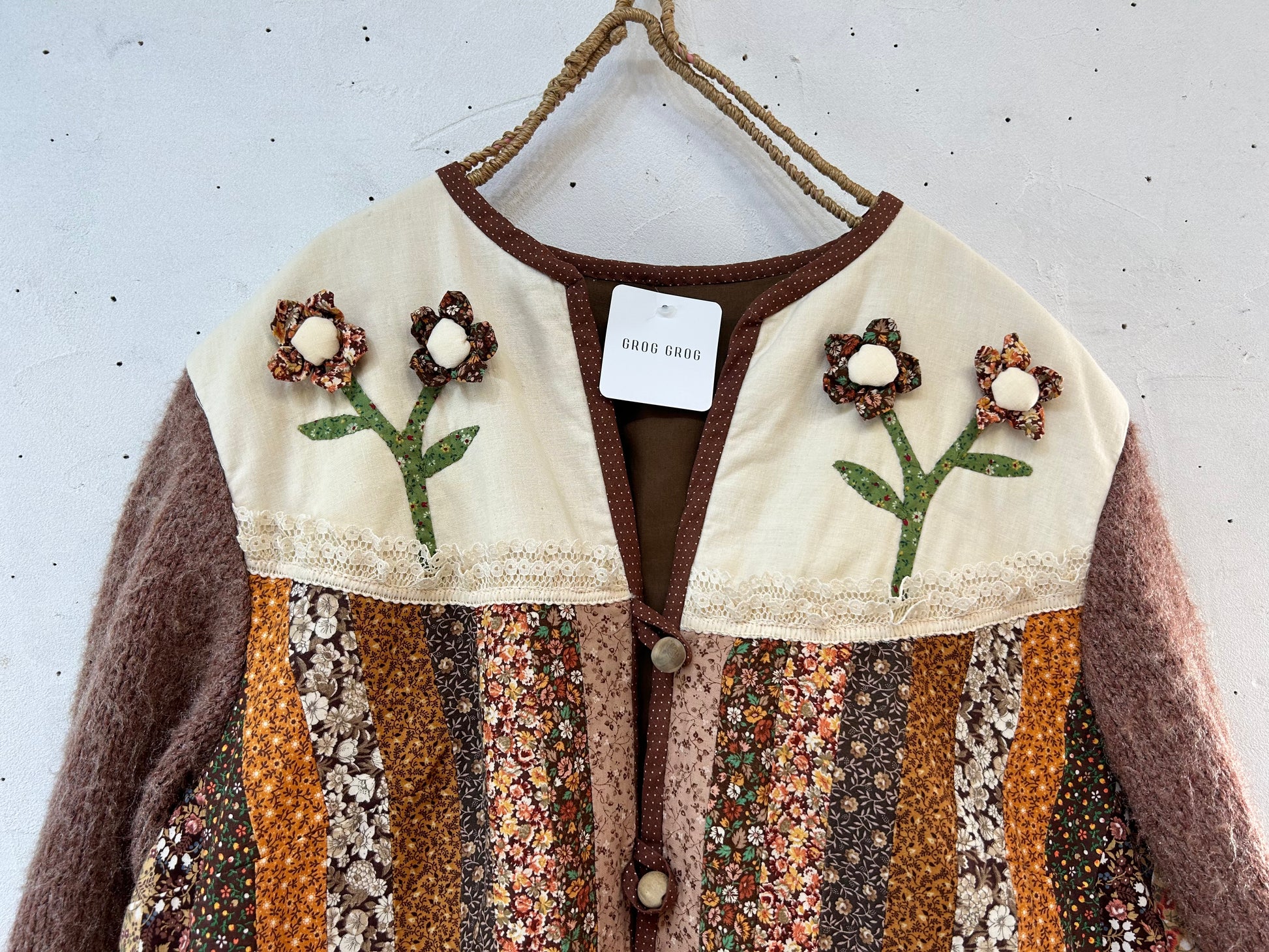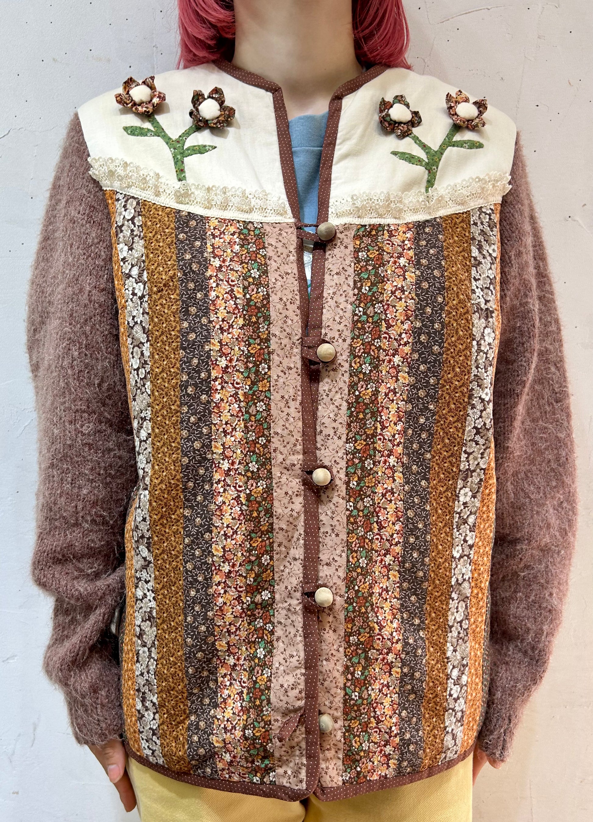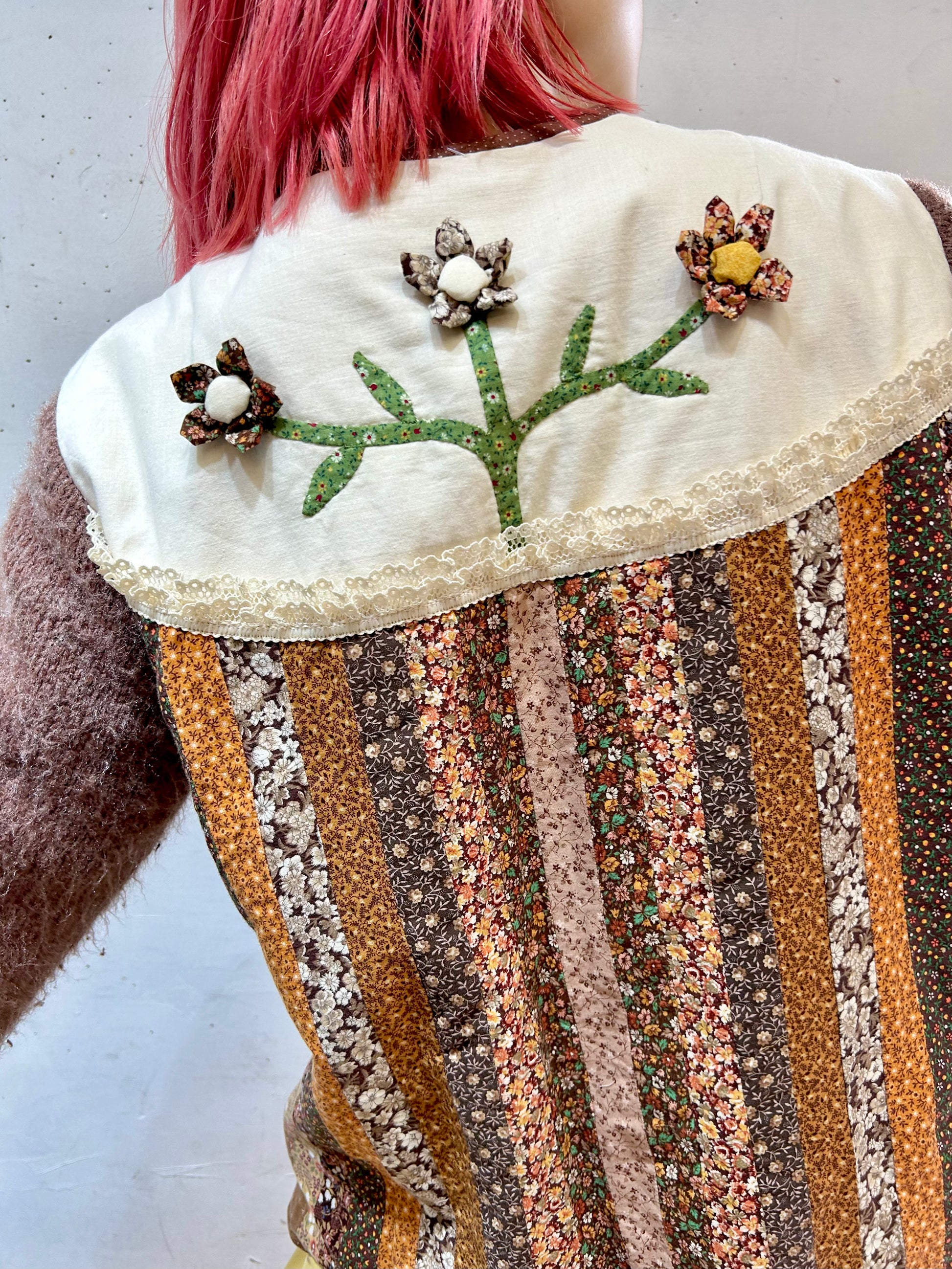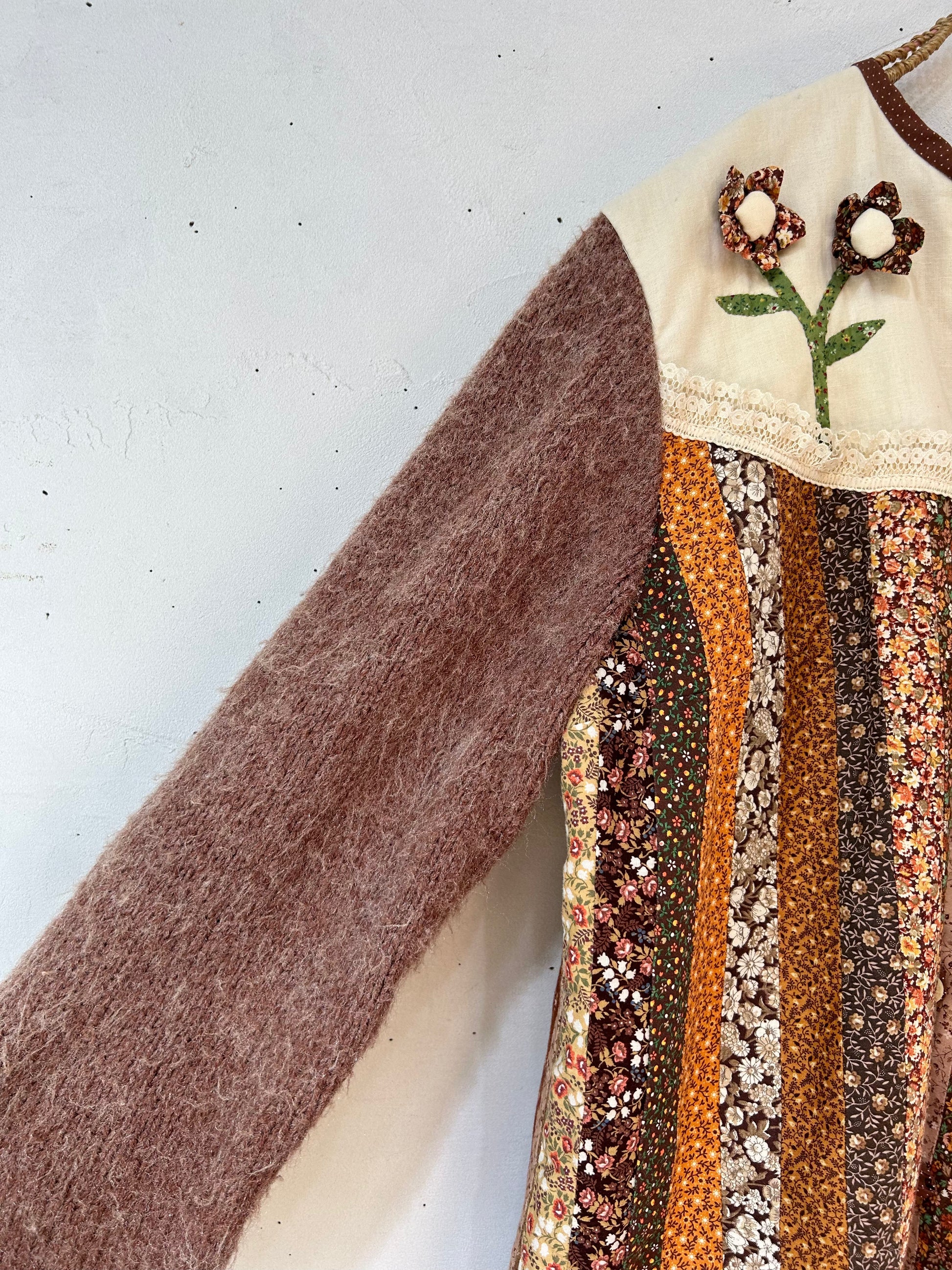 細かなパッチワーク、一つ一つ丁寧に作られた立体感のあるフラワーモチーフ、袖はニットと、細部まで丁寧に作り込まれたスペシャルな一着。