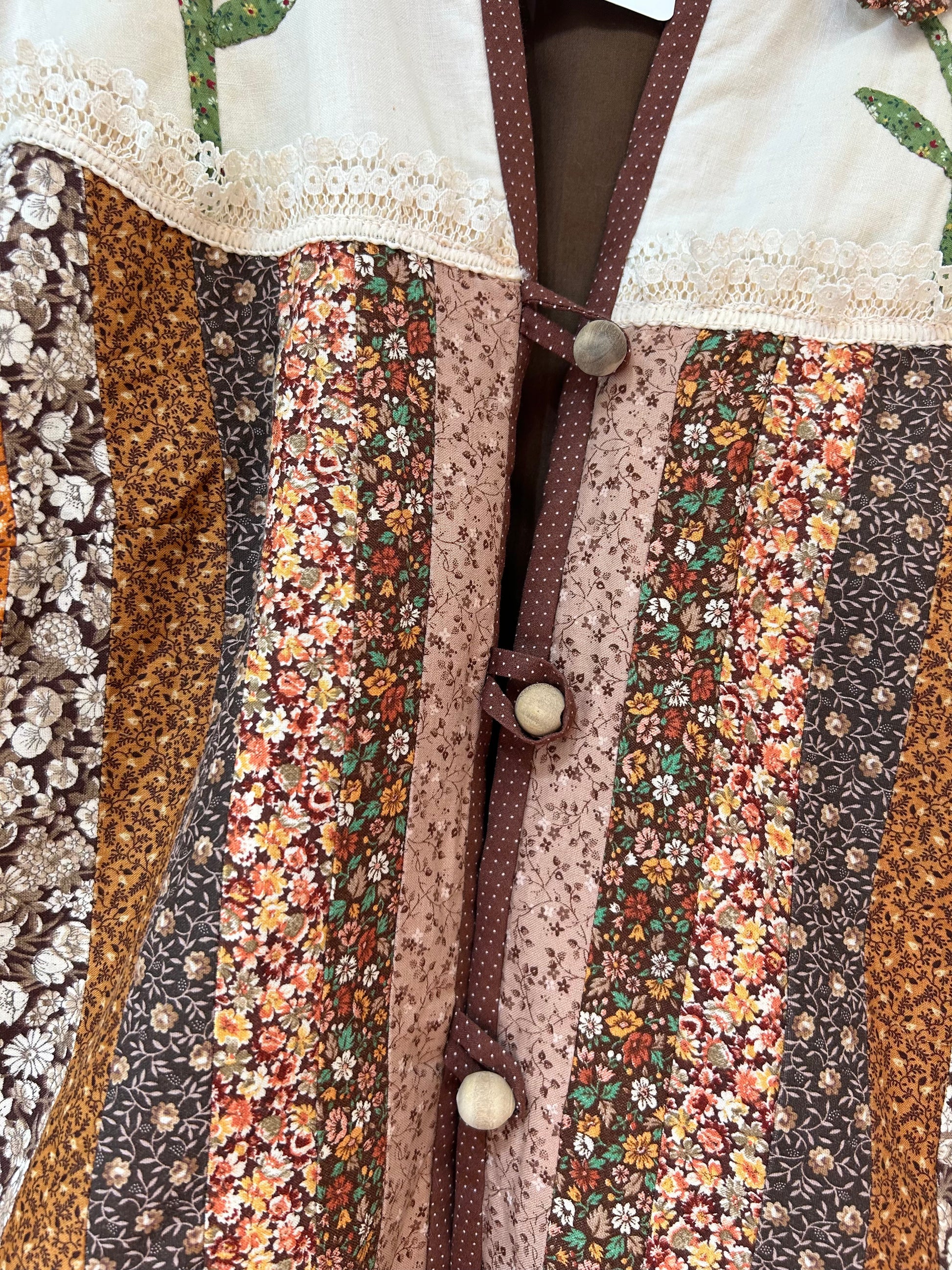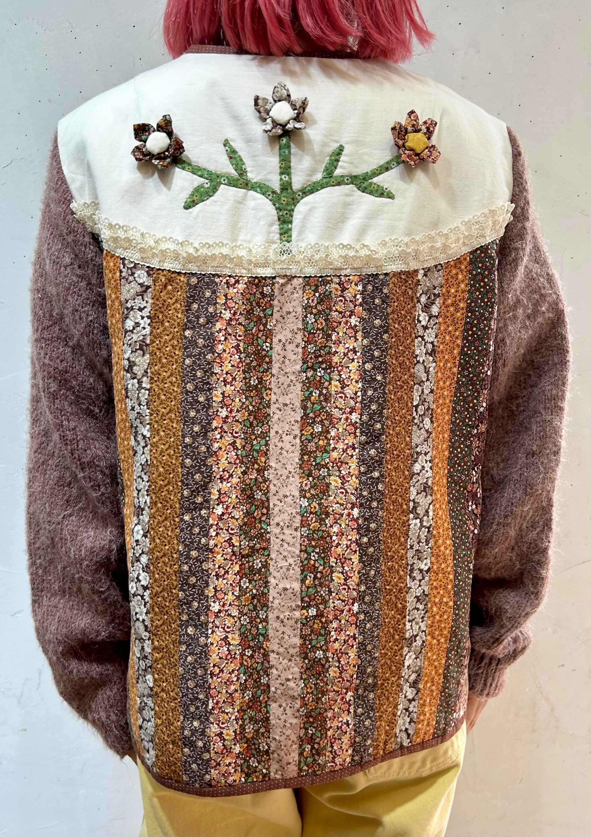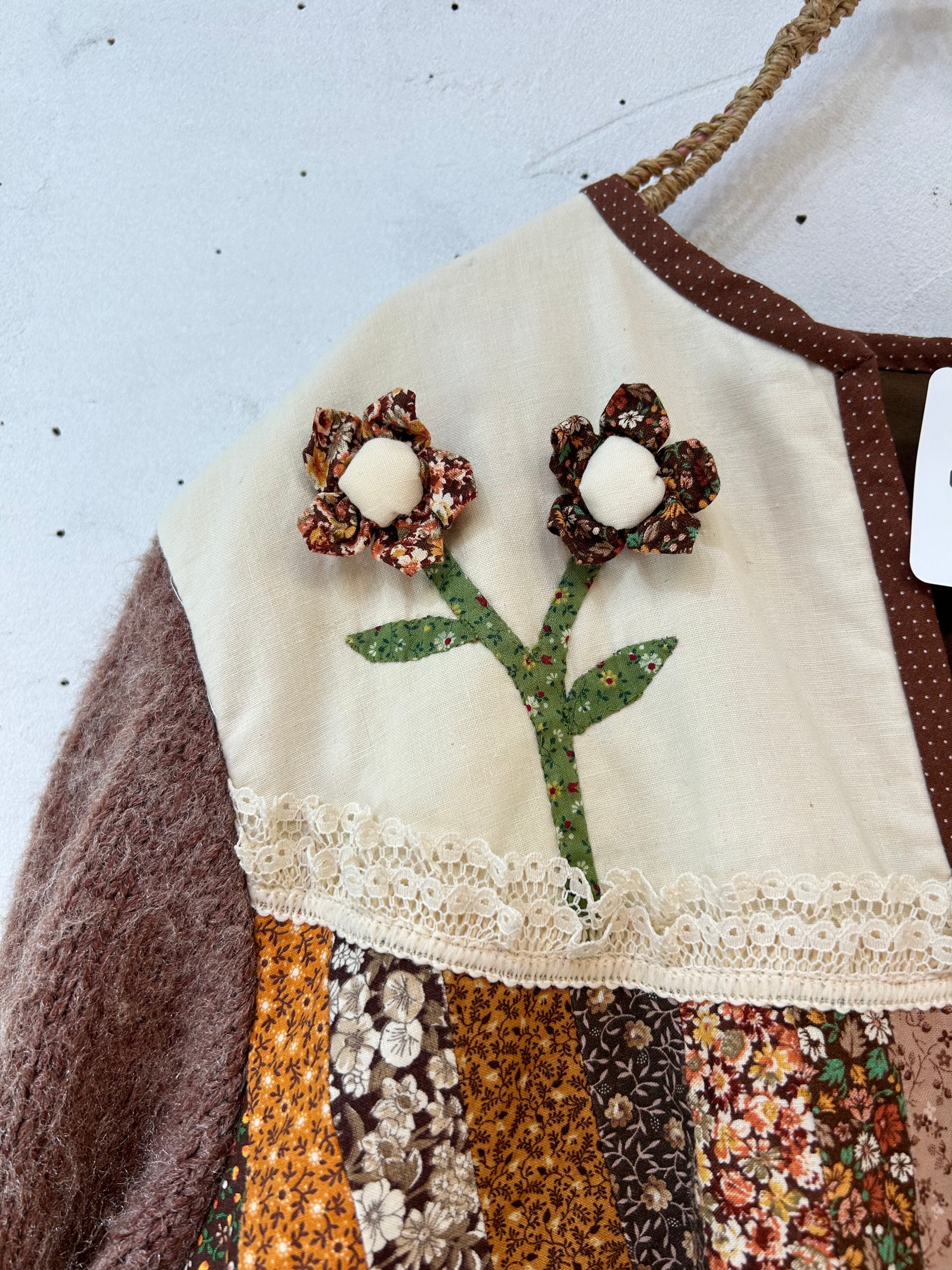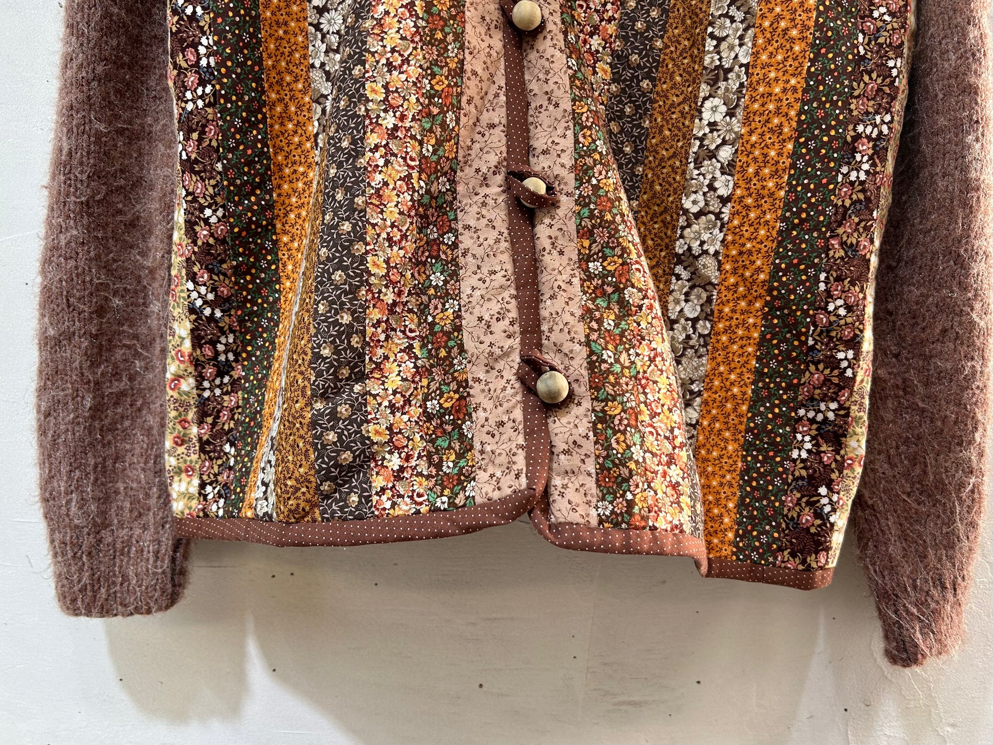 細かなパッチワーク、一つ一つ丁寧に作られた立体感のあるフラワーモチーフ、袖はニットと、細部まで丁寧に作り込まれたスペシャルな一着。