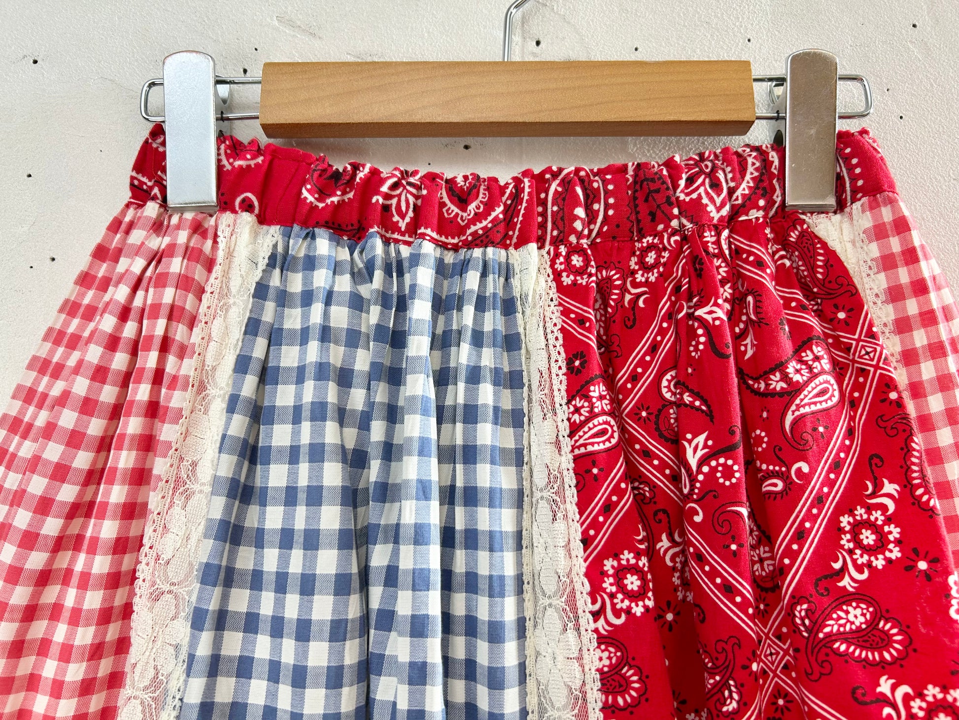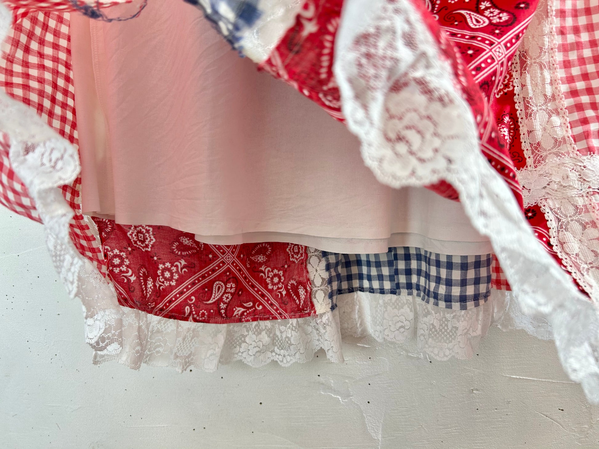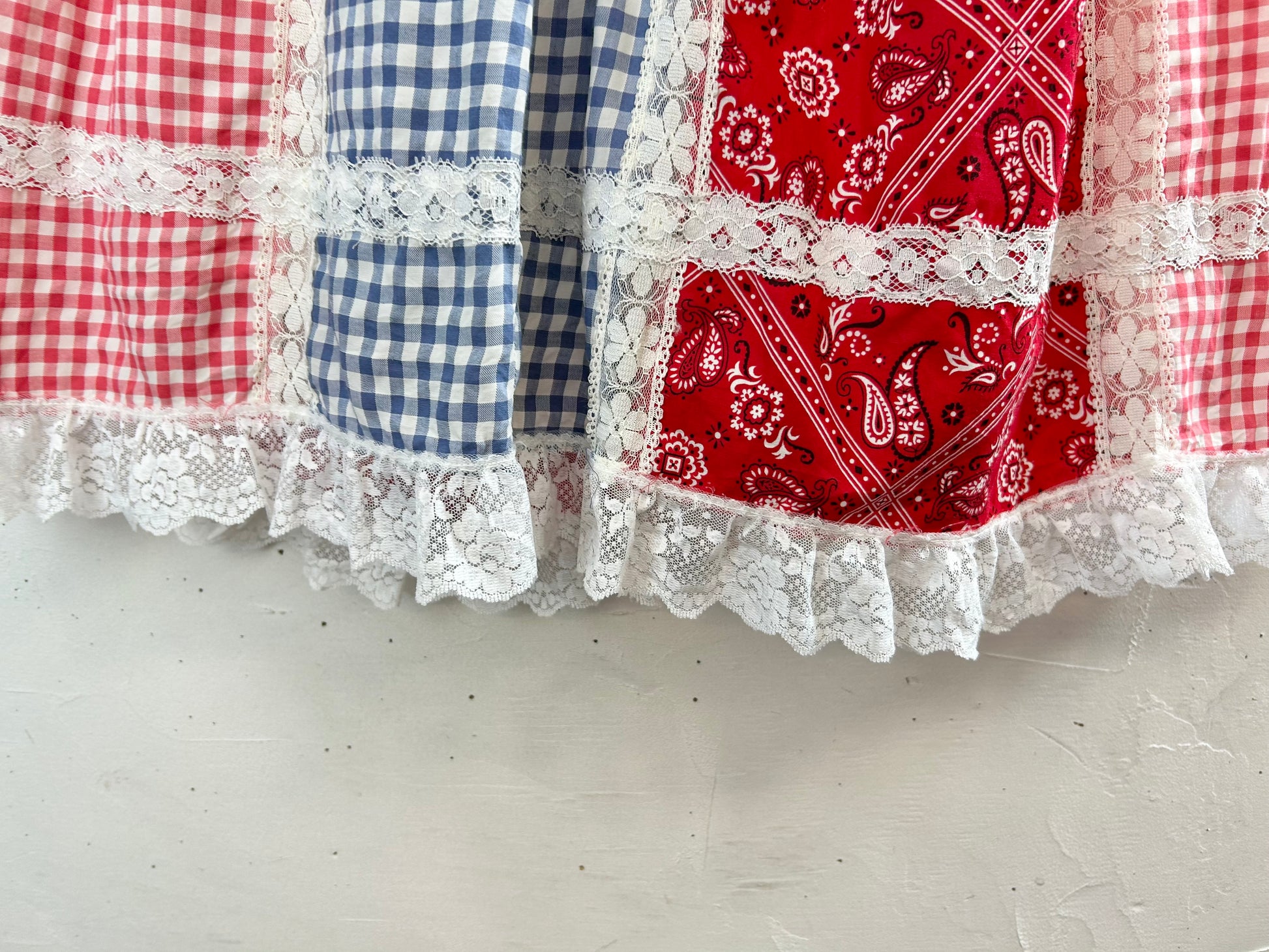 ギンガムチェックとバンダナパターンのパッチワークに、レースも贅沢に施された非常に可愛らしい1着。