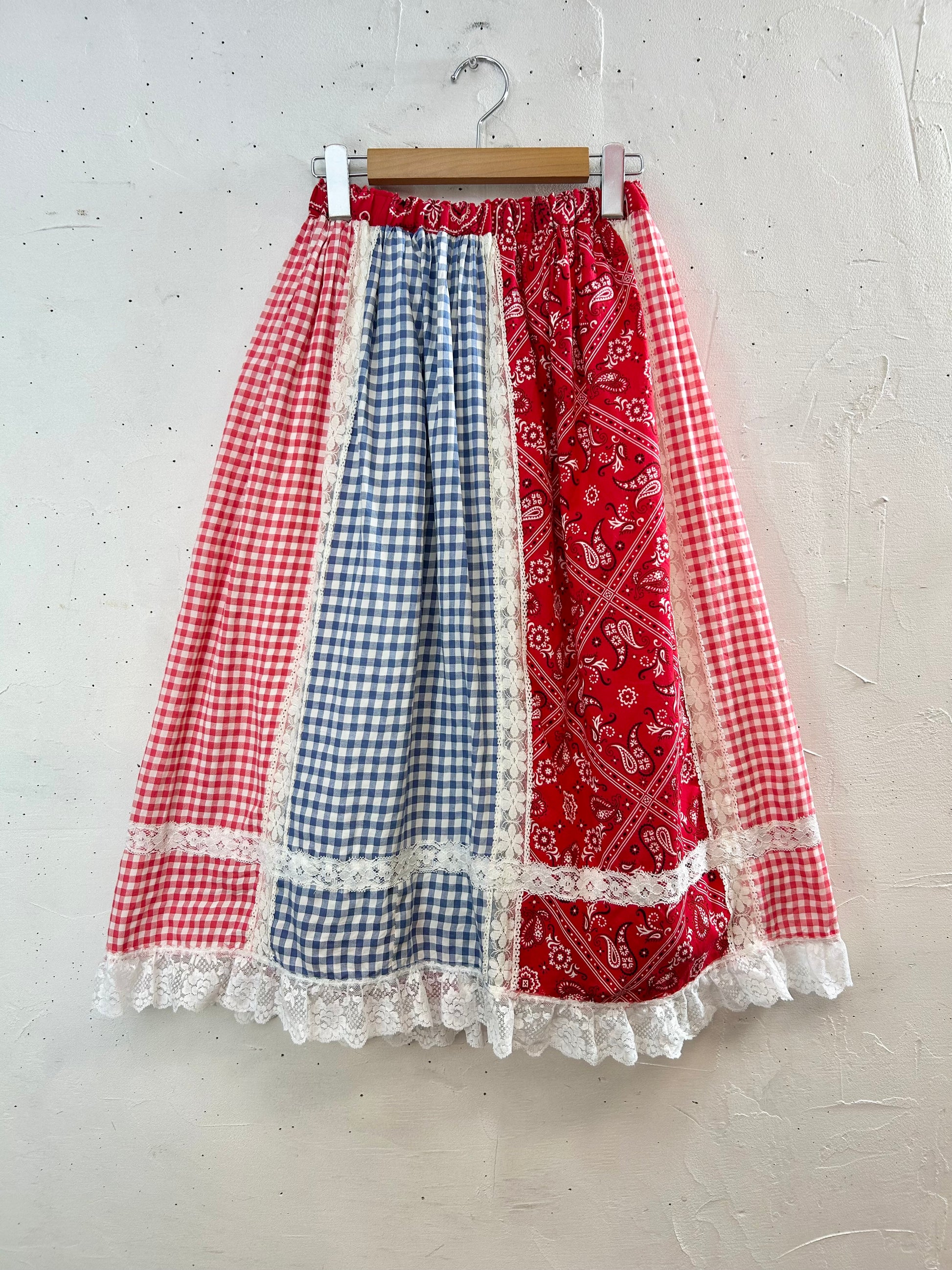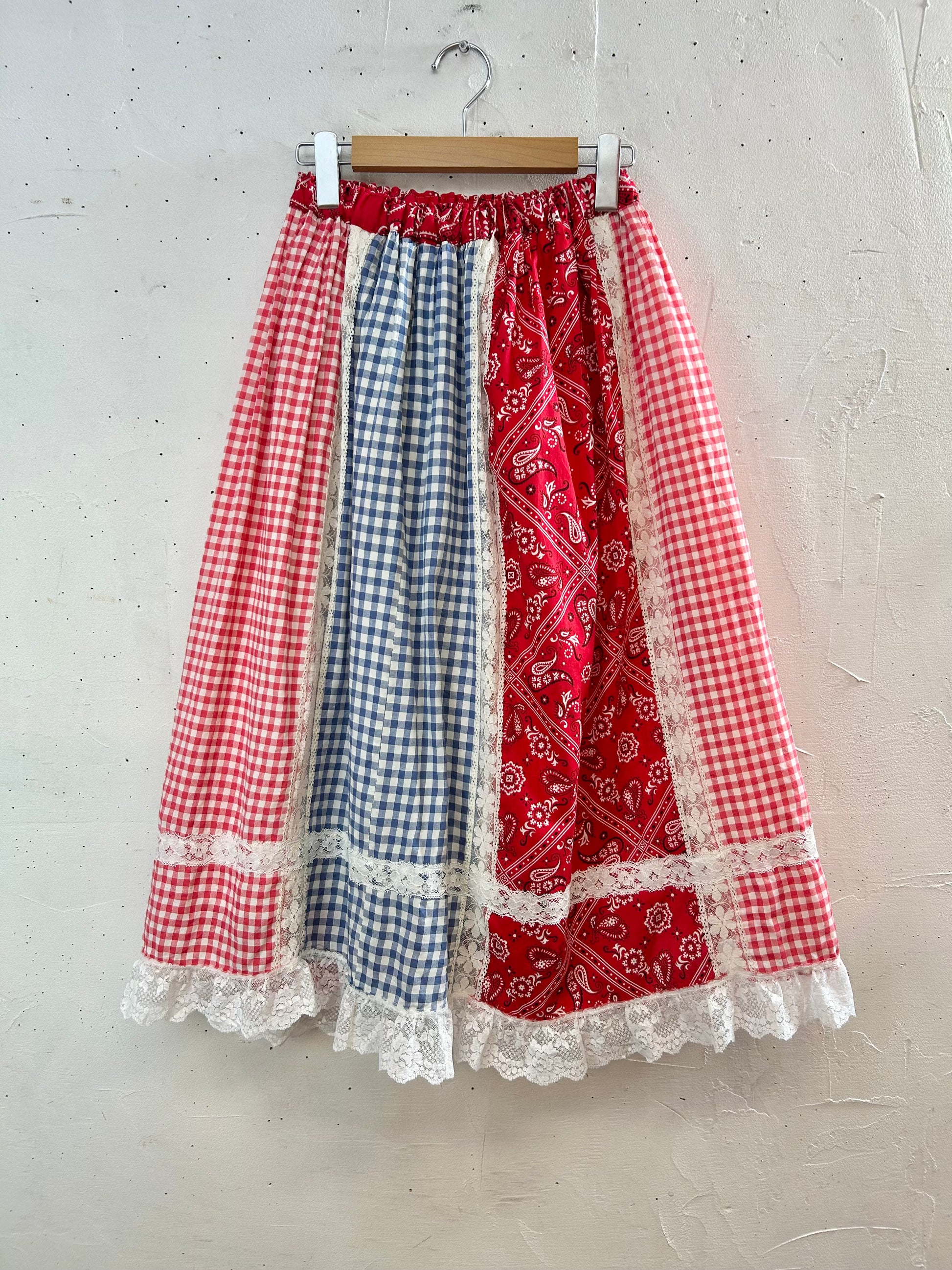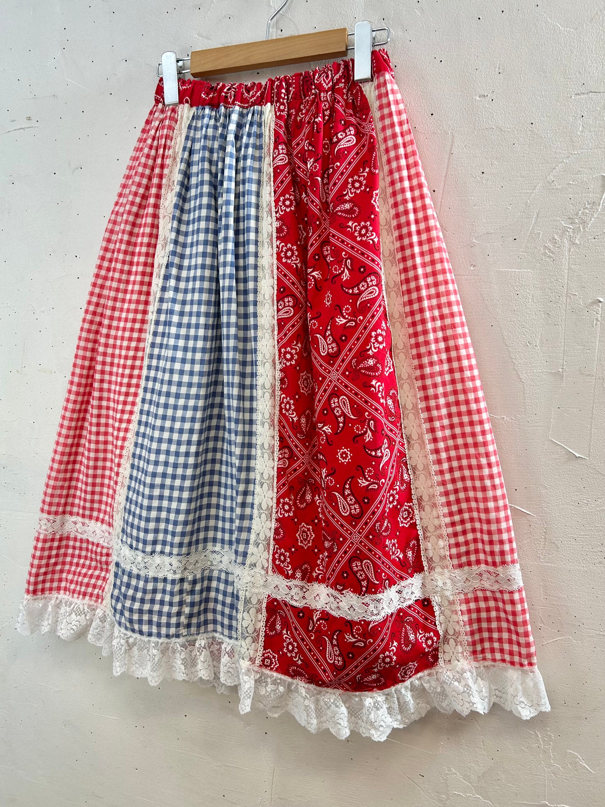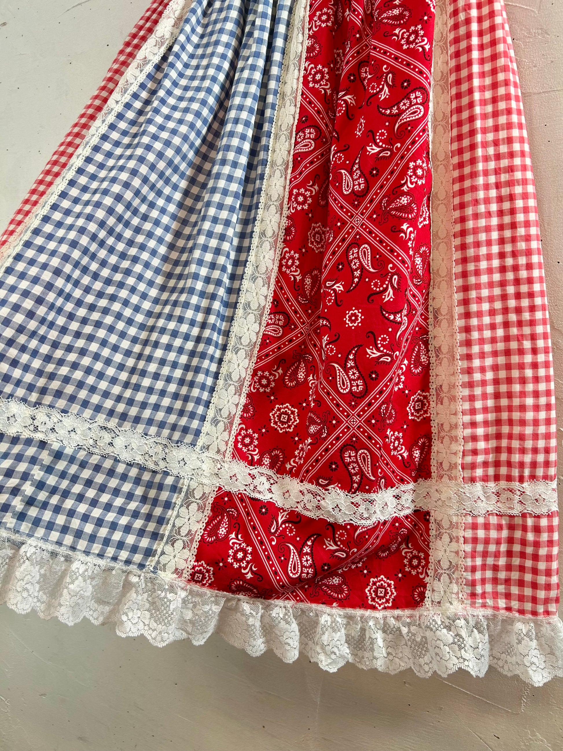 ギンガムチェックとバンダナパターンのパッチワークに、レースも贅沢に施された非常に可愛らしい1着。