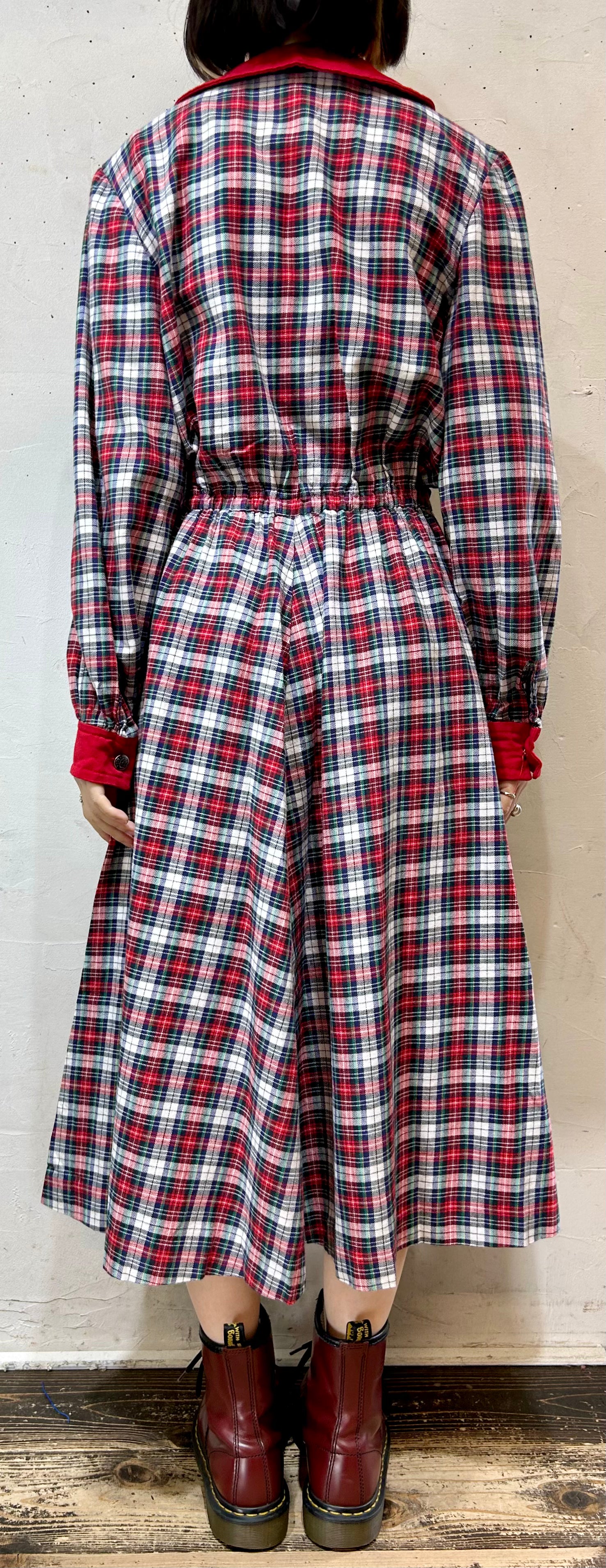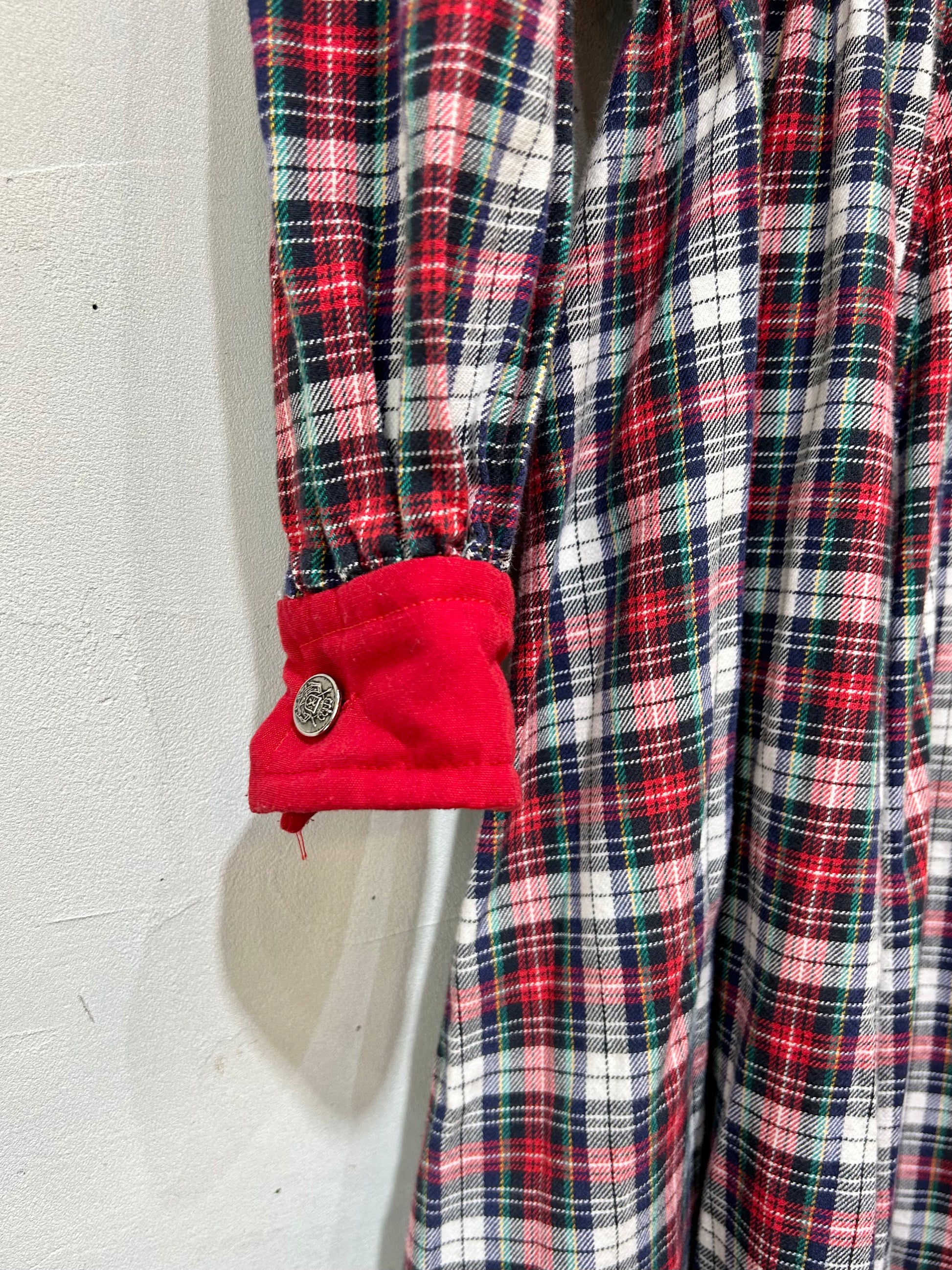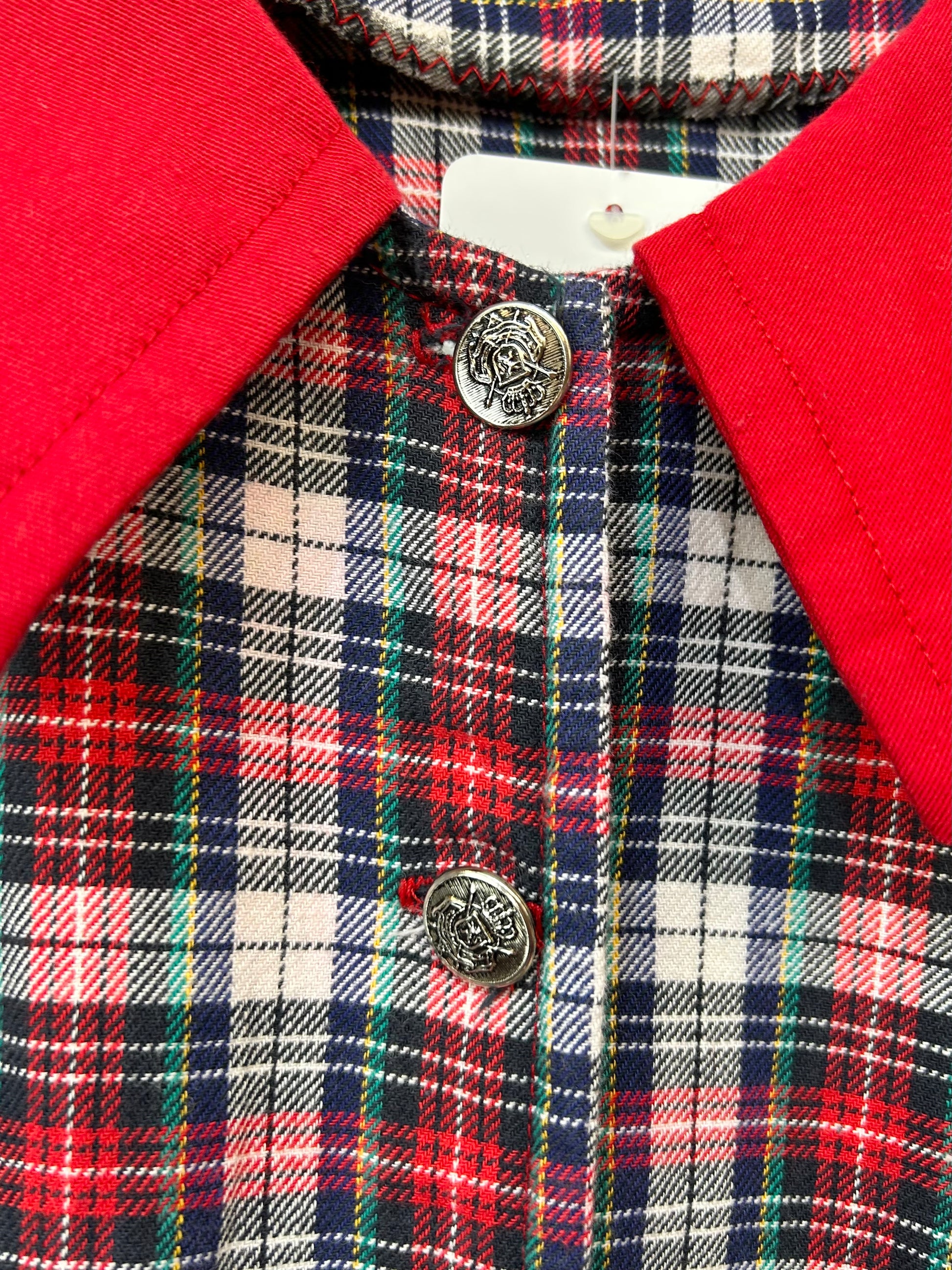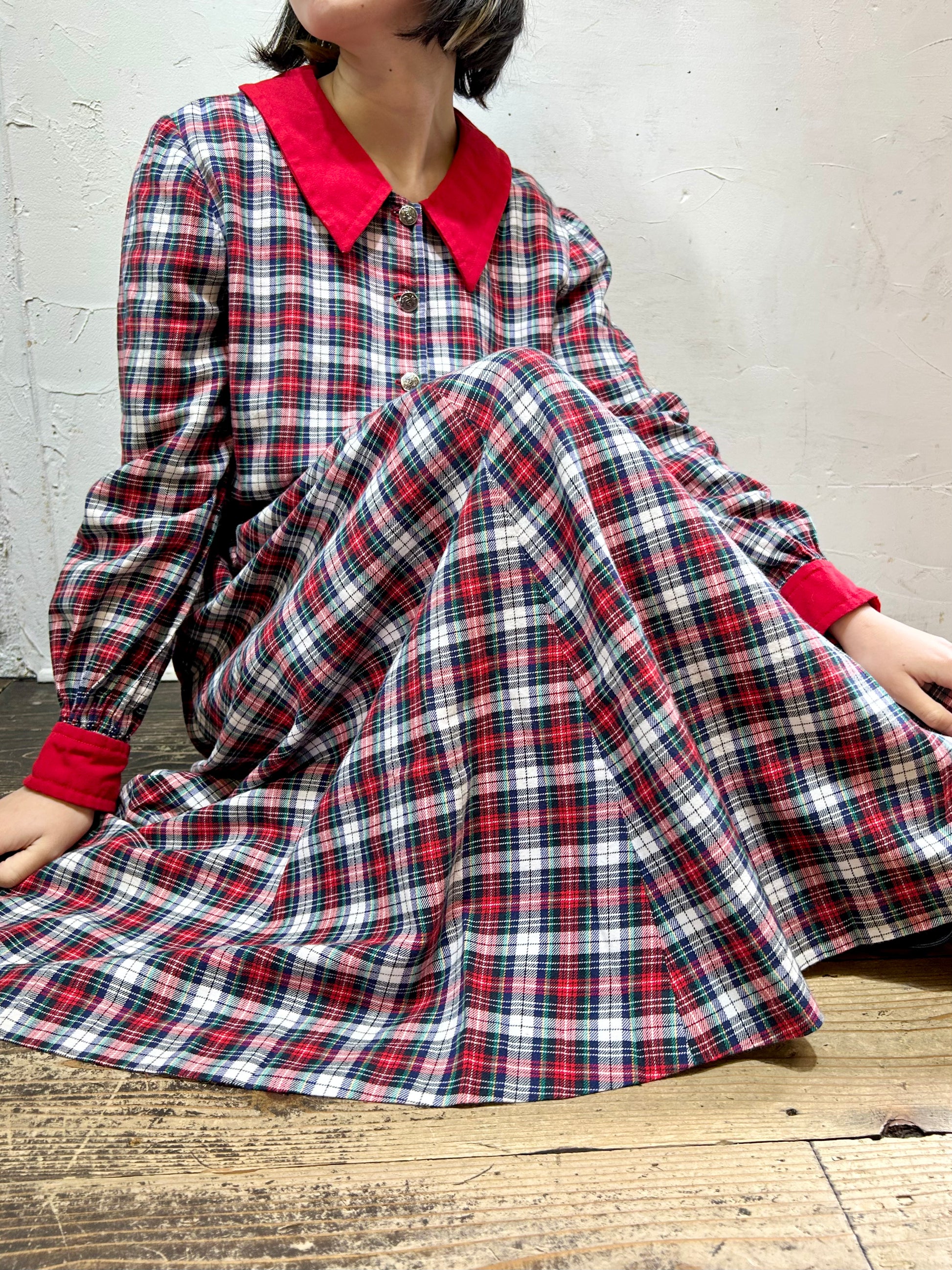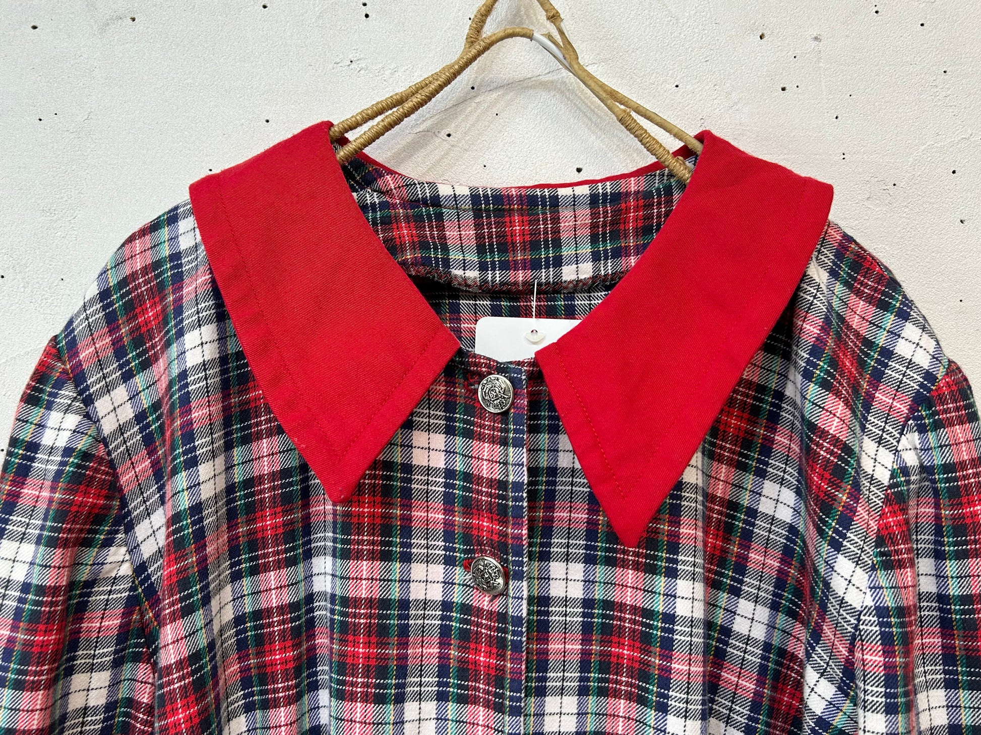 レッドのチェックボディに襟元とカフスのレッドカラーの生地がアクセントになった可愛らしい一着。