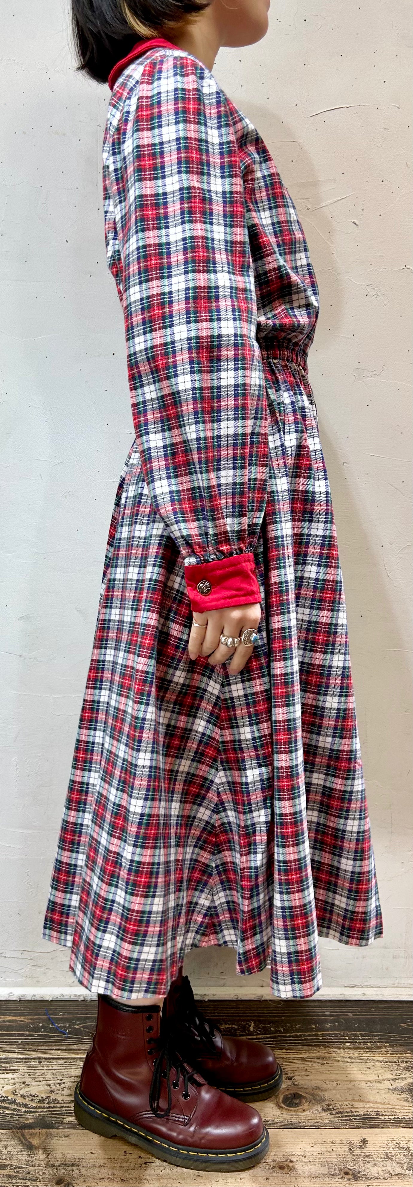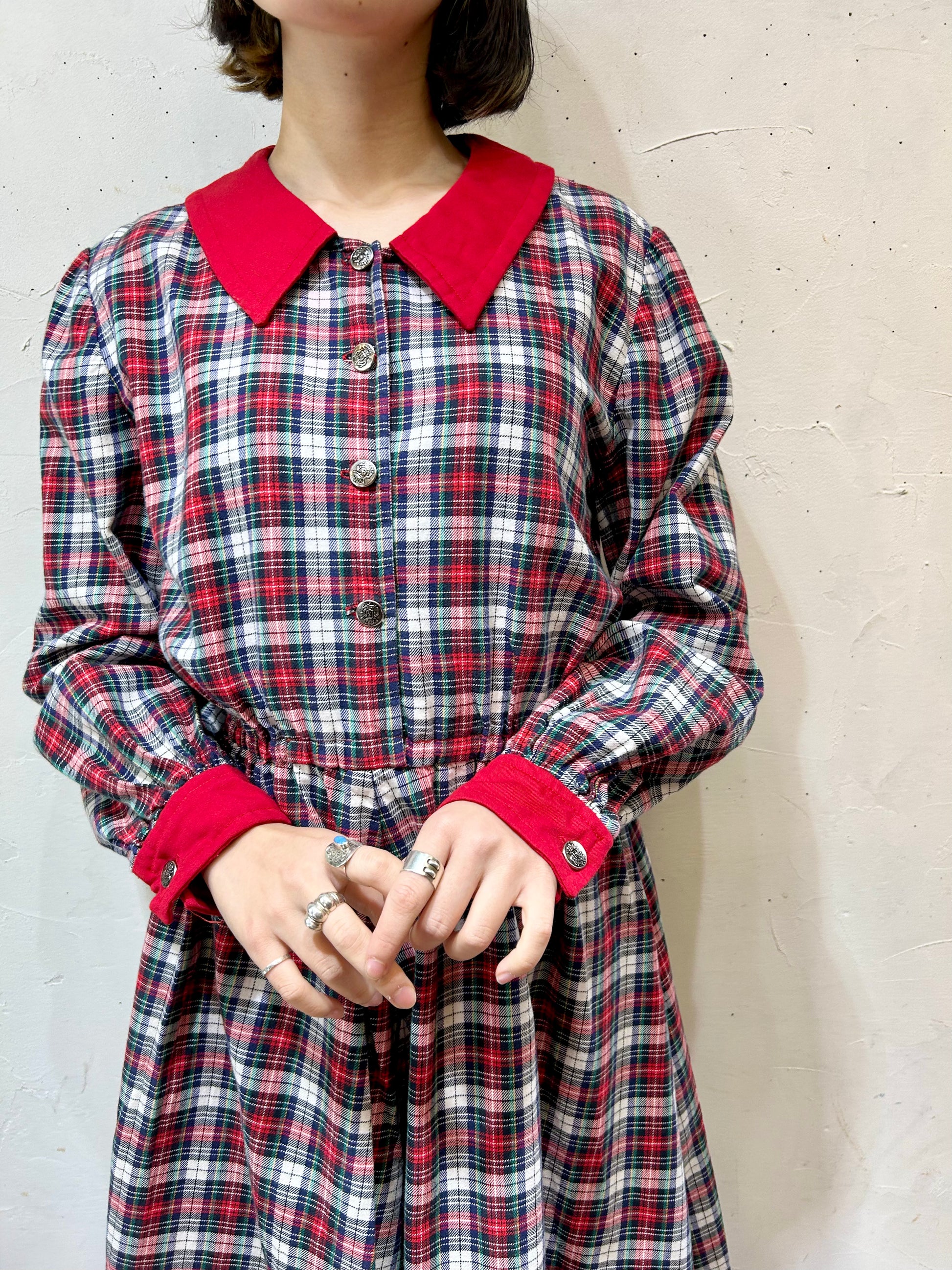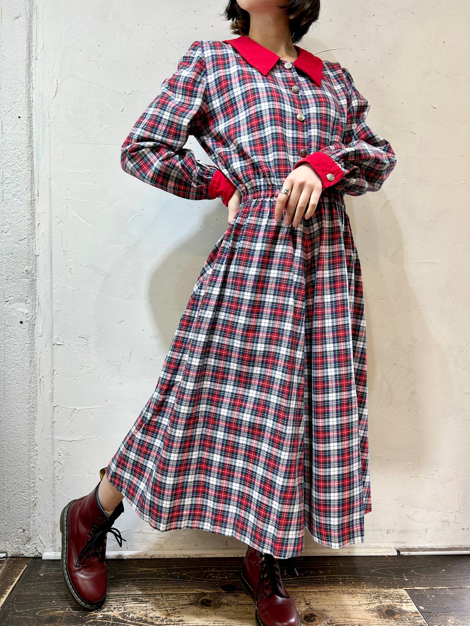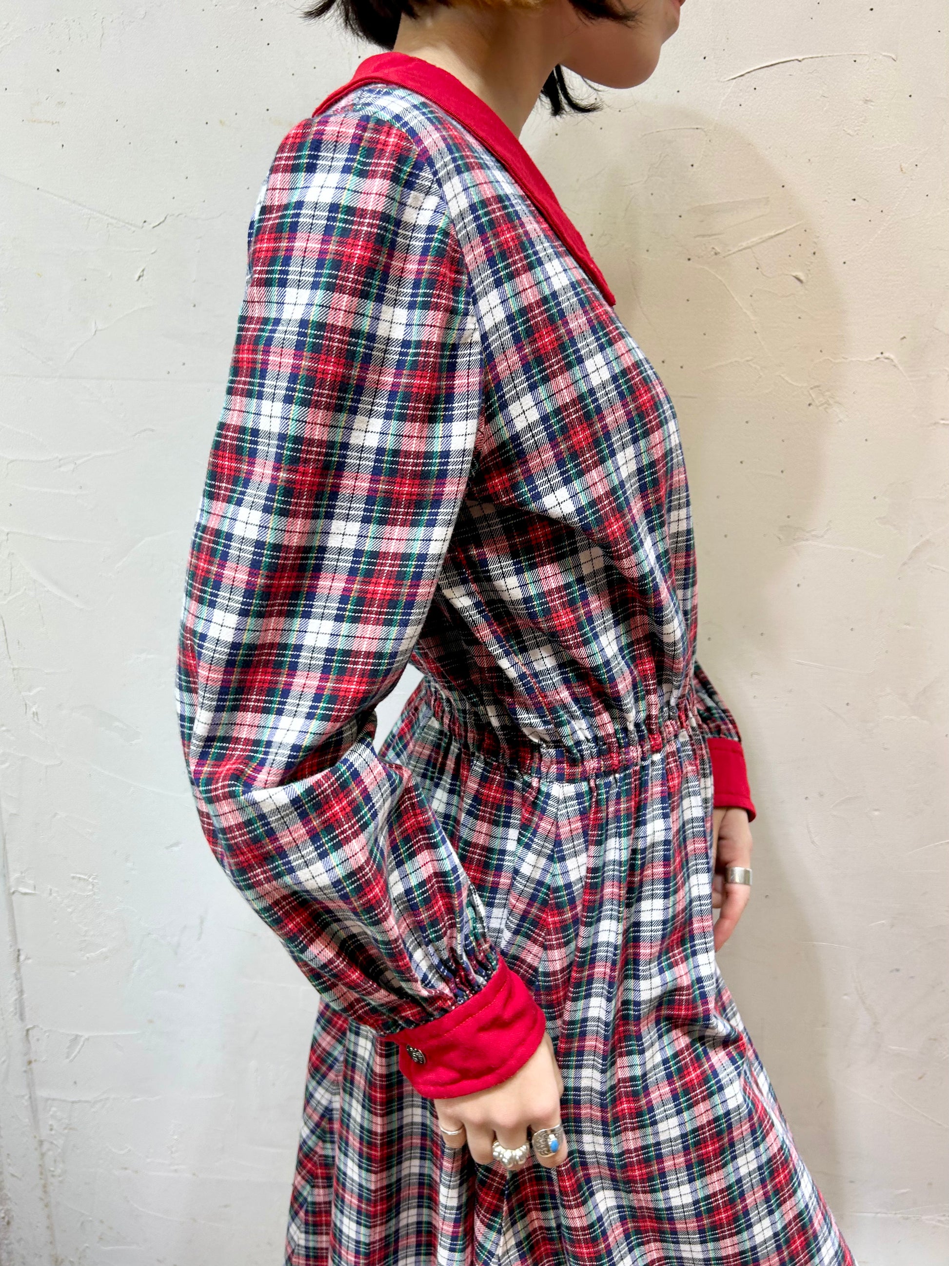 レッドのチェックボディに襟元とカフスのレッドカラーの生地がアクセントになった可愛らしい一着。