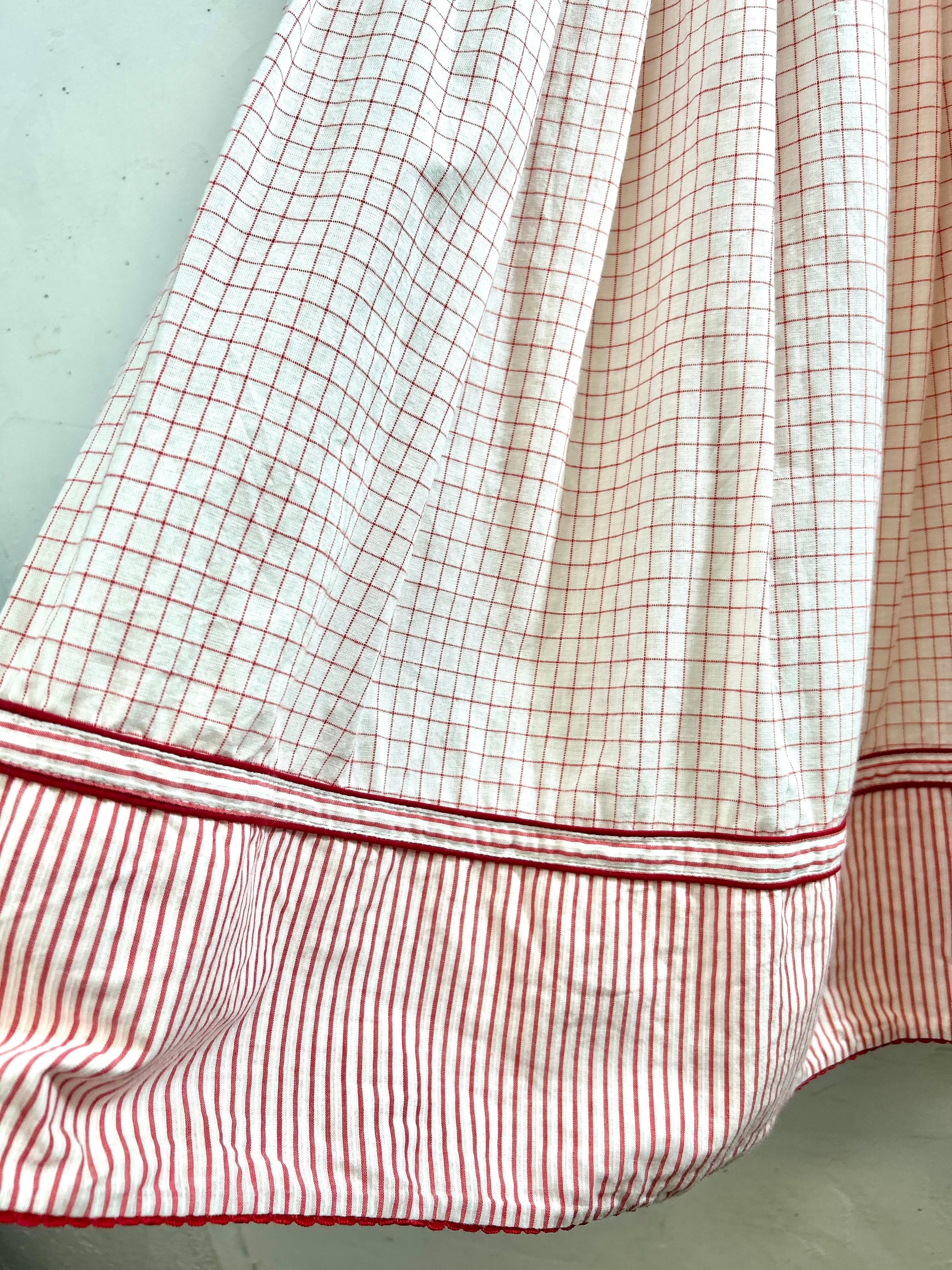シンプルな雰囲気ですが、チェック、ボーダー、ストライプと切り替わっていく柄がとても素敵で、色々なアイテムと合わせて頂け、コーデの主役にもぴったりです。
