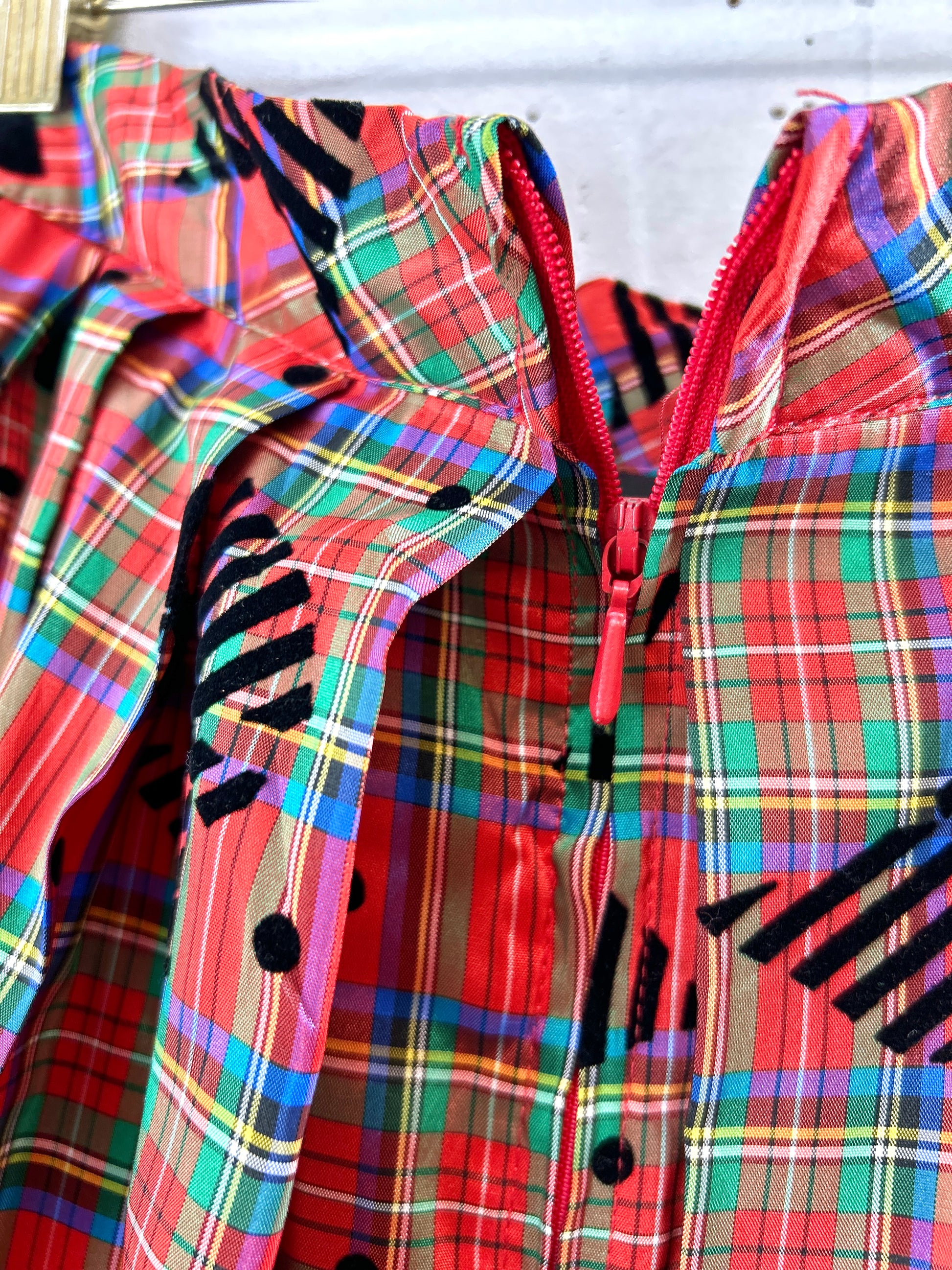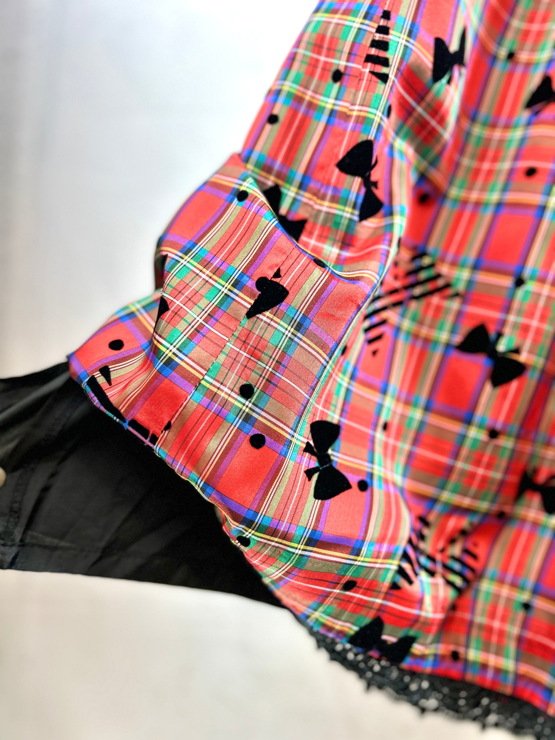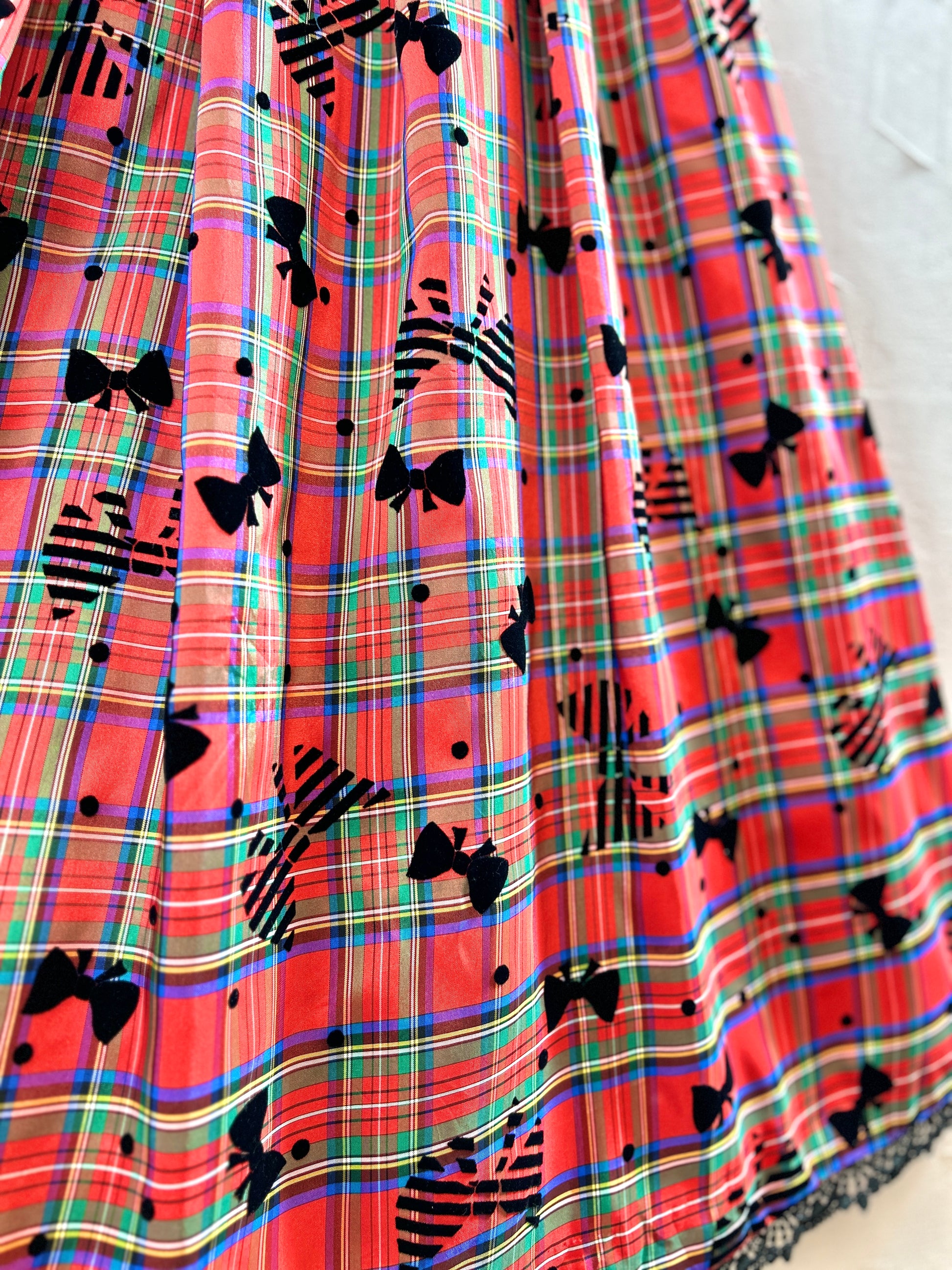きめ細やかな光沢のあるチェック生地に、リボンのフロッキープリントが可愛い1着。