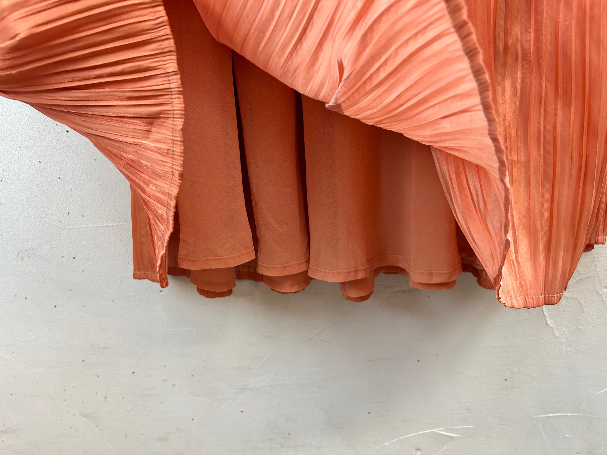 程よく光沢感のあるアプリコットカラーパターンが素敵な一着。