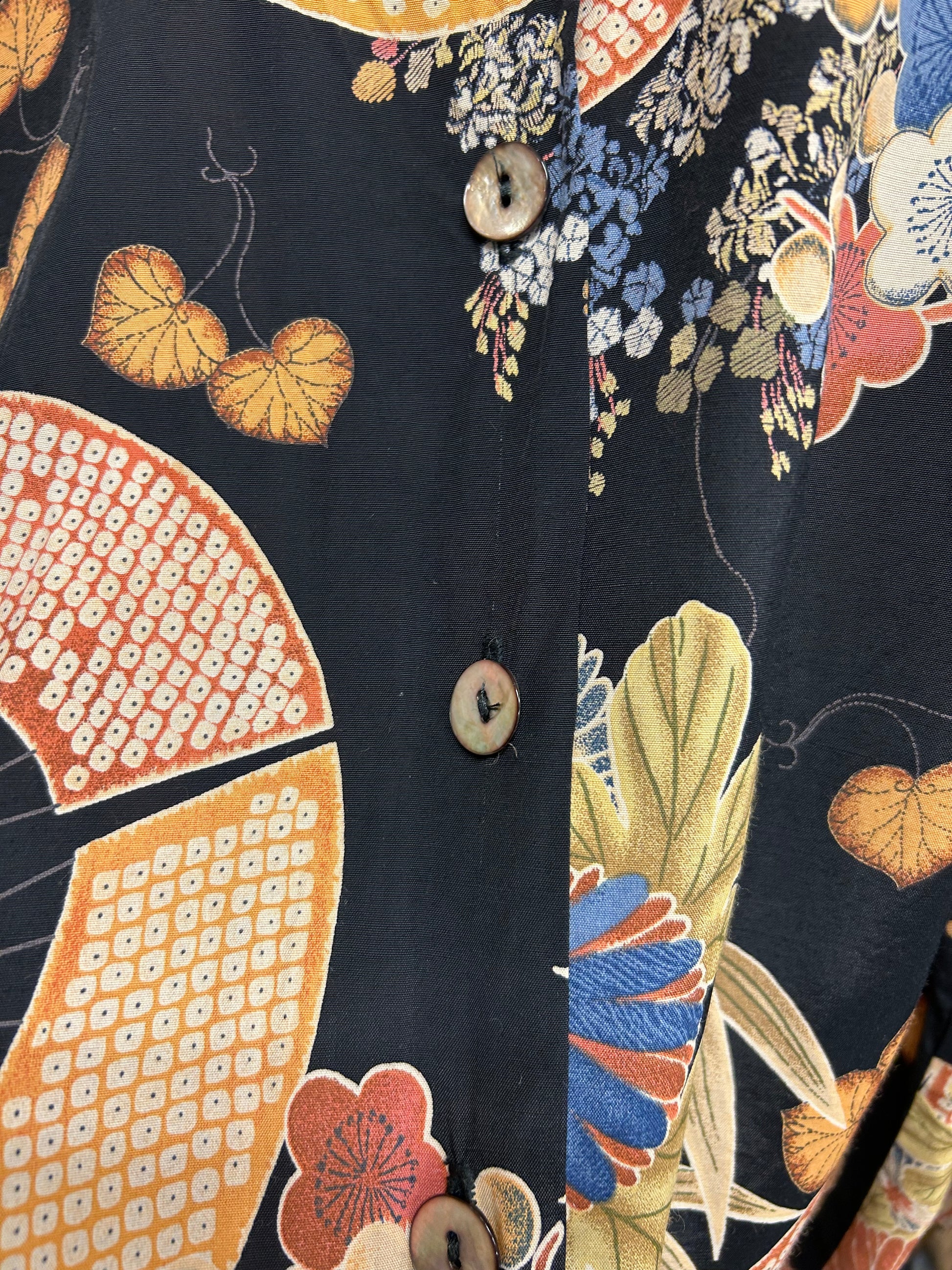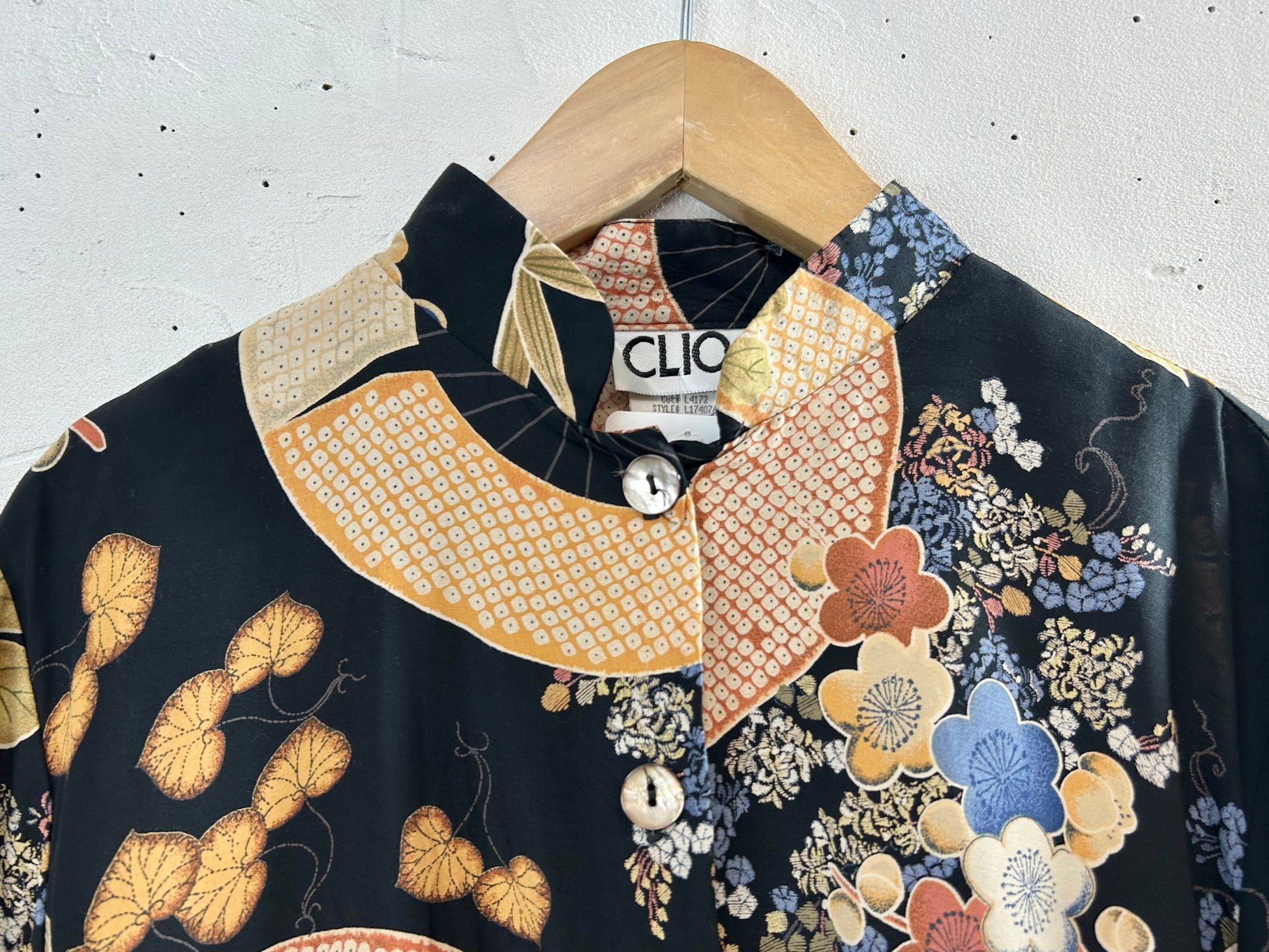 スッキリとしたマオカラーで柄の美しさが映え、シェルボタンもアクセントになり、細部までこだわりが感じられます。