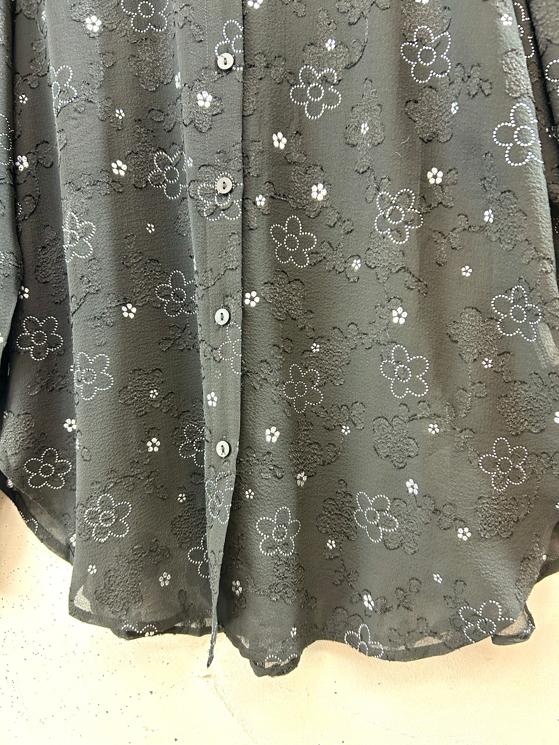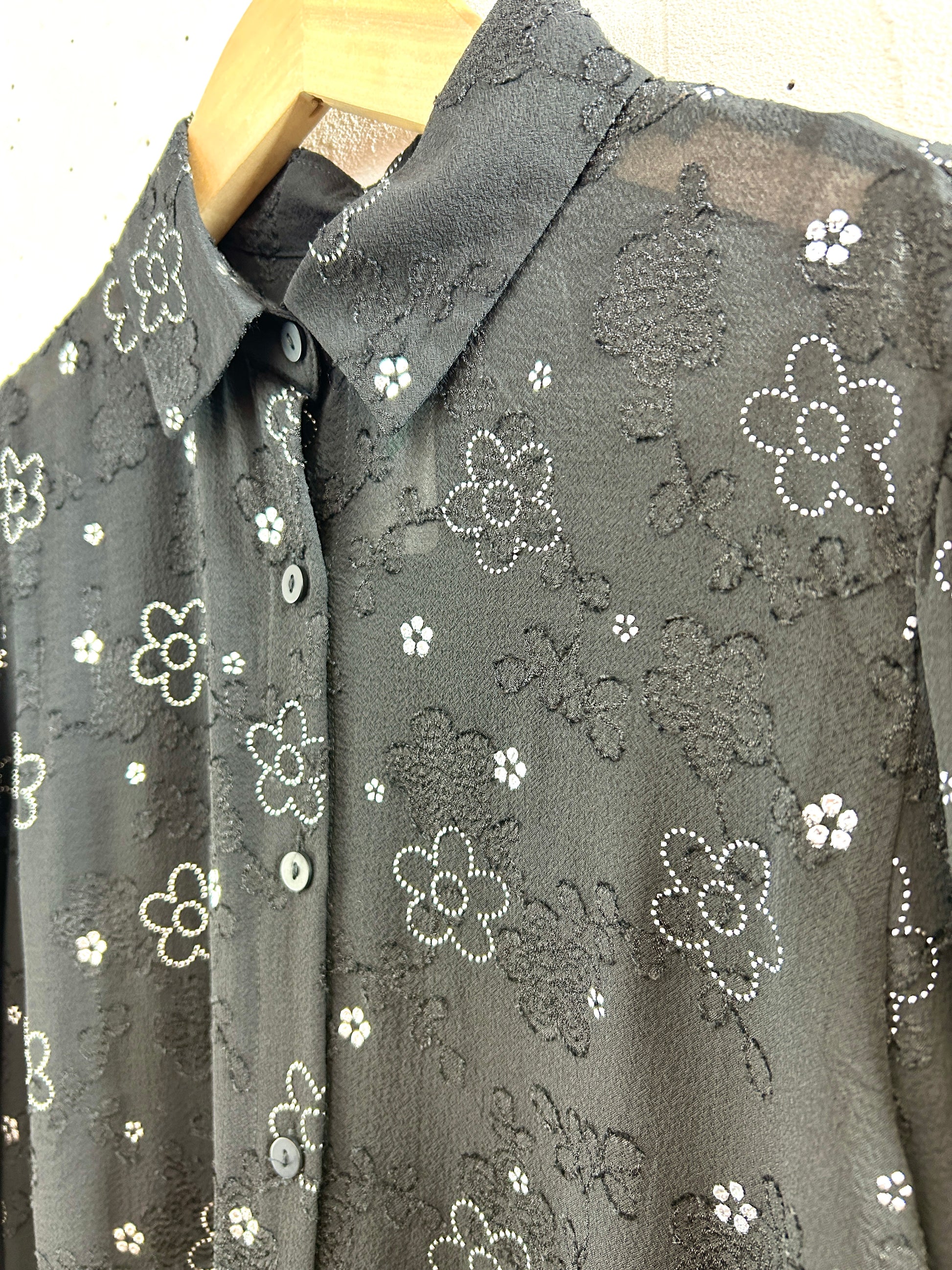 花の織り模様の入ったシースルーにシルバーの花模様のプリントスタンプがとても面白いデザインの一着。