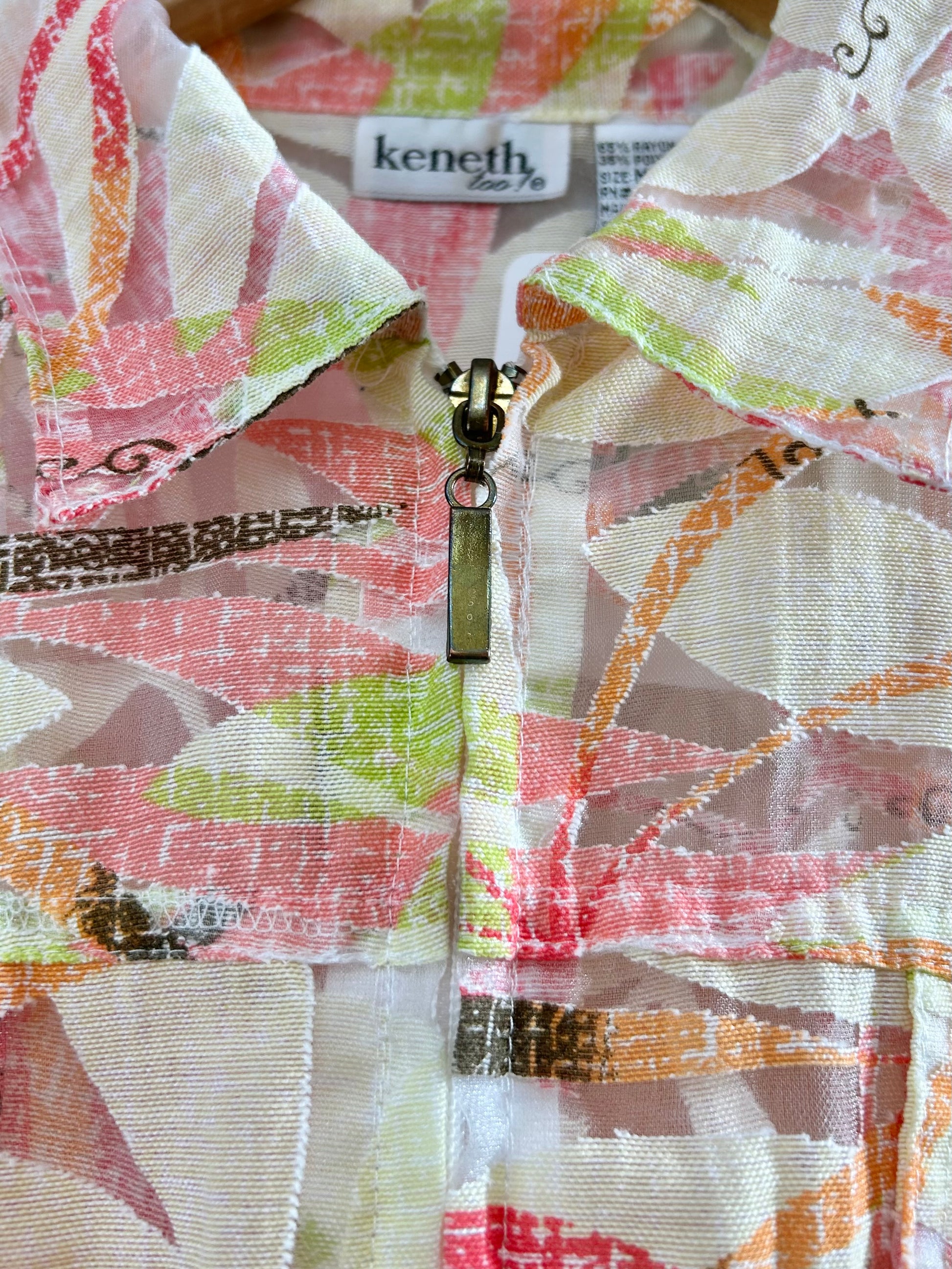 透け感のある涼しげな生地で軽やかな着心地ながらも、フロントジップでジャケットのようなデザインがユニークな一着。