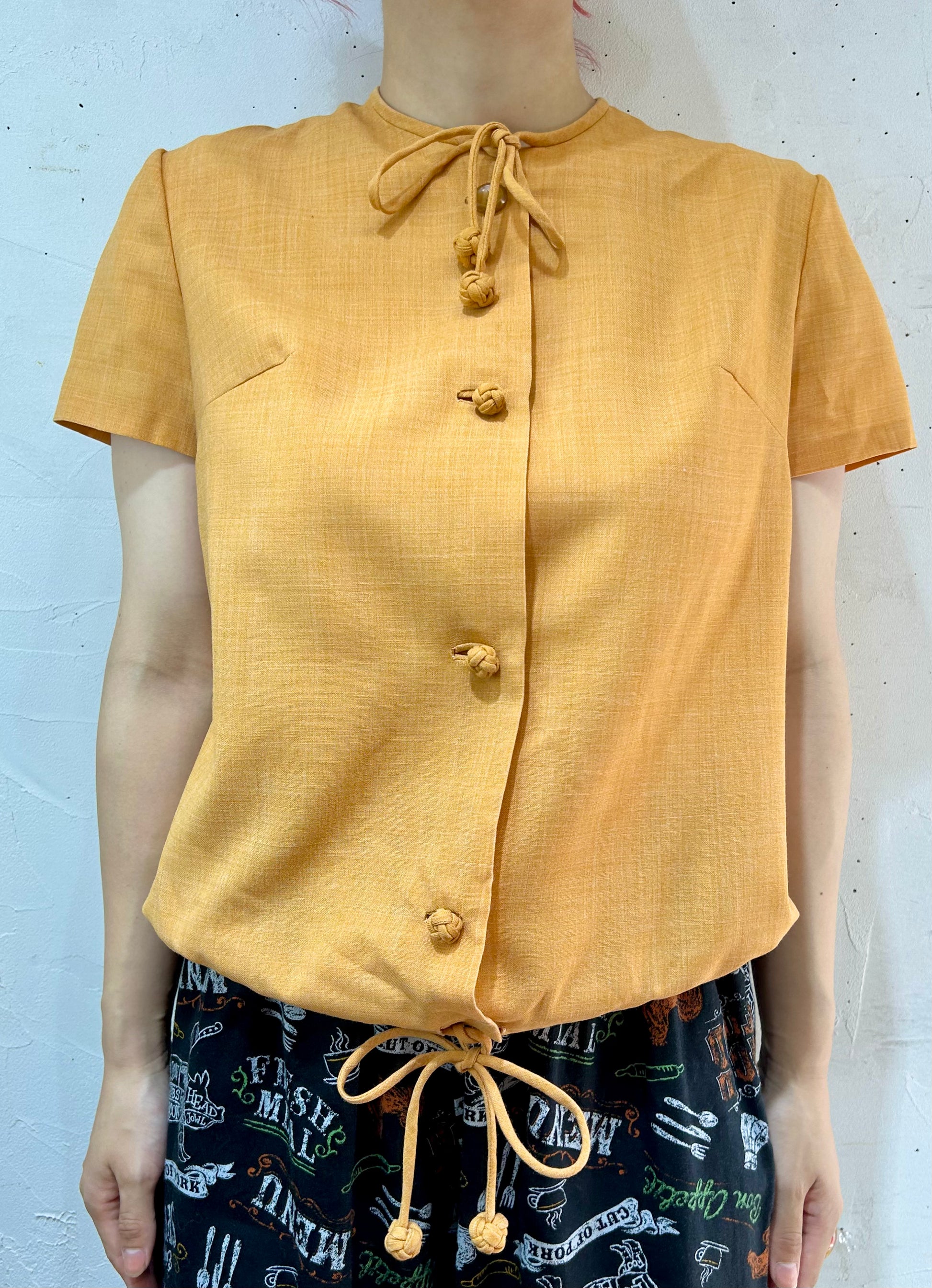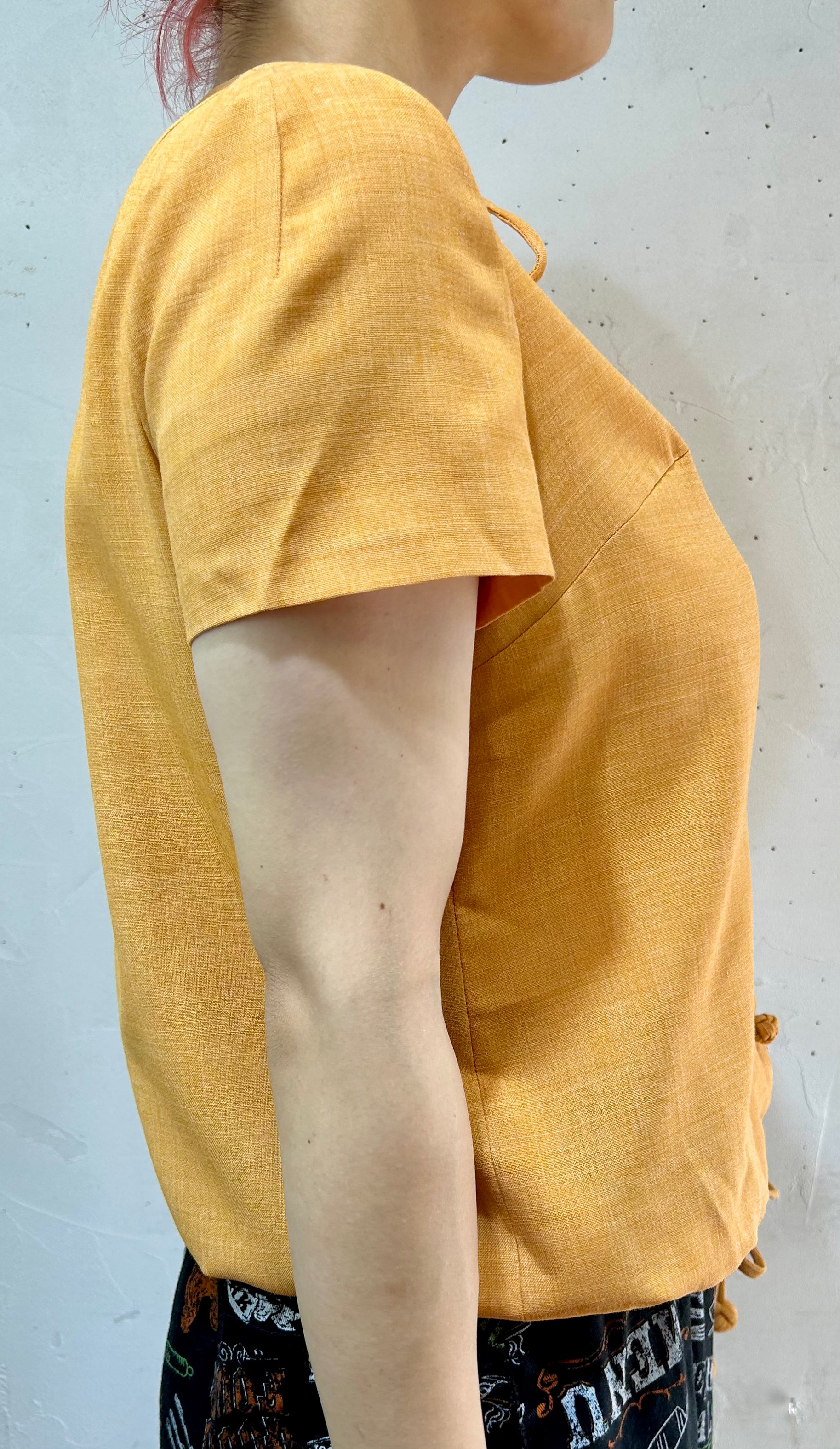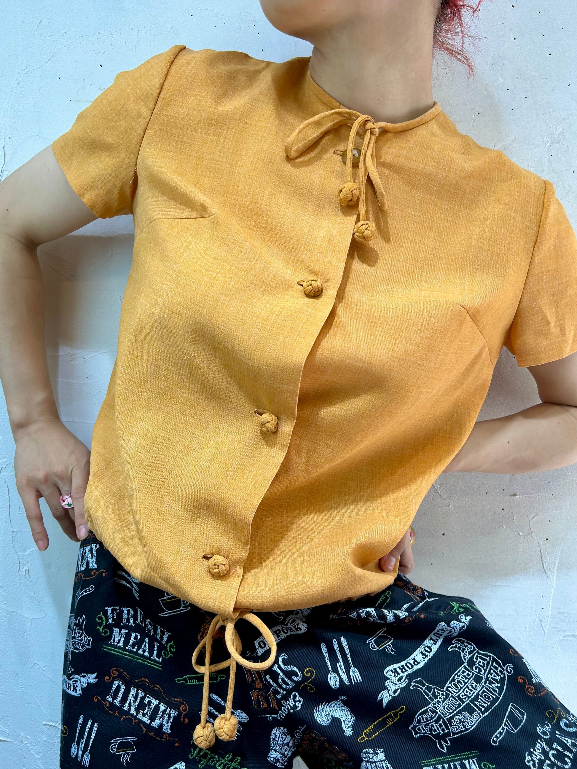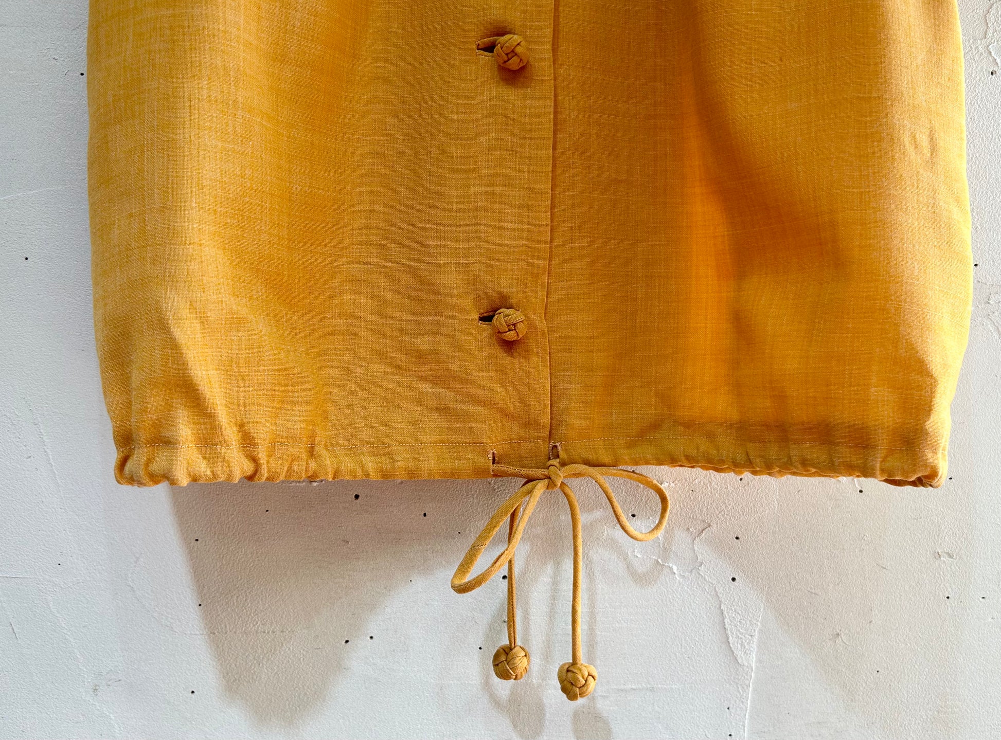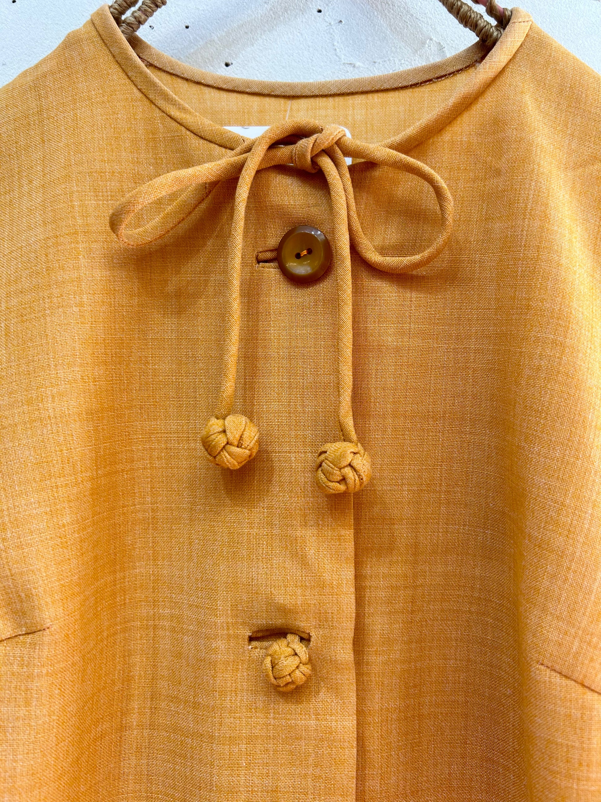山吹色のボディに、コロンと丸いチャイニーズボタンとリボンが可愛らしい一着。
