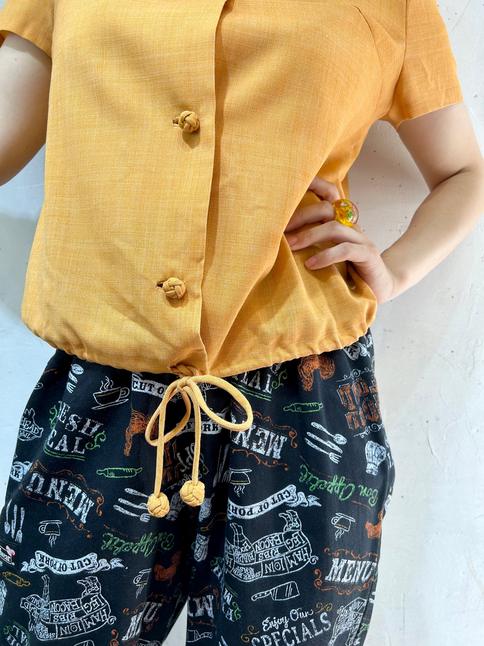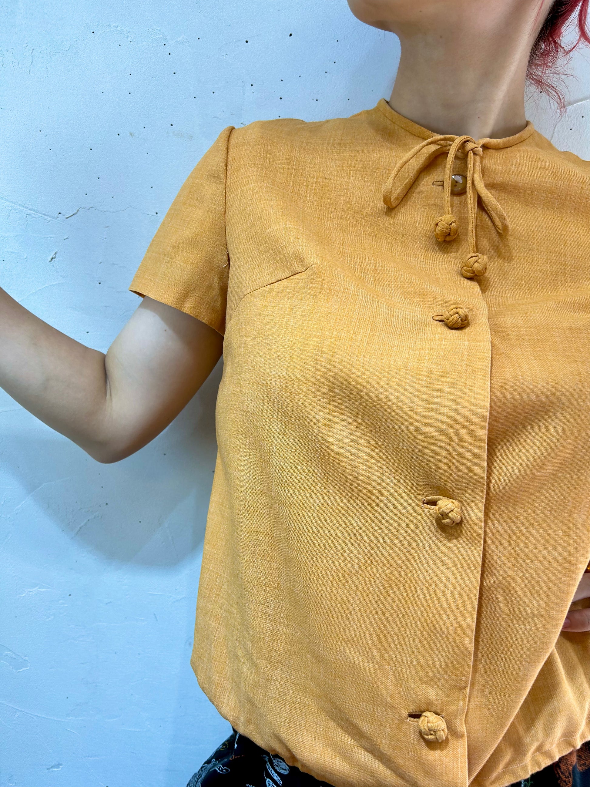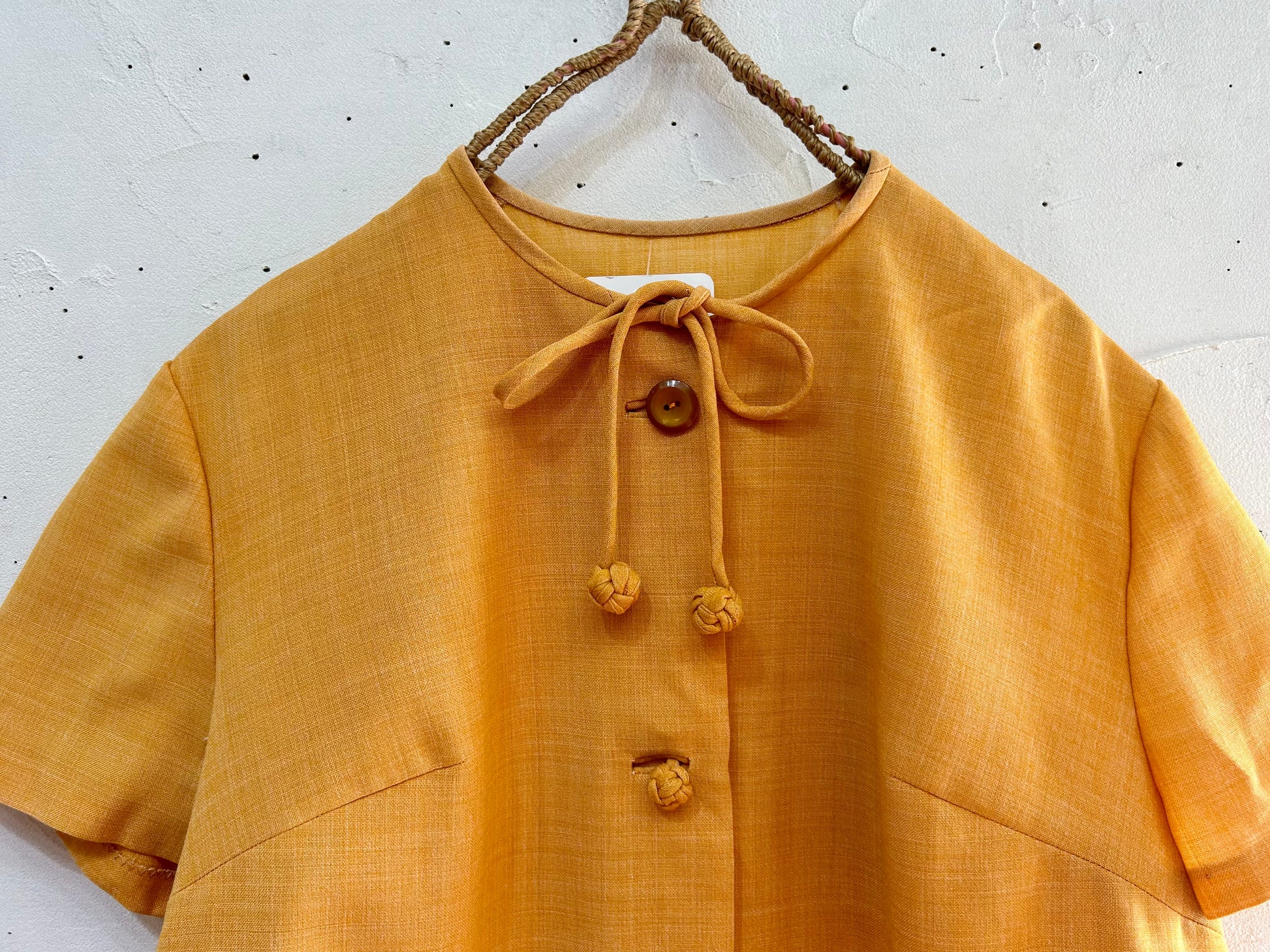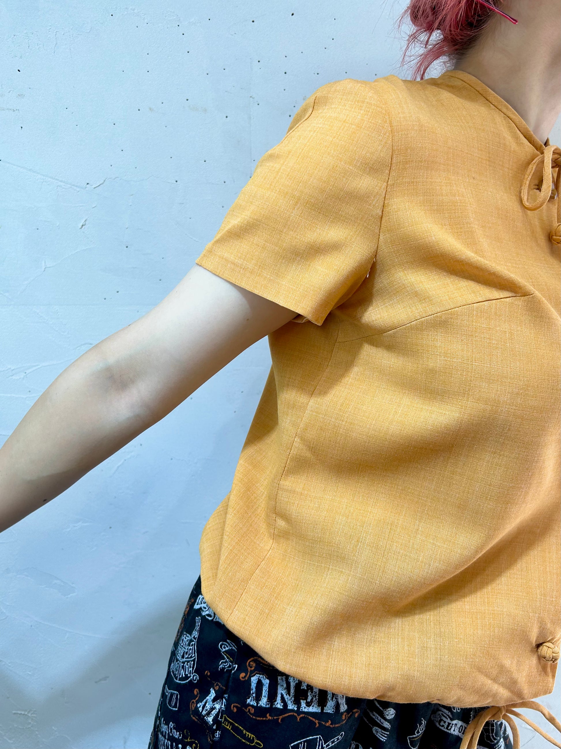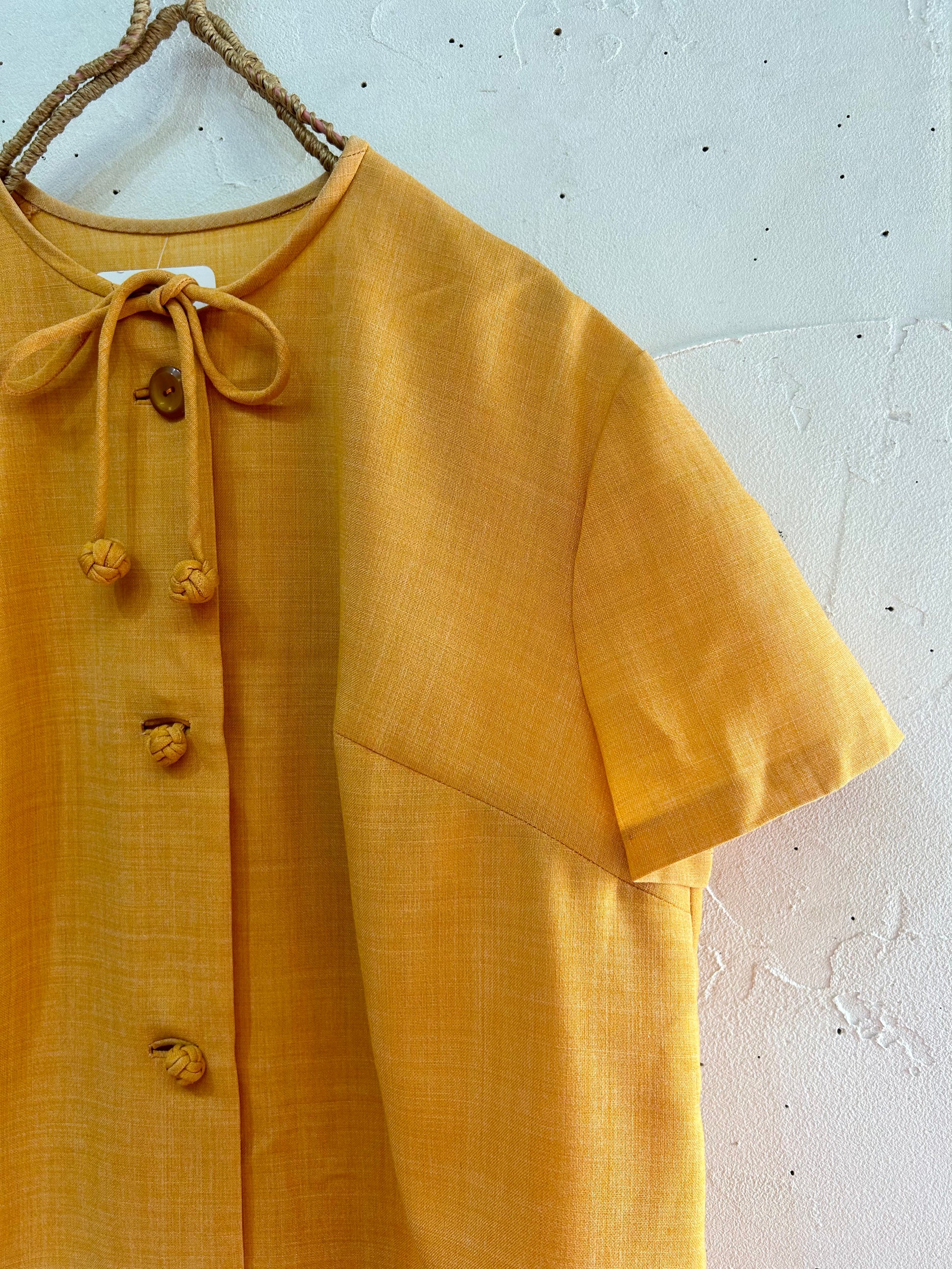 山吹色のボディに、コロンと丸いチャイニーズボタンとリボンが可愛らしい一着。
