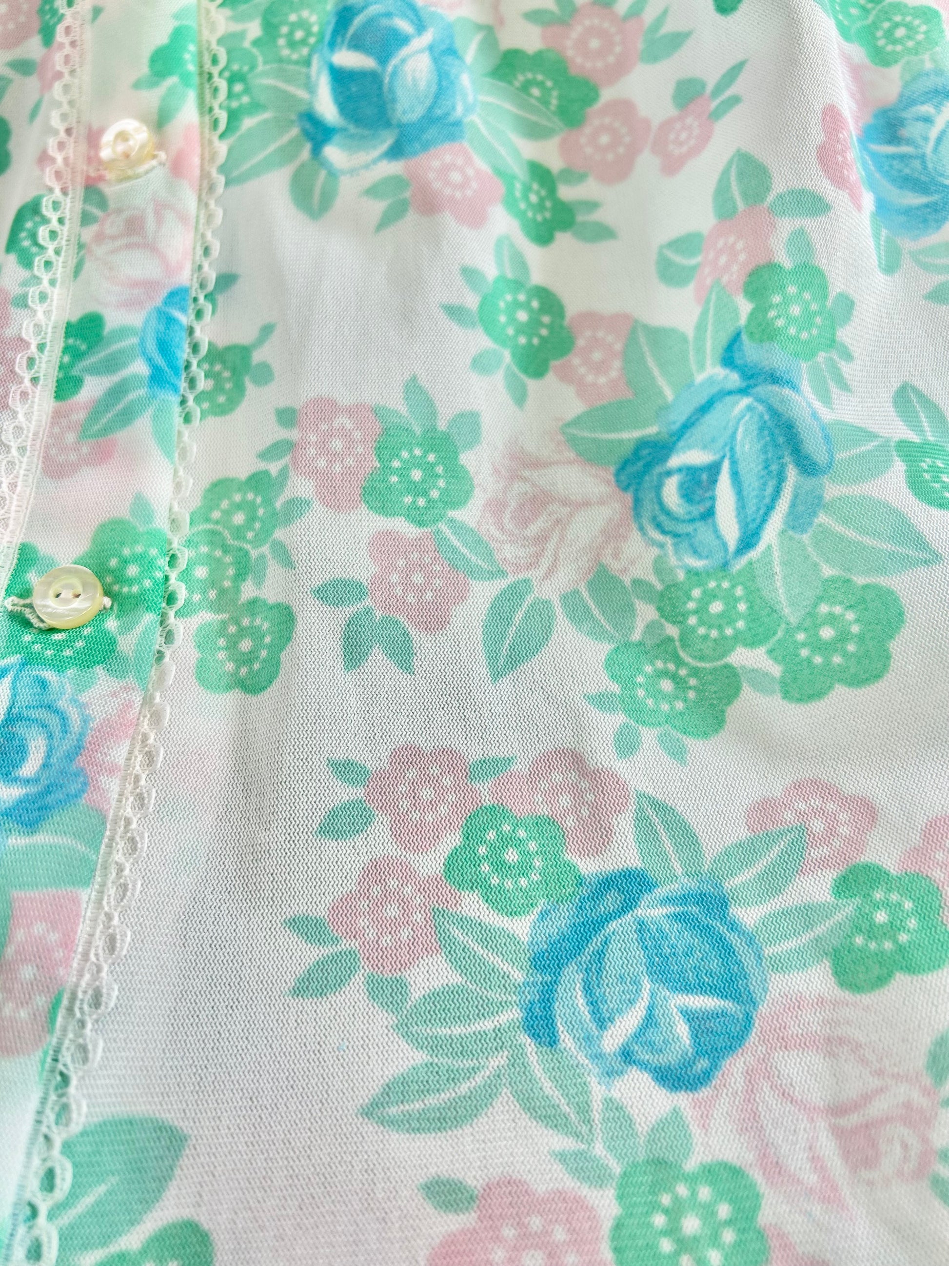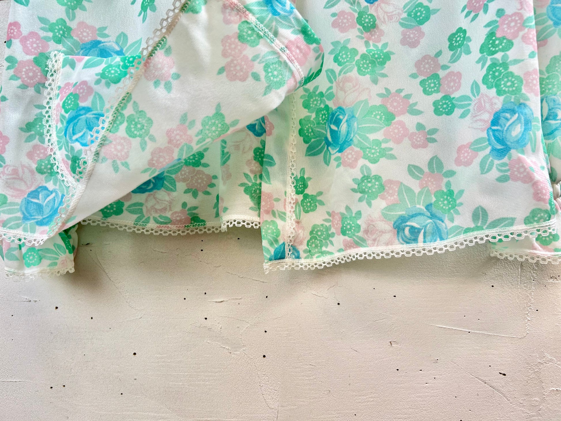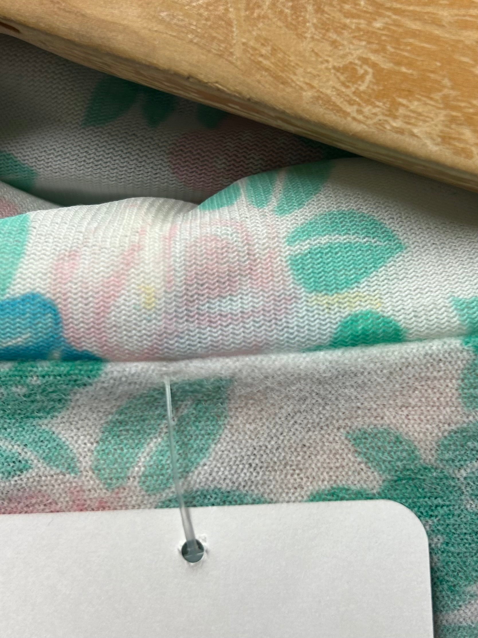 白ボディに水色とピンク、グリーンの爽やかなフラワープリントが目を奪うアイテム。