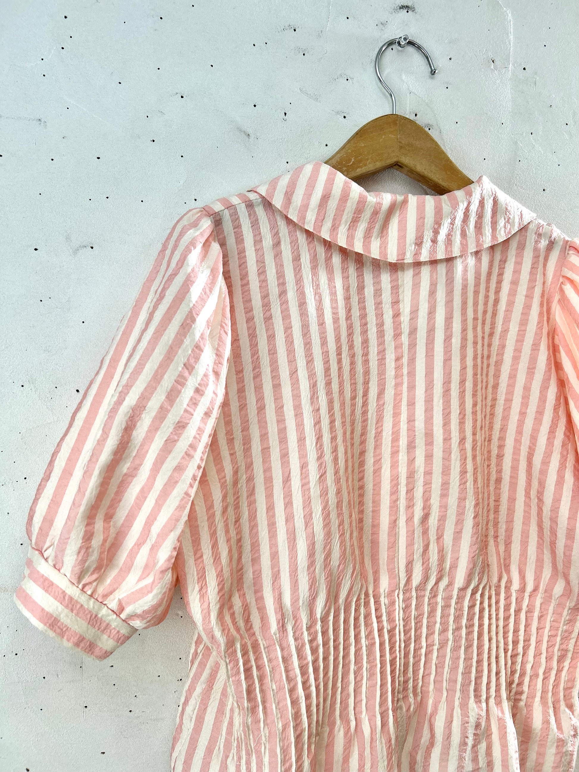 軽やかな素材で甘めカラーのストライプか可愛い1着。