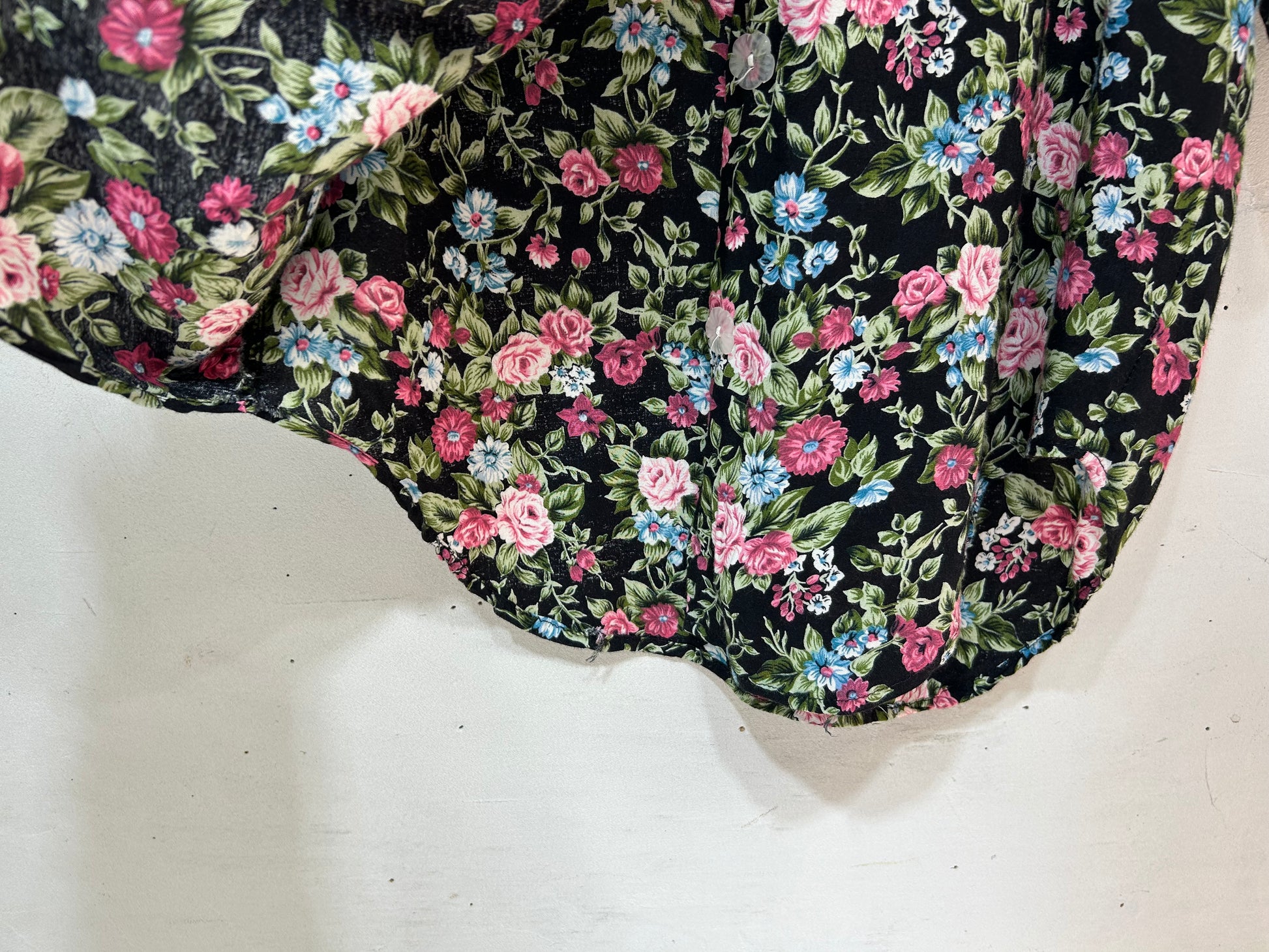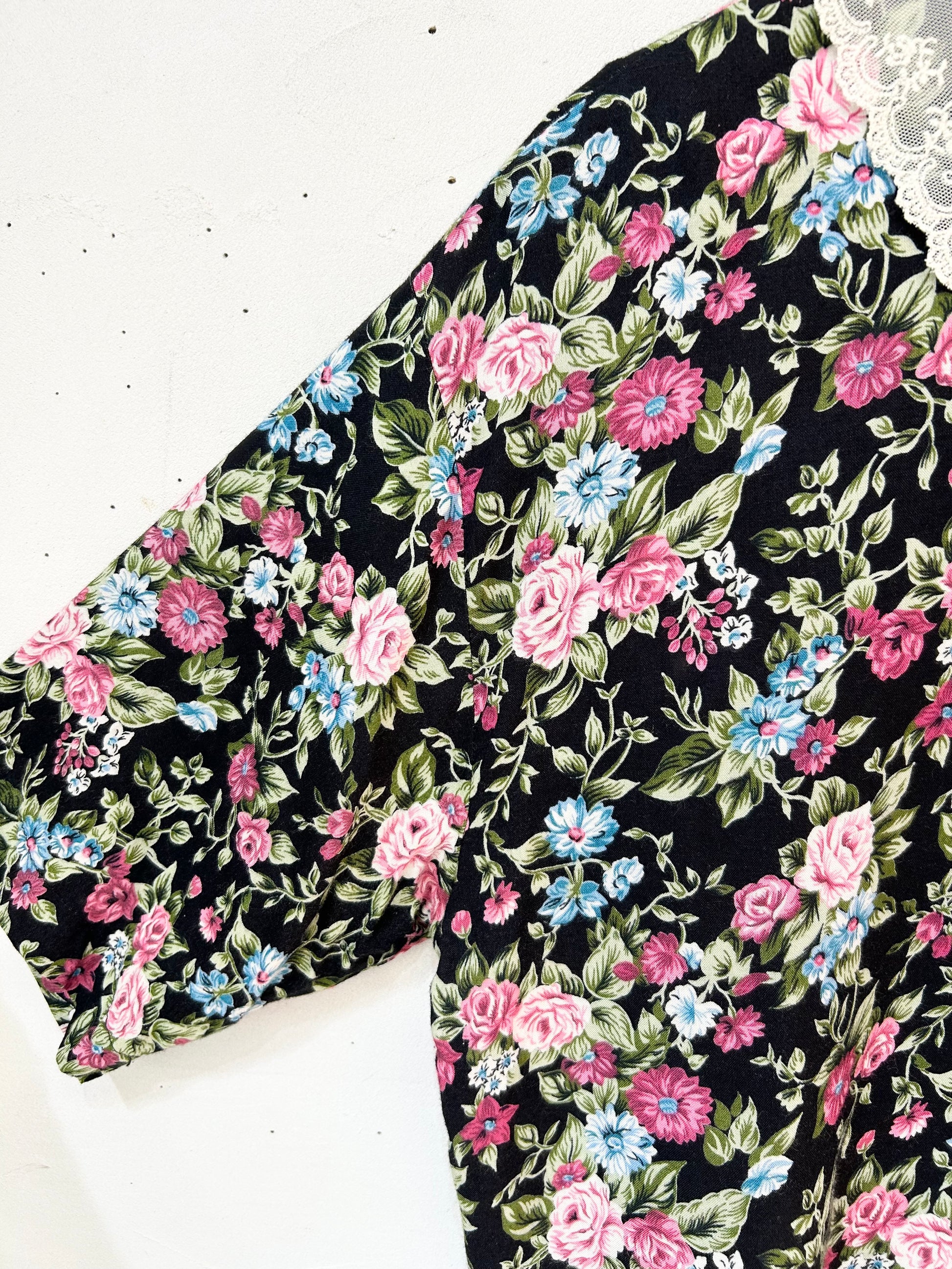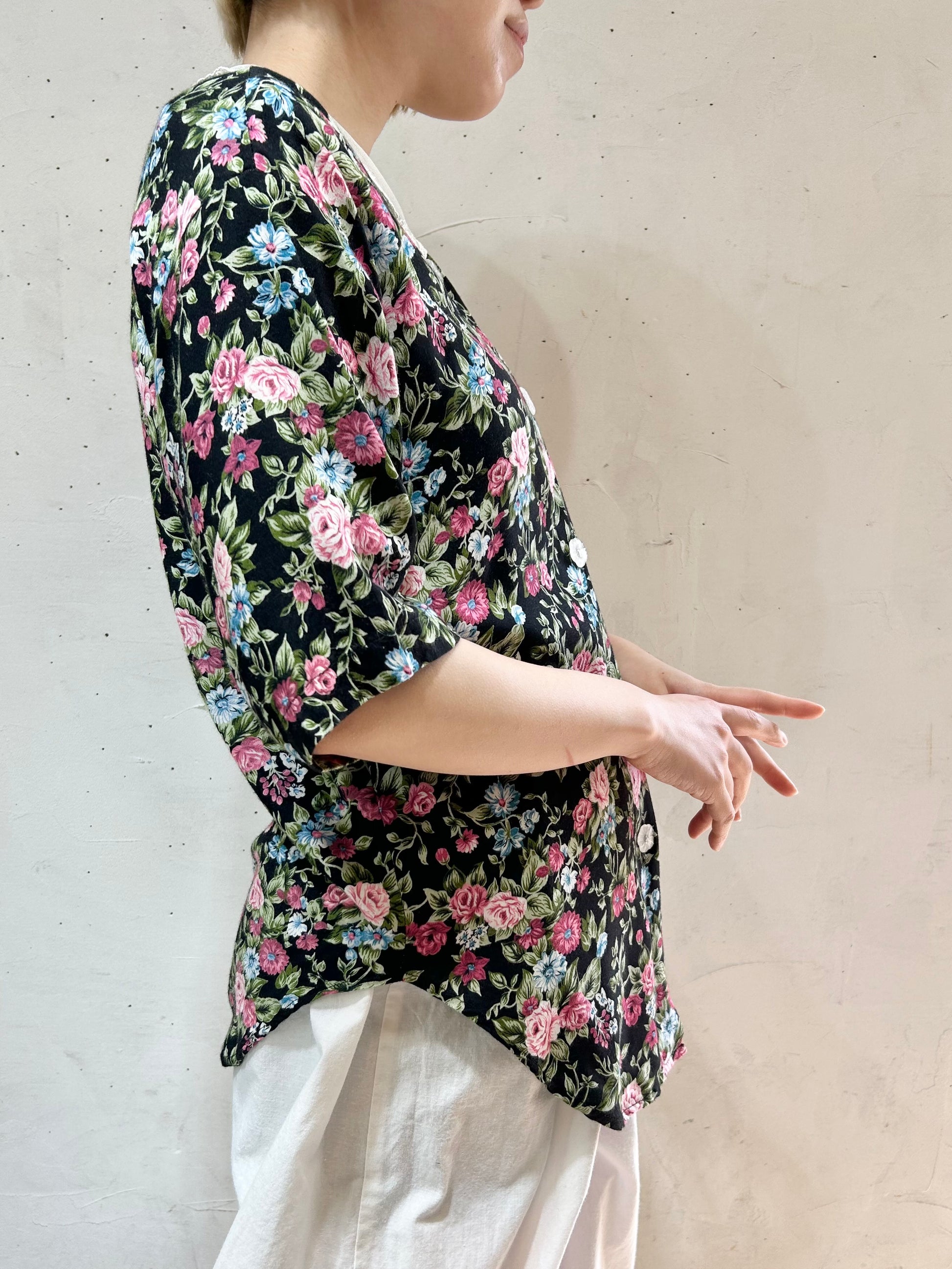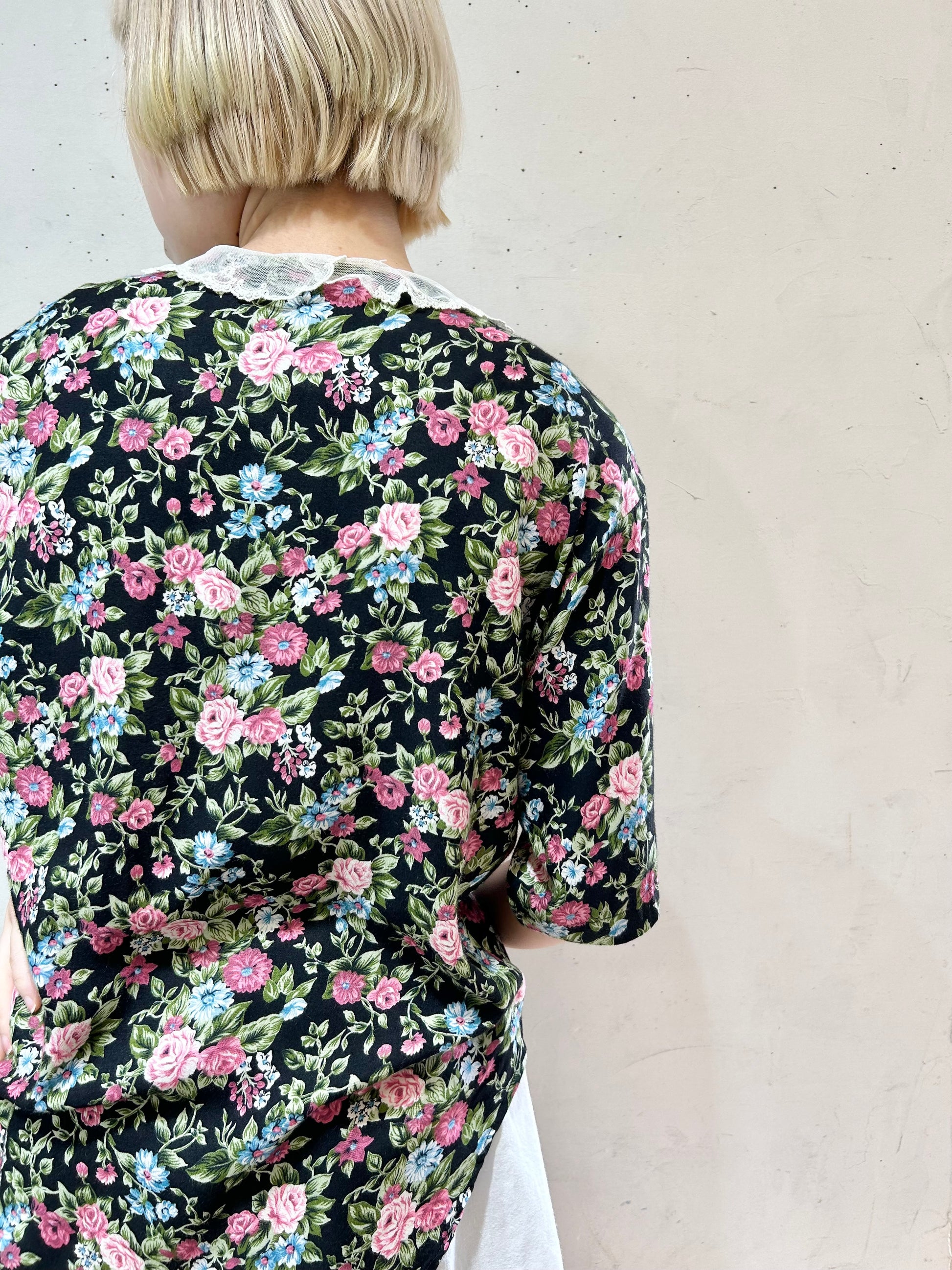 ブラックボディに映えるピンクやブルーのフラワーパターンが華やかな1着。