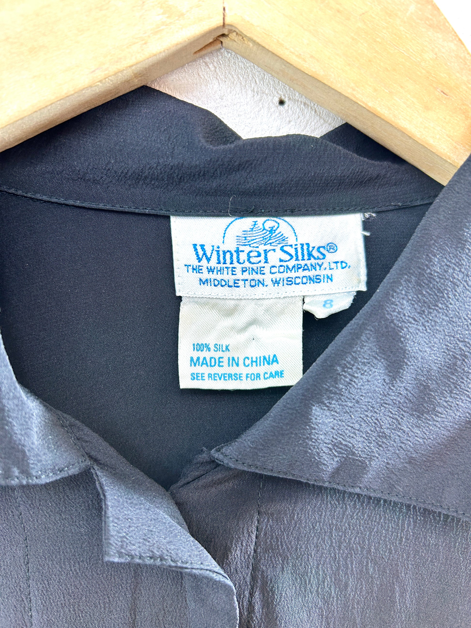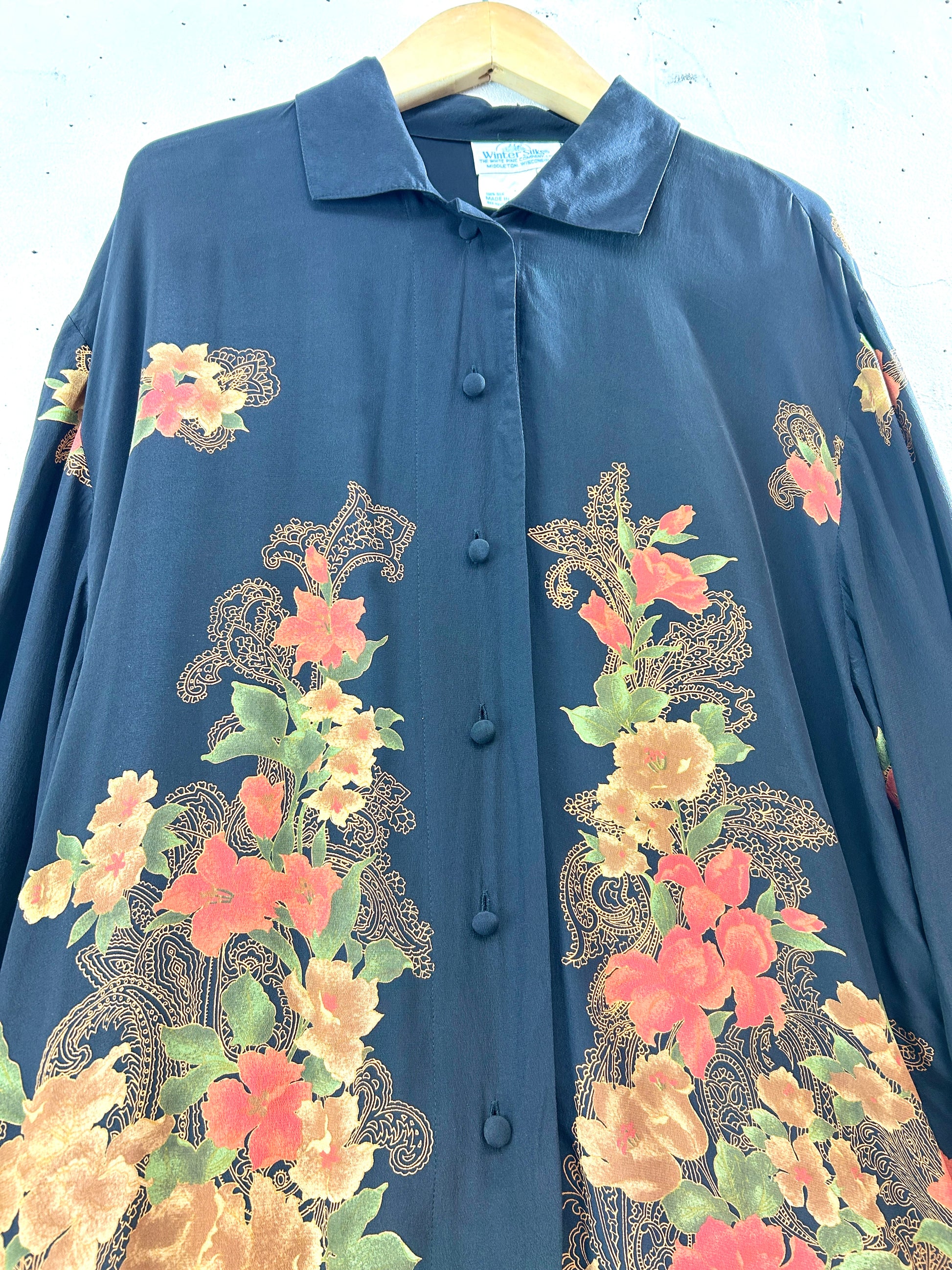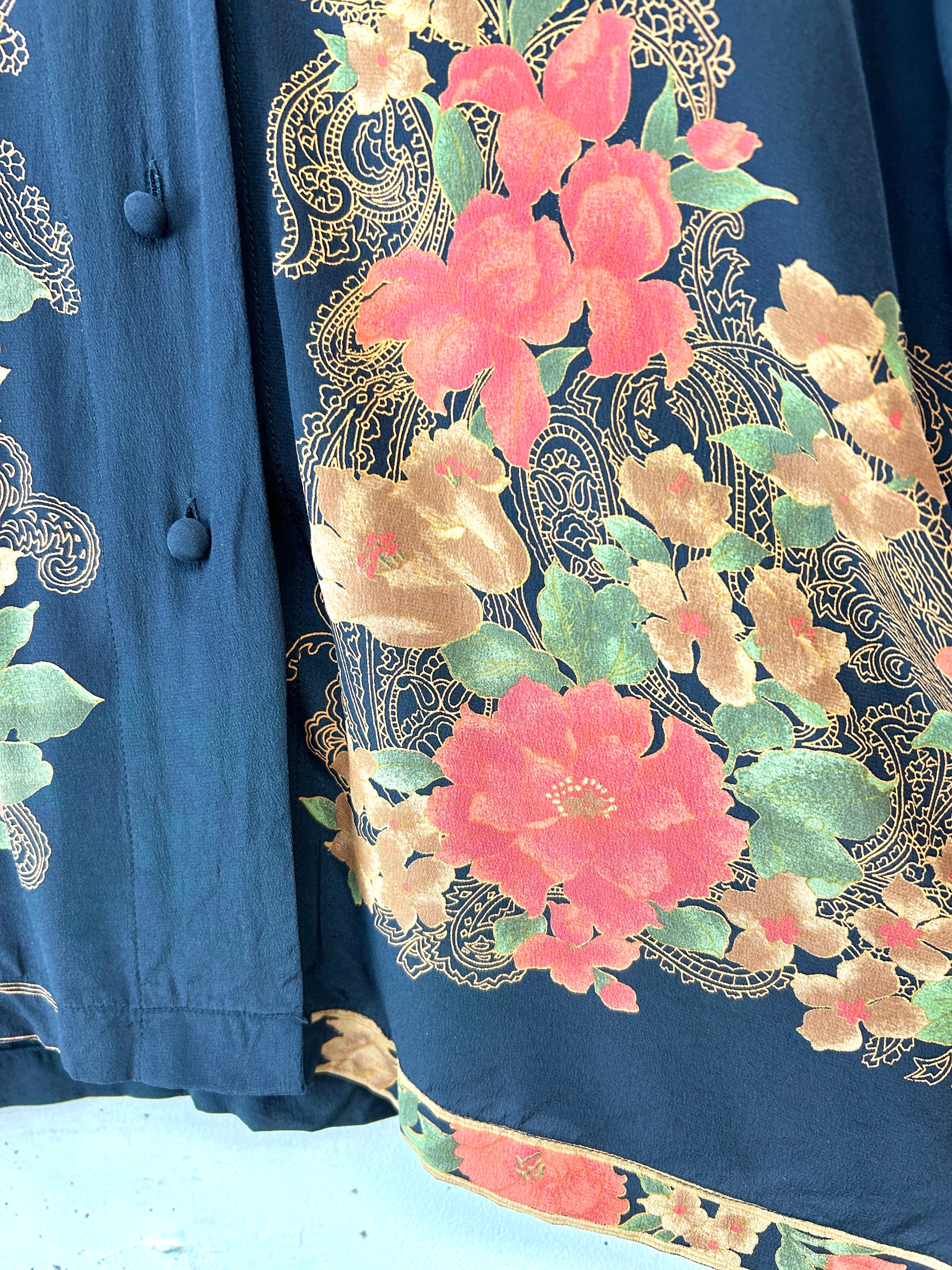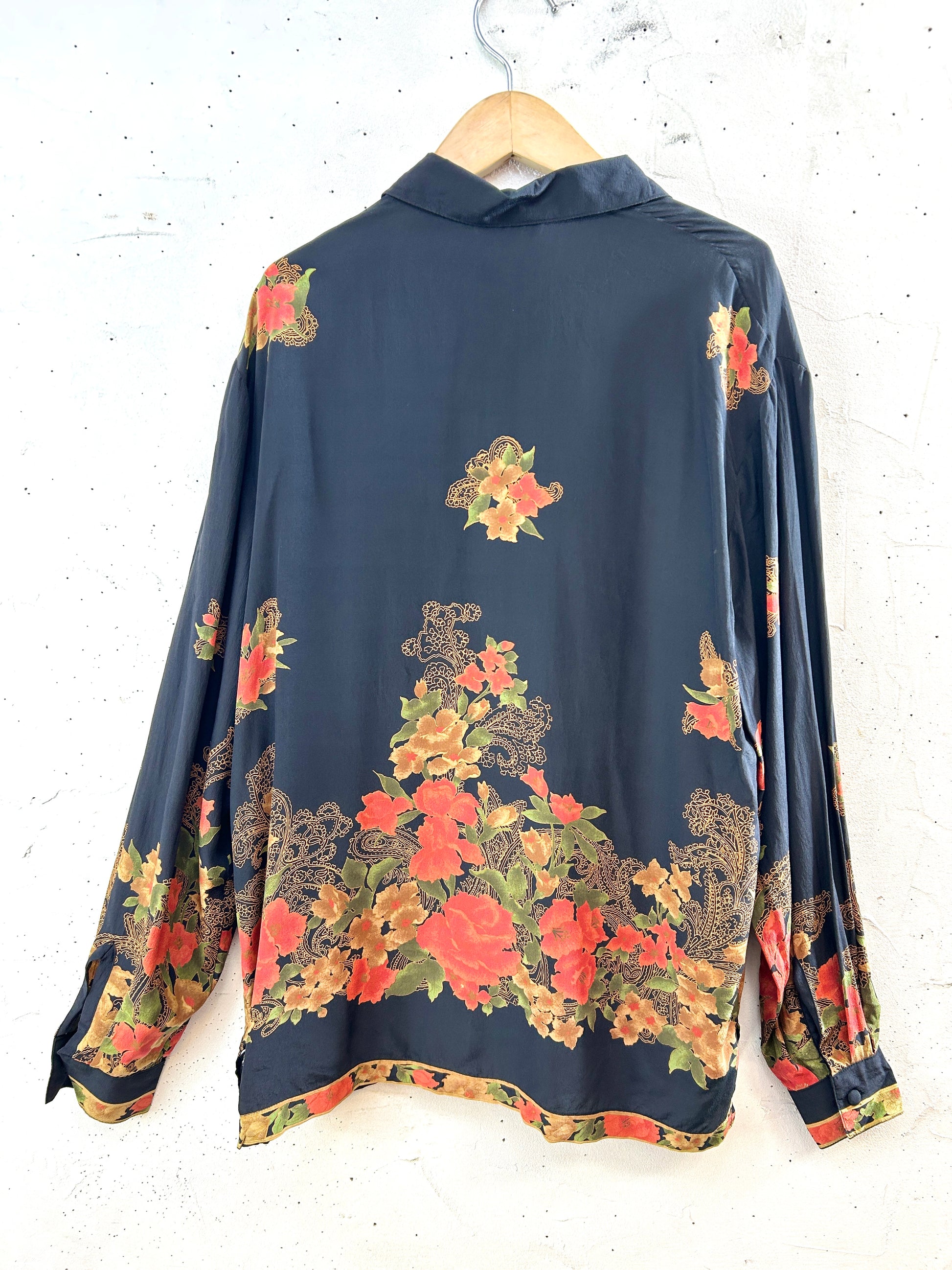 ブラックに暖色系の花模様のデザインのシルクシャツです。品のある雰囲気でとても魅力的です。