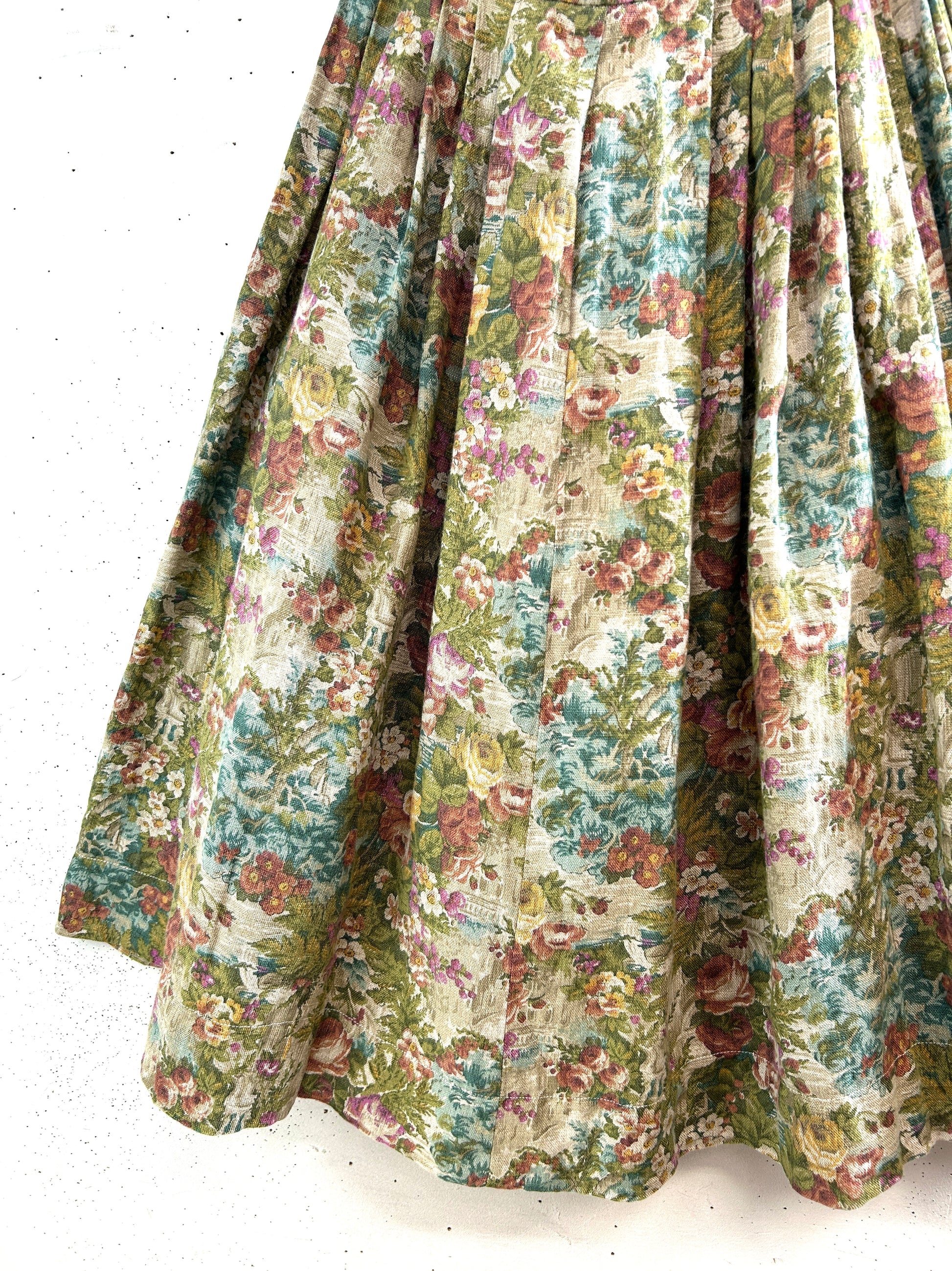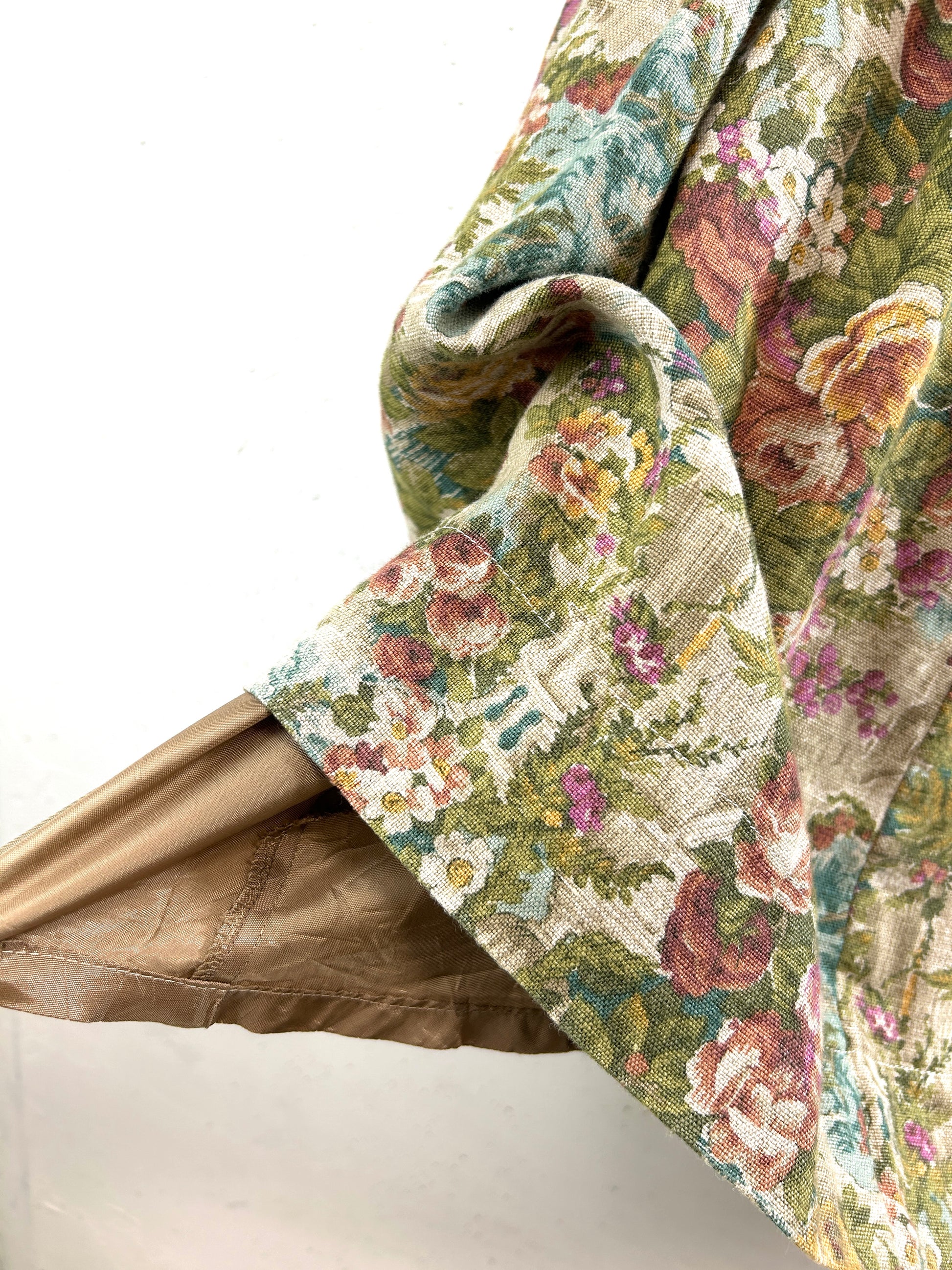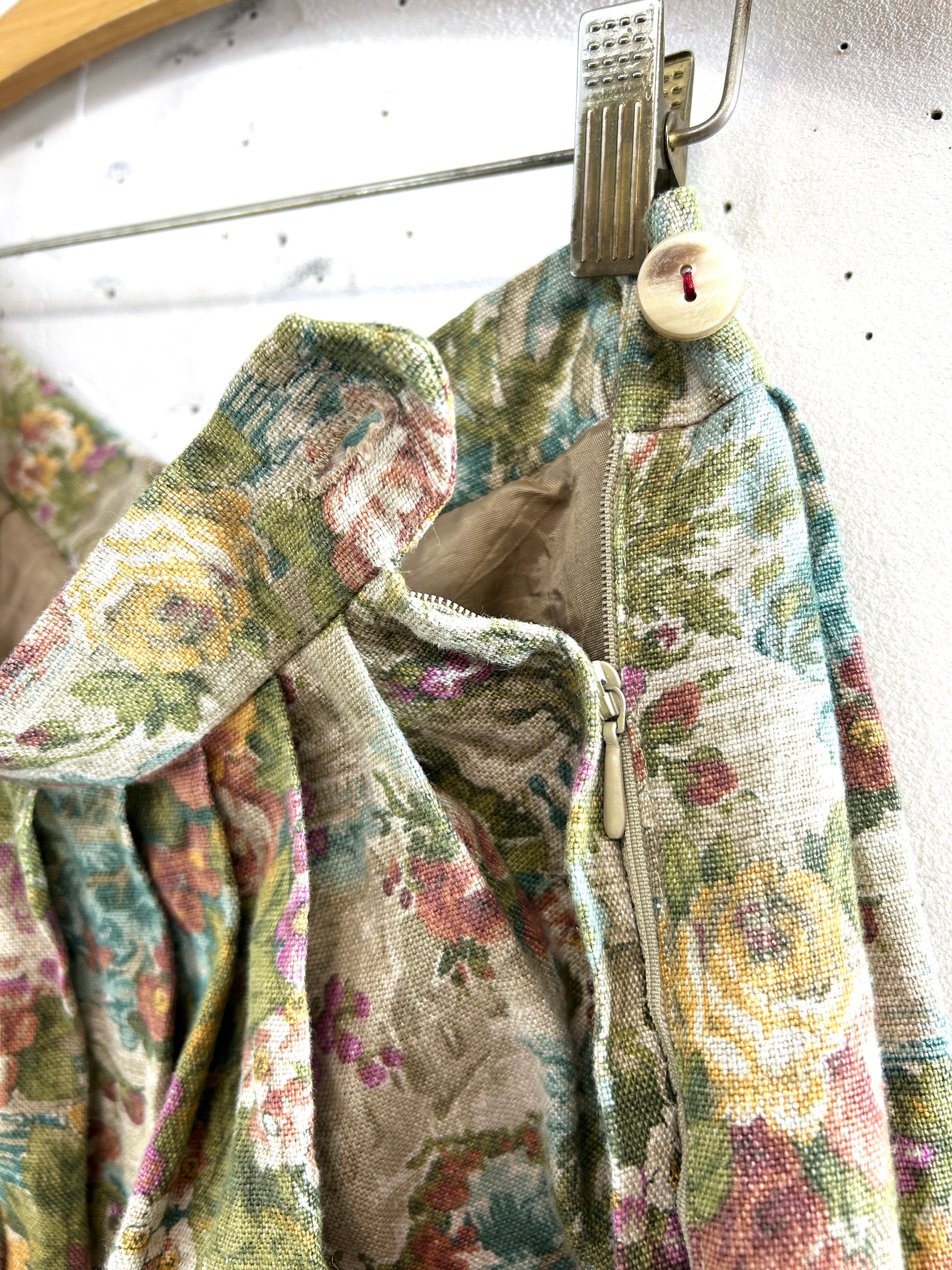 ベージュベースのお城のガーデンの様な風景とお花のプリントが目を惹くアイテム。
