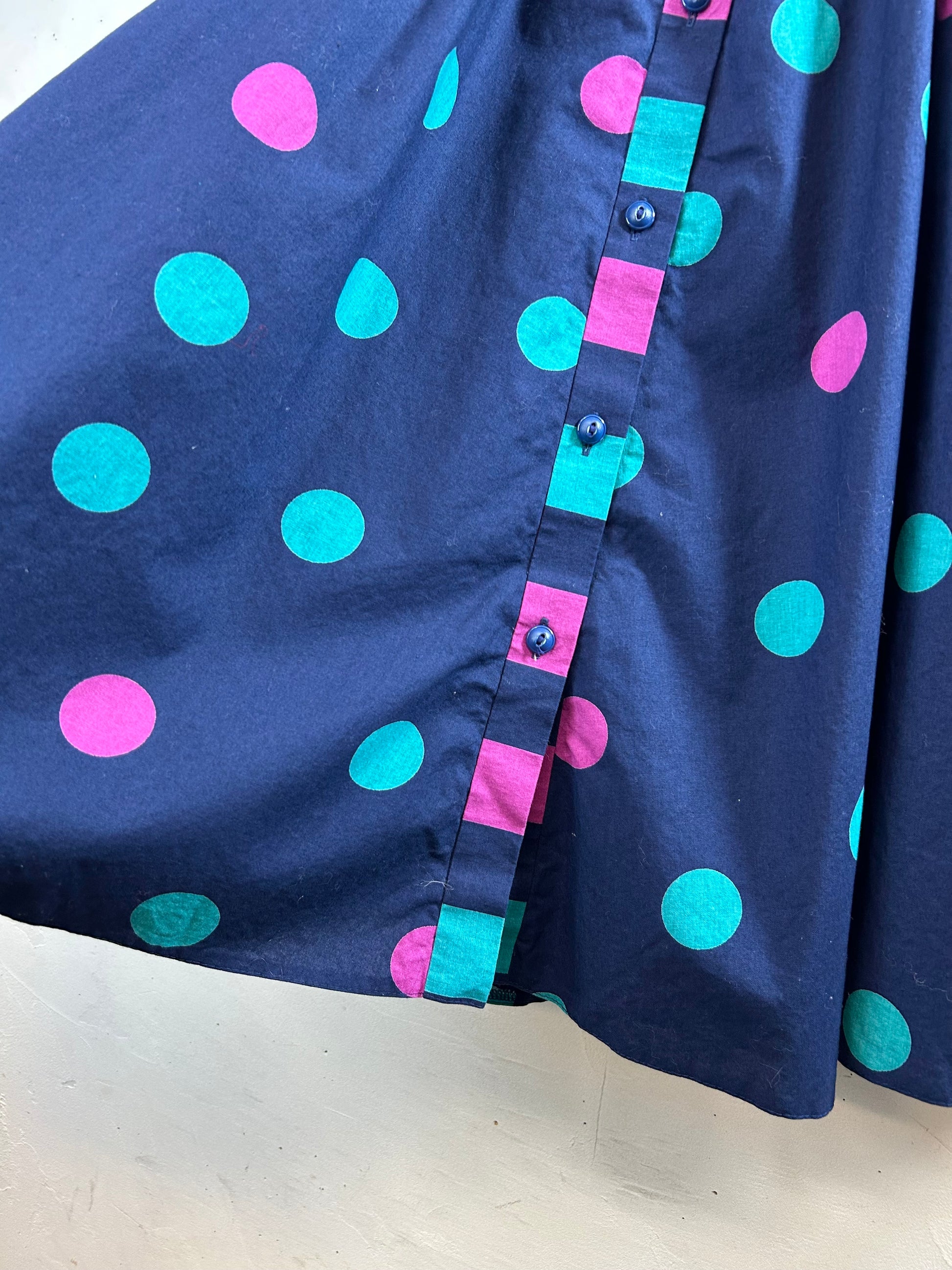 ネイビーボディに2色のドットが映え存在感のある一着。