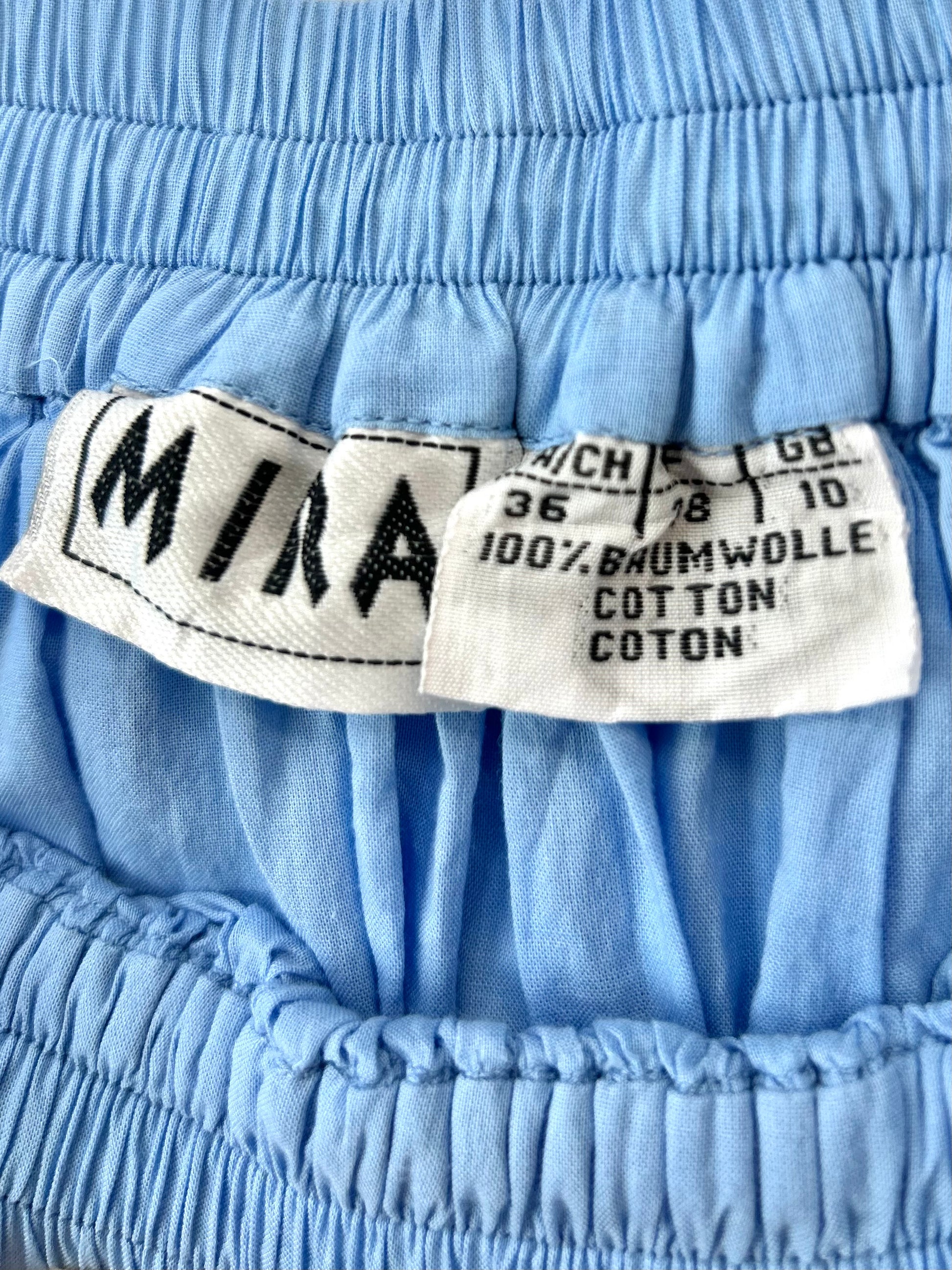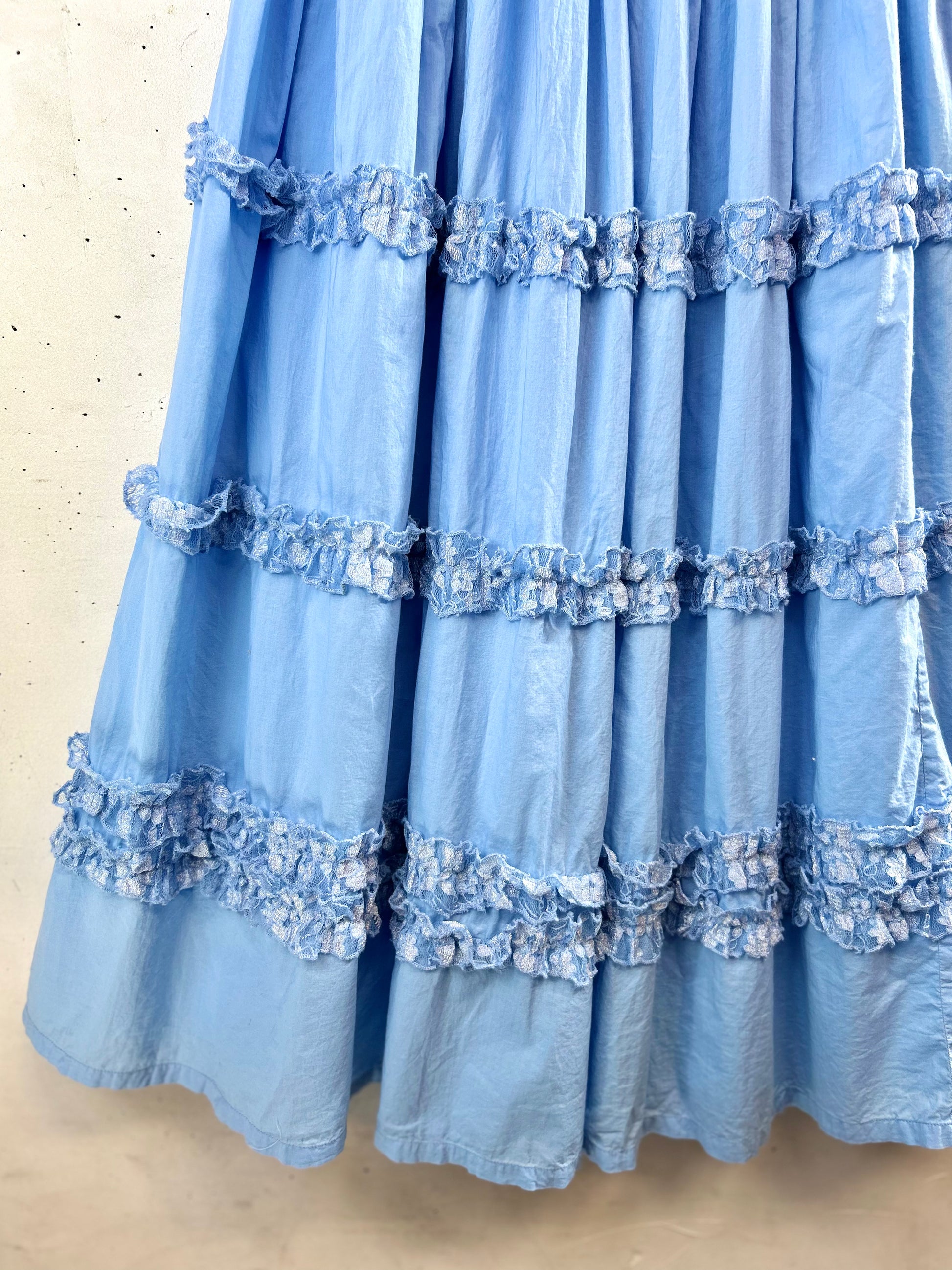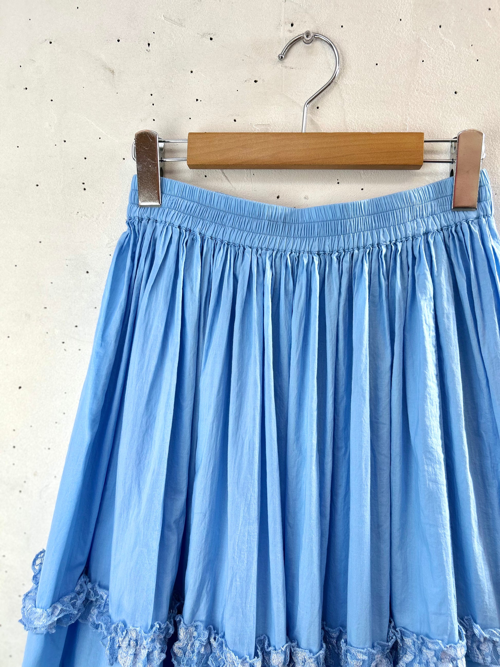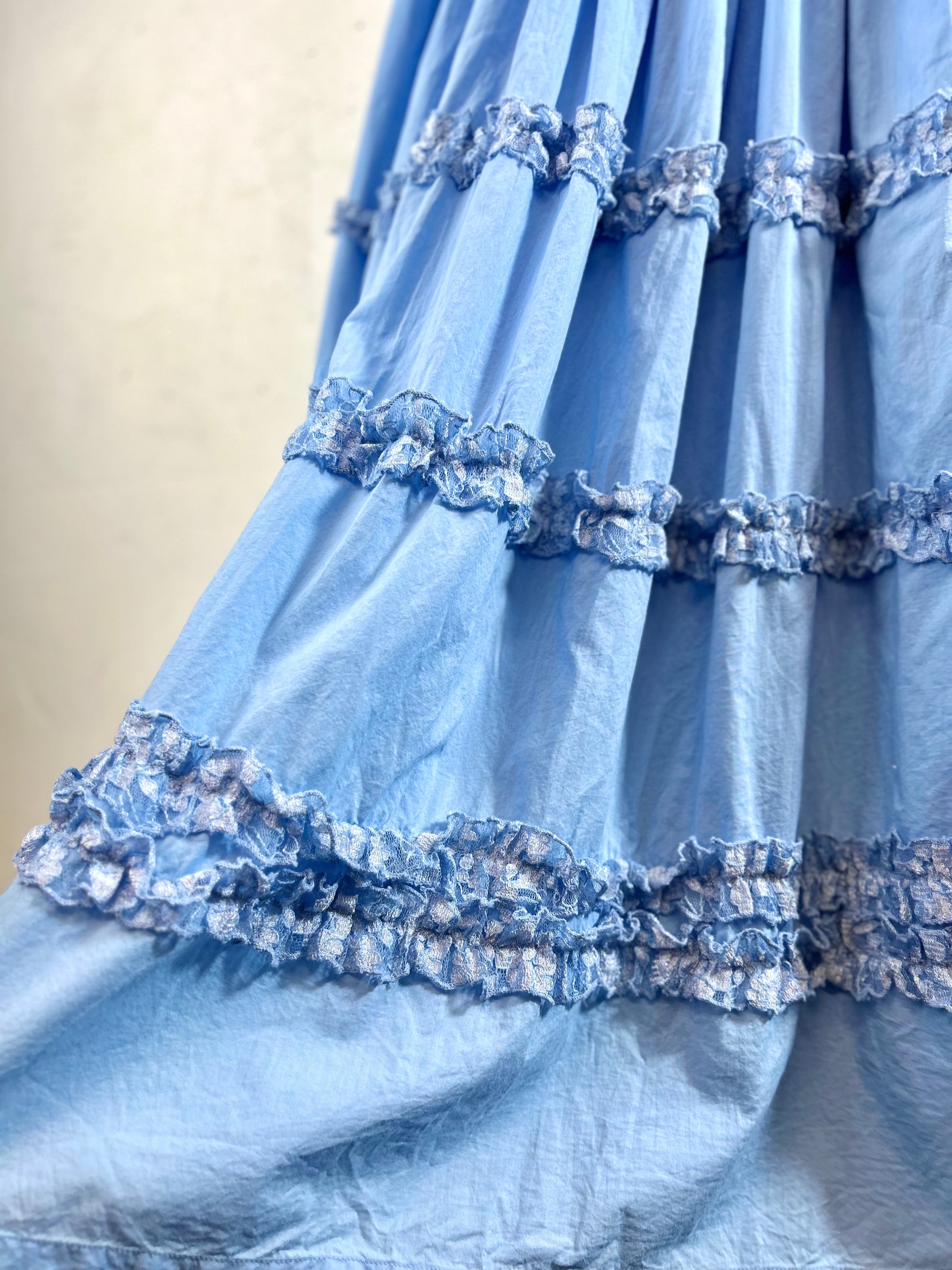 爽やかなライトブルーカラーにレースがキュートな一着。