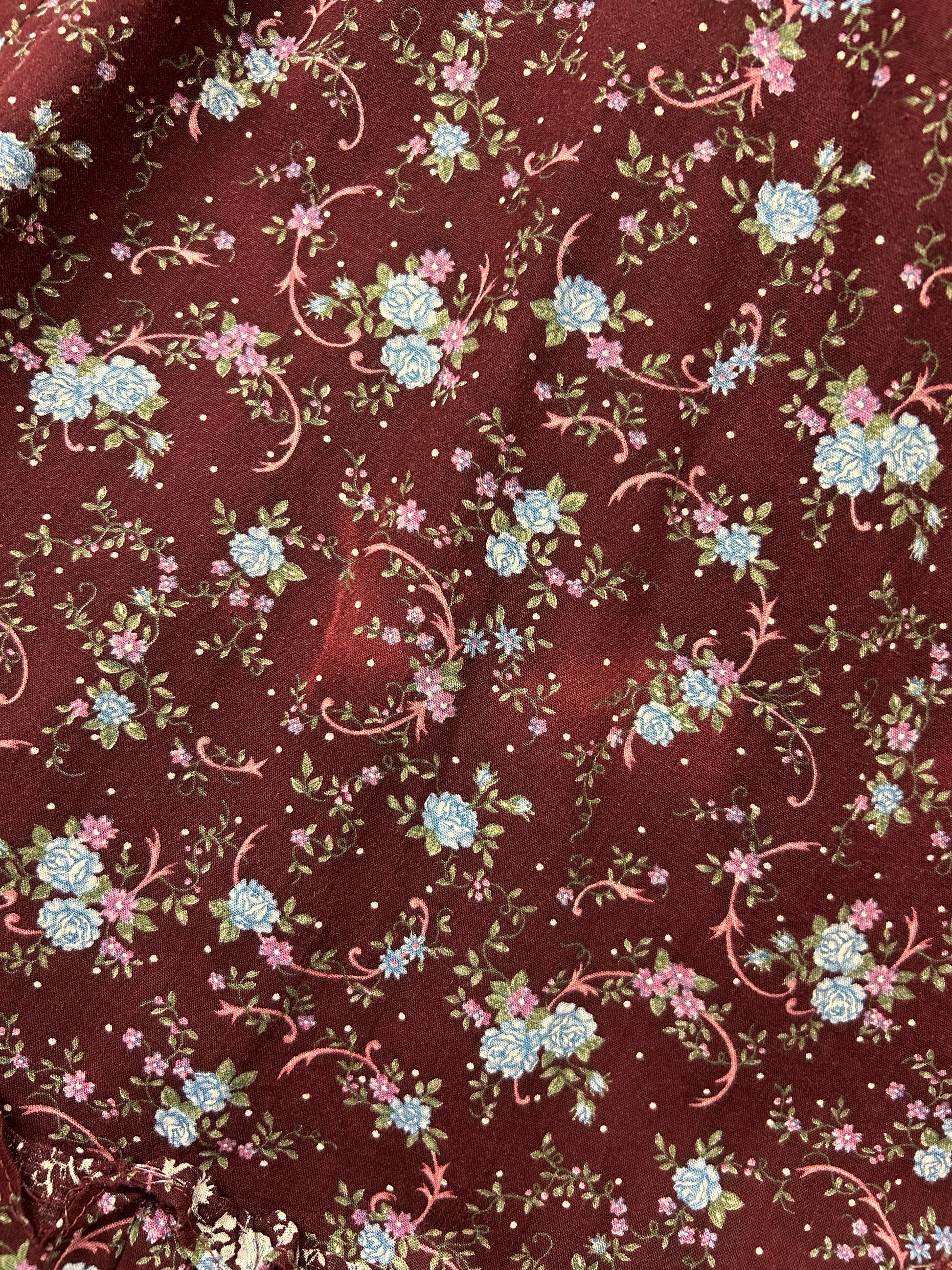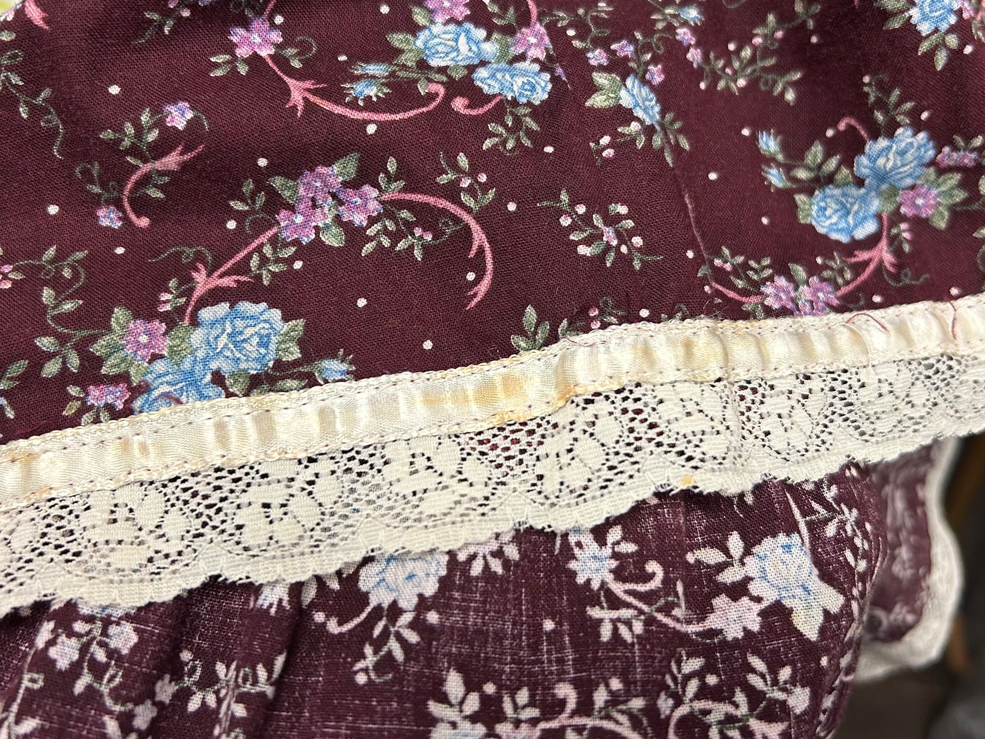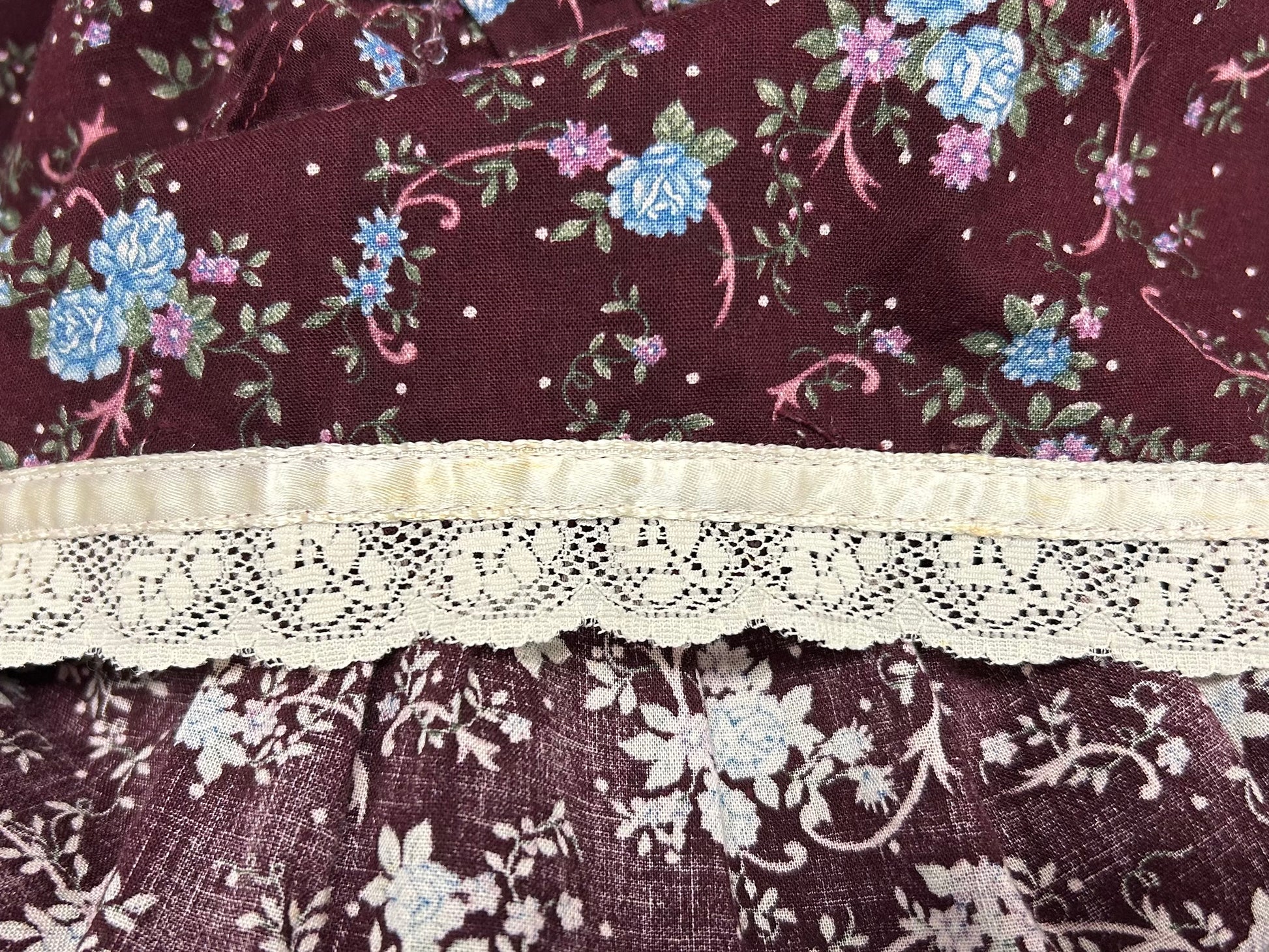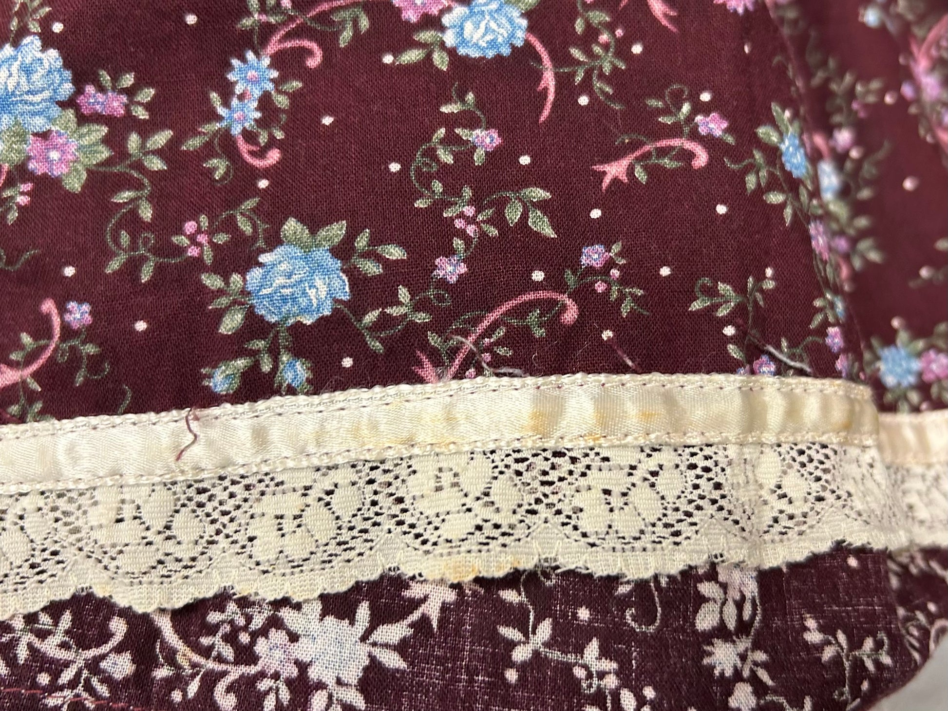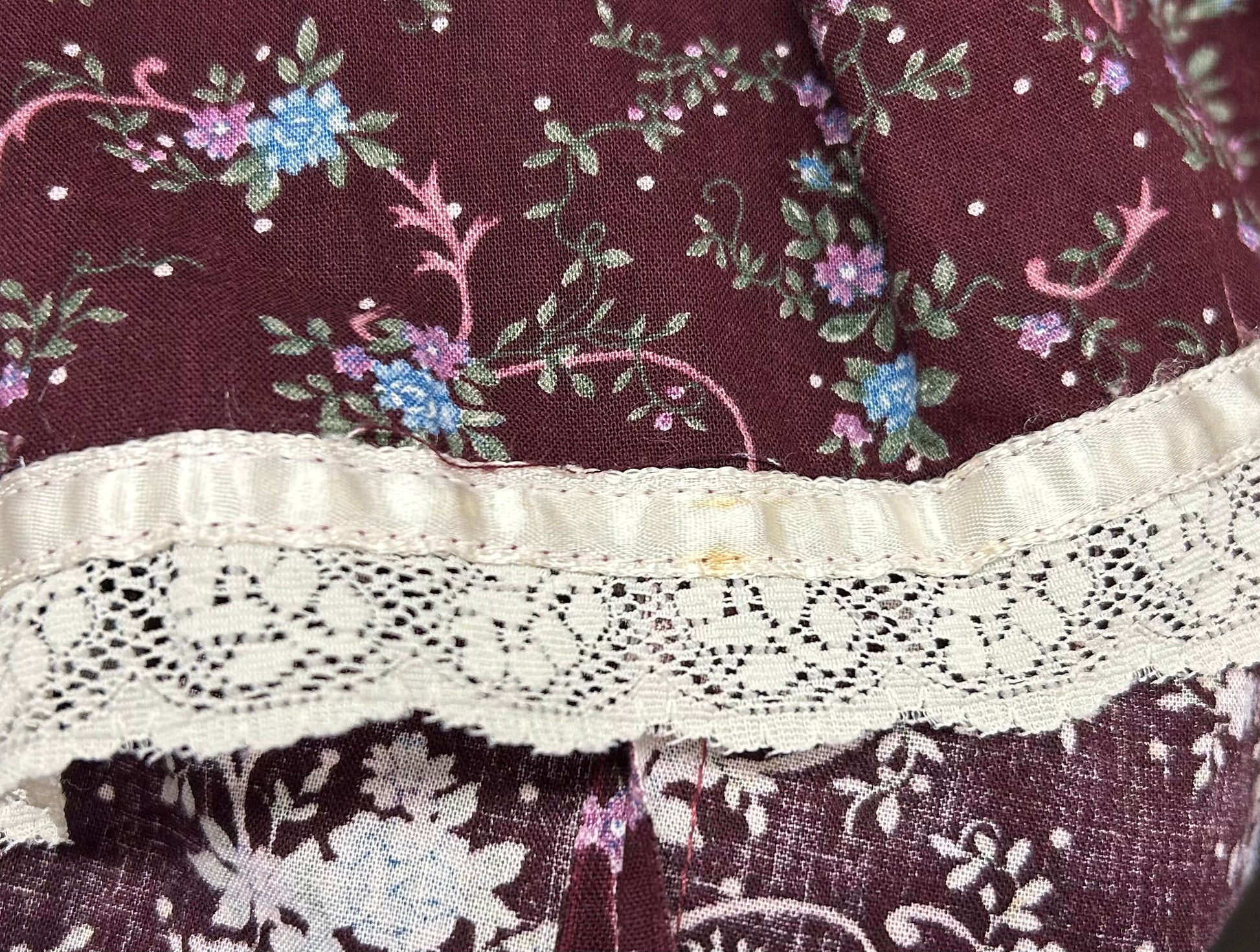 コンディション:裾サテンリボンにシミ、バックに色抜けがございますが、お値段にも反映させて頂いており、ビンテージにご理解頂いている方でしたら、気にせずご着用いただける程度かと思われます。