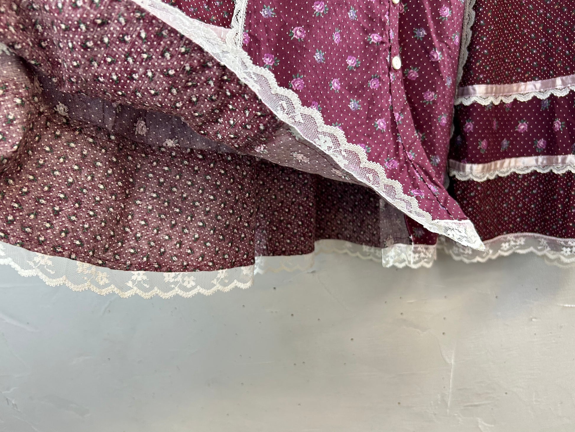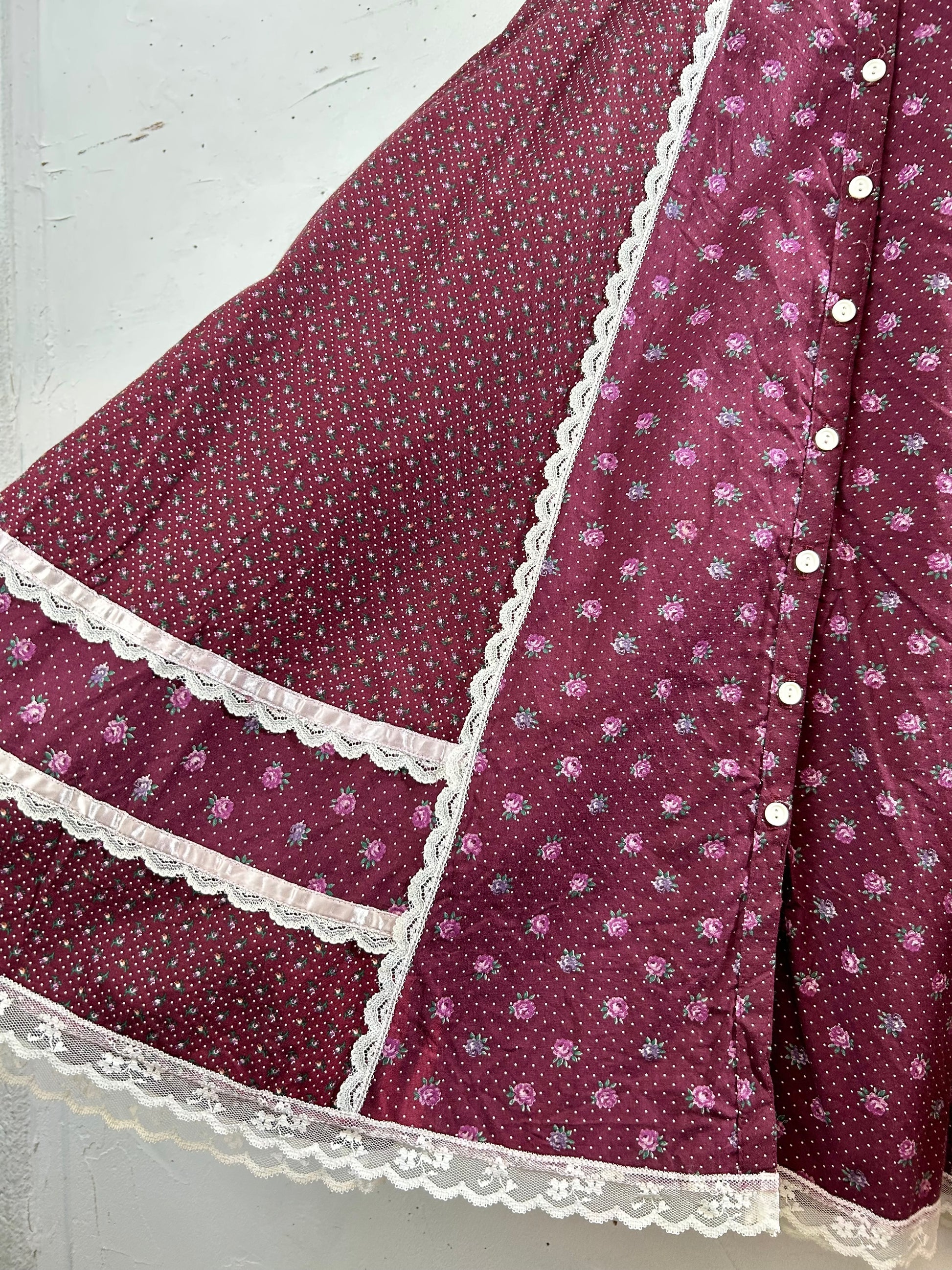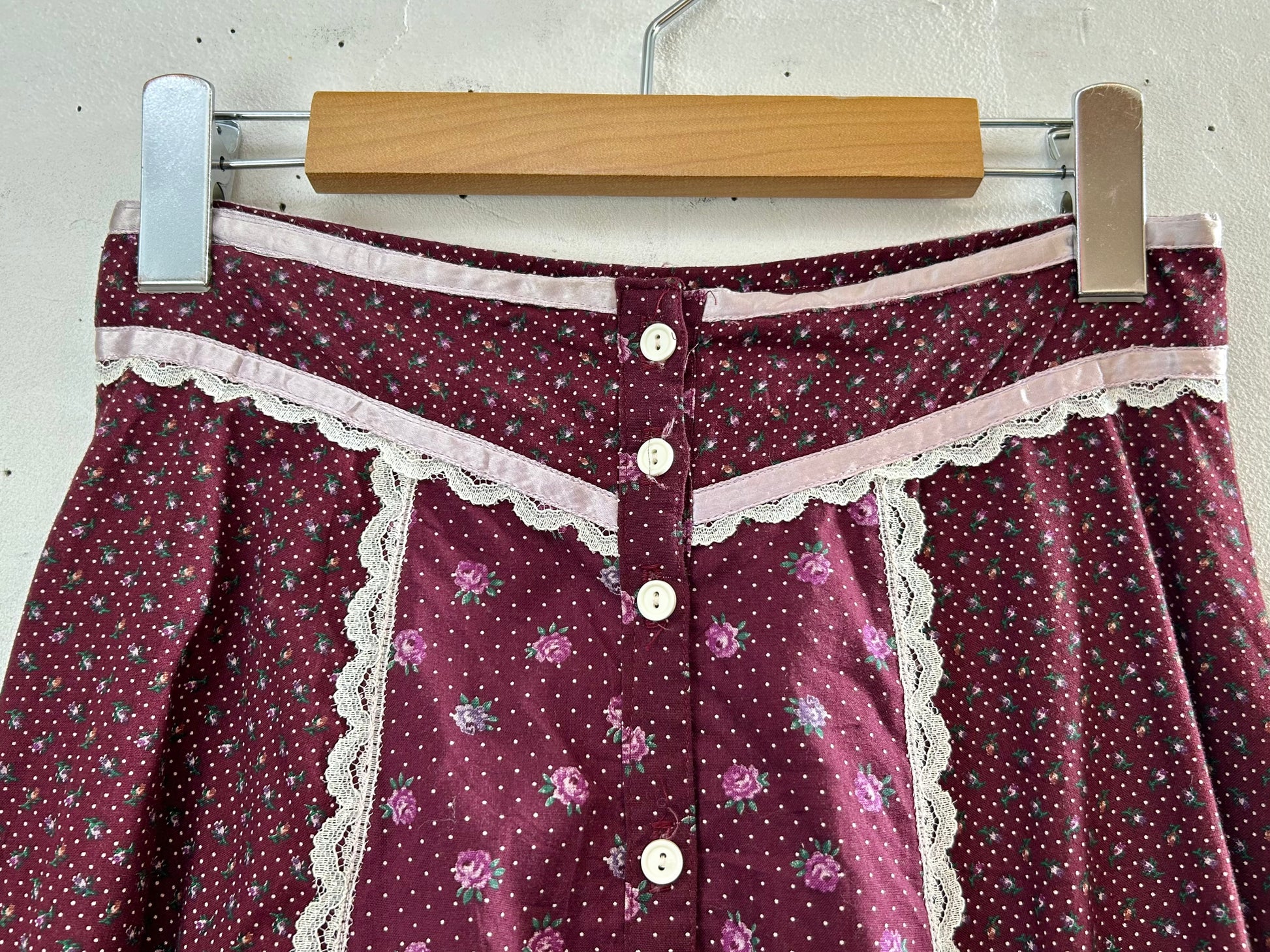 こちらのスカートは、その一つGUNNIESのアイテムで、ピンドットとローズのパターンとレースを組み合わせたGUNNIESらしいガーリーな1着。