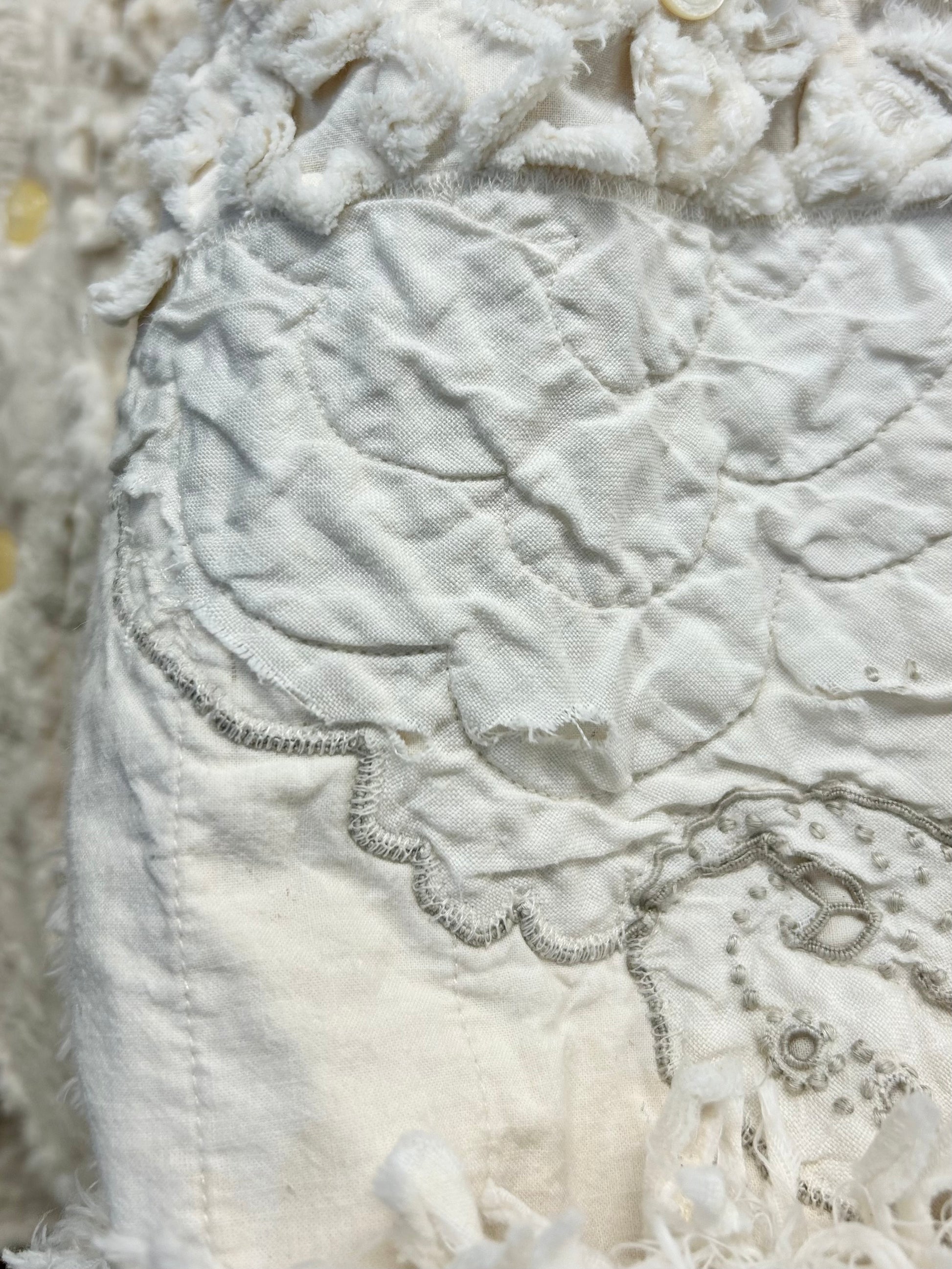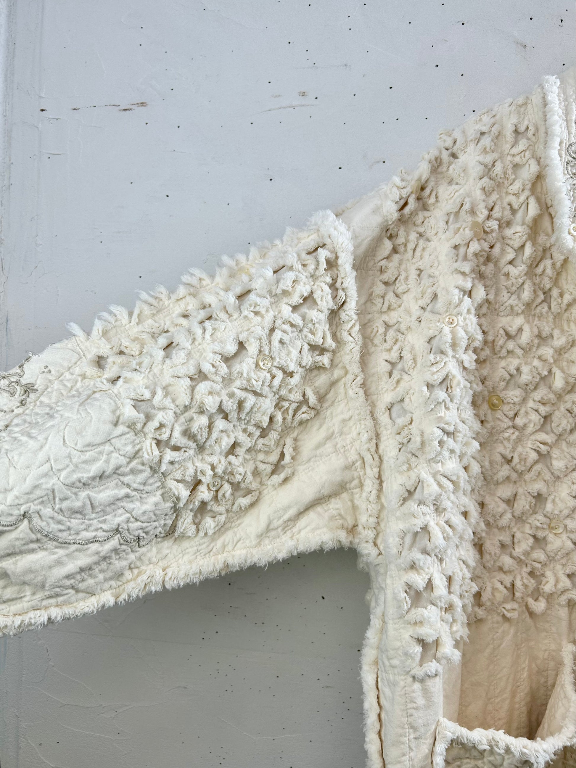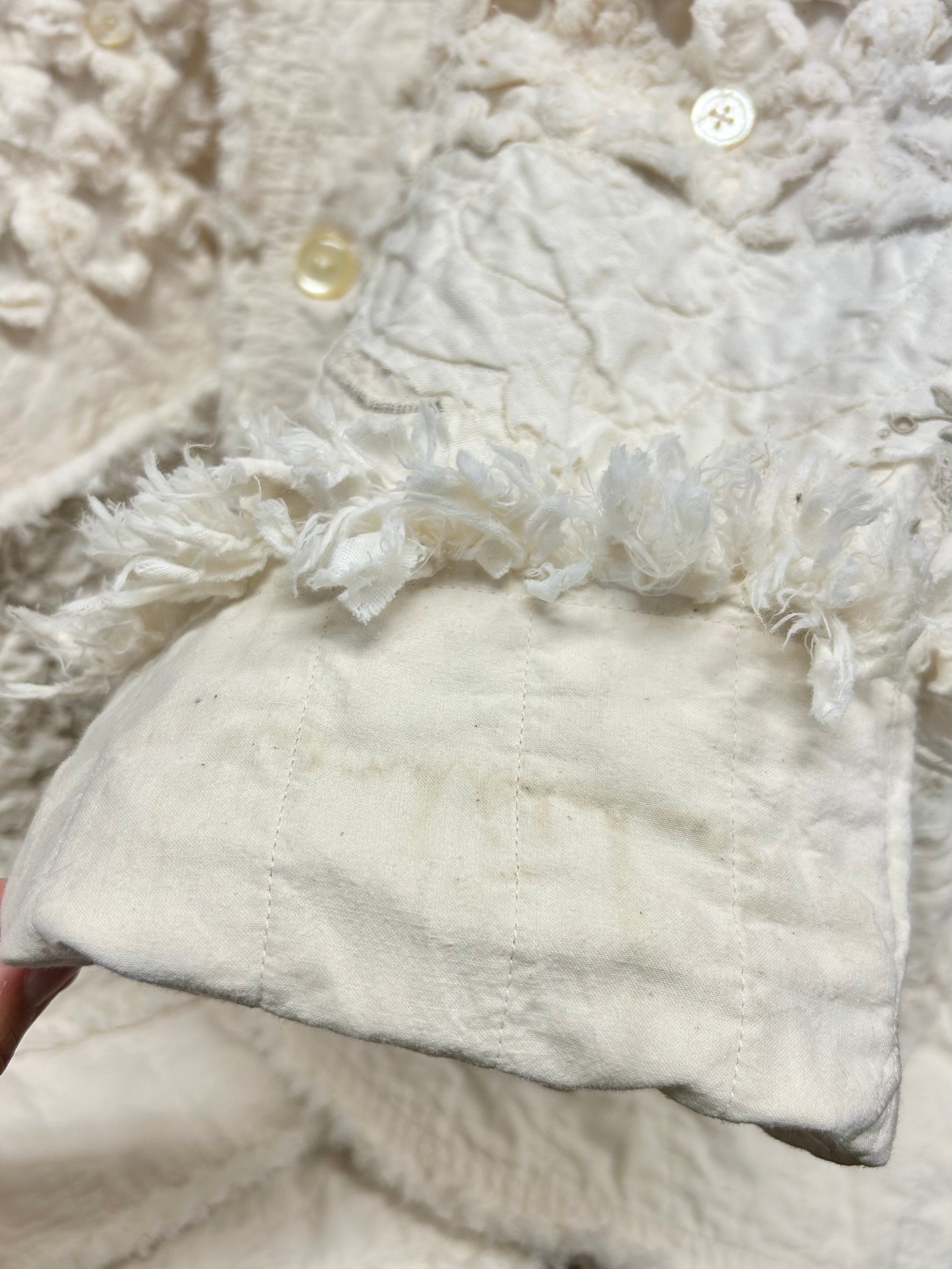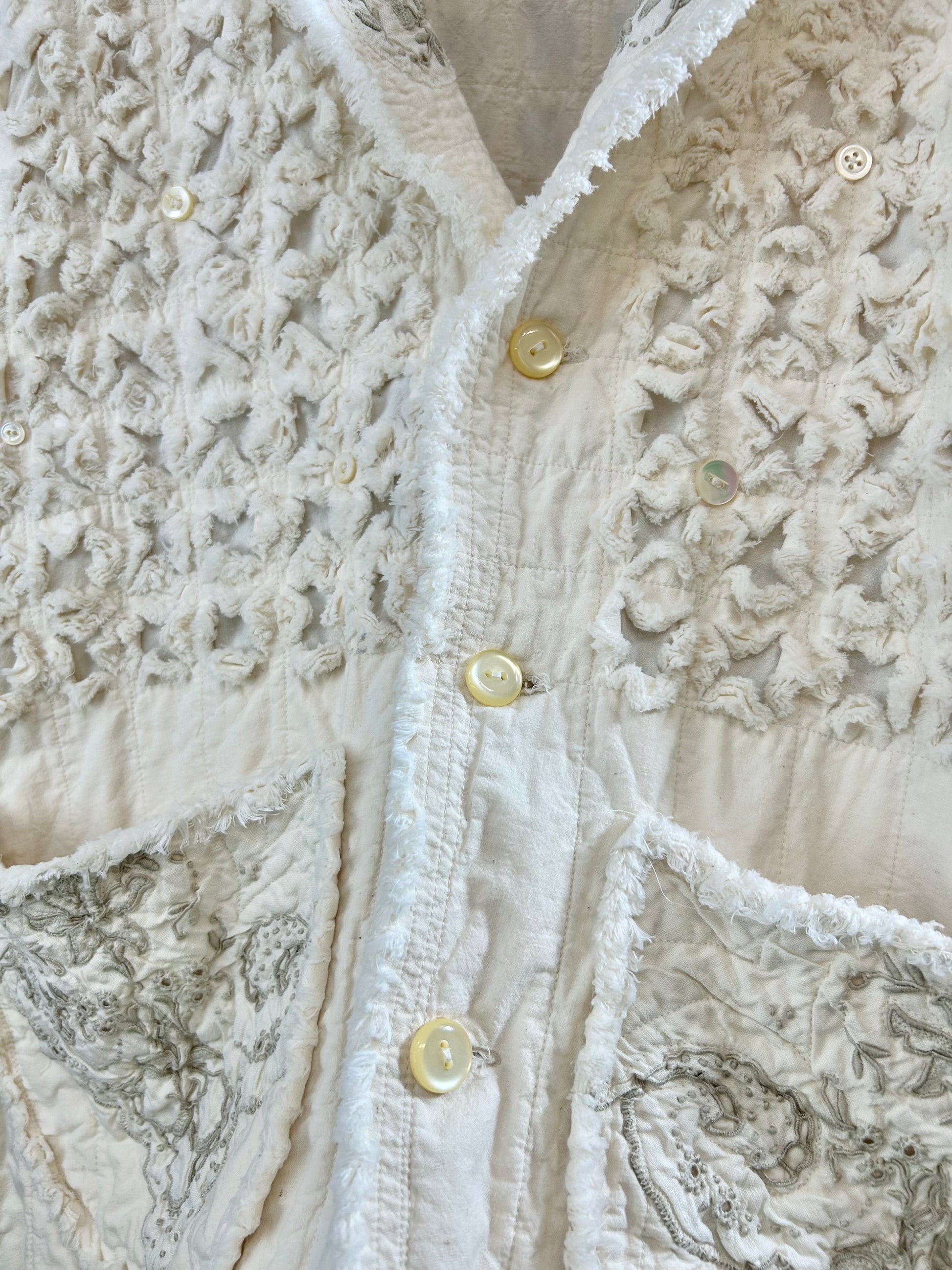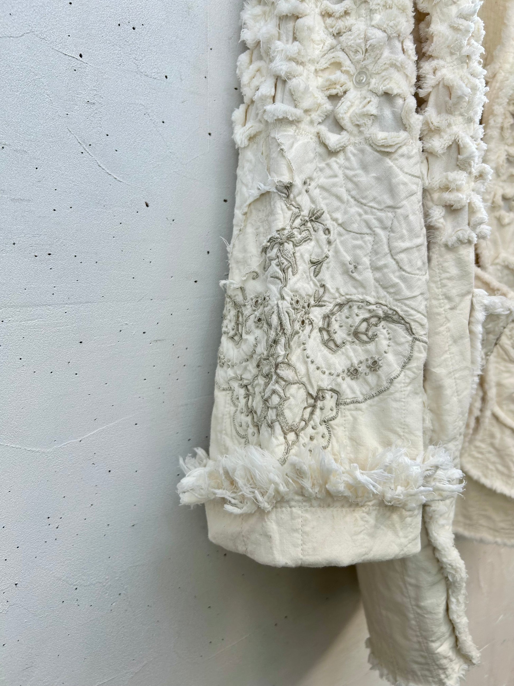 ホワイト単色で一見シンプルながらも、細かなスラッシュキルトと刺繍やボタンの装飾が圧巻のスペシャルな一着。