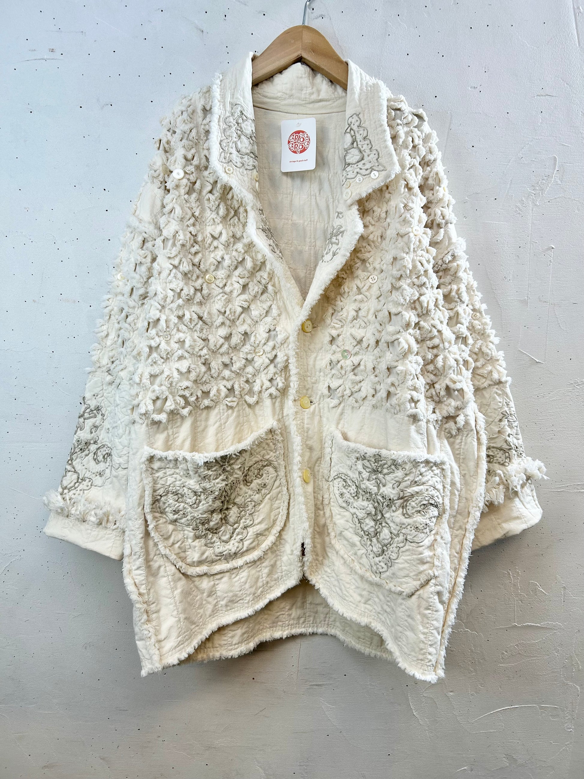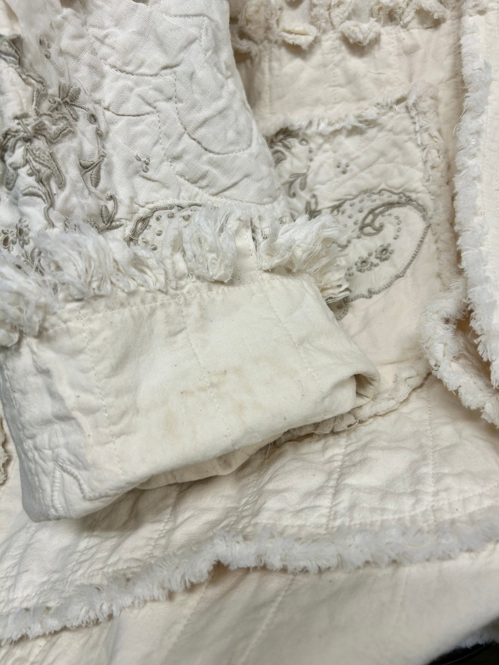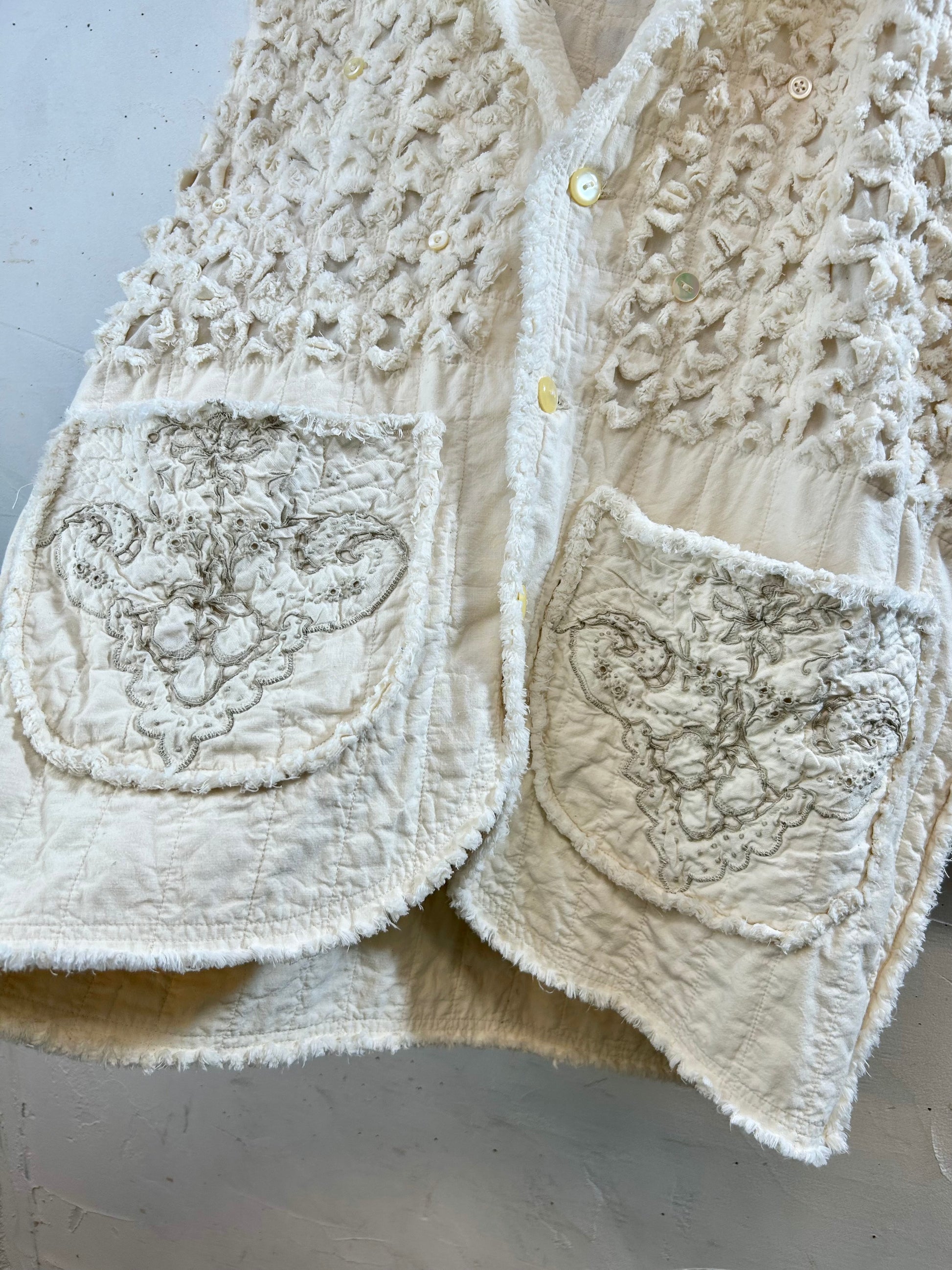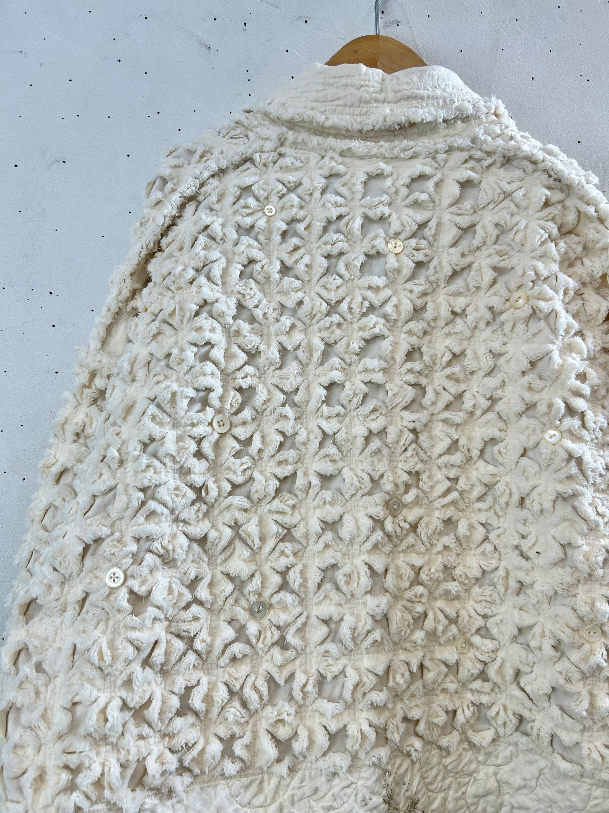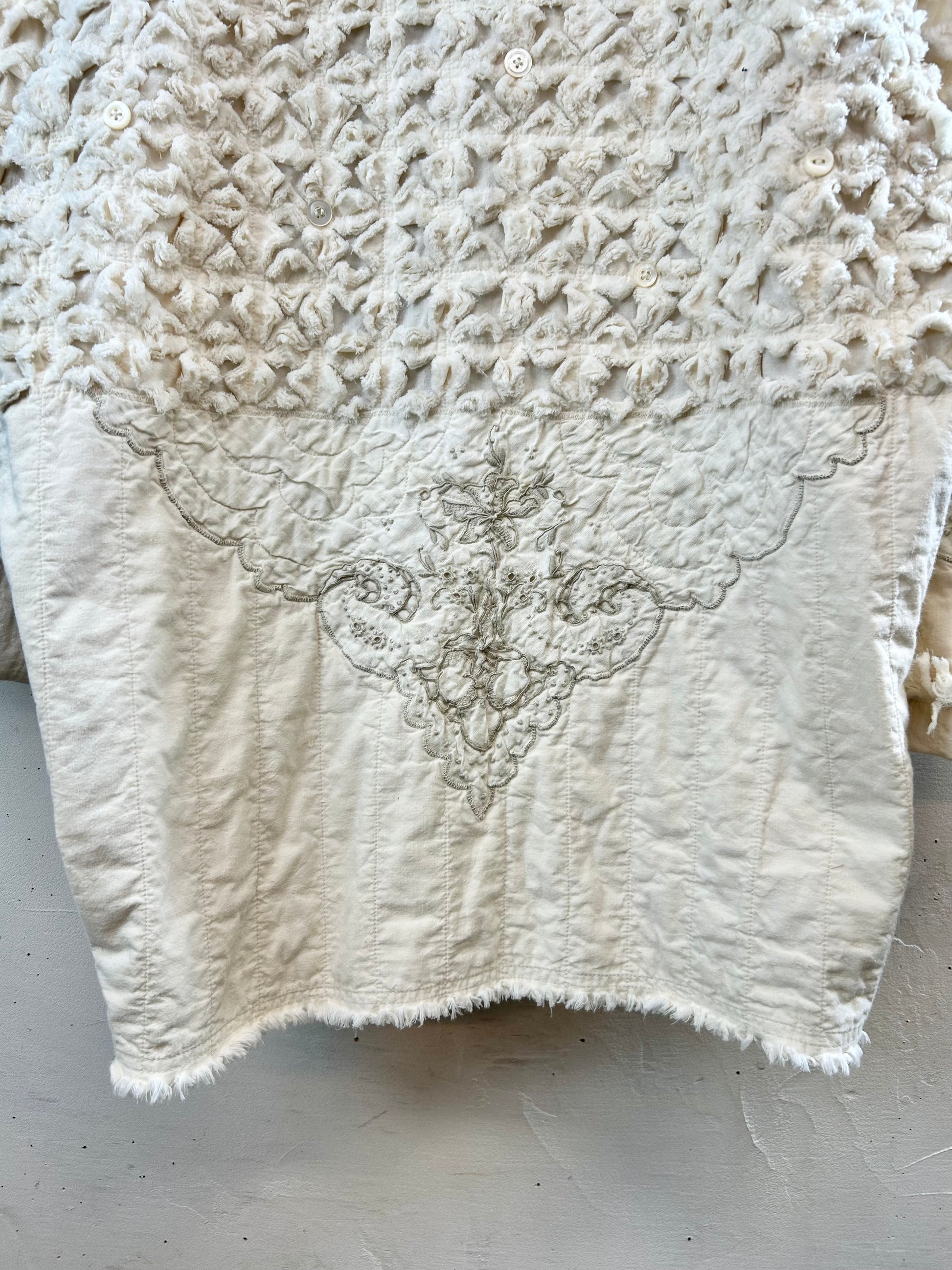 ホワイト単色で一見シンプルながらも、細かなスラッシュキルトと刺繍やボタンの装飾が圧巻のスペシャルな一着。