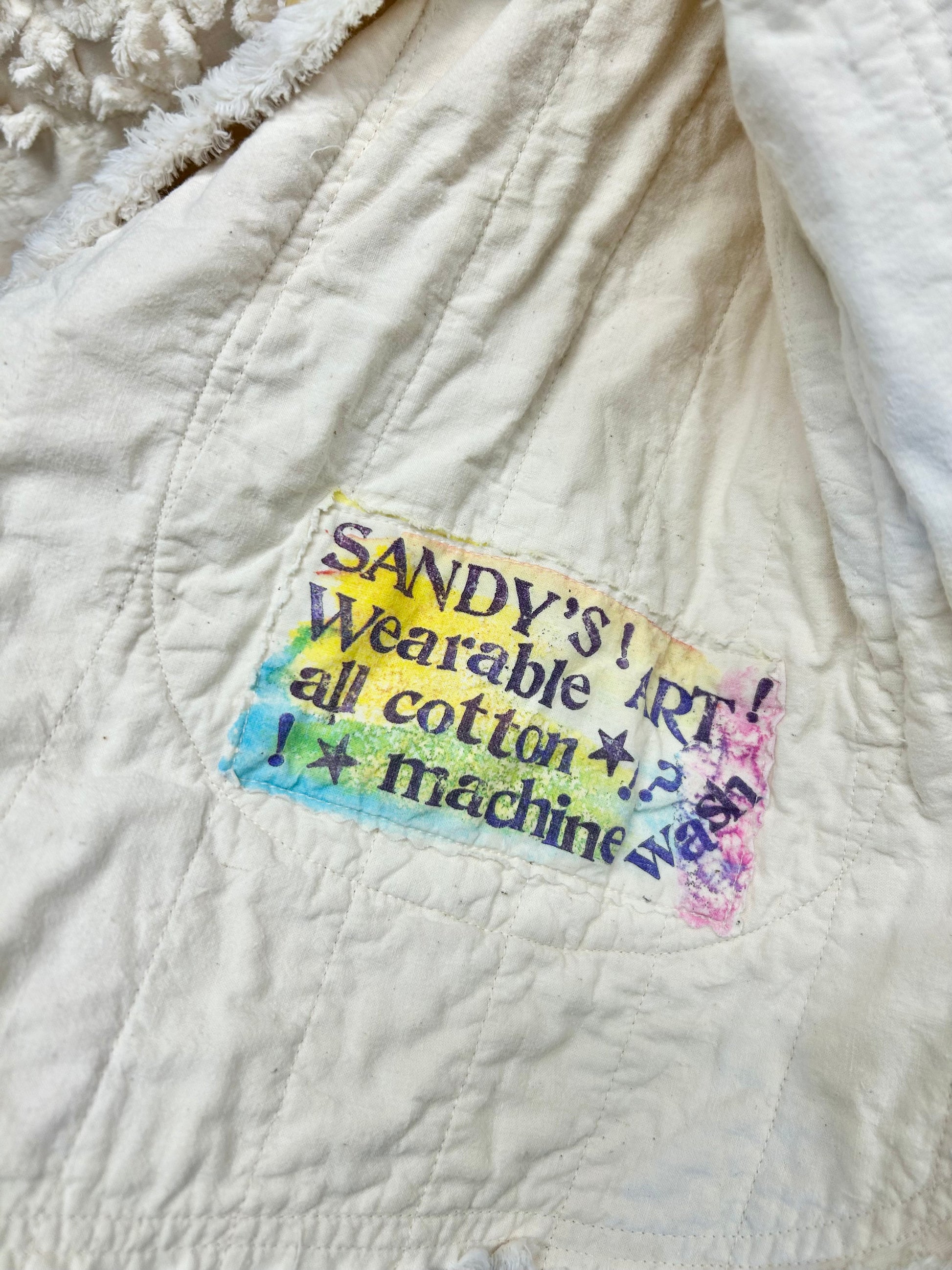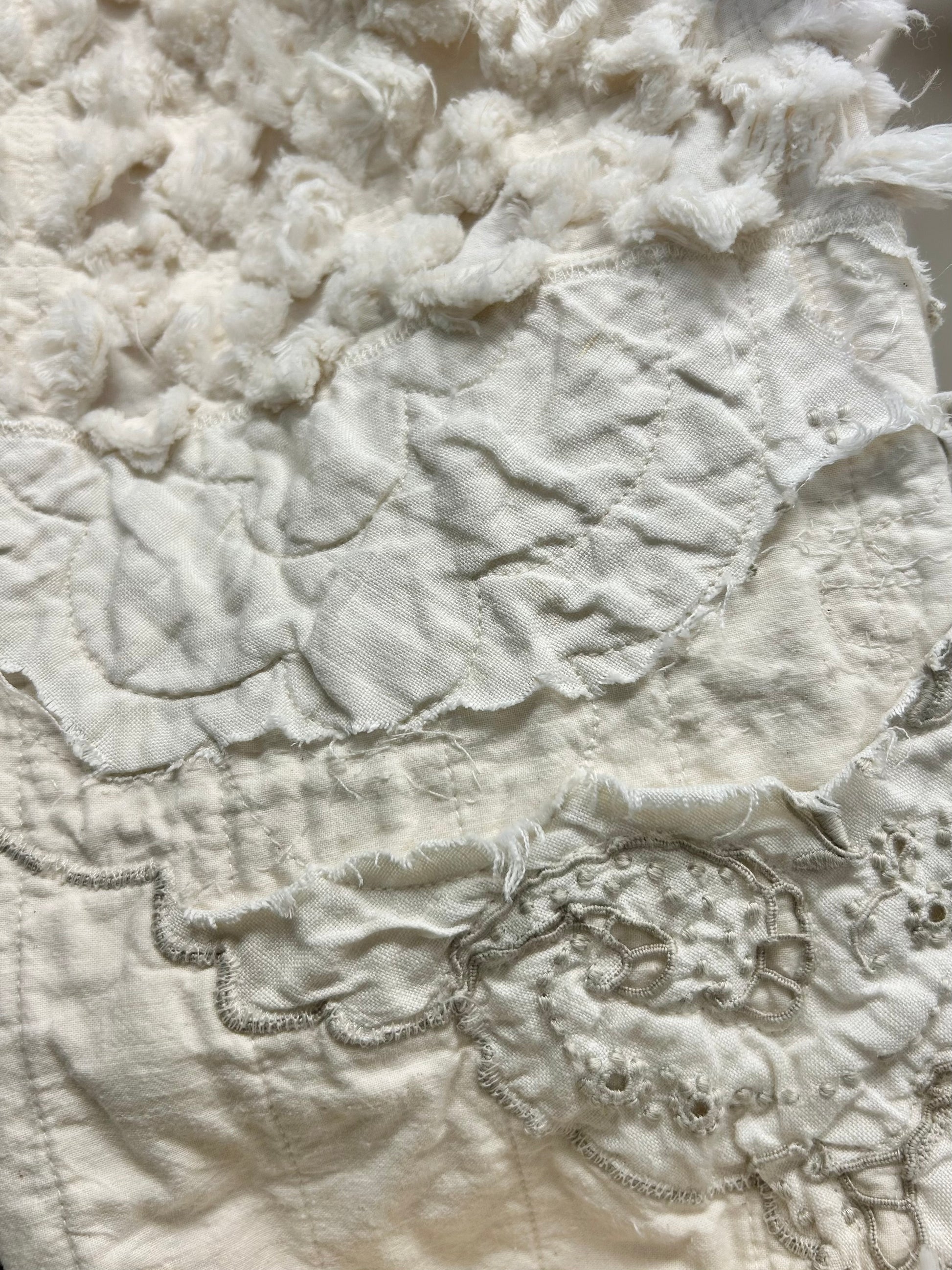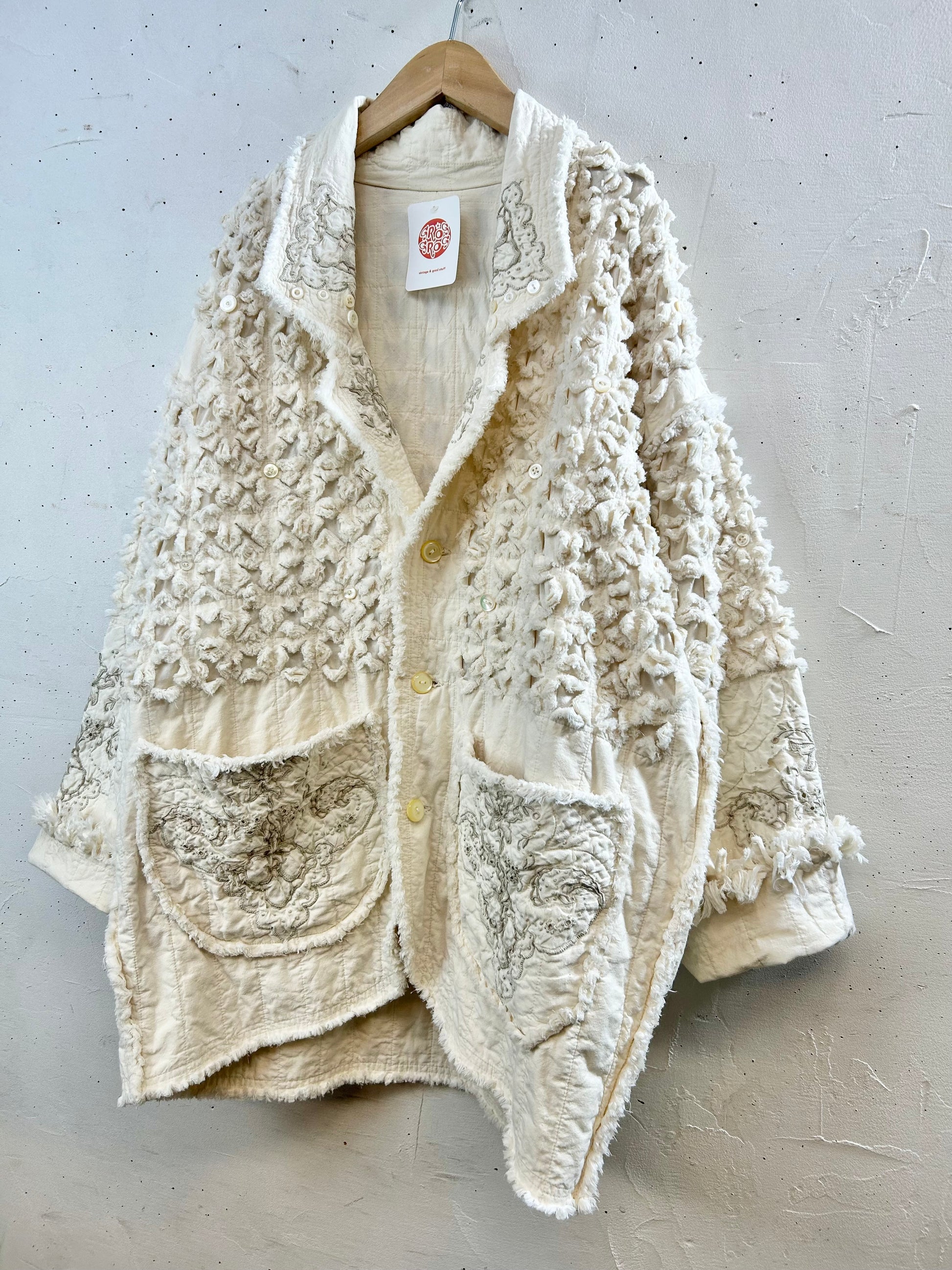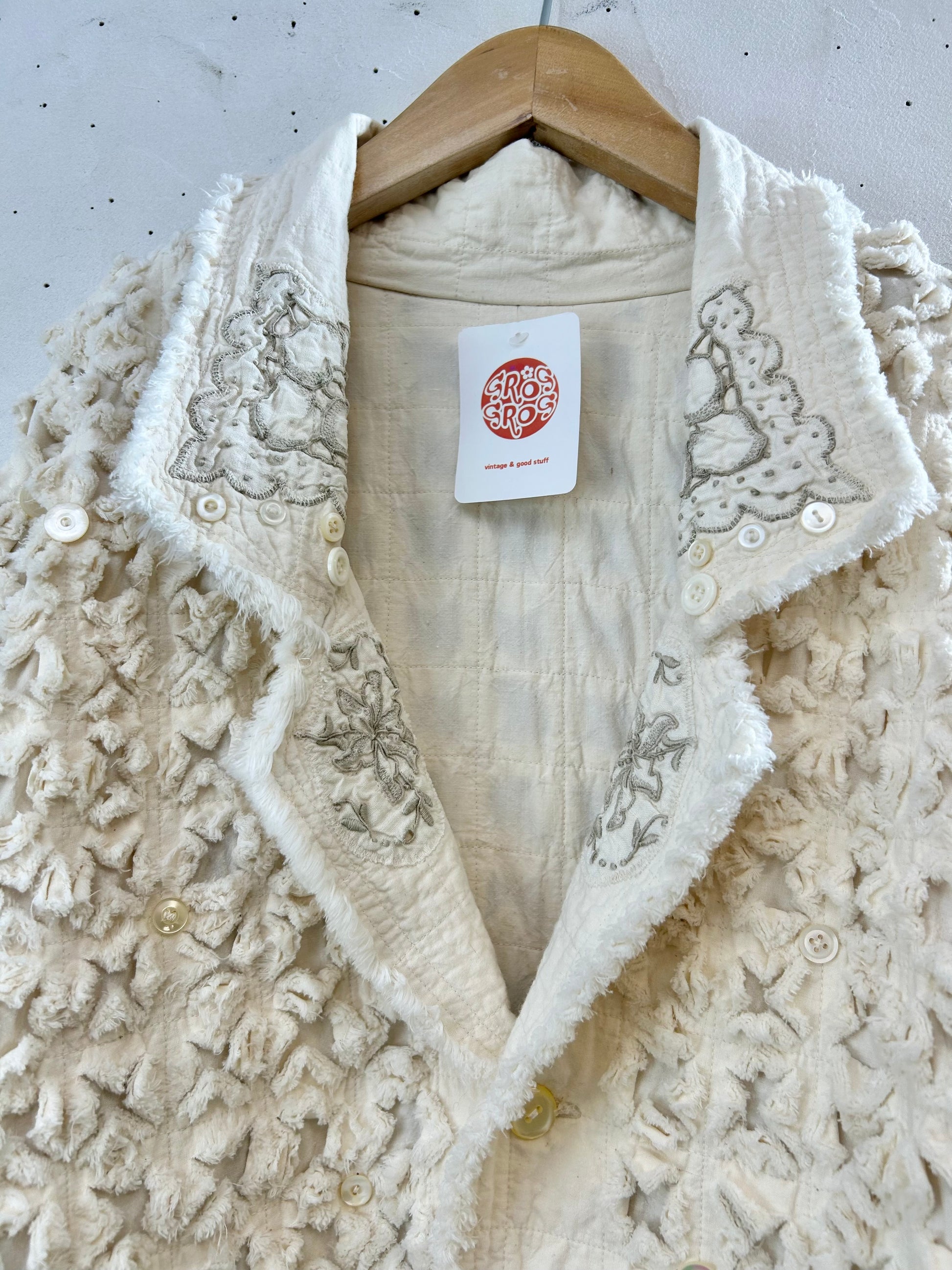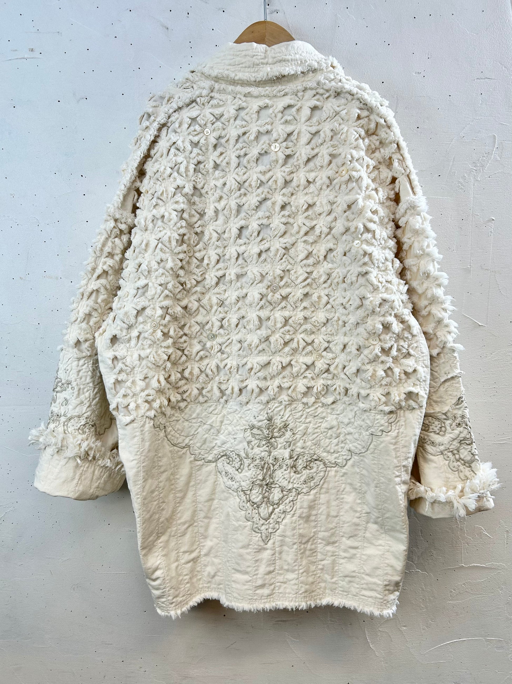 ホワイト単色で一見シンプルながらも、細かなスラッシュキルトと刺繍やボタンの装飾が圧巻のスペシャルな一着。