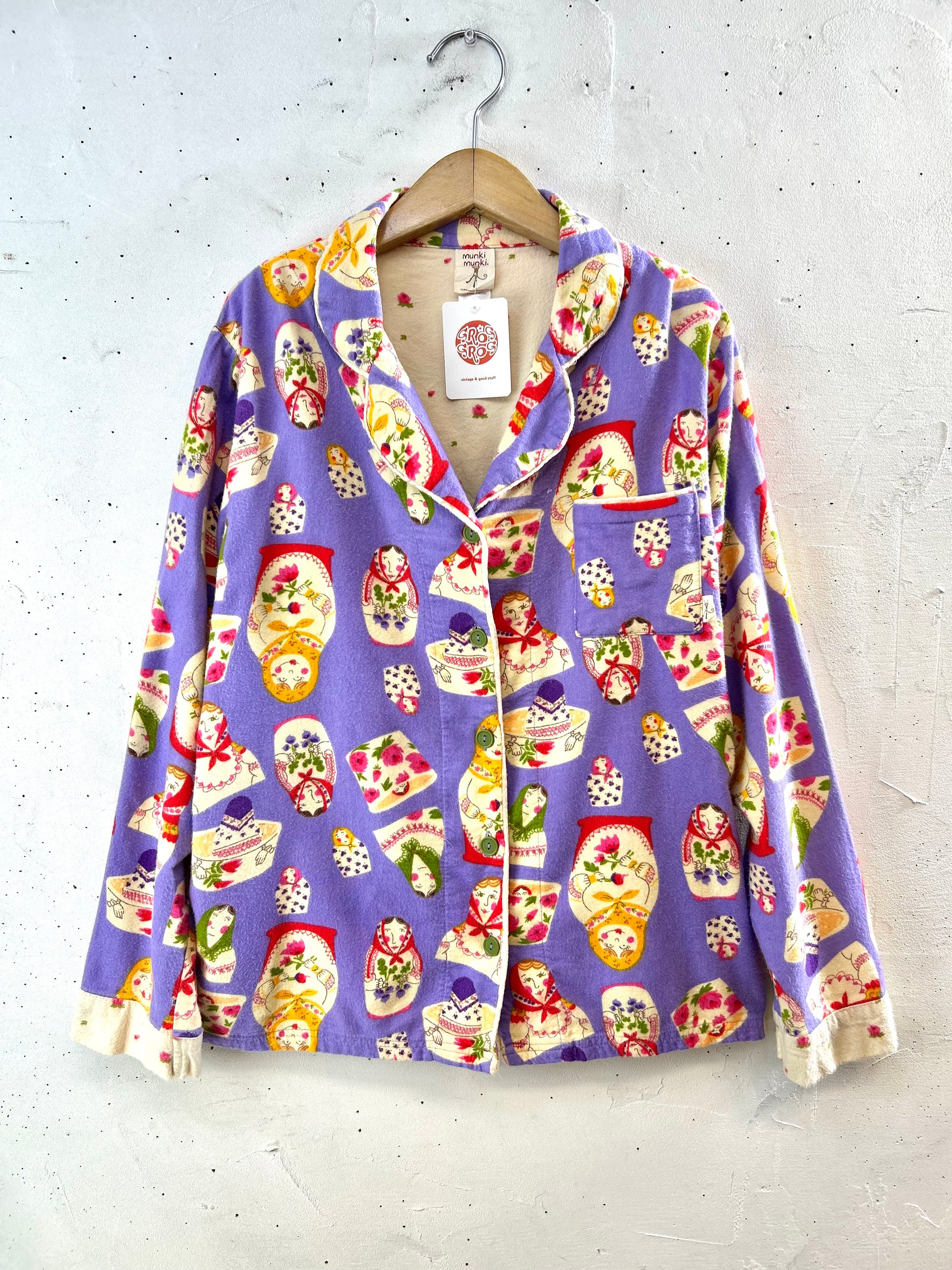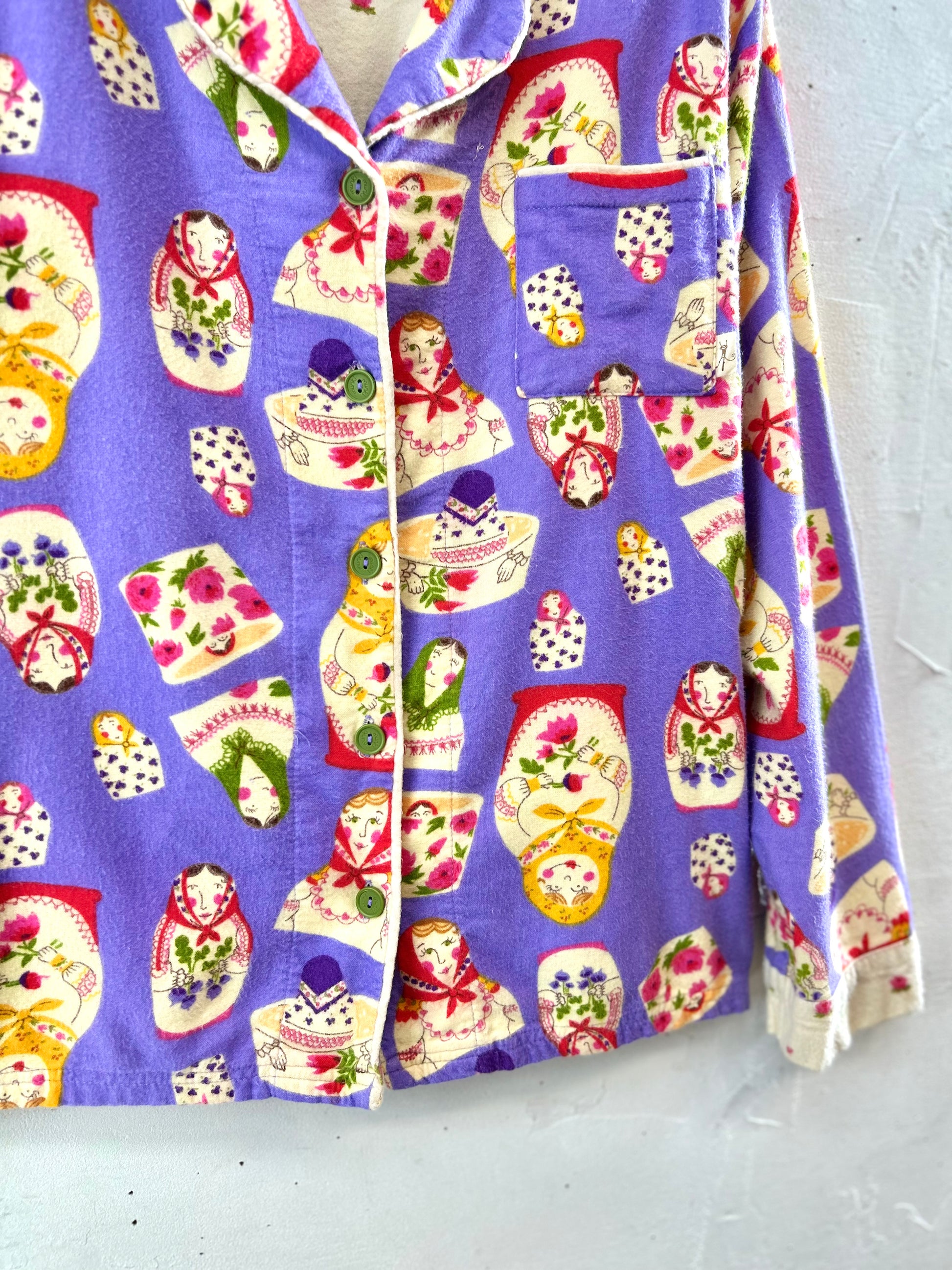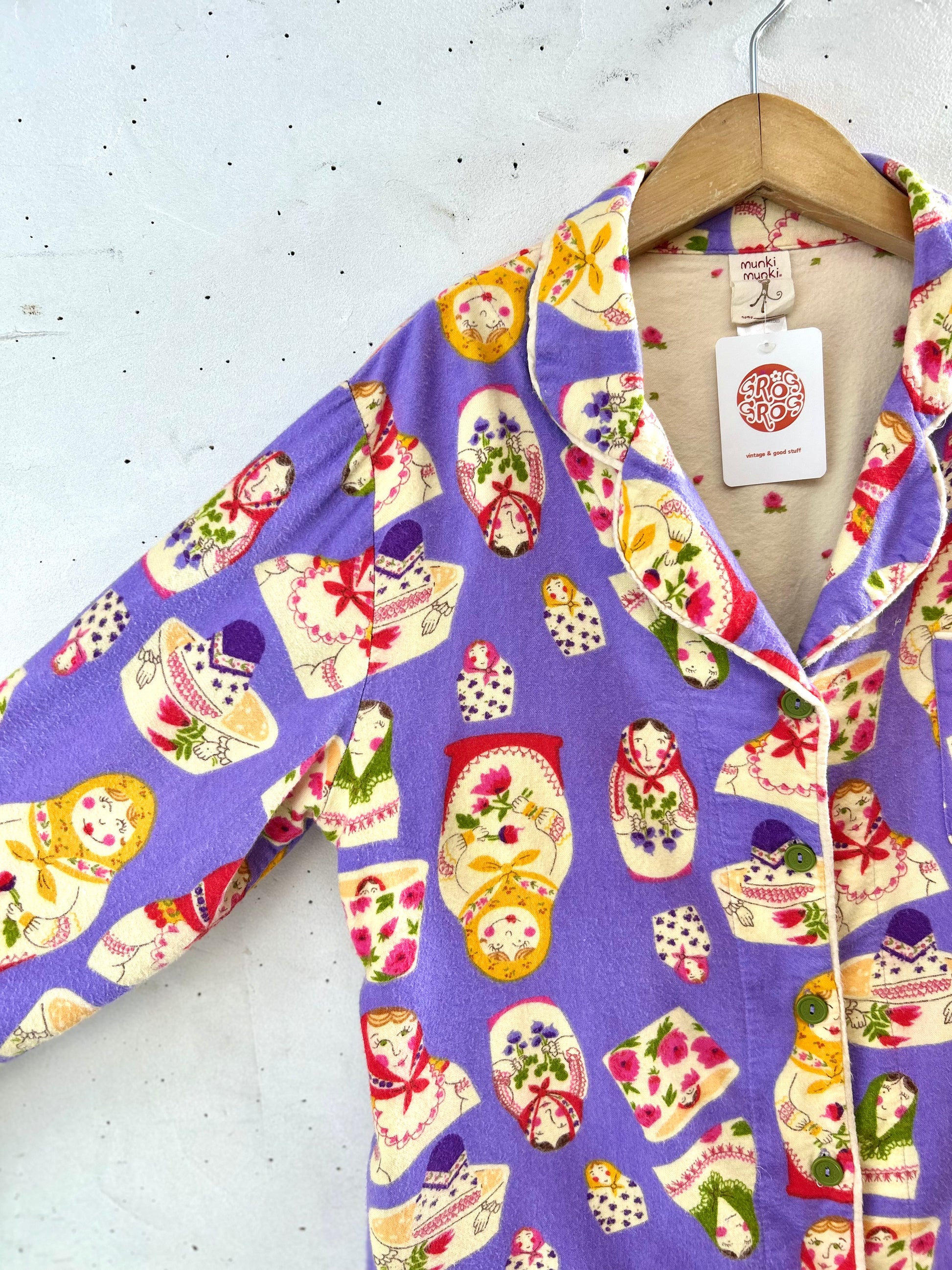 優しいパープルのボディカラーにロシアの民芸品マトリョーシカ人形が描かれた可愛い1着