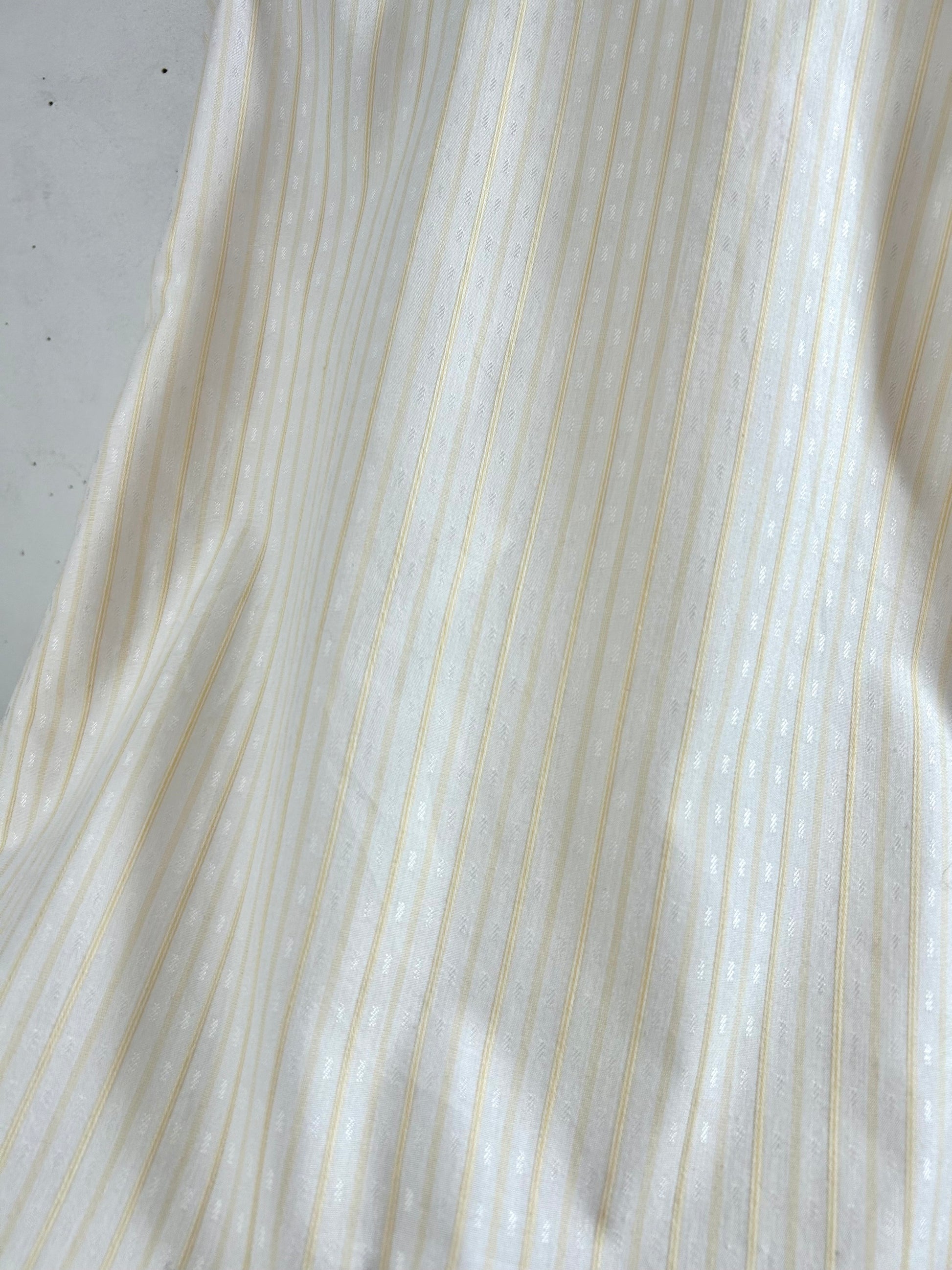 ホワイトベースの淡いストライプ柄に光沢のある織りが上品なアイテムです。