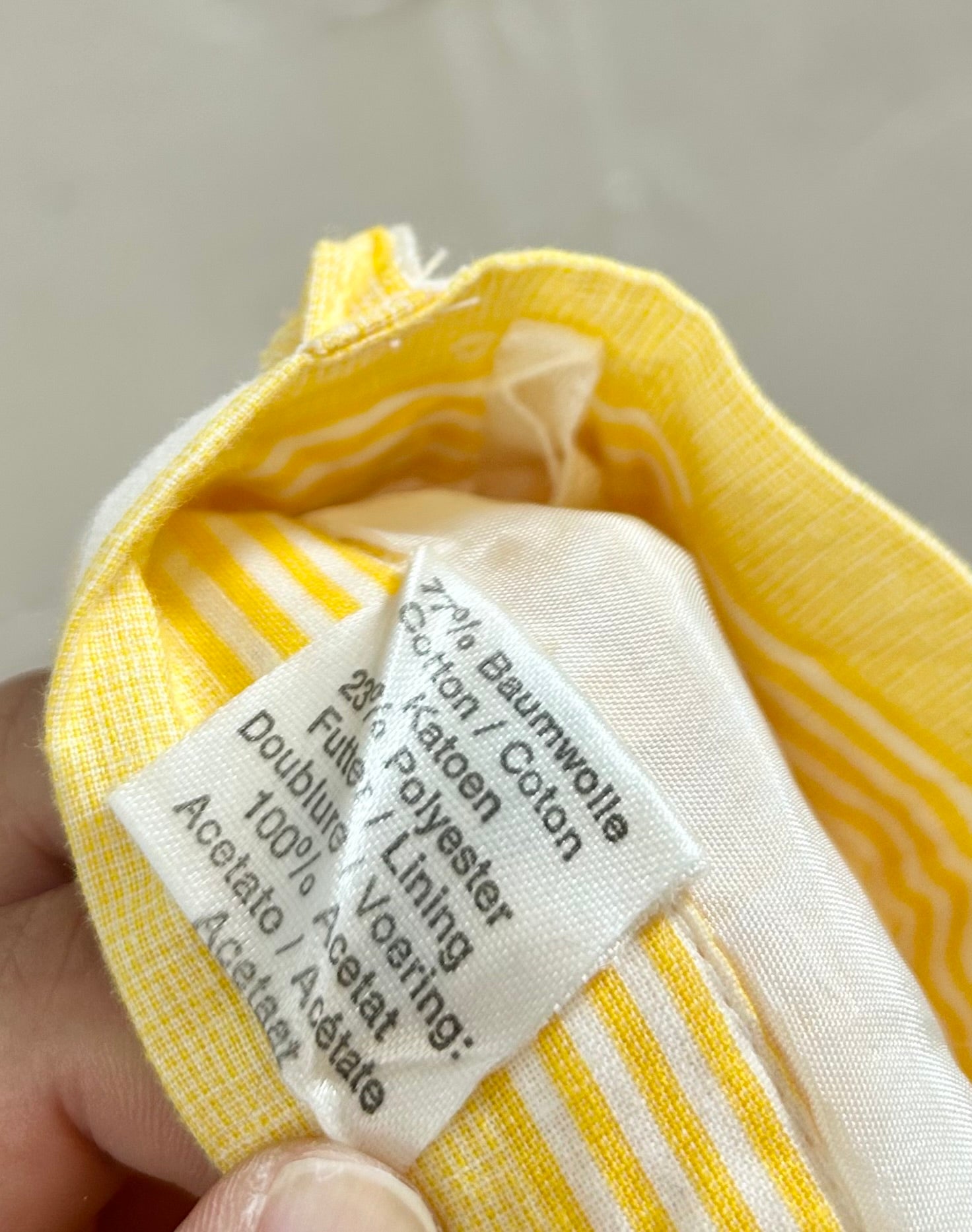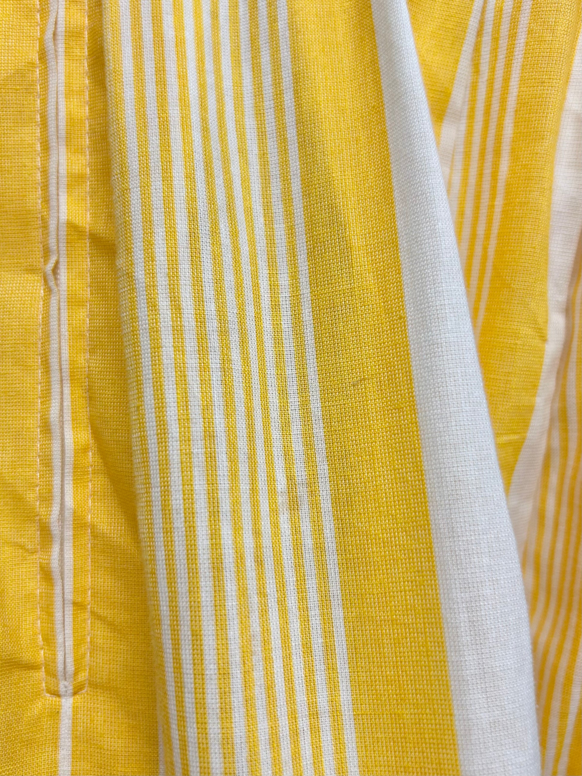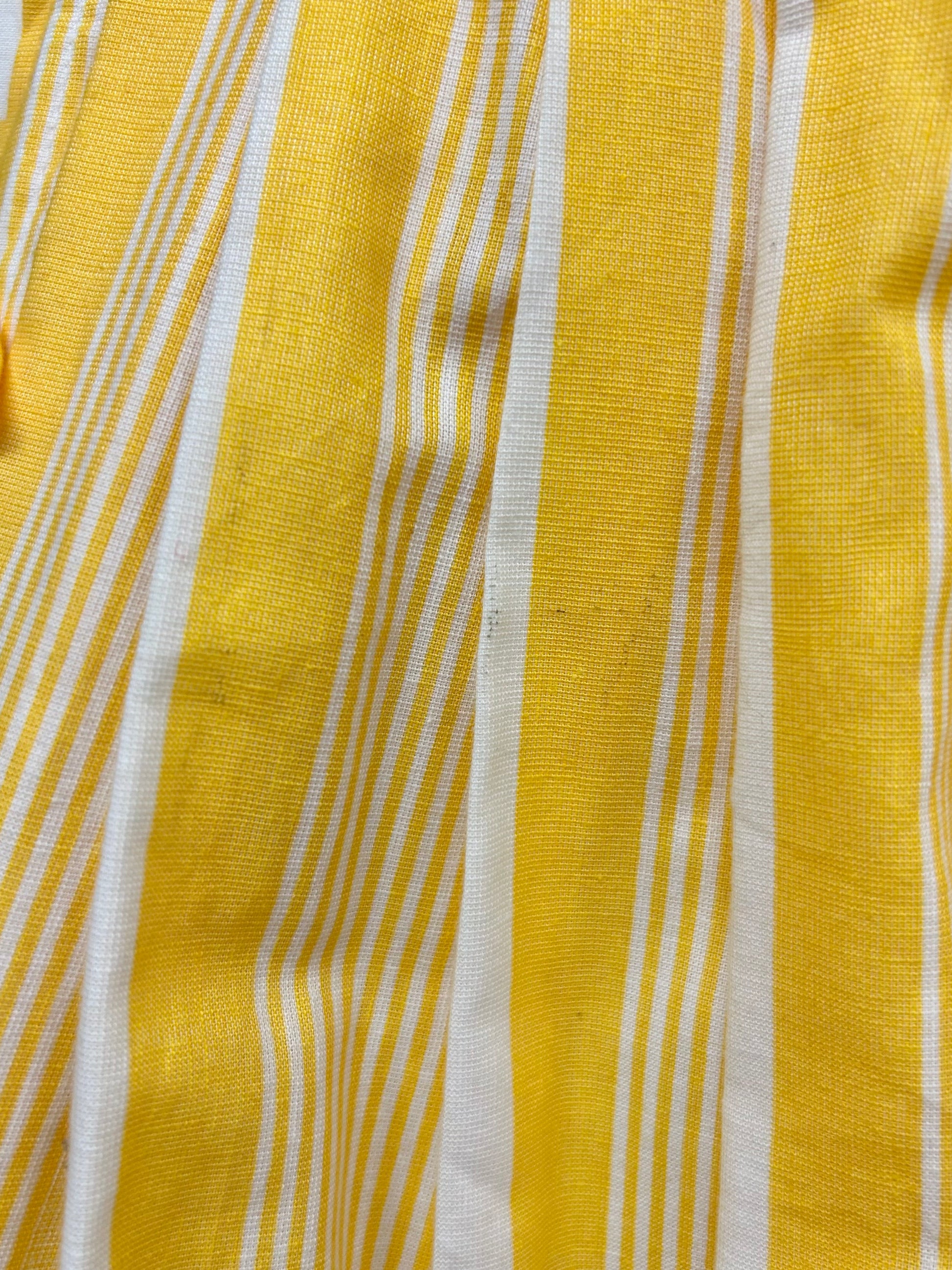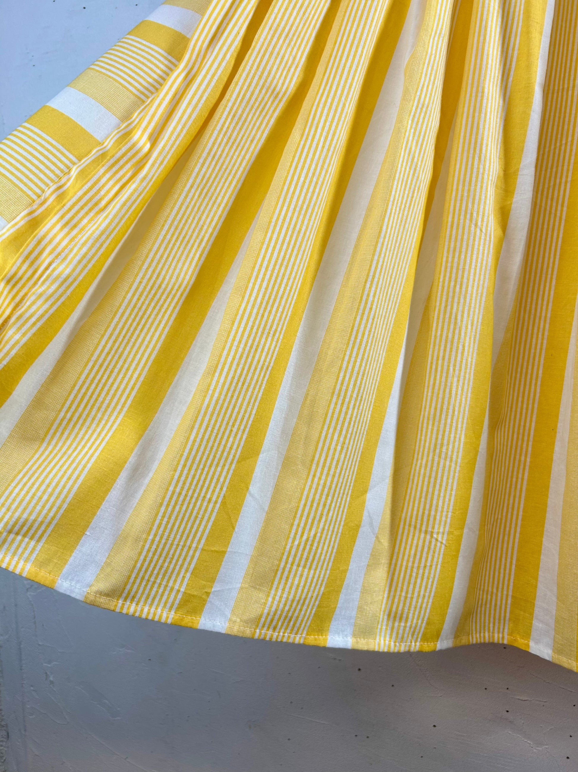 鮮やかなイエローカラーの様々な太さのストライプパターンが目を引く一着。